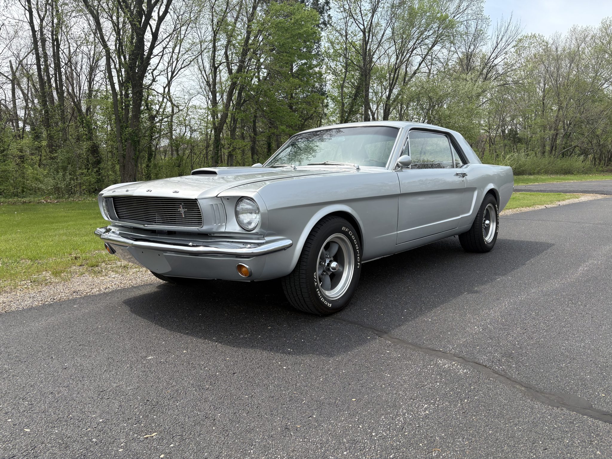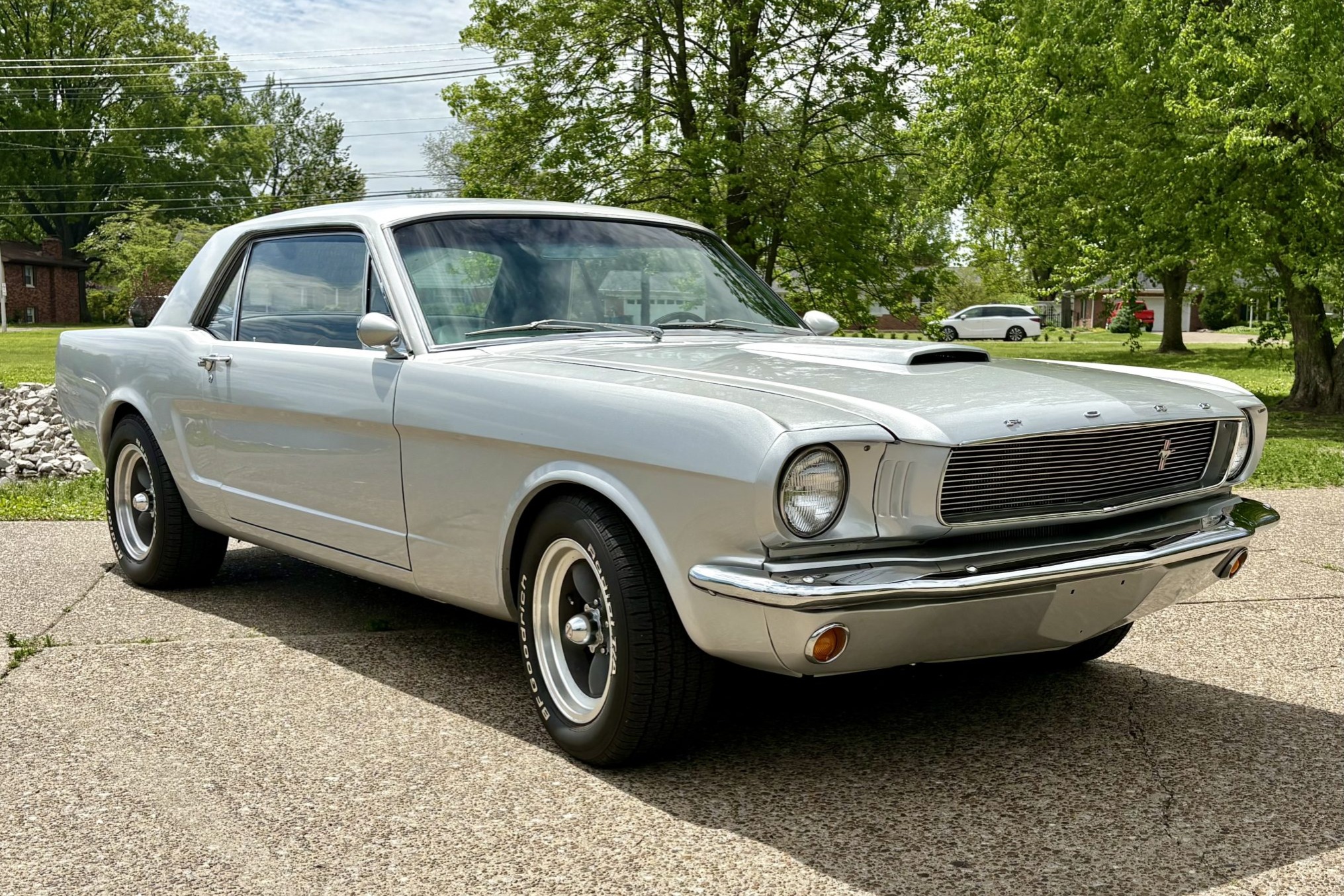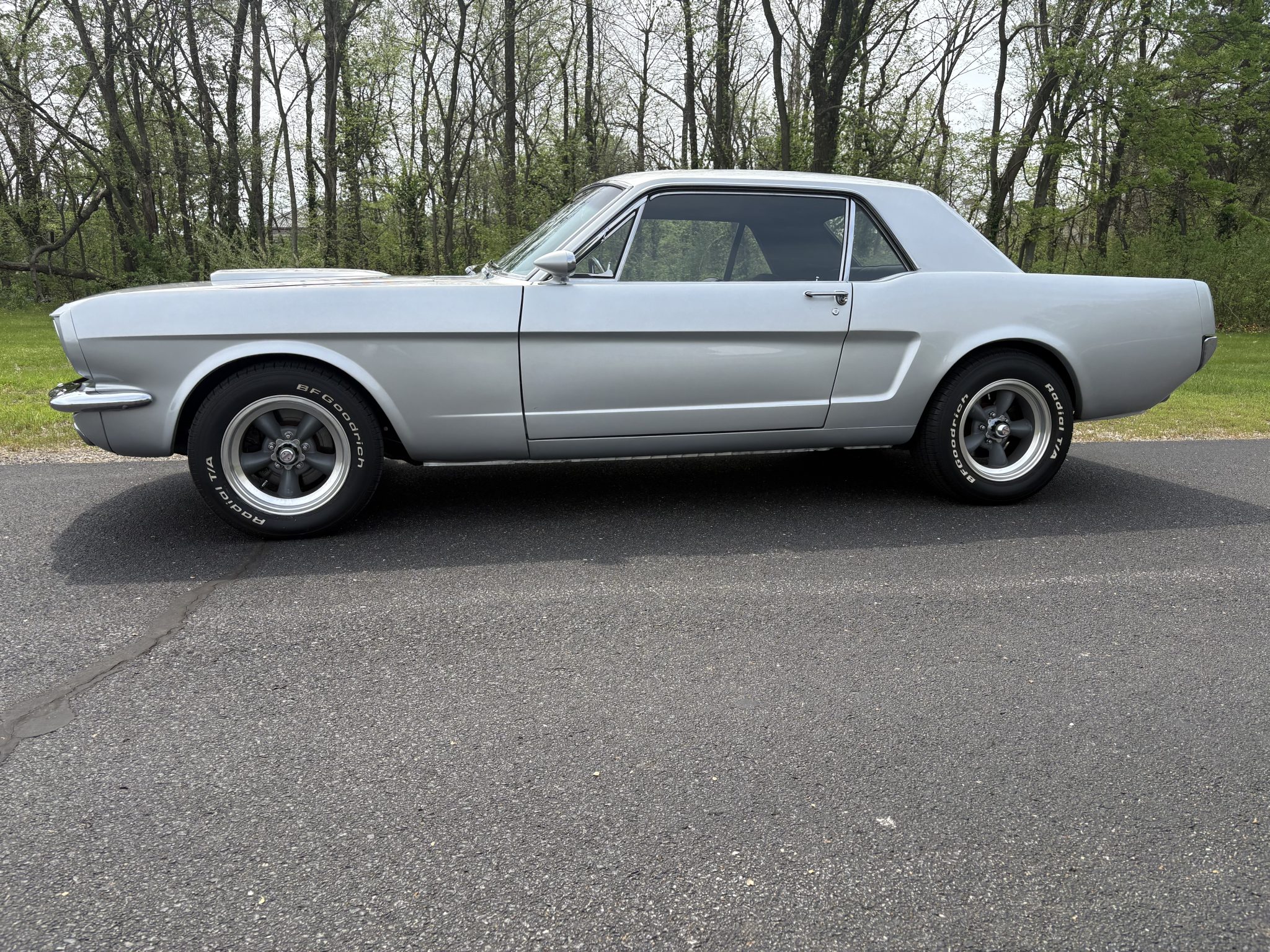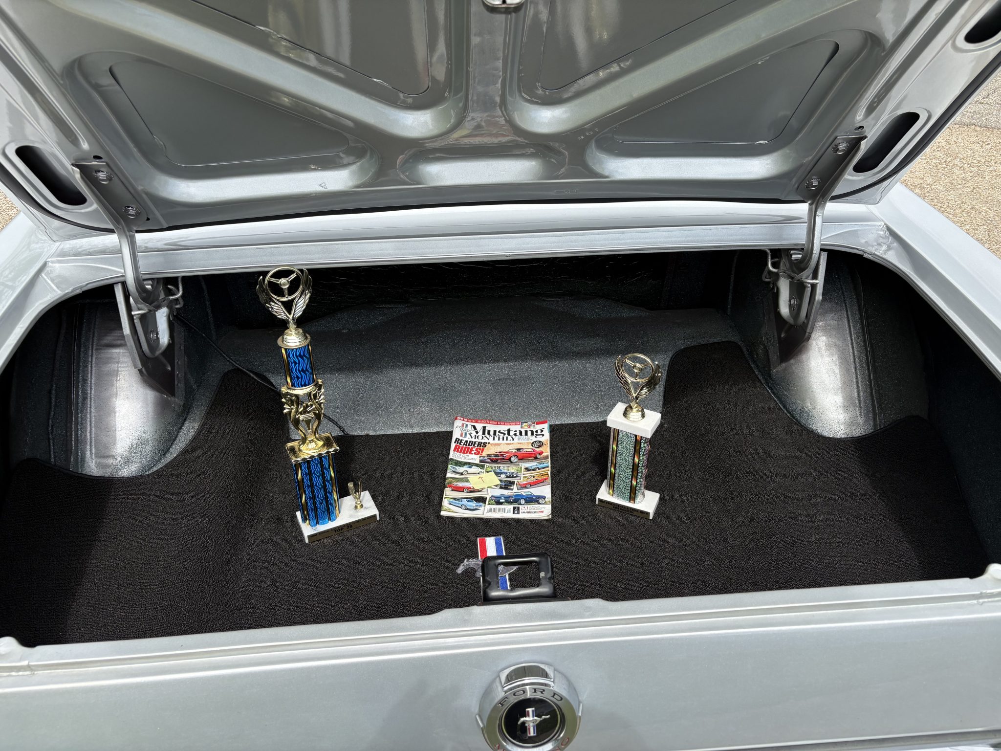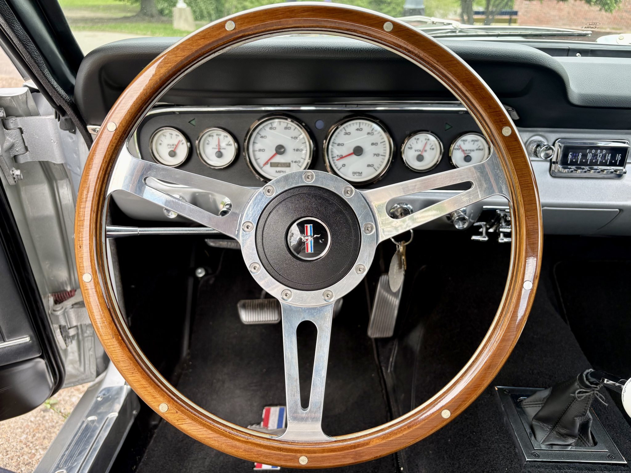 refurbishment work completed in 2015 involved overhauling the 289ci V8, refinishing the car in silver, and refreshing the black interior. The engine is equipped with a Weiand intake manifold and a Street Demon carburetor, the interior features TMI Products seating, and the car rides on 15″ American Racing Torq Thrust wheels and Grab-A-Trak suspension components. Additional equipment includes four-wheel disc brakes, power steering, MagnaFlow mufflers, a hood scoop, and bullet-style side mirrors.