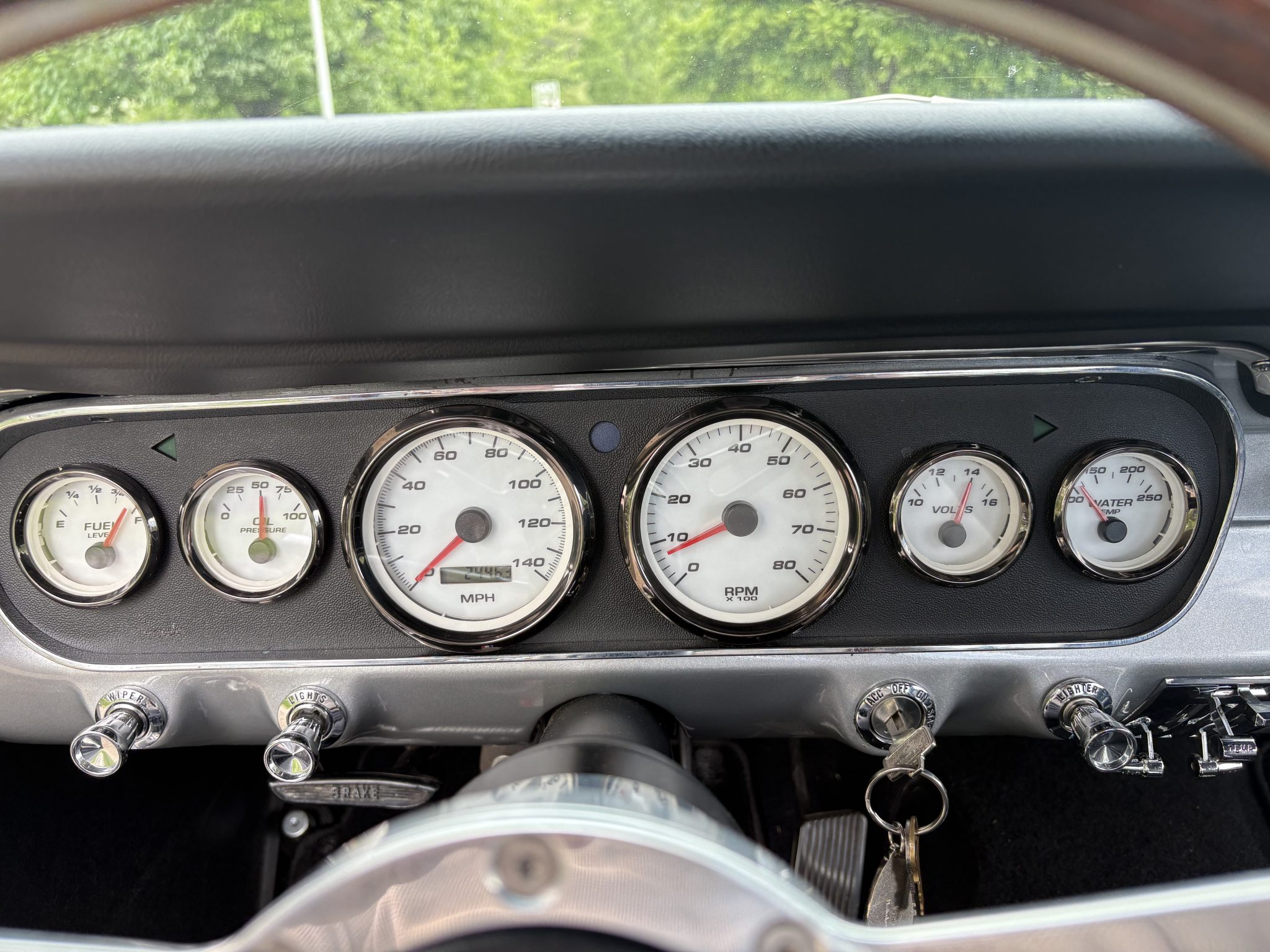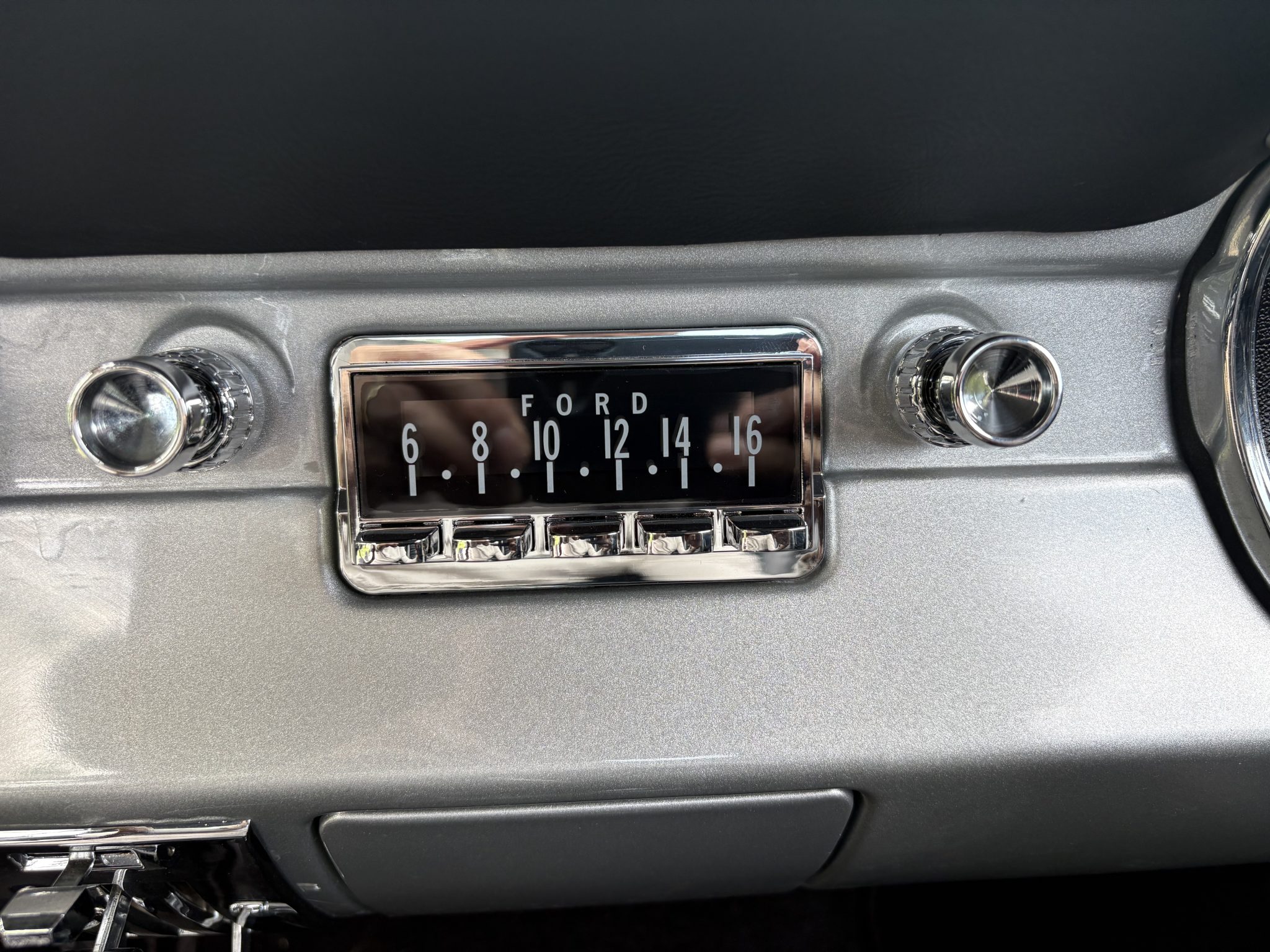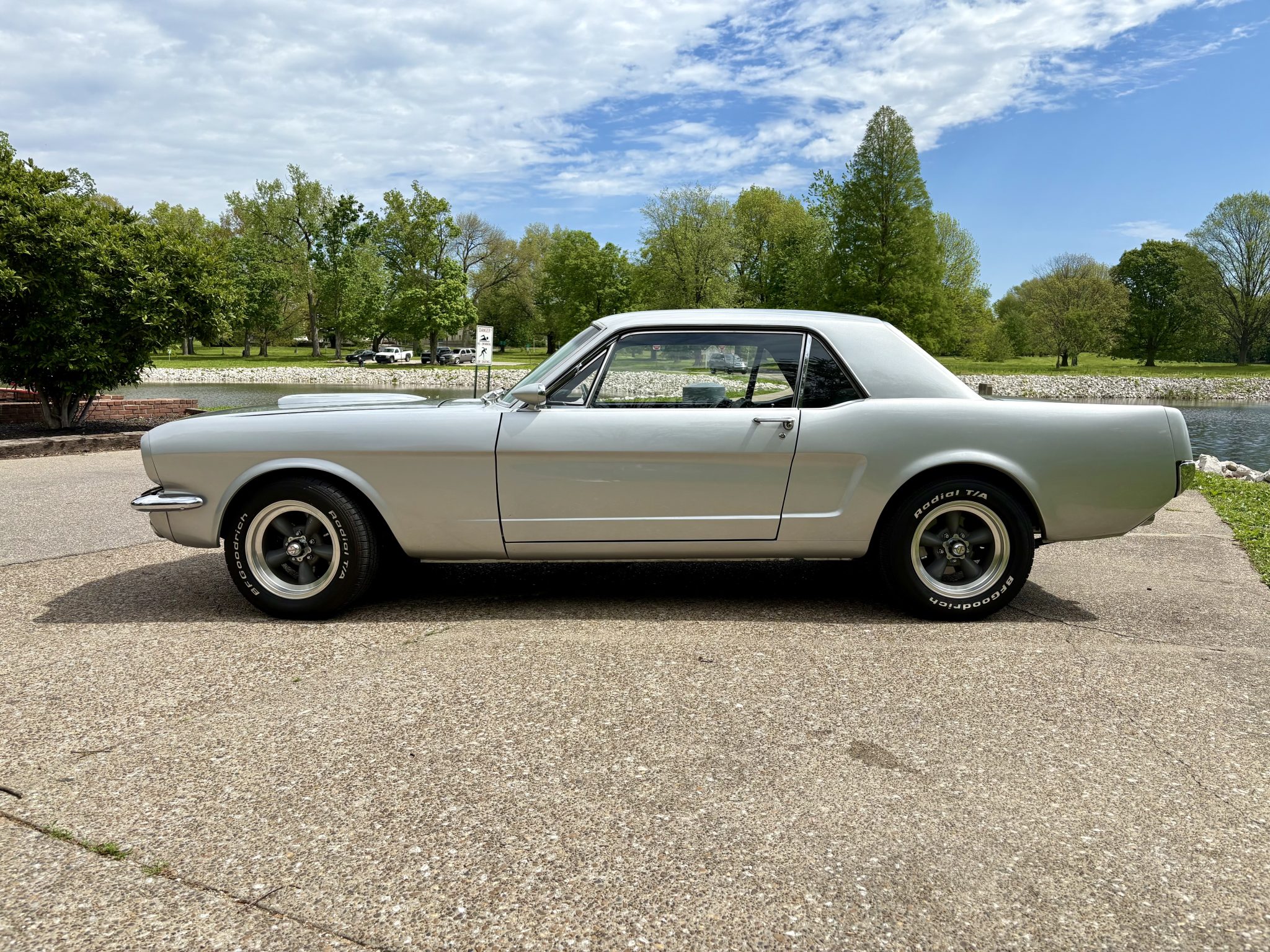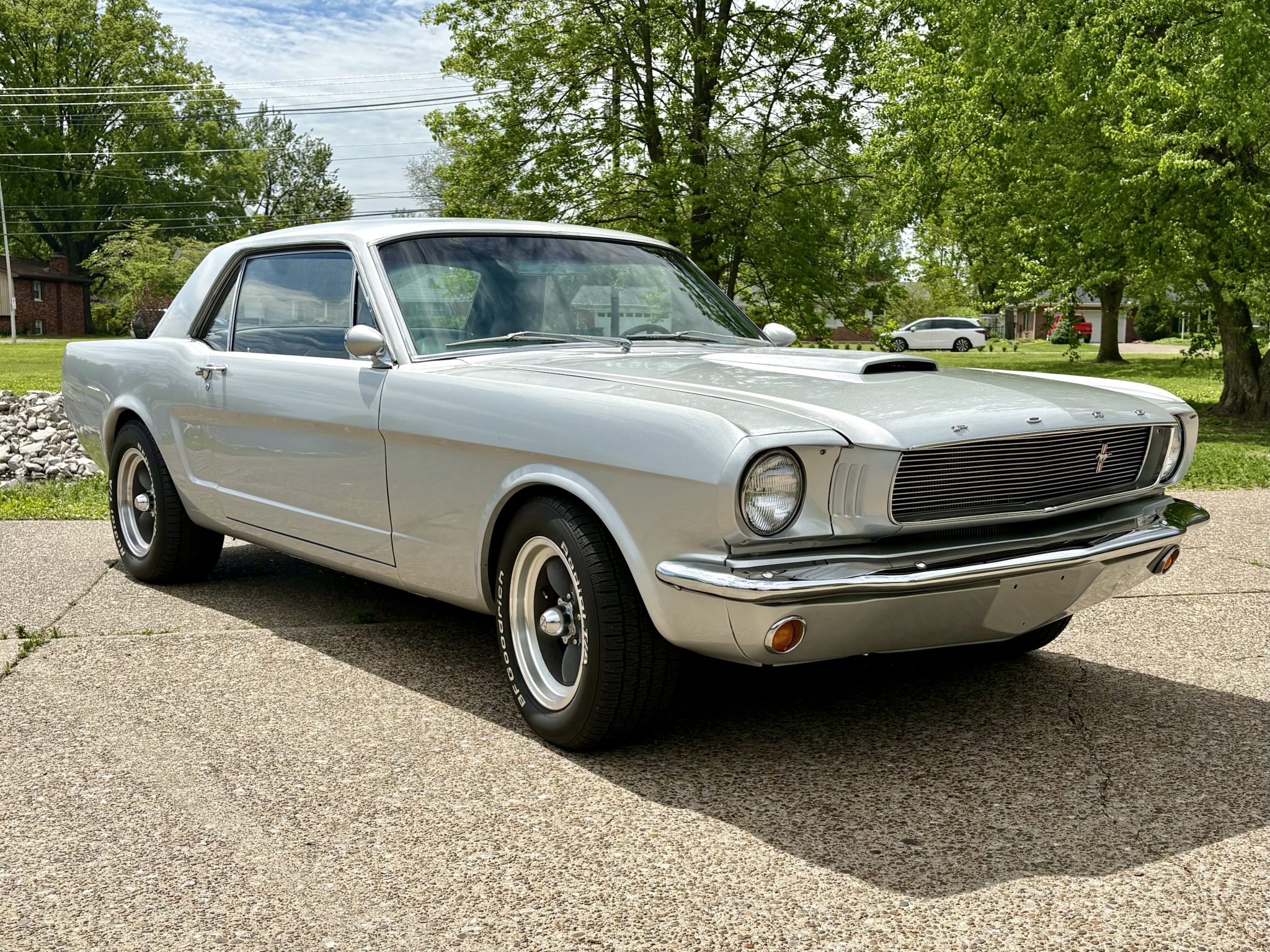 refurbishment work completed in 2015 involved overhauling the 289ci V8, refinishing the car in silver, and refreshing the black interior. The engine is equipped with a Weiand intake manifold and a Street Demon carburetor, the interior features TMI Products seating, and the car rides on 15″ American Racing Torq Thrust wheels and Grab-A-Trak suspension components. Additional equipment includes four-wheel disc brakes, power steering, MagnaFlow mufflers, a hood scoop, and bullet-style side mirrors.