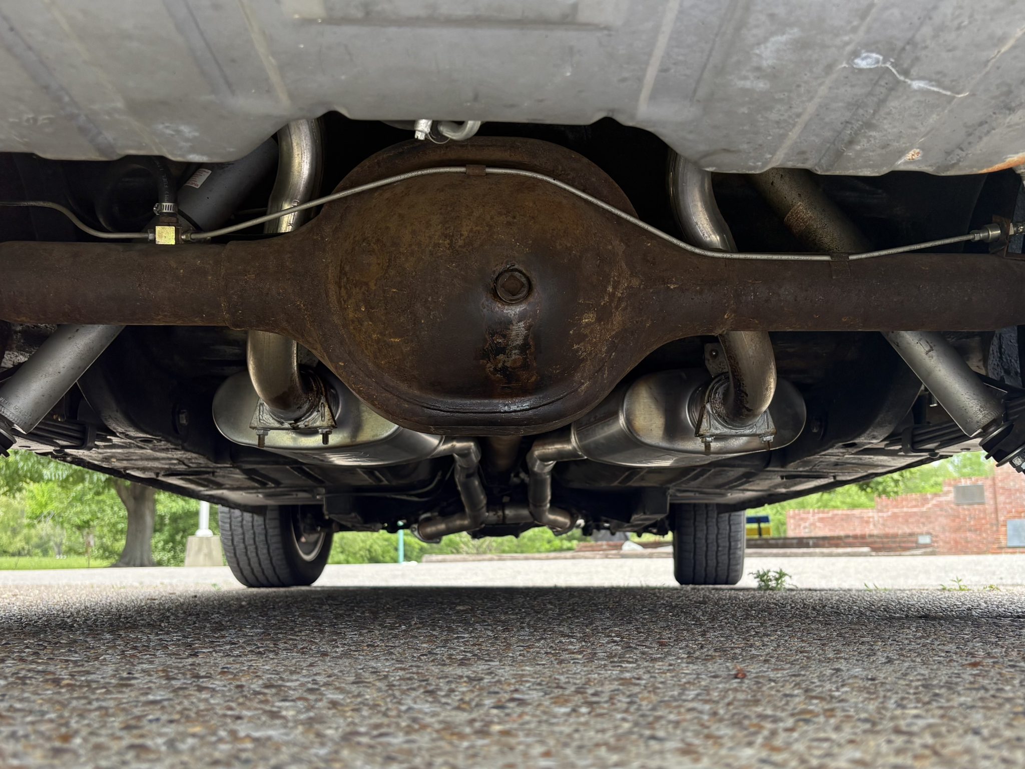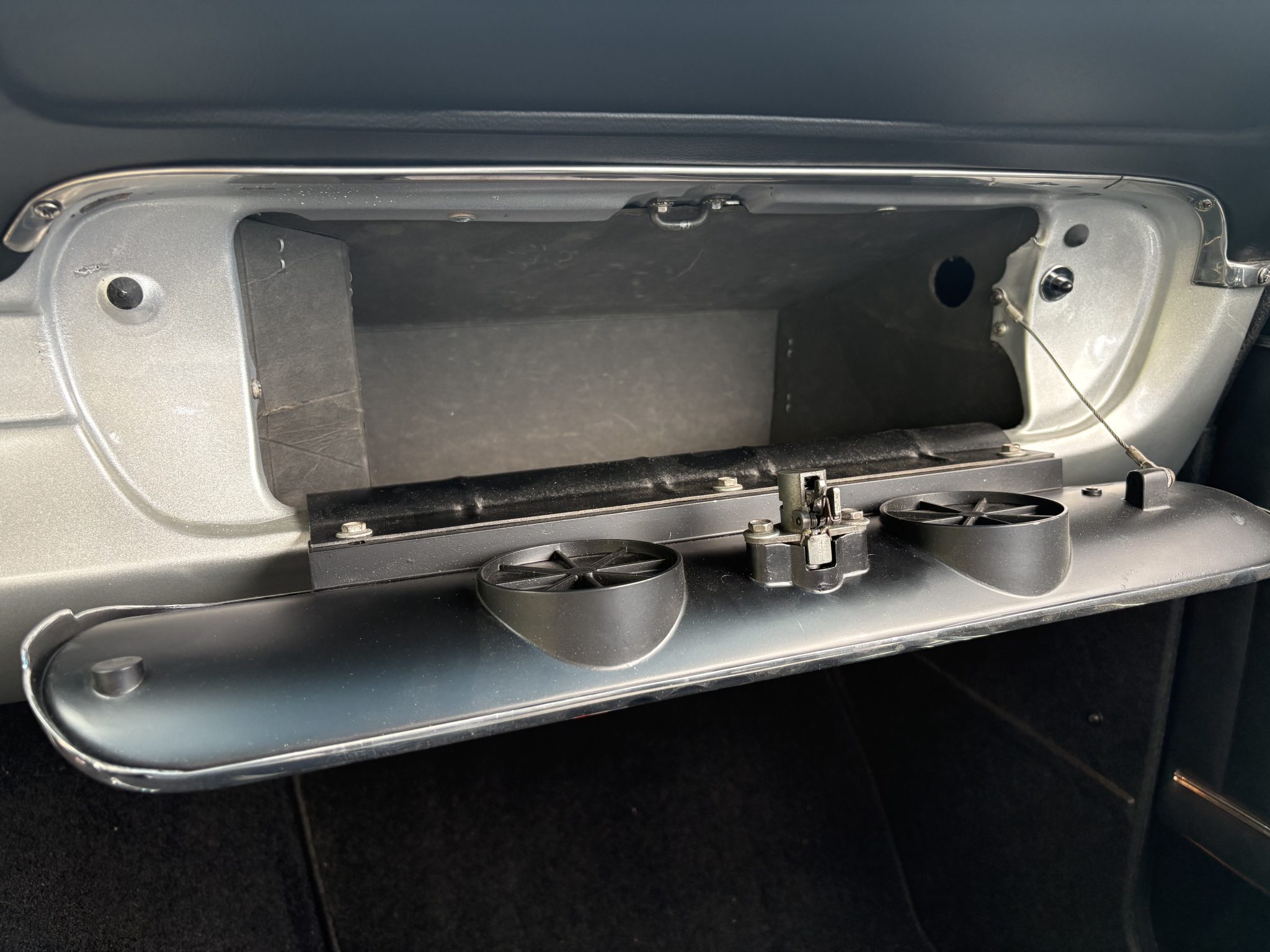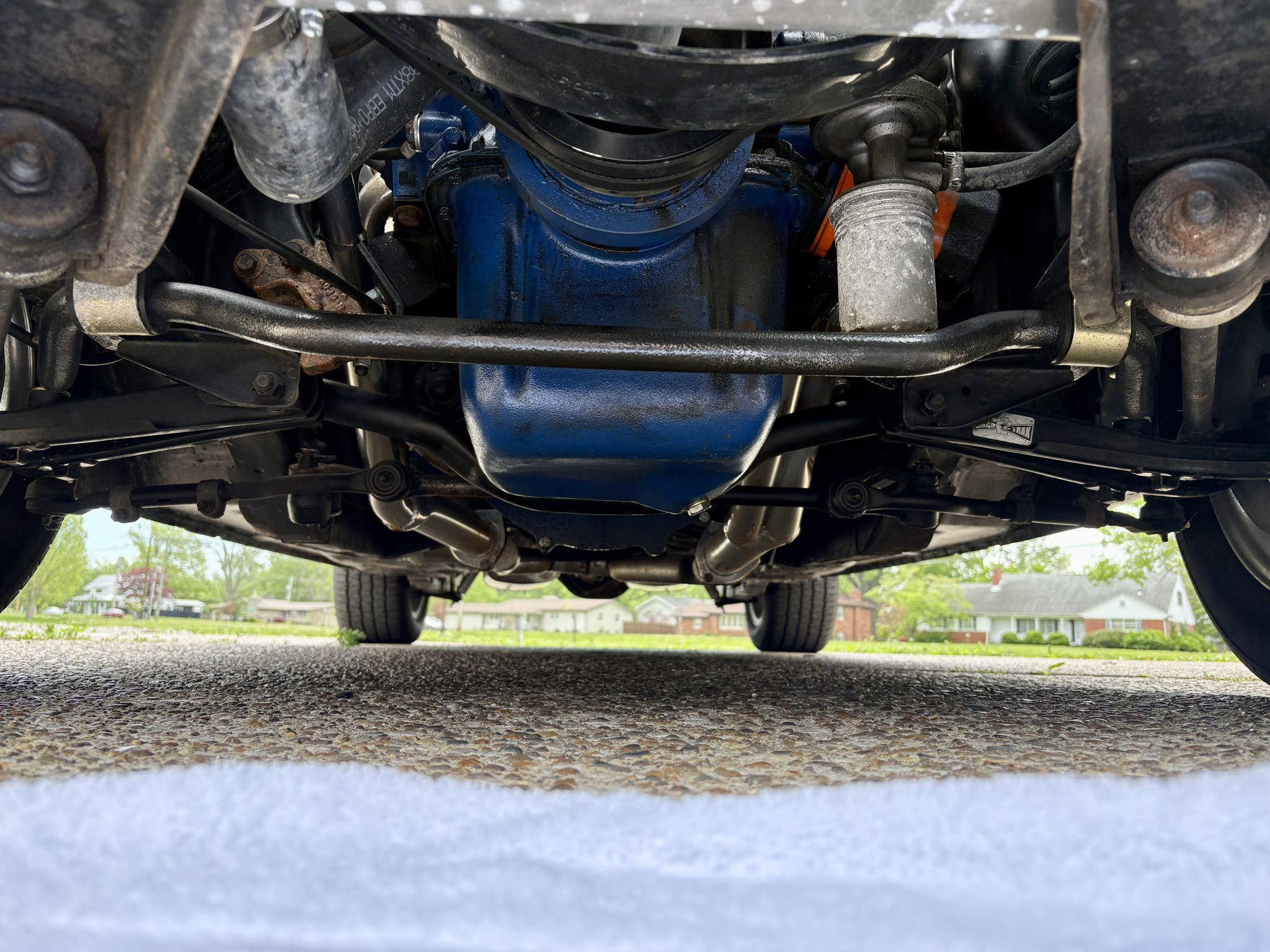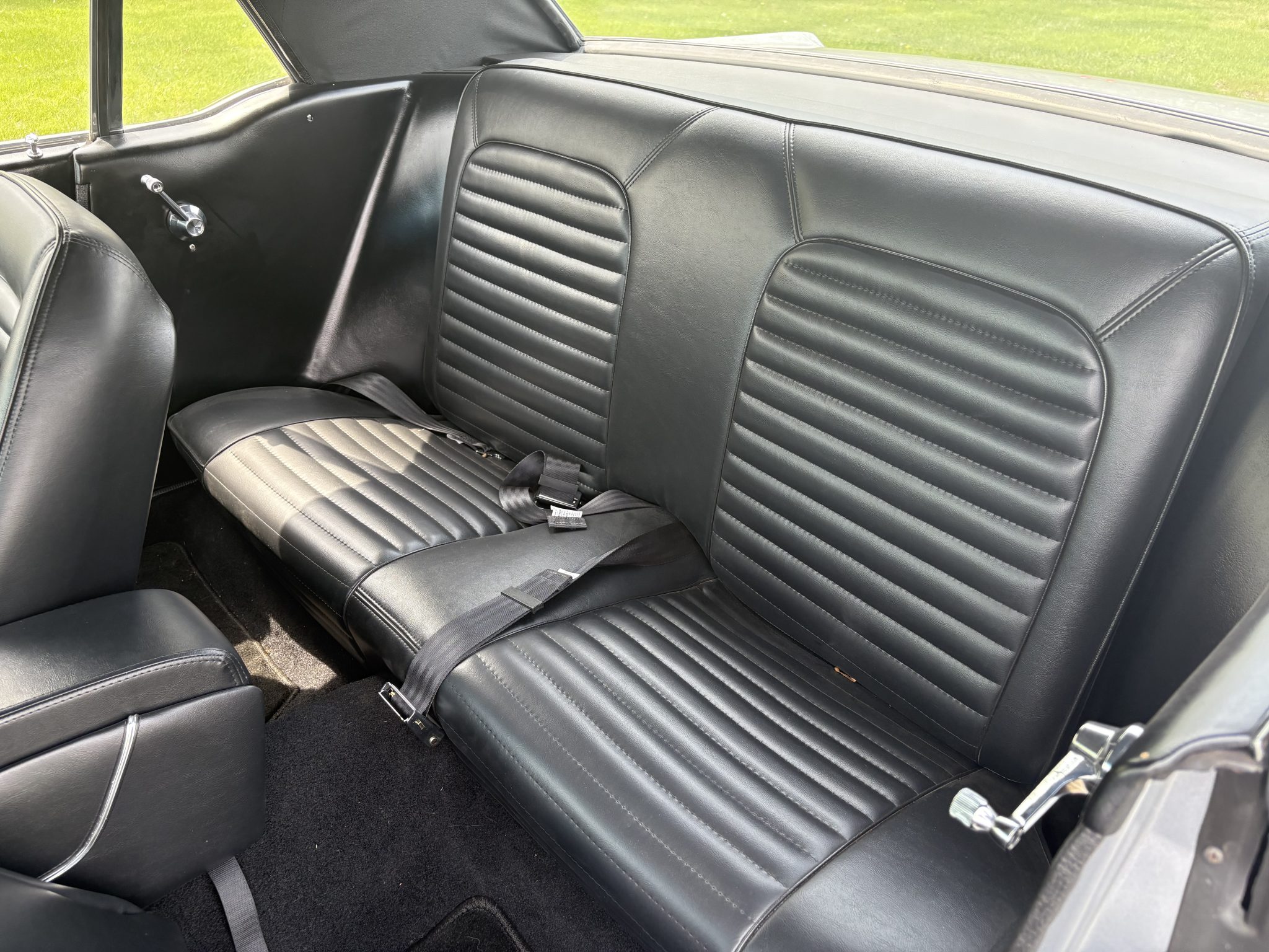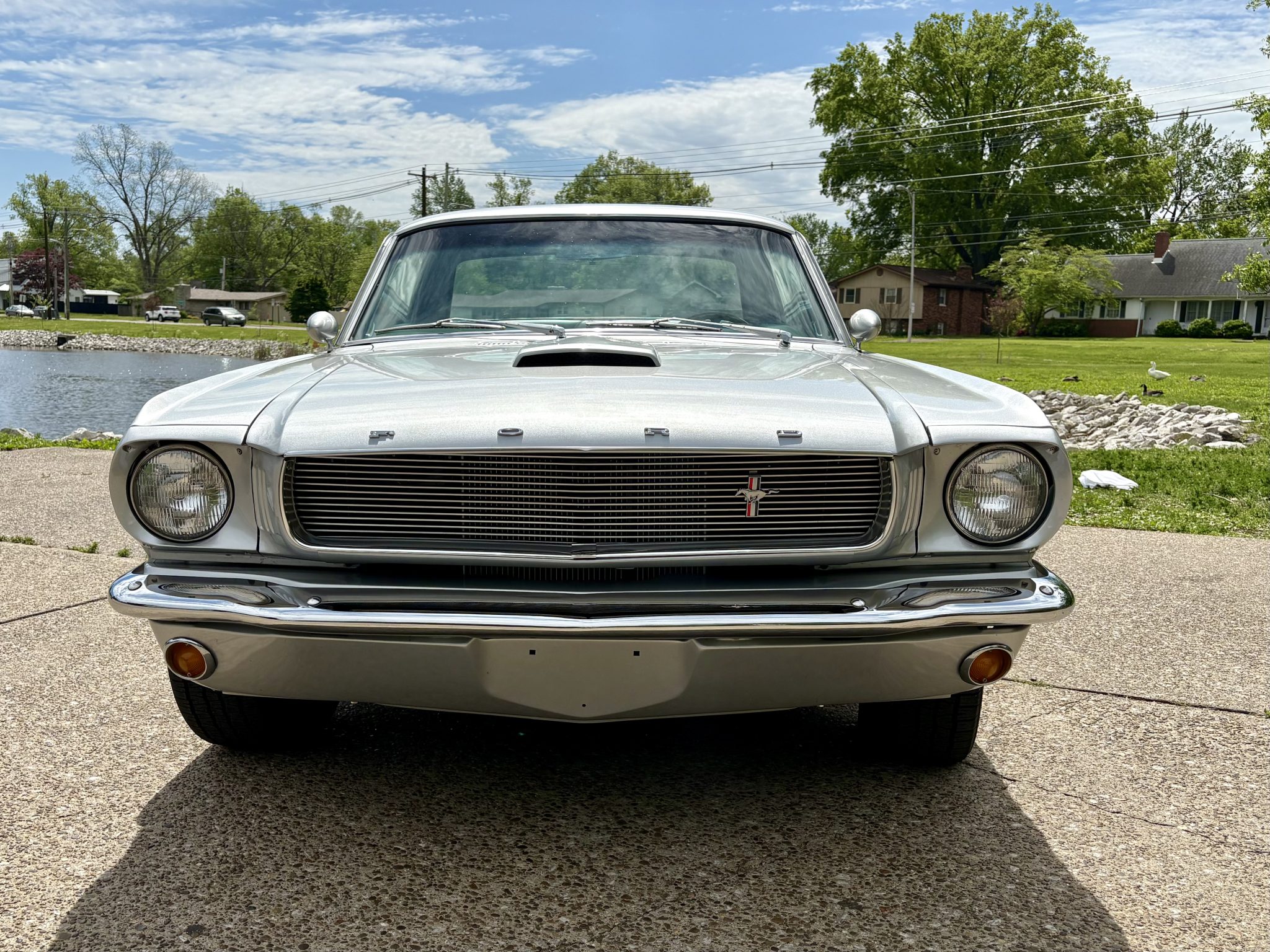 refurbishment work completed in 2015 involved overhauling the 289ci V8, refinishing the car in silver, and refreshing the black interior. The engine is equipped with a Weiand intake manifold and a Street Demon carburetor, the interior features TMI Products seating, and the car rides on 15″ American Racing Torq Thrust wheels and Grab-A-Trak suspension components. Additional equipment includes four-wheel disc brakes, power steering, MagnaFlow mufflers, a hood scoop, and bullet-style side mirrors.