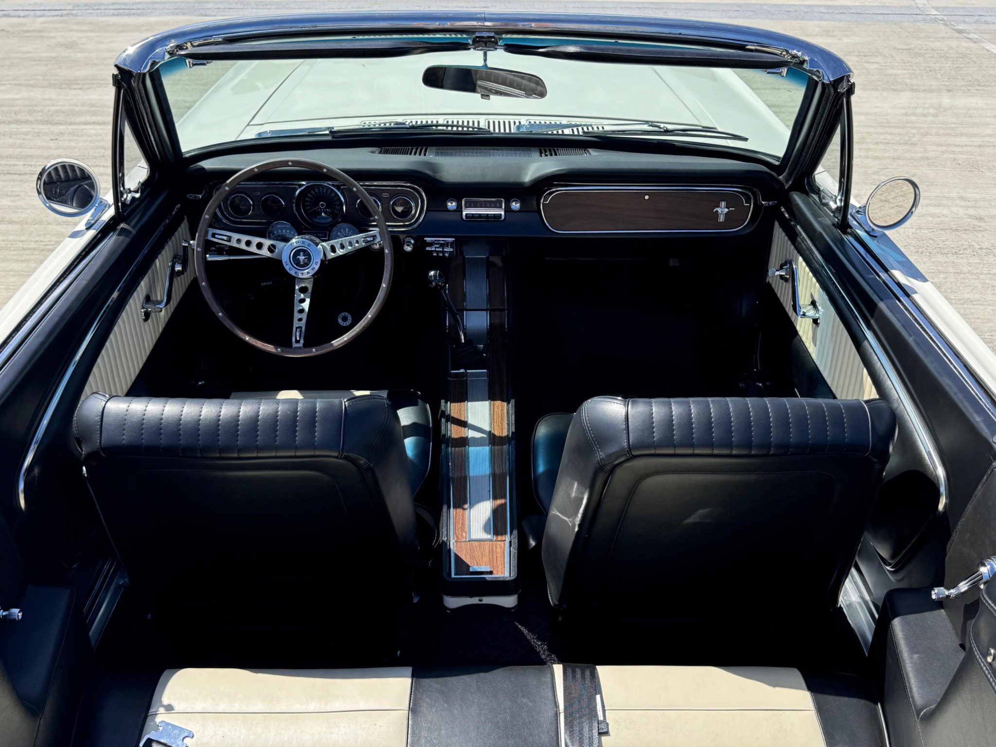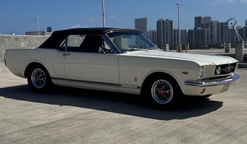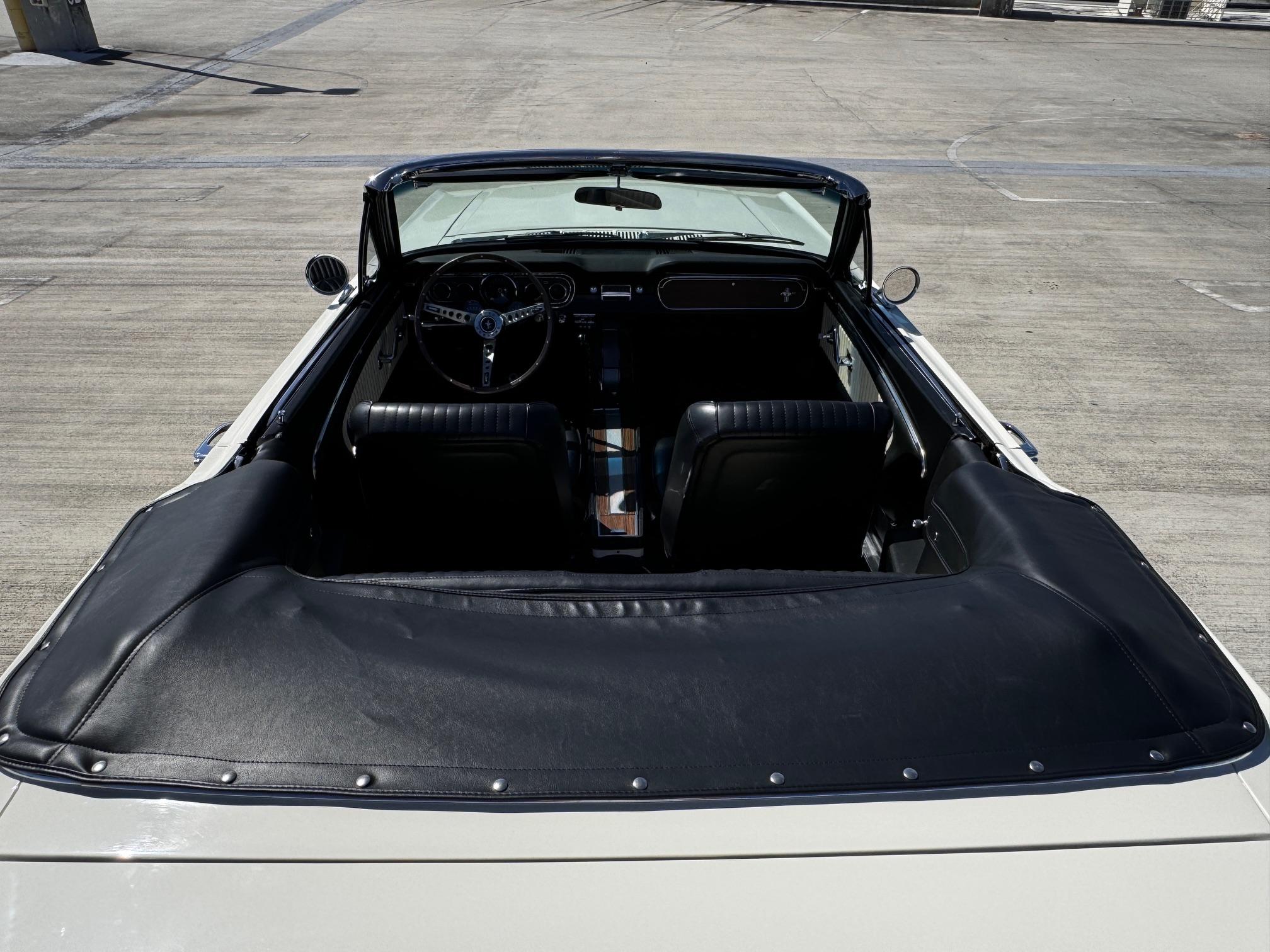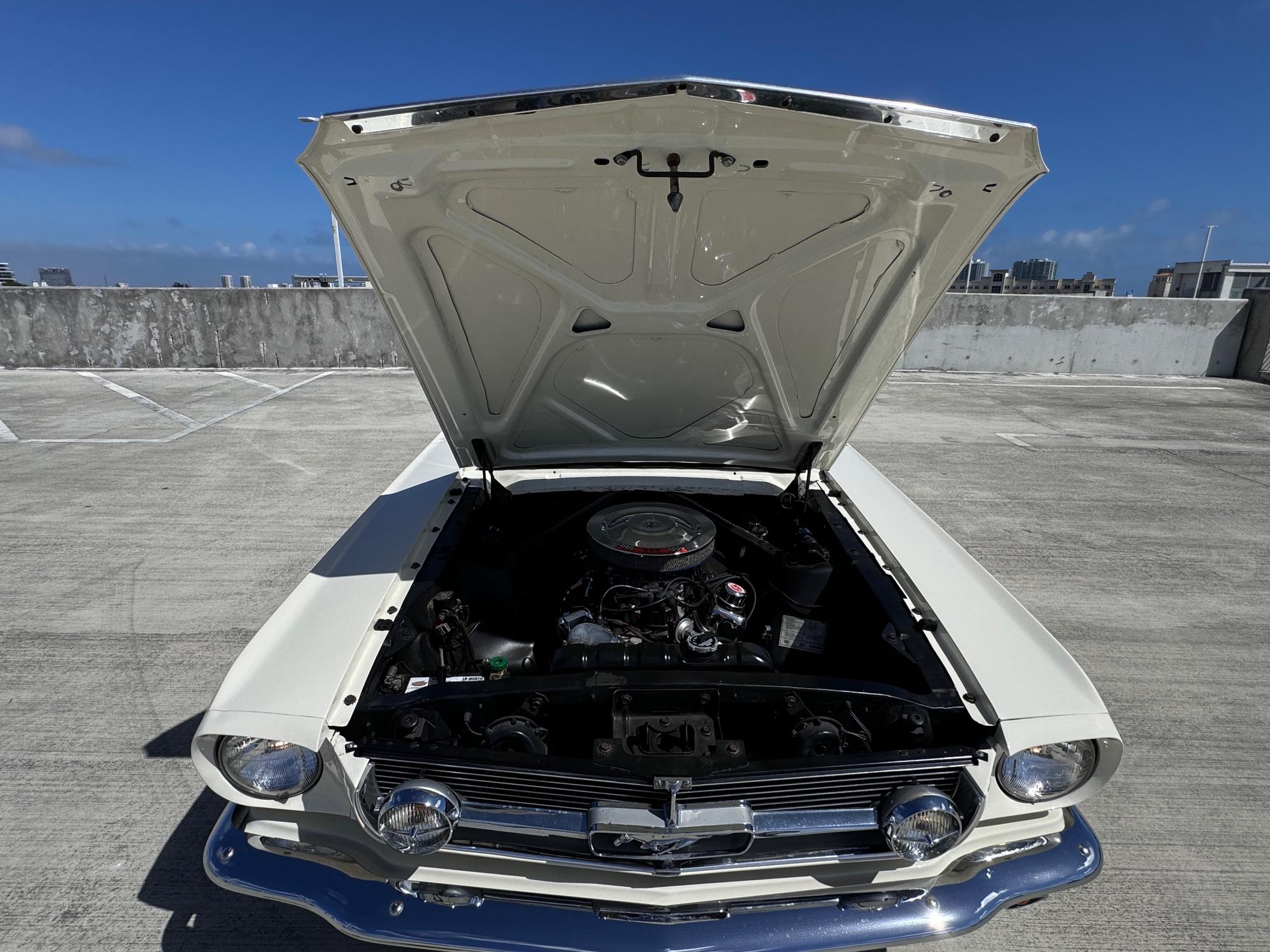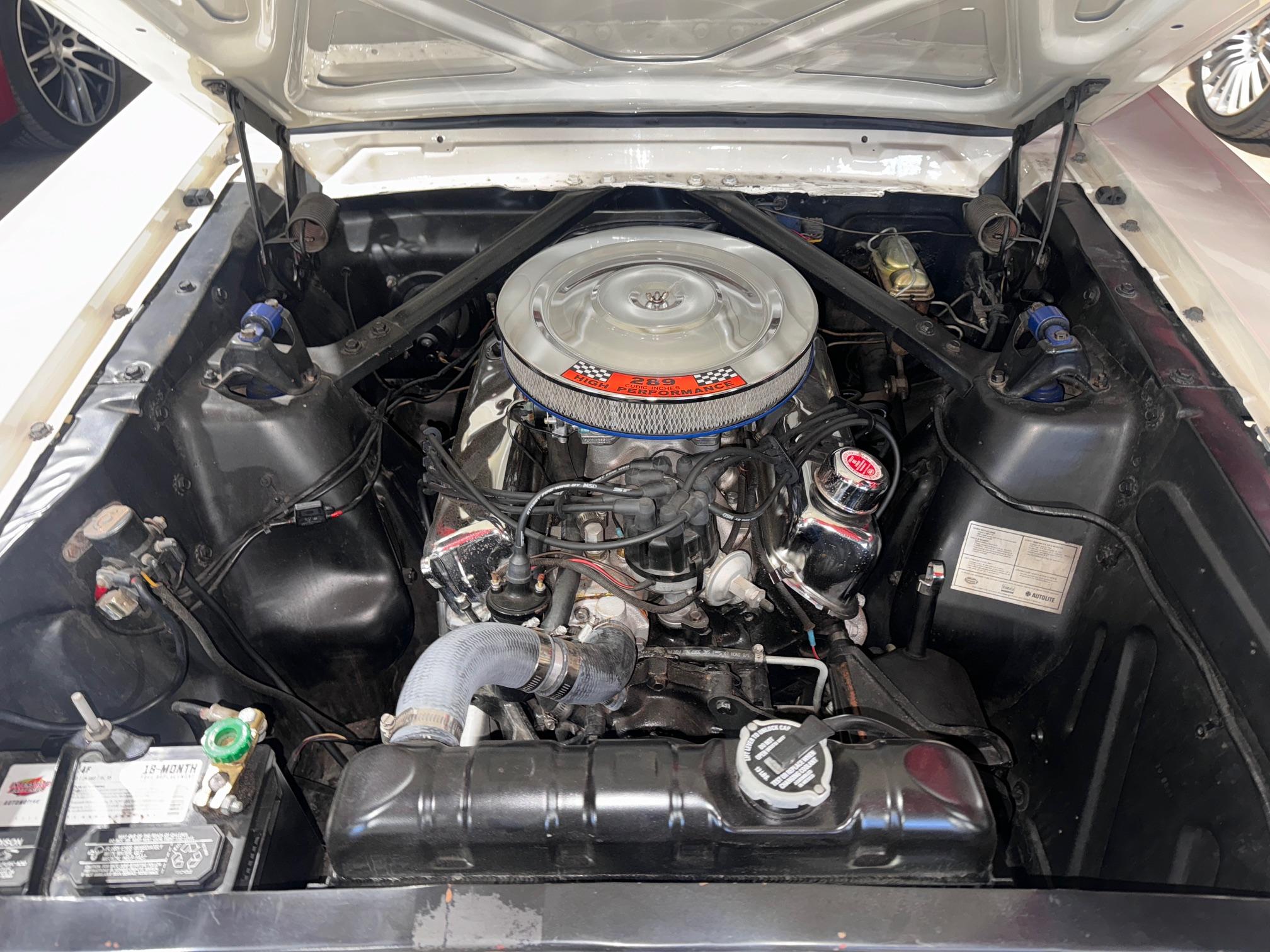 The car is powered by a replacement 289ci V8 paired with a four-speed manual transmission, and it is finished in white over black and white vinyl upholstery. Additional equipment includes 14” wheels, front disc brakes, a cabin heater, and an AM/FM radio.