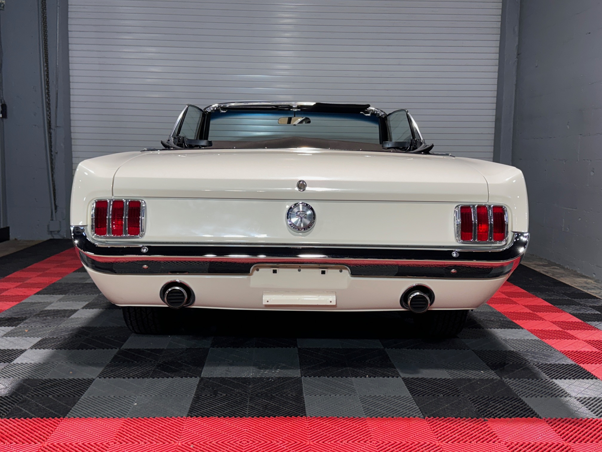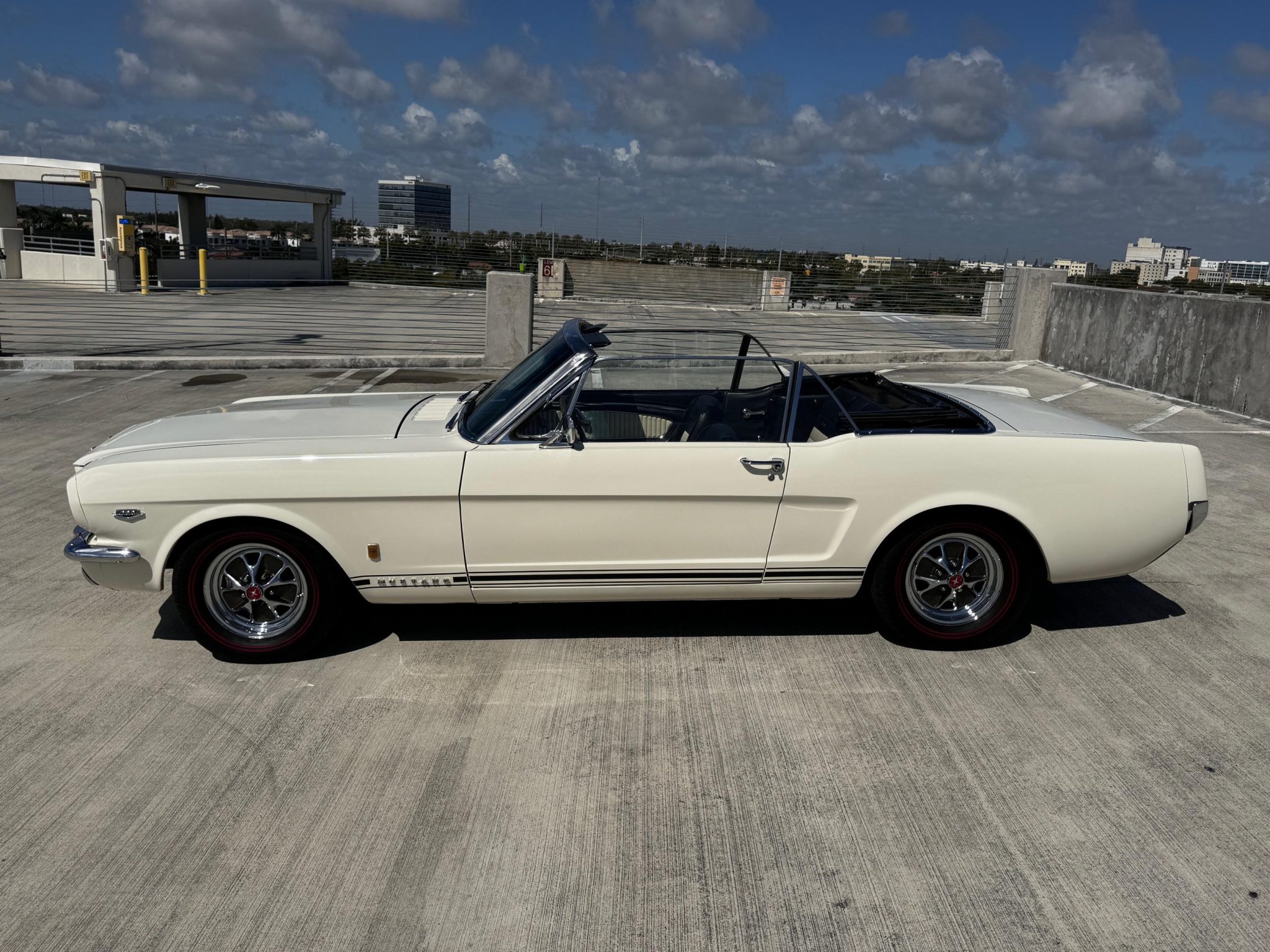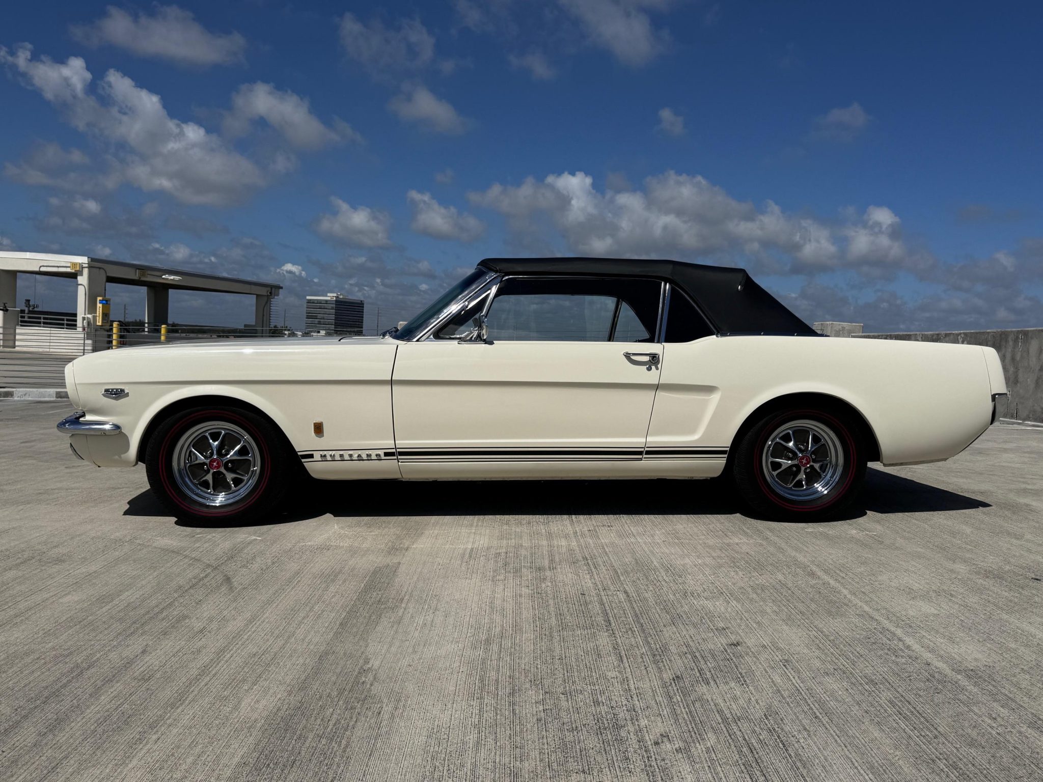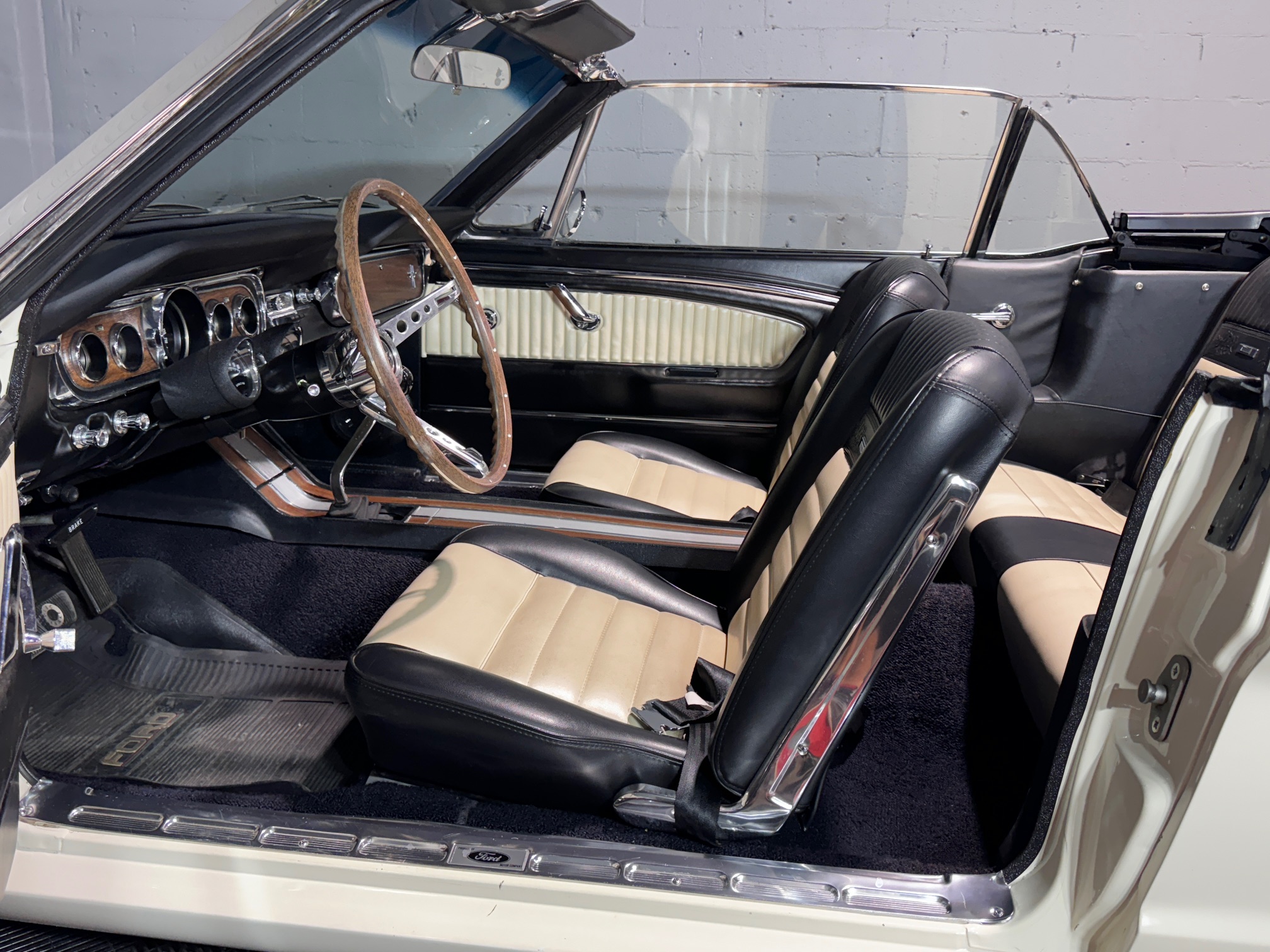 The car is powered by a replacement 289ci V8 paired with a four-speed manual transmission, and it is finished in white over black and white vinyl upholstery. Additional equipment includes 14” wheels, front disc brakes, a cabin heater, and an AM/FM radio.