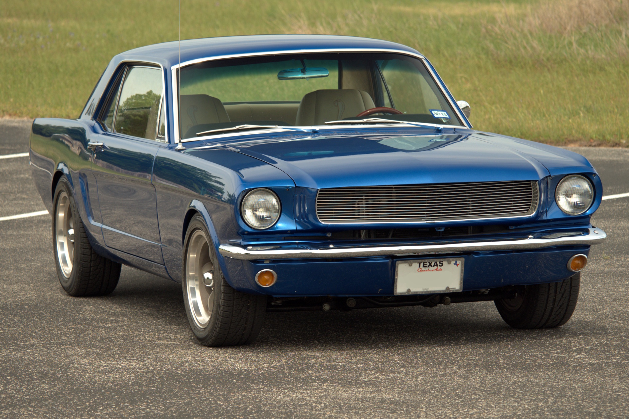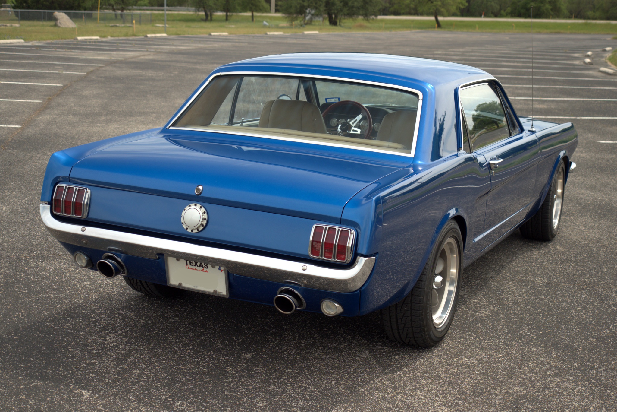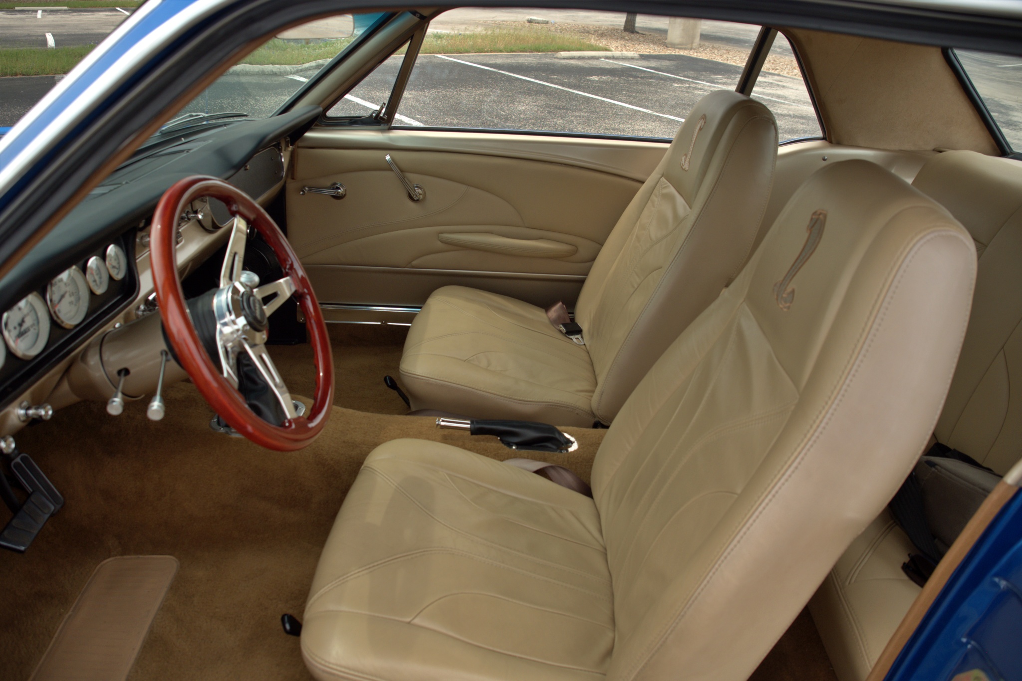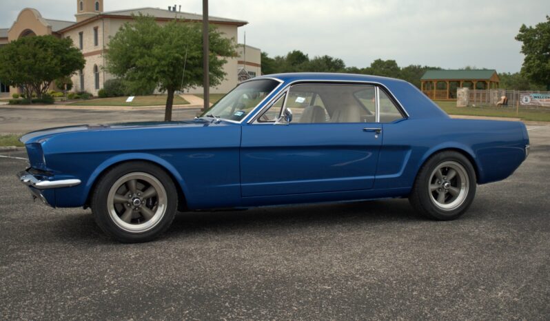 This 1965 Ford Mustang coupe is powered by a fuel-injected 331ci V8 paired with an Art Carr-built four-speed automatic transmission. It is finished in PPG Dodge Viper Blue Metallic over tan leather upholstery, and equipment includes a Ford 9″ rear axle with a limited-slip differential, an AJE front suspension with Bilstein coilovers, Wilwood front disc brakes, rear disc brakes, an Ididit tilt steering column, Vintage Air air conditioning, and 16″ Torque Thrust wheels.