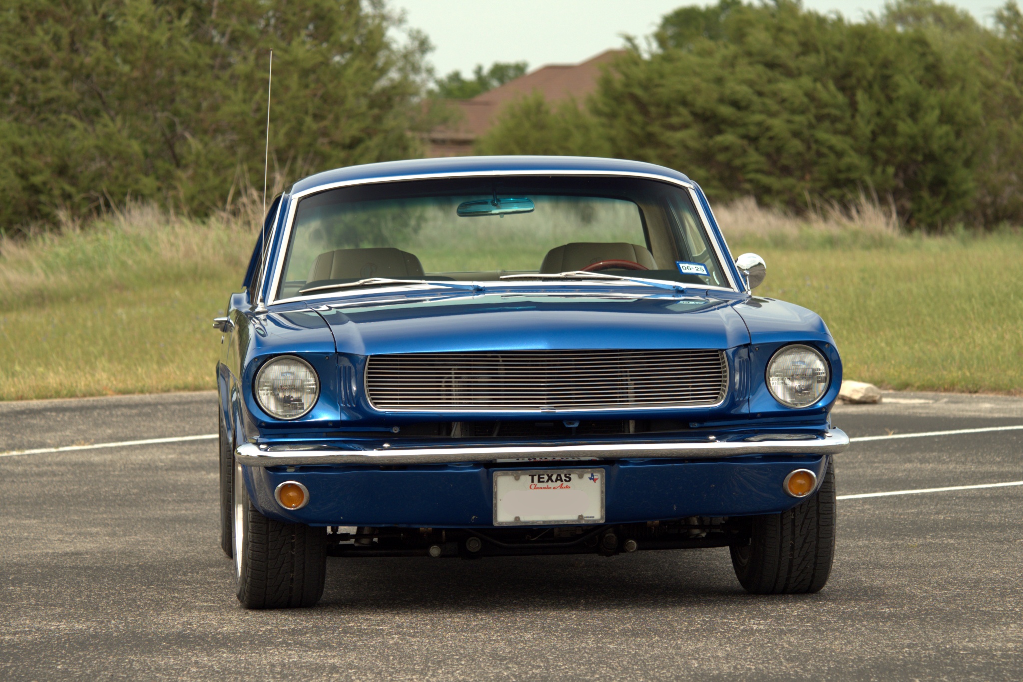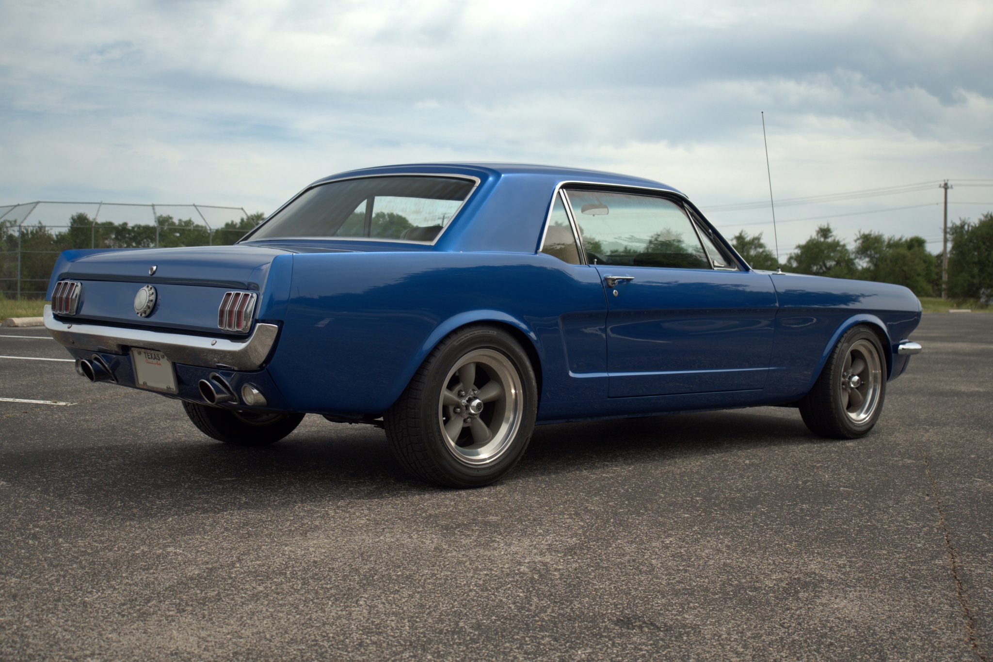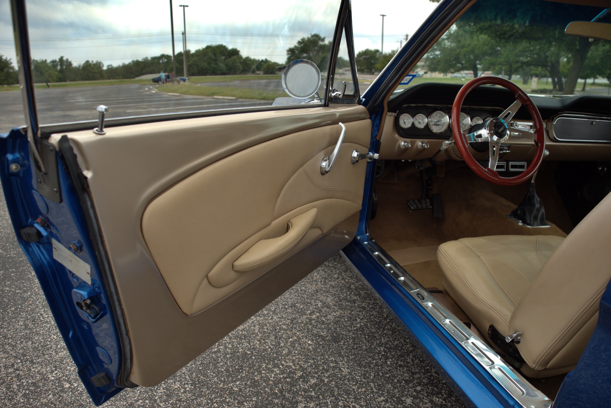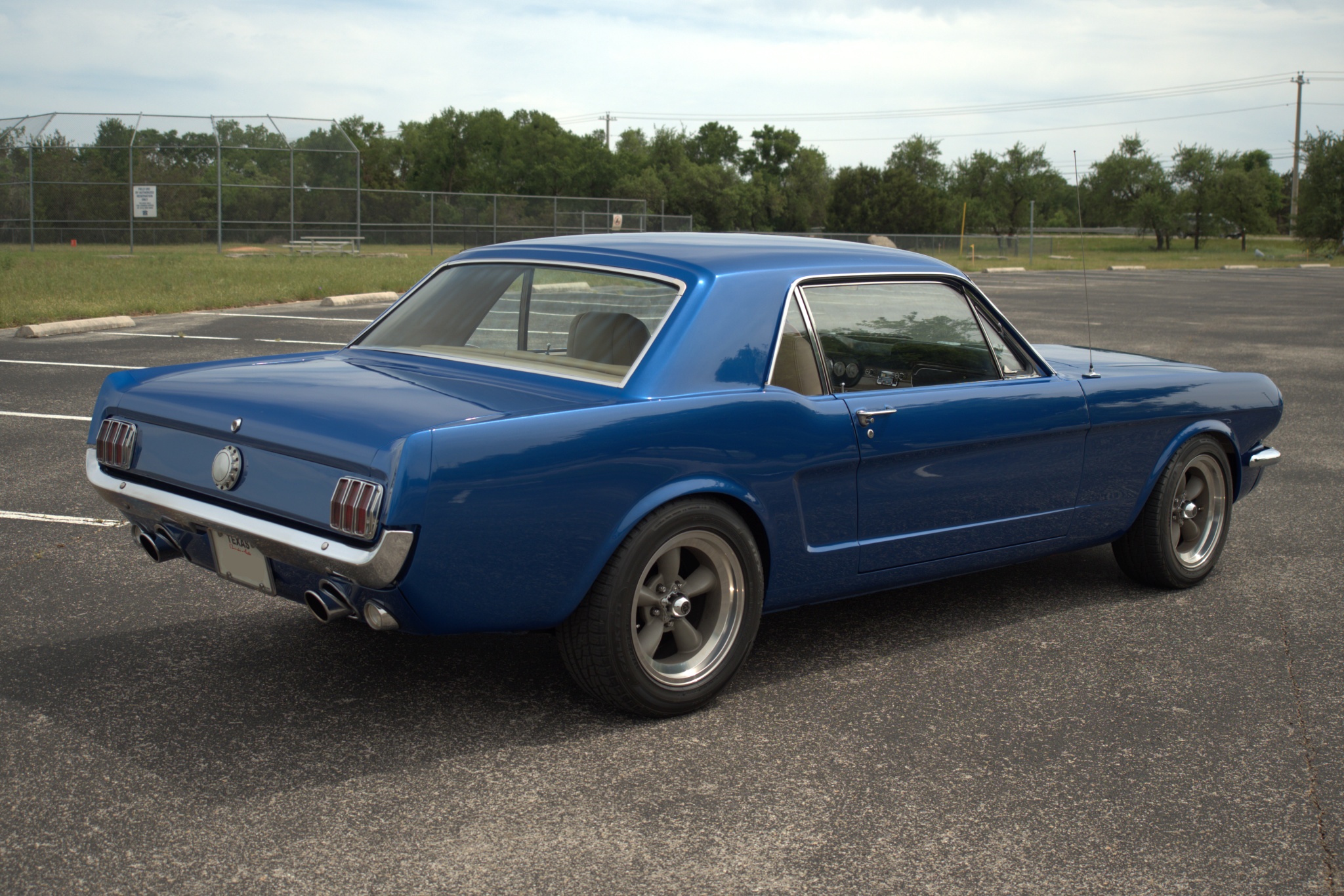 This 1965 Ford Mustang coupe is powered by a fuel-injected 331ci V8 paired with an Art Carr-built four-speed automatic transmission. It is finished in PPG Dodge Viper Blue Metallic over tan leather upholstery, and equipment includes a Ford 9″ rear axle with a limited-slip differential, an AJE front suspension with Bilstein coilovers, Wilwood front disc brakes, rear disc brakes, an Ididit tilt steering column, Vintage Air air conditioning, and 16″ Torque Thrust wheels.