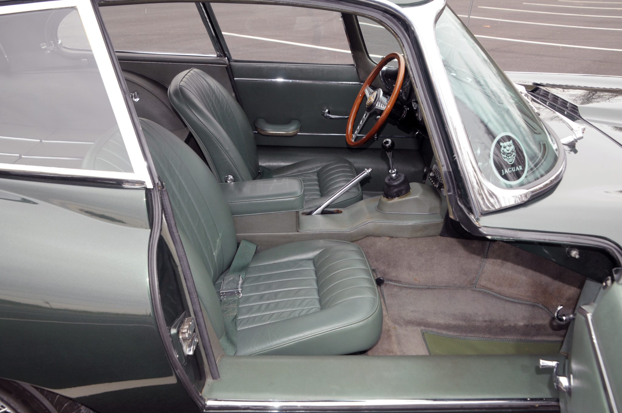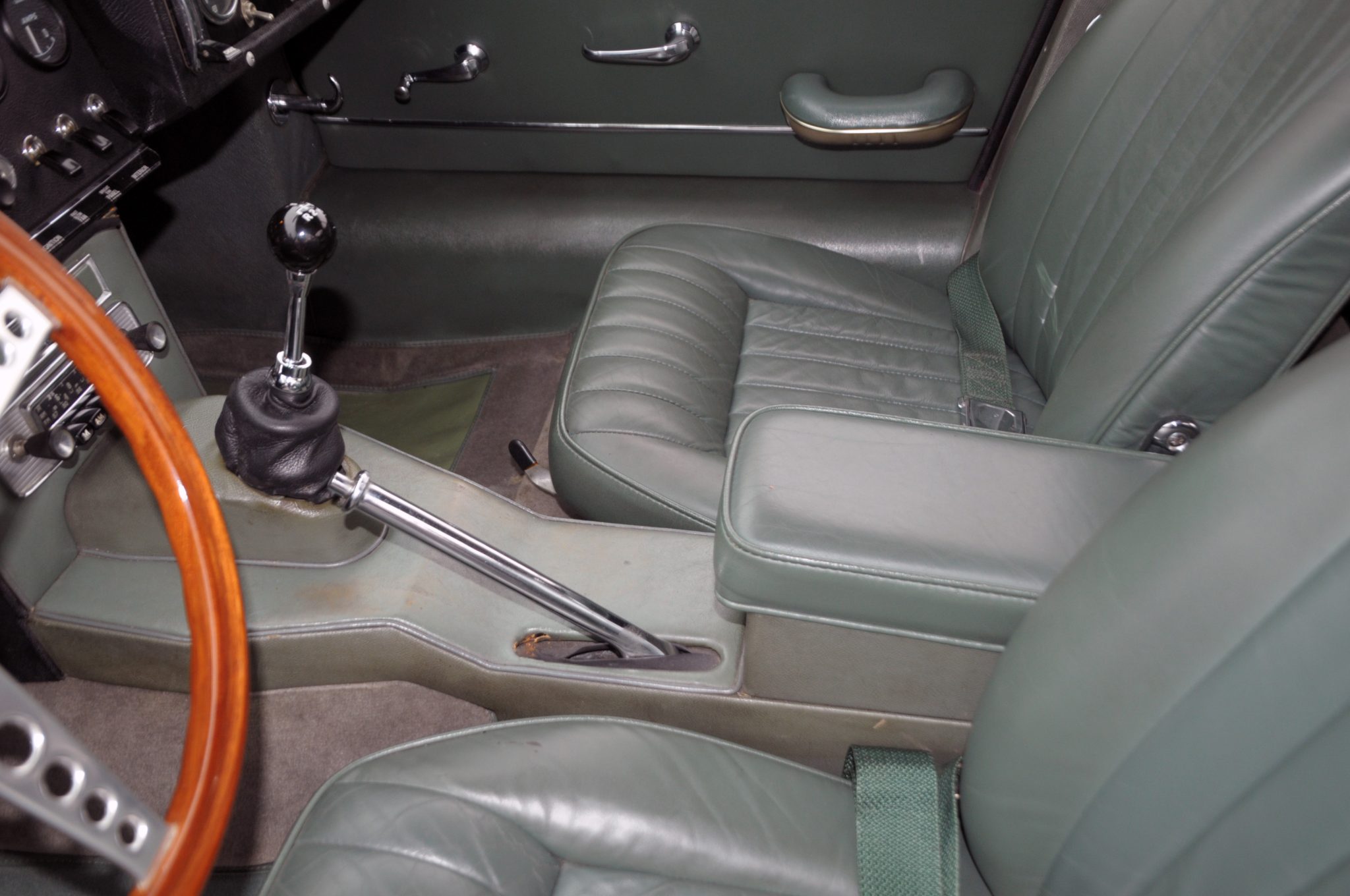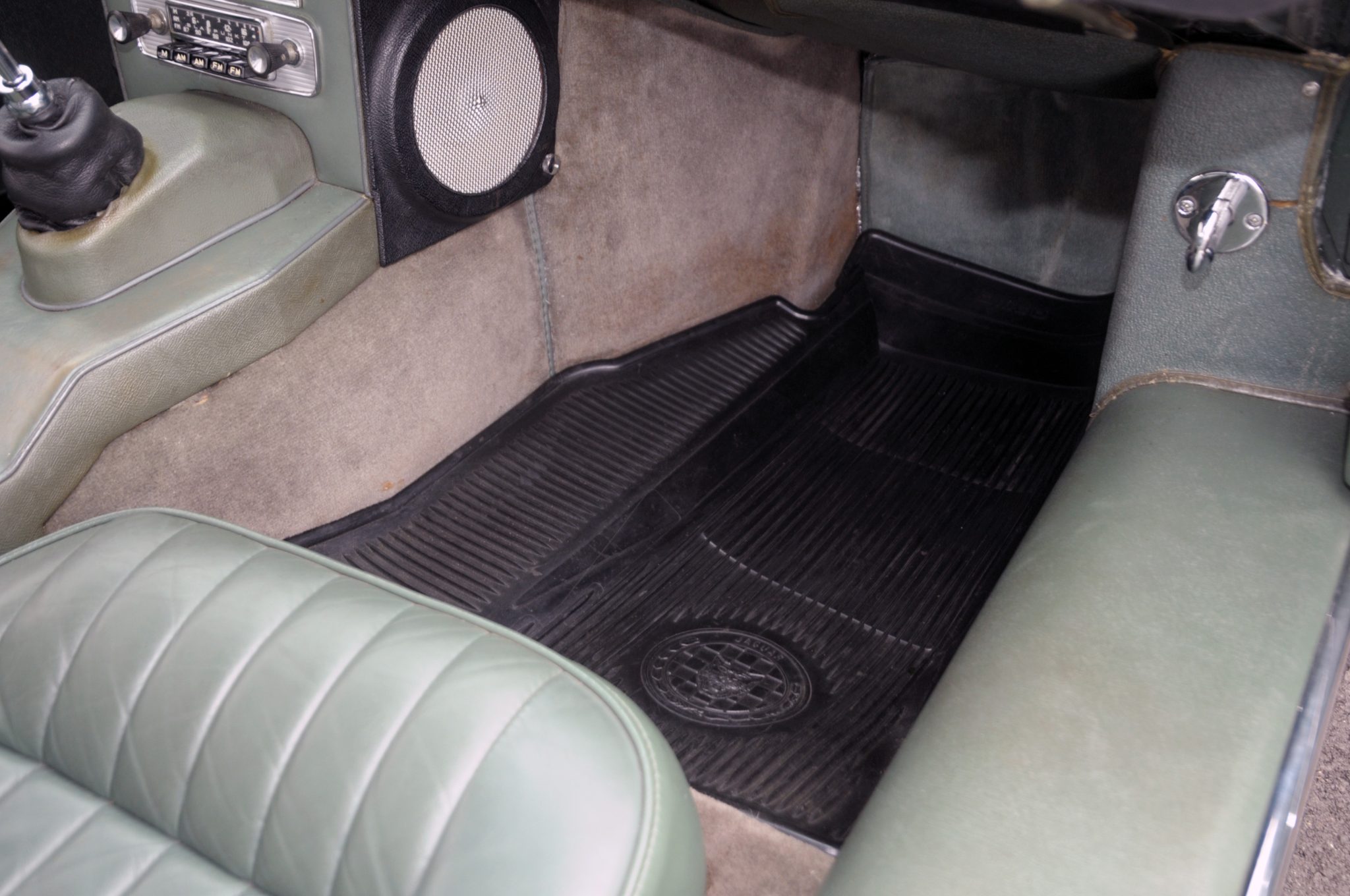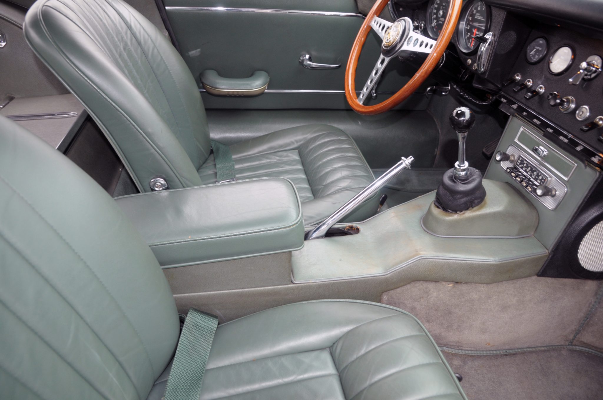 Power is supplied by a replacement 4.2L inline-six linked to a four-speed manual transmission and a limited-slip differential. Finished in Opalescent Dark Green over Suede Green leather, the car is equipped with enclosed headlights, 15″ wire-spoke wheels, power-assisted disc brakes, triple windshield wipers, an AM/FM radio, and a heater.