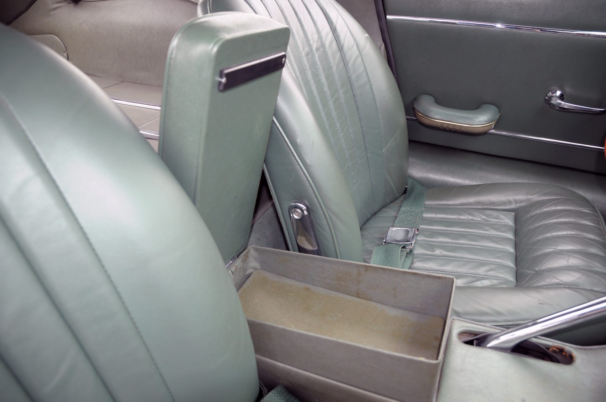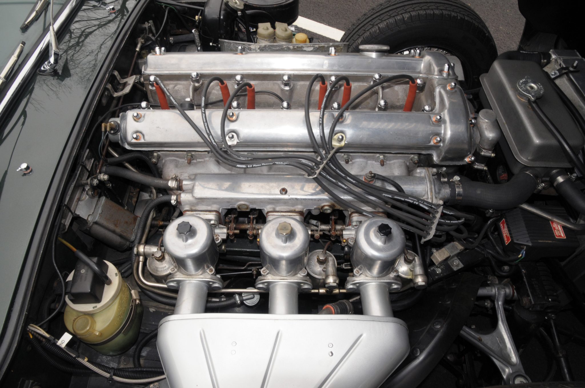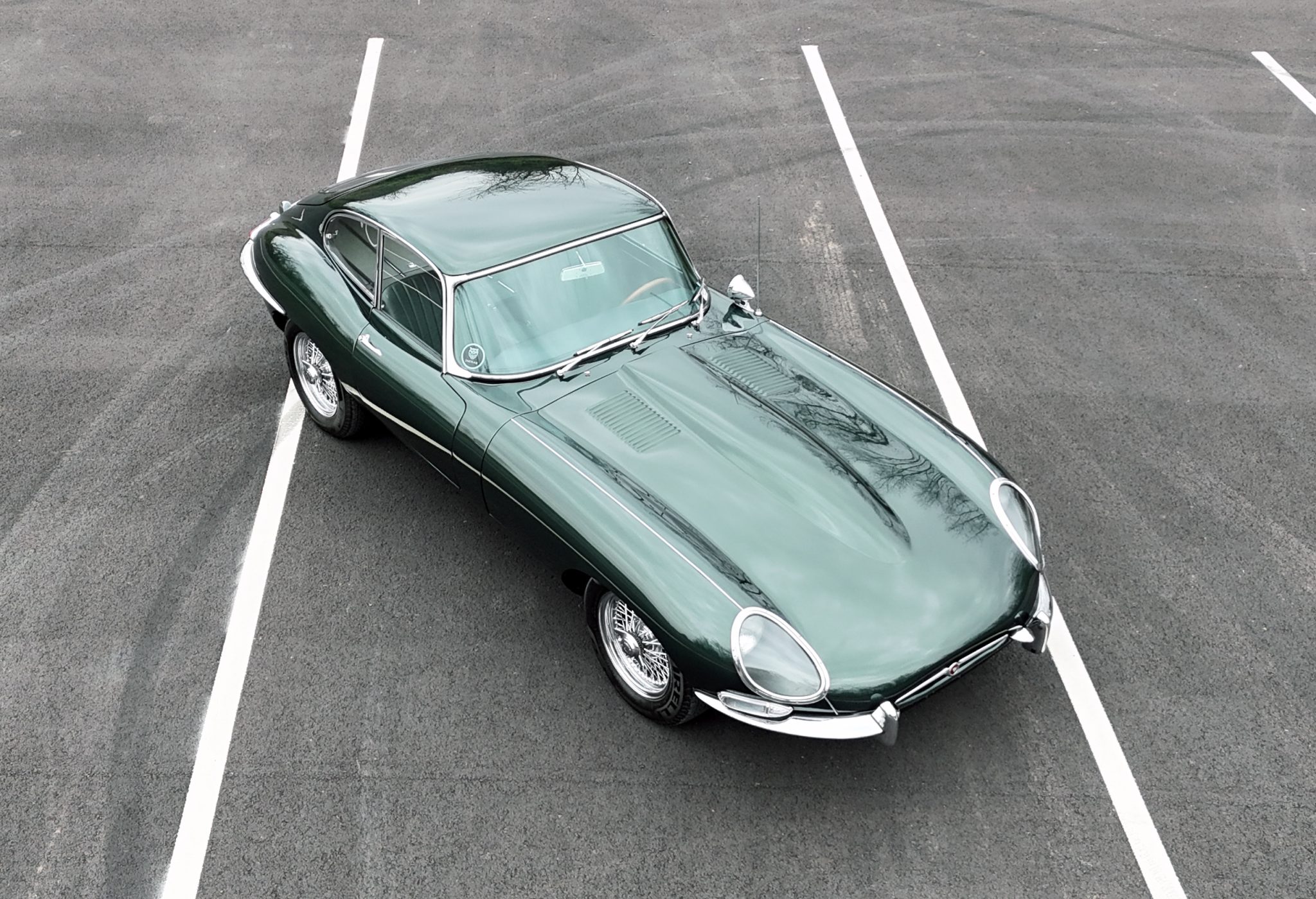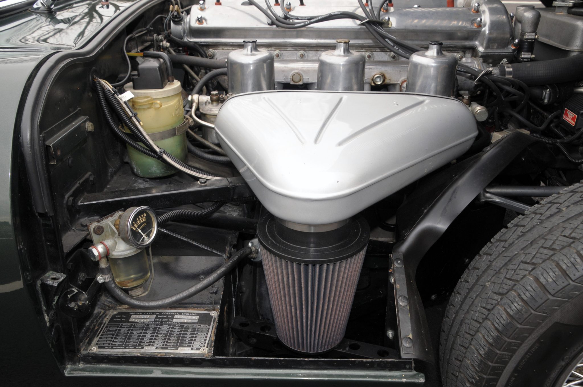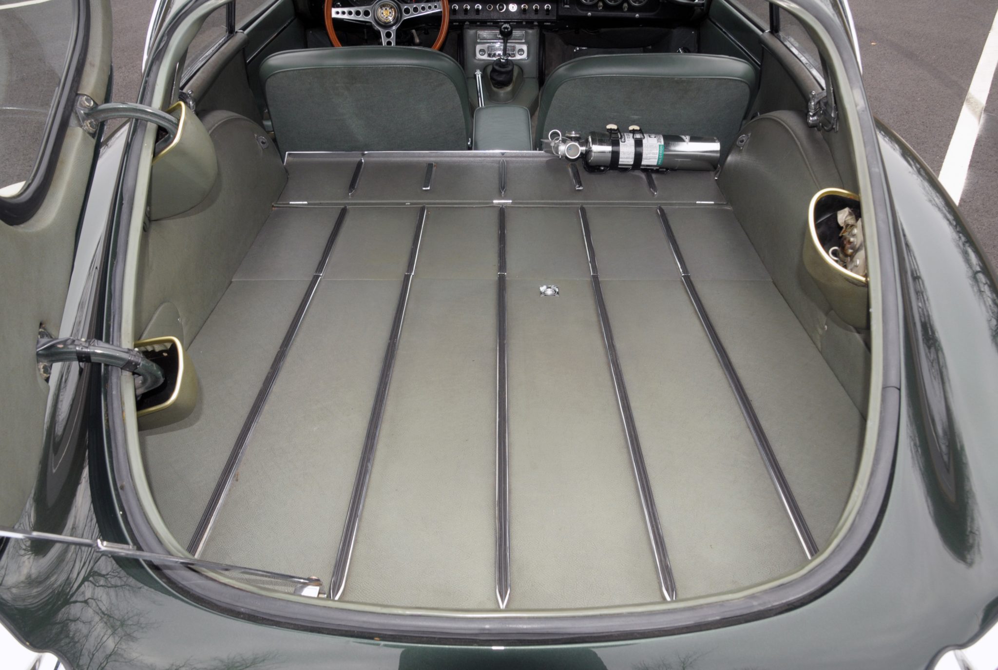 Power is supplied by a replacement 4.2L inline-six linked to a four-speed manual transmission and a limited-slip differential. Finished in Opalescent Dark Green over Suede Green leather, the car is equipped with enclosed headlights, 15″ wire-spoke wheels, power-assisted disc brakes, triple windshield wipers, an AM/FM radio, and a heater.