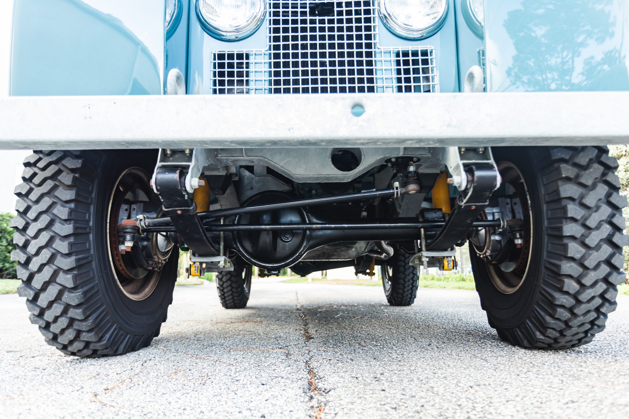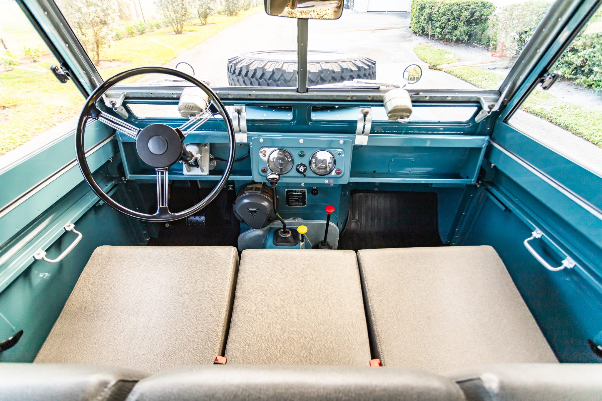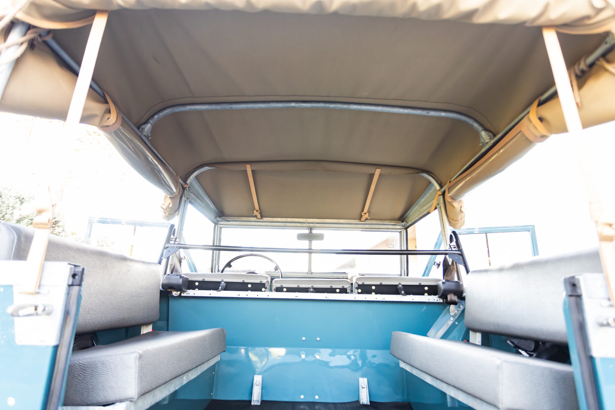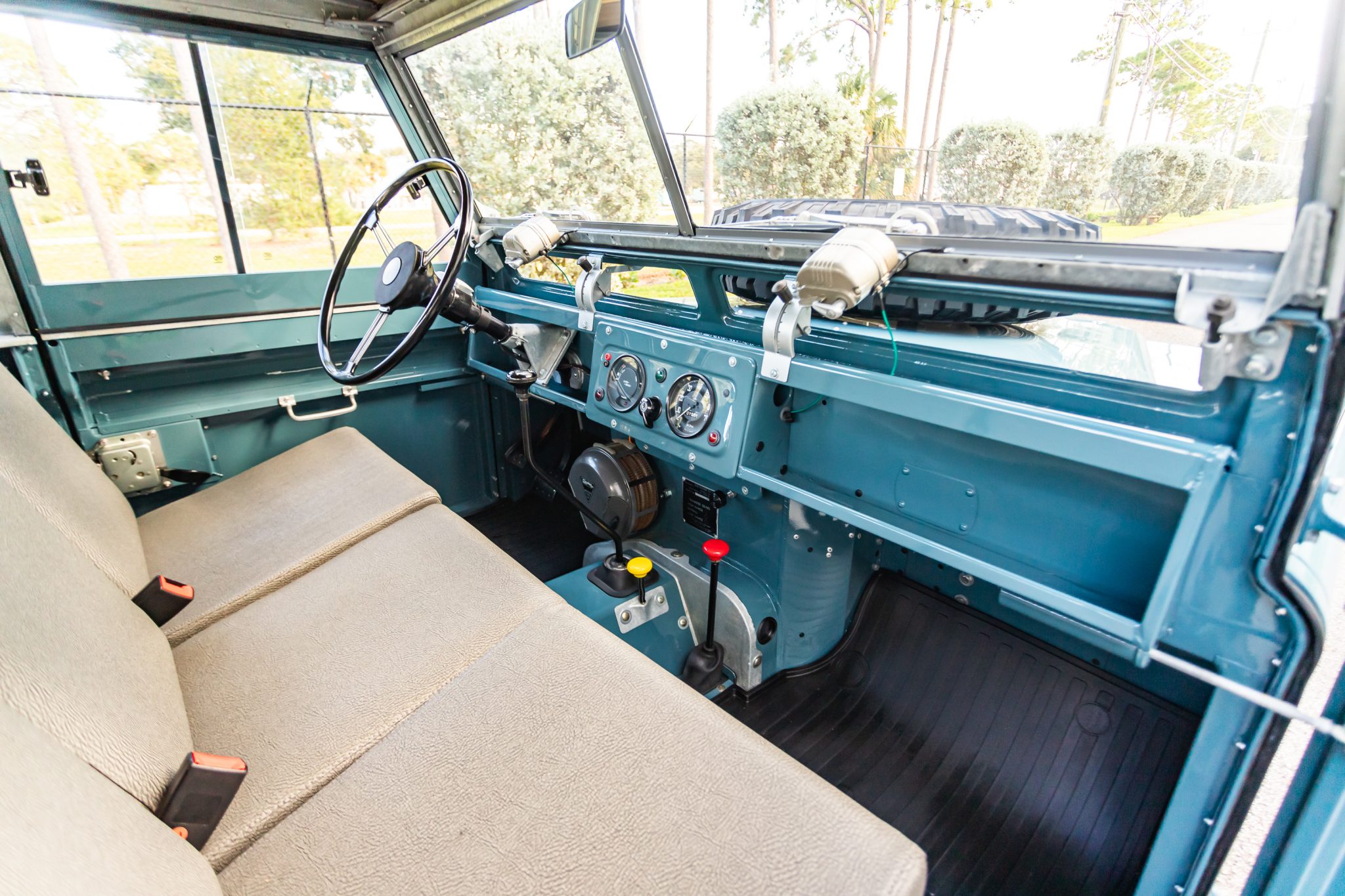 Work during the build reportedly included a repaint in Marine Blue, installing a replacement galvanized steel frame, overhauling the 2.25-liter gasoline inline-four and four-speed manual transmission, fitting Old Man Emu shock absorbers, and re-trimming the interior in gray elephant hide-pattern vinyl. Equipment includes a two-speed transfer case, a beige soft top, Rocky Mountain aluminum door tops, 16″ steel wheels, manually locking front hubs, four-wheel disc brakes, a heater, three-point front seat belts, electronic fuel injection, electronic ignition, and a stainless-steel fuel tank and exhaust system.
