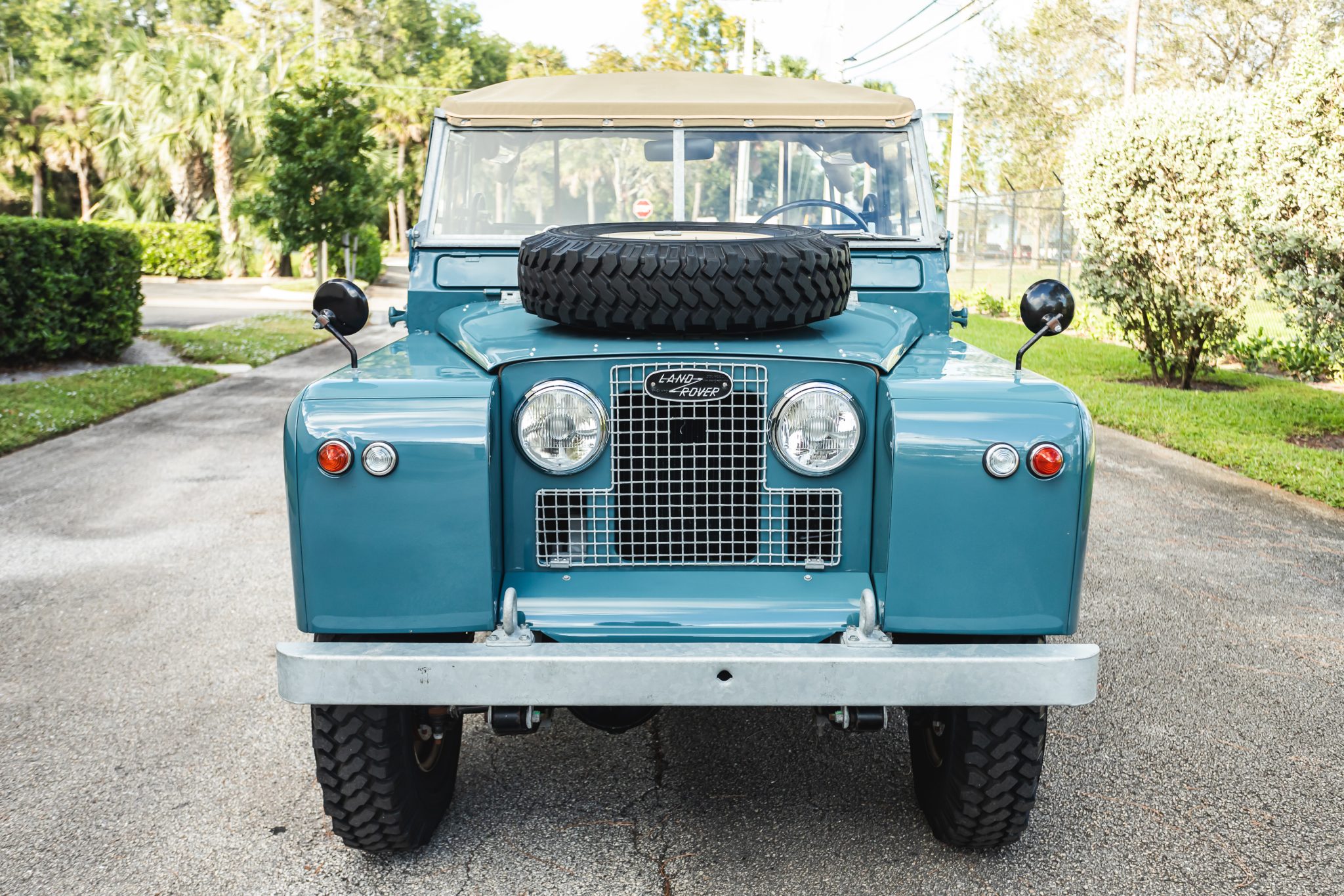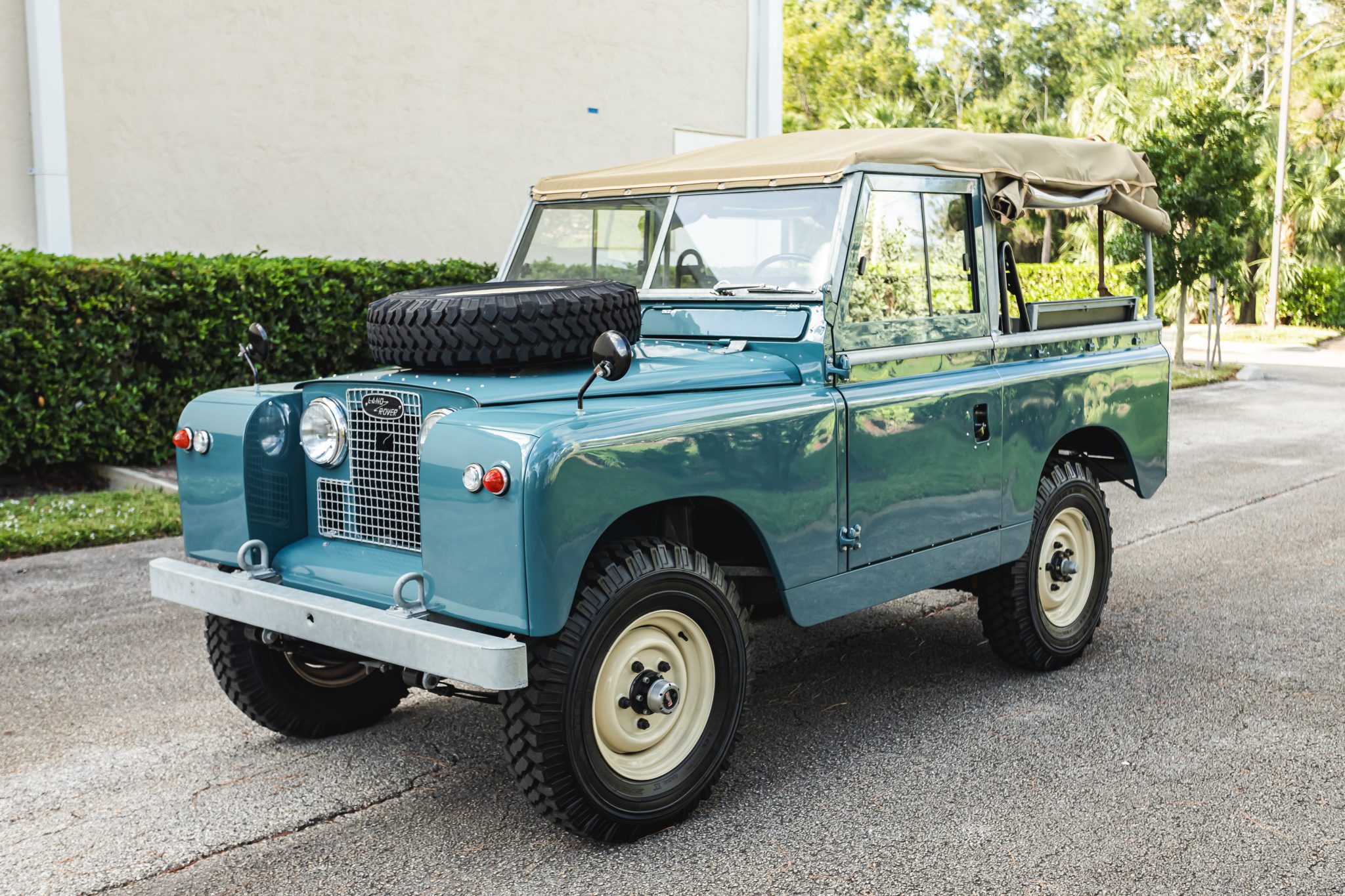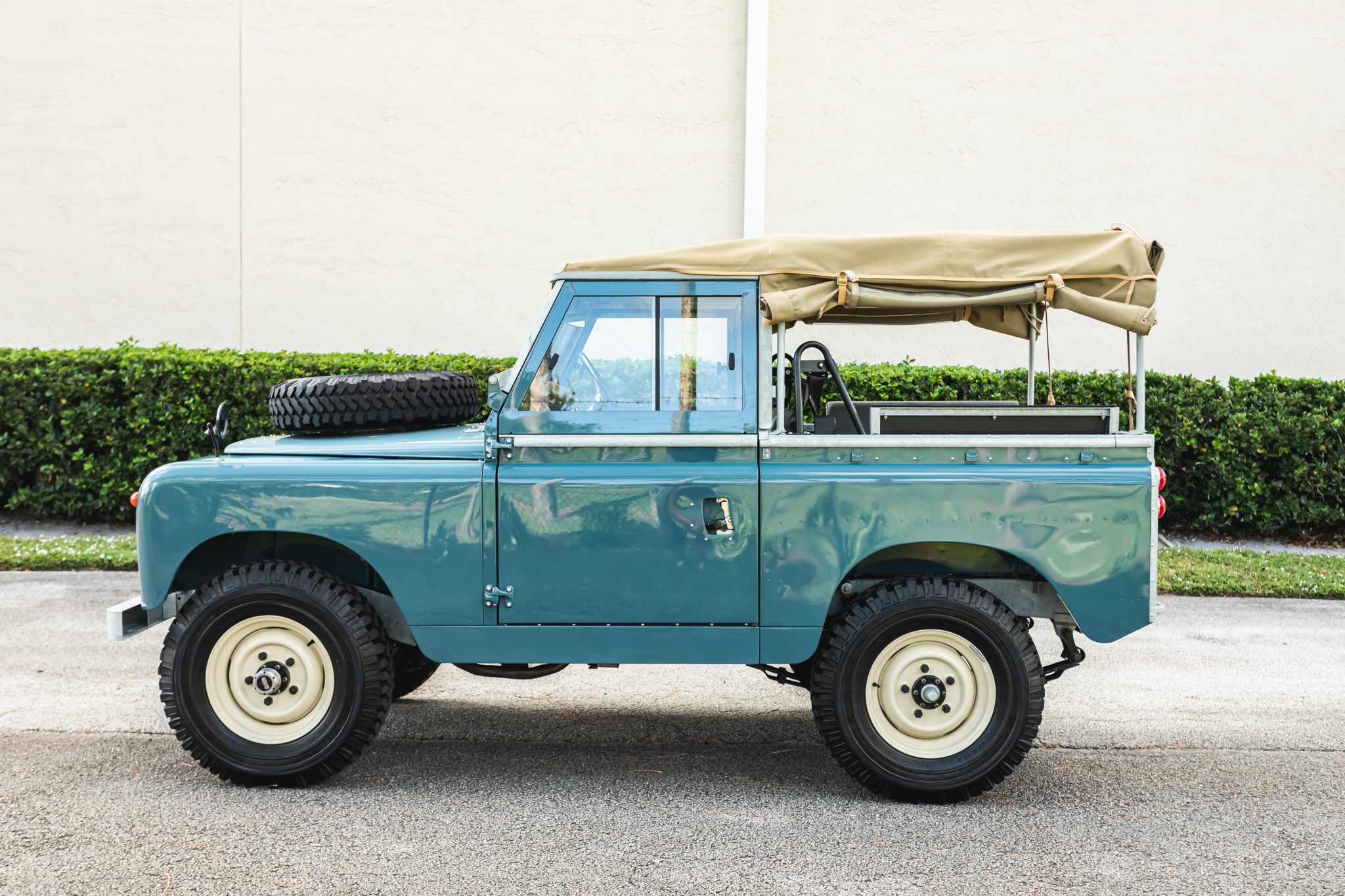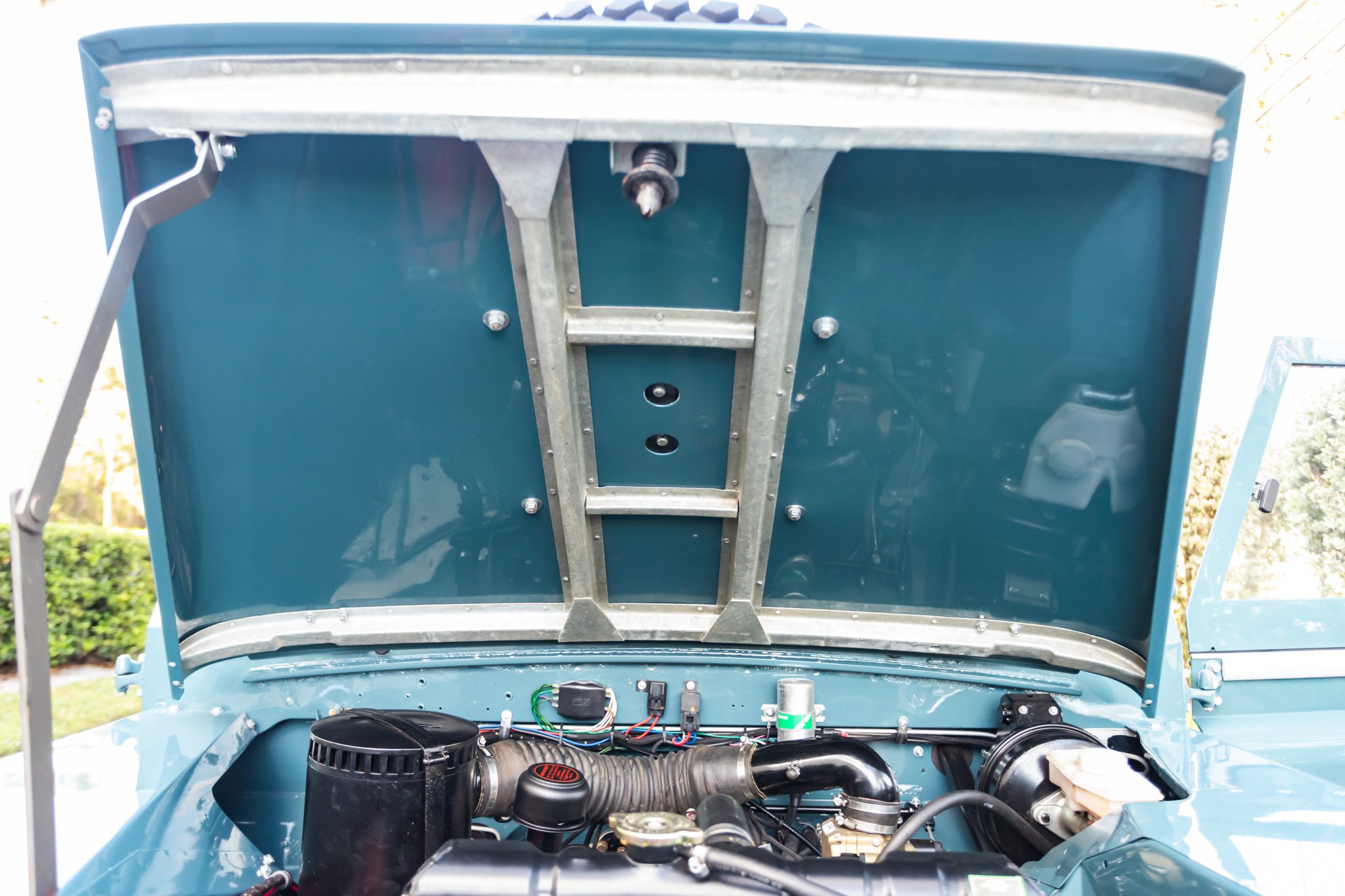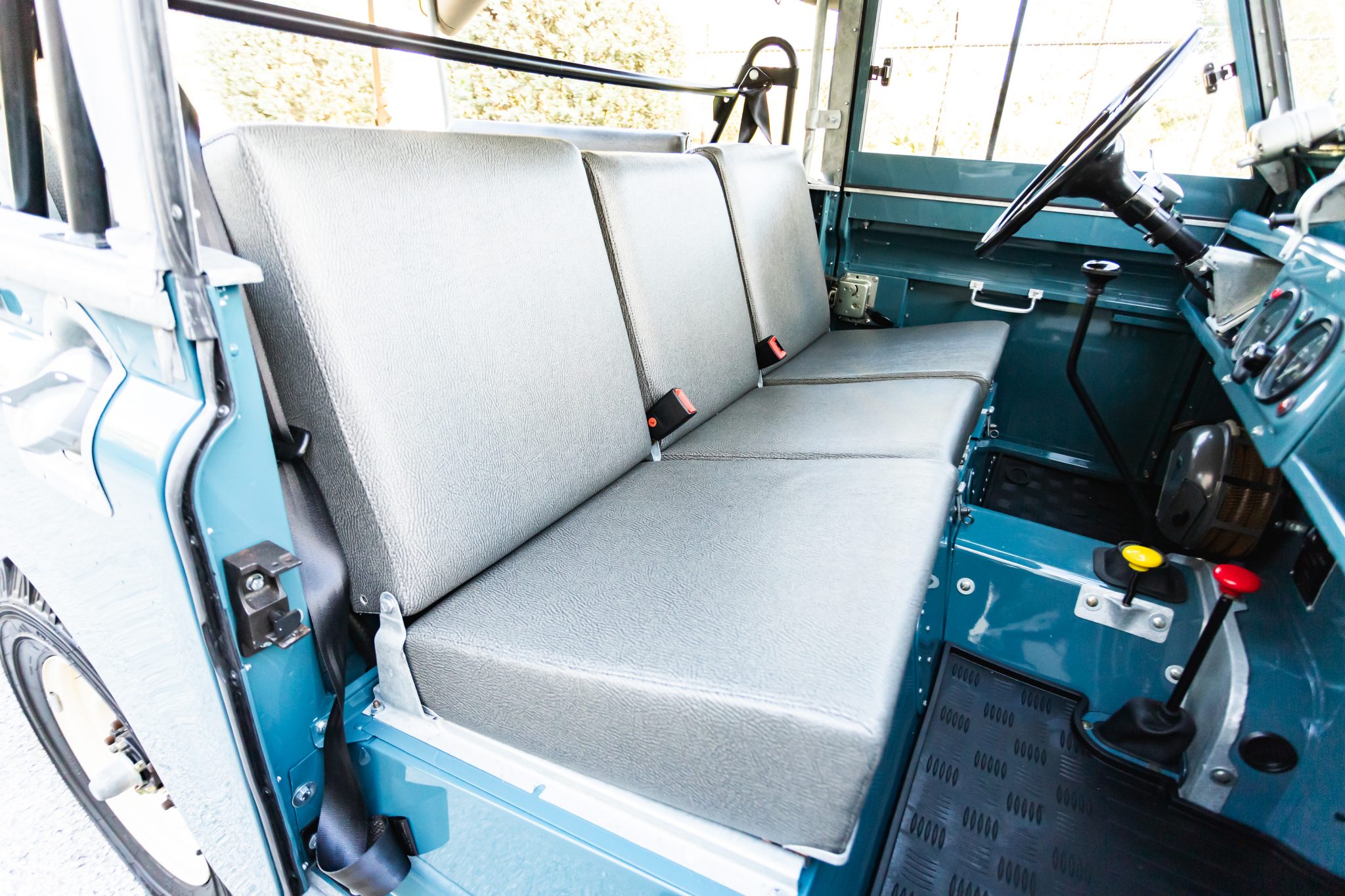 Work during the build reportedly included a repaint in Marine Blue, installing a replacement galvanized steel frame, overhauling the 2.25-liter gasoline inline-four and four-speed manual transmission, fitting Old Man Emu shock absorbers, and re-trimming the interior in gray elephant hide-pattern vinyl. Equipment includes a two-speed transfer case, a beige soft top, Rocky Mountain aluminum door tops, 16″ steel wheels, manually locking front hubs, four-wheel disc brakes, a heater, three-point front seat belts, electronic fuel injection, electronic ignition, and a stainless-steel fuel tank and exhaust system.