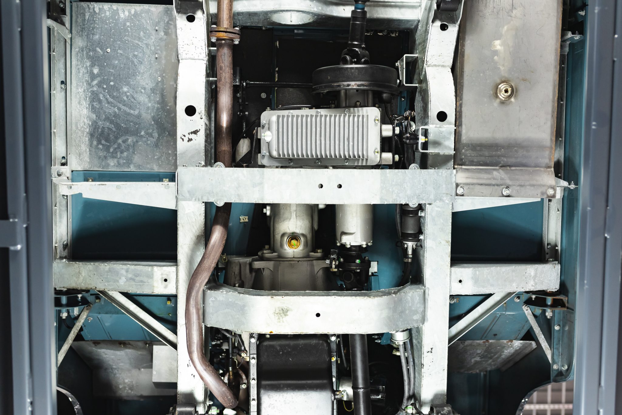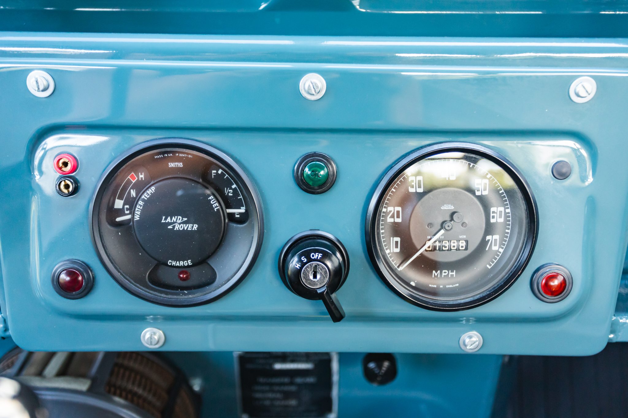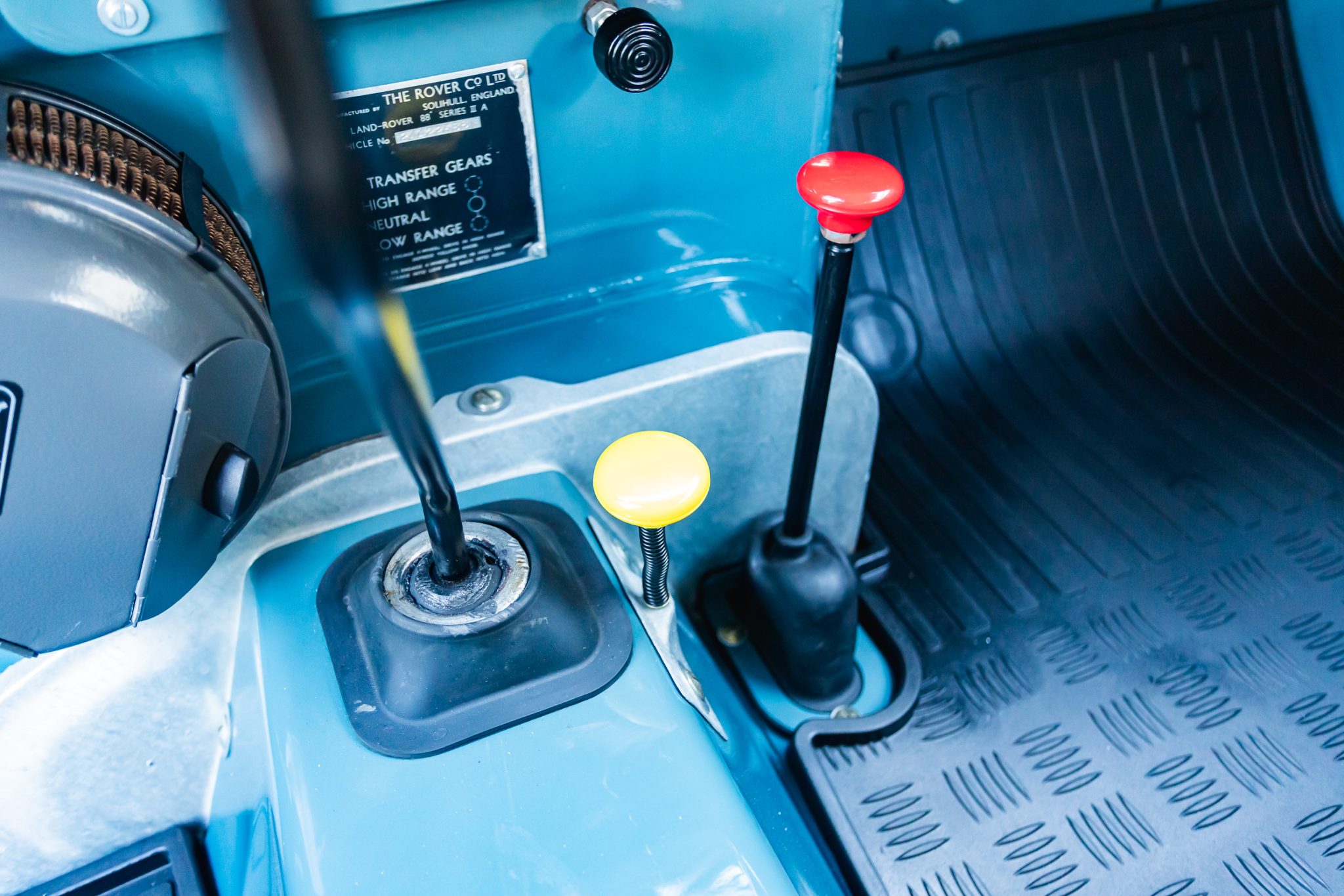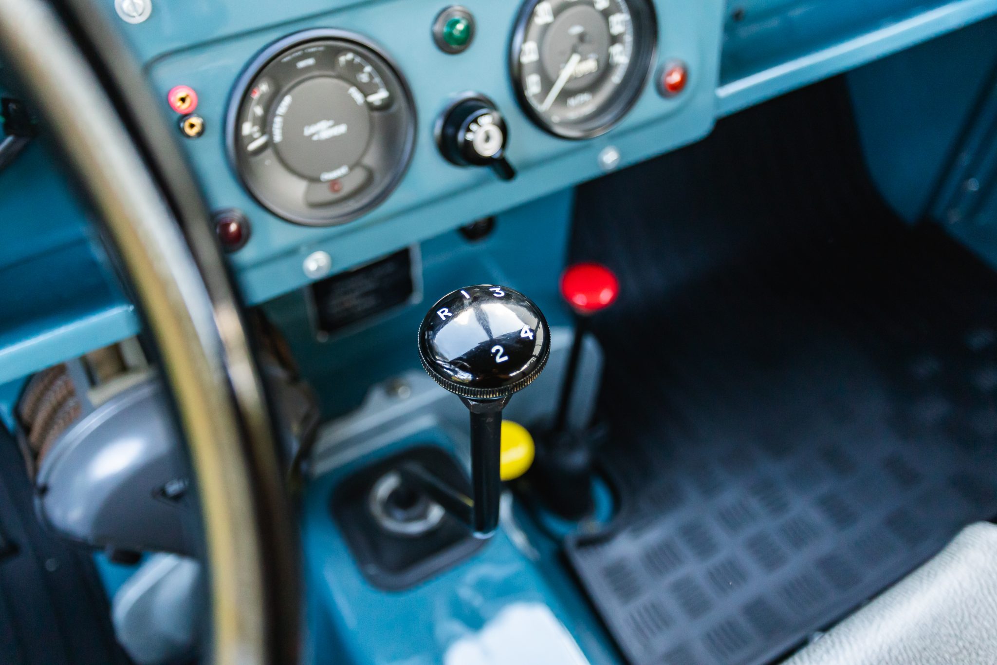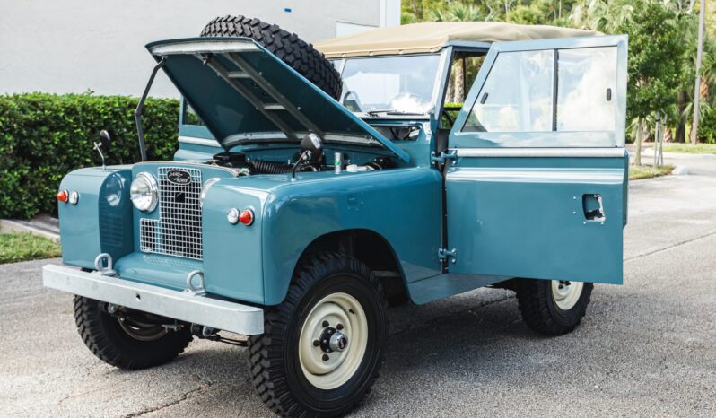 Work during the build reportedly included a repaint in Marine Blue, installing a replacement galvanized steel frame, overhauling the 2.25-liter gasoline inline-four and four-speed manual transmission, fitting Old Man Emu shock absorbers, and re-trimming the interior in gray elephant hide-pattern vinyl. Equipment includes a two-speed transfer case, a beige soft top, Rocky Mountain aluminum door tops, 16″ steel wheels, manually locking front hubs, four-wheel disc brakes, a heater, three-point front seat belts, electronic fuel injection, electronic ignition, and a stainless-steel fuel tank and exhaust system.