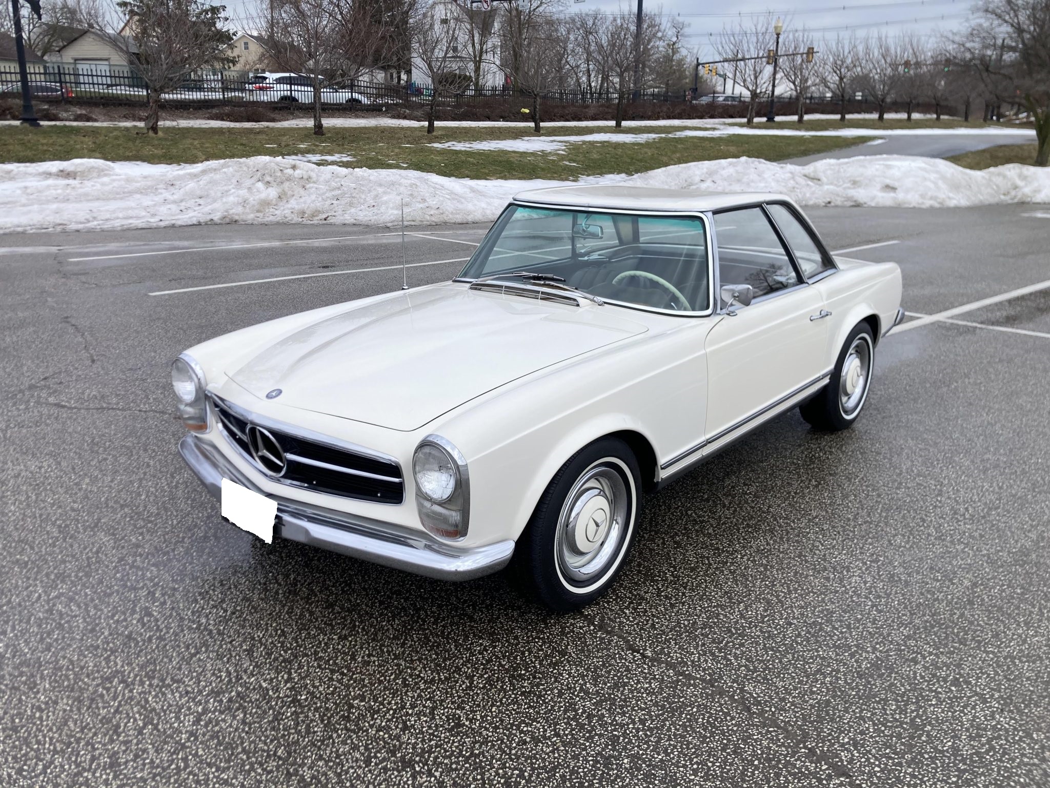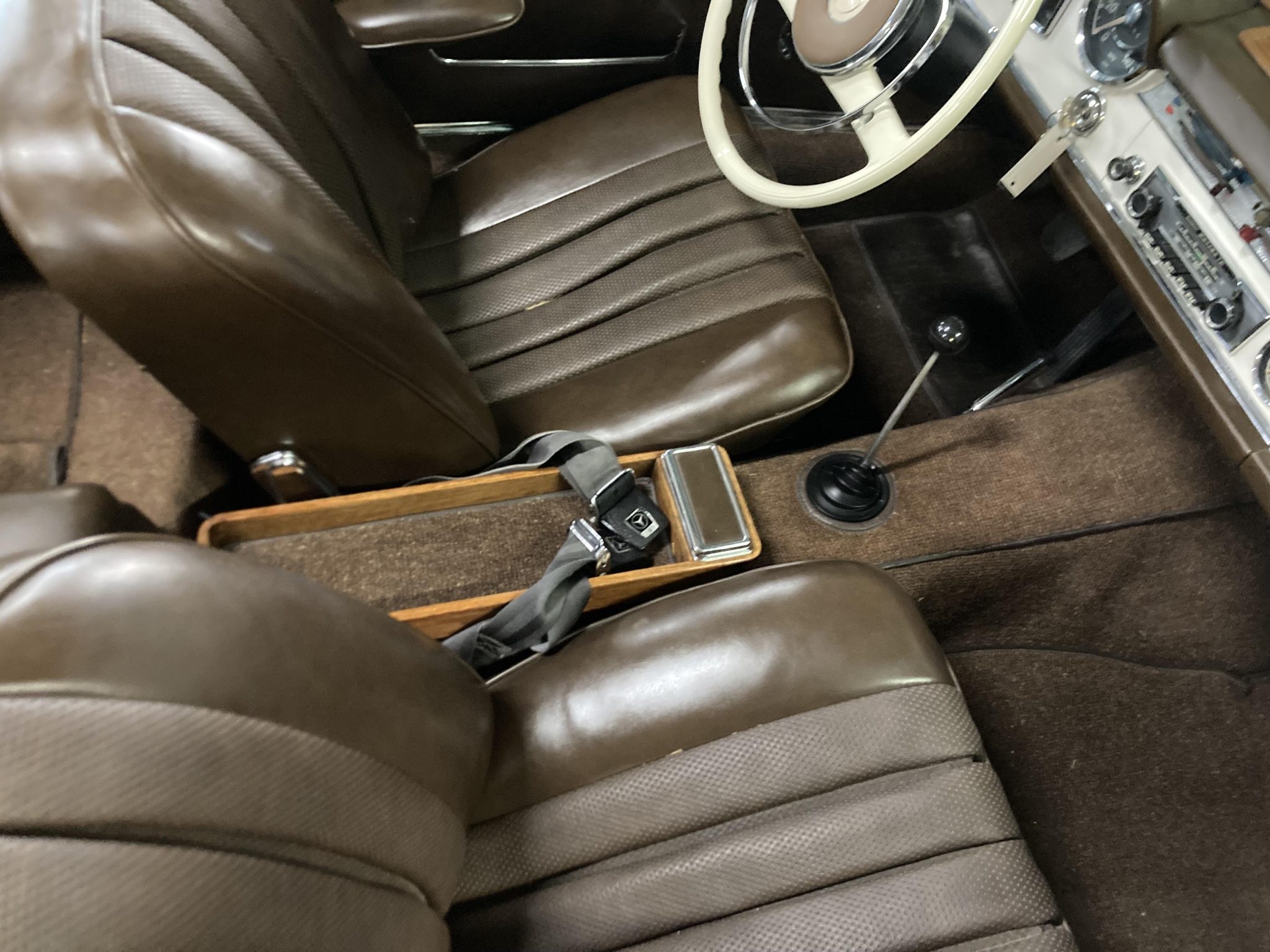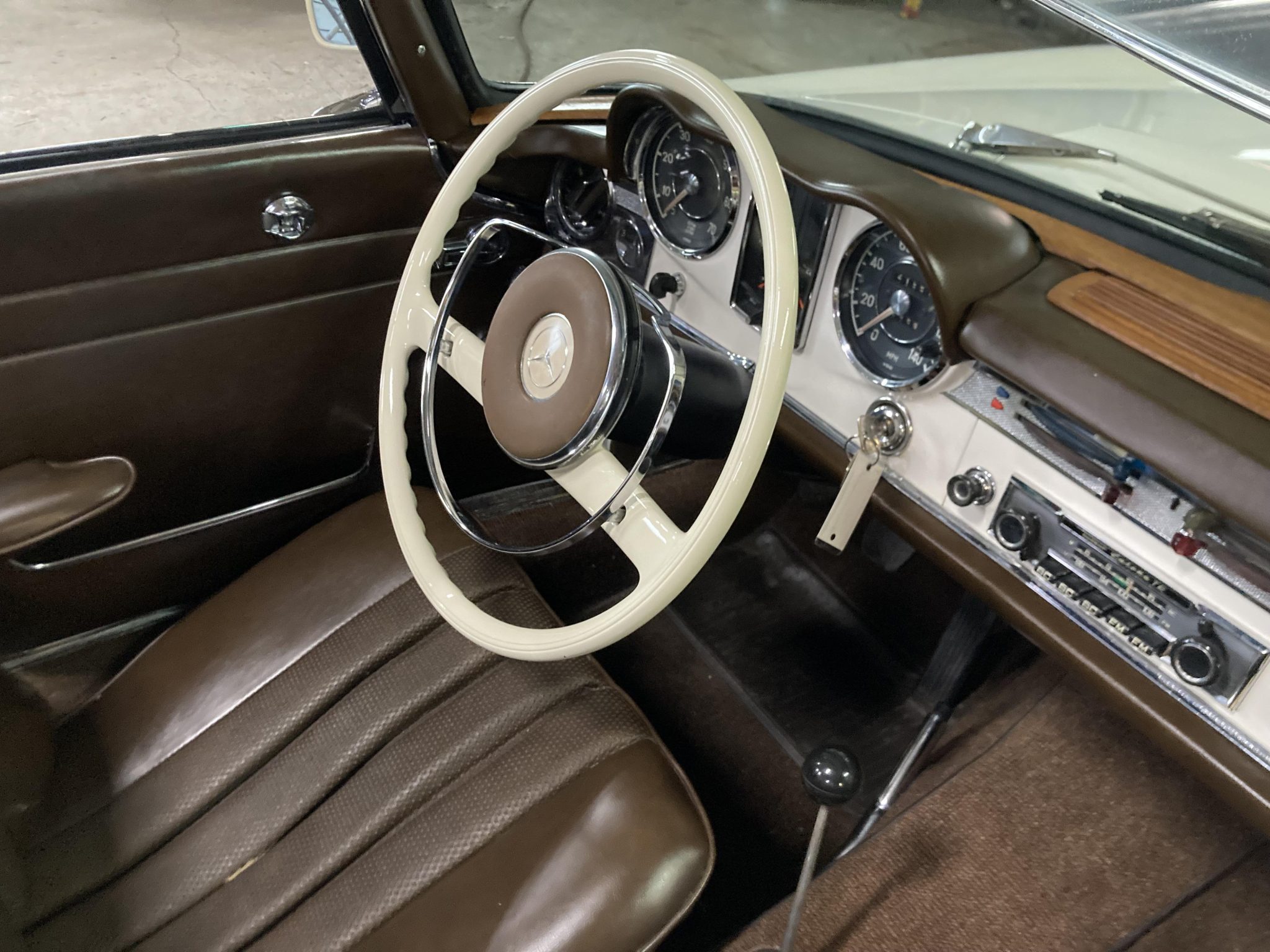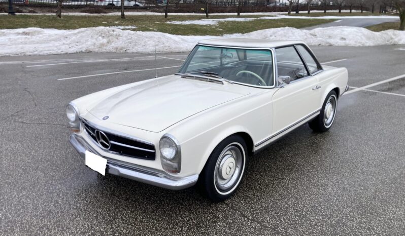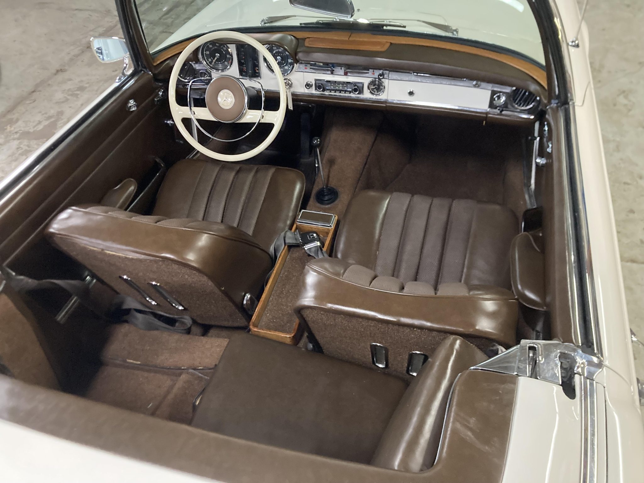 It is finished in white over brown MB-Tex and is powered by a 2.3-liter inline-six paired with a four-speed manual transmission. Equipment includes a rear jump seat, a black convertible top, a removable hardtop, power steering, 14″ steel wheels, an AM/FM radio, and a heater. This W113 SL