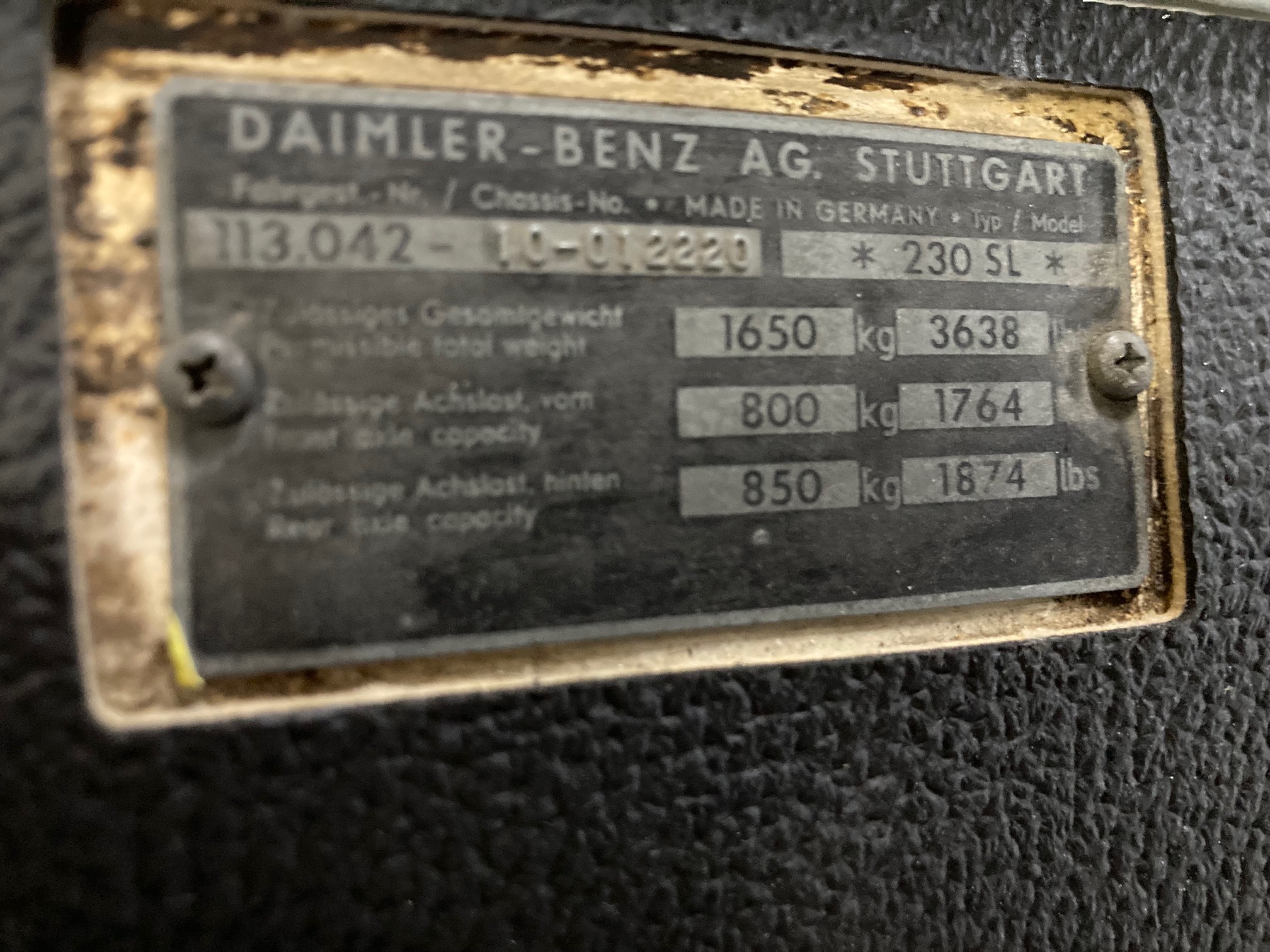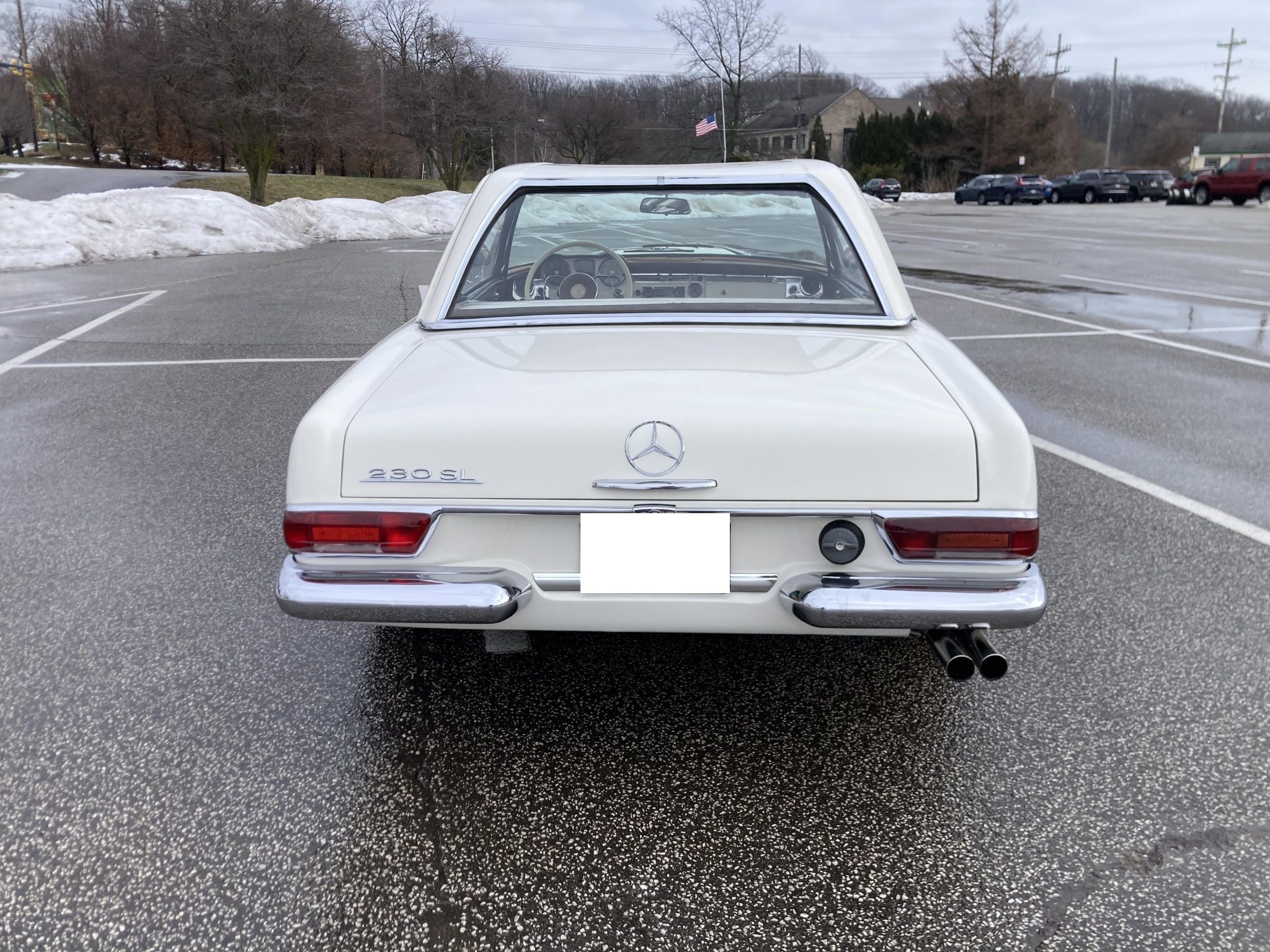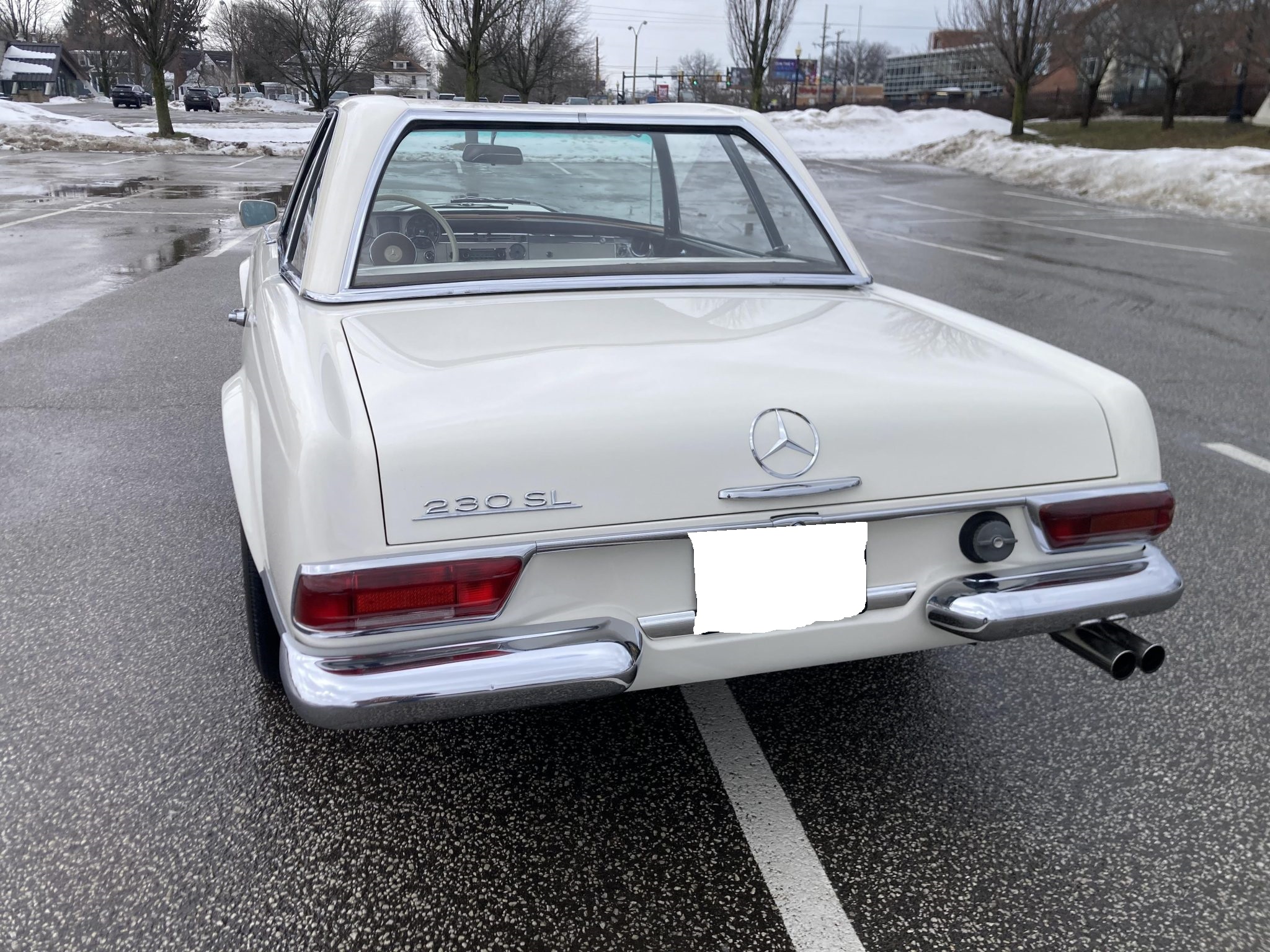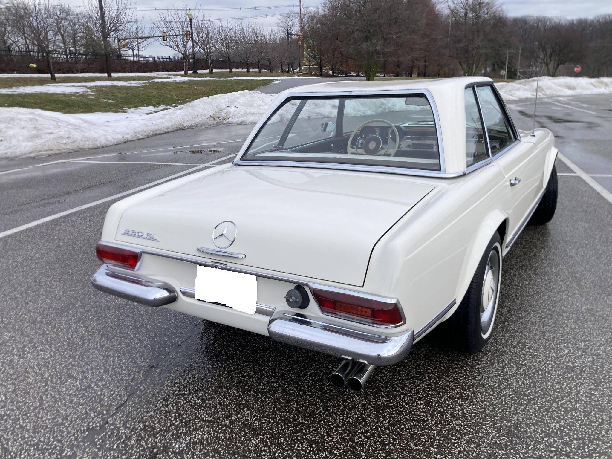 It is finished in white over brown MB-Tex and is powered by a 2.3-liter inline-six paired with a four-speed manual transmission. Equipment includes a rear jump seat, a black convertible top, a removable hardtop, power steering, 14″ steel wheels, an AM/FM radio, and a heater. This W113 SL