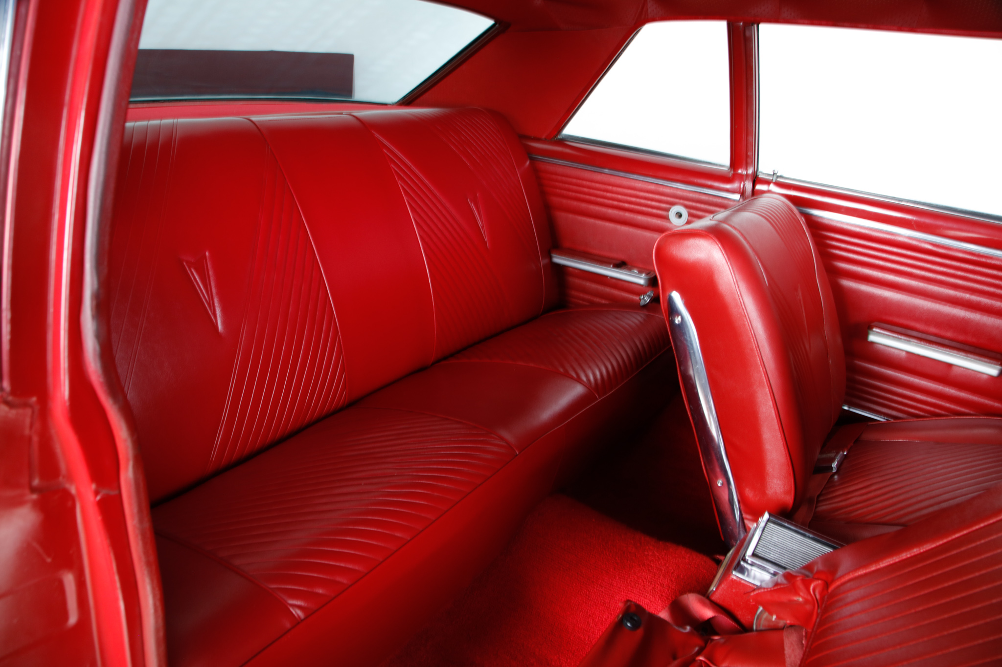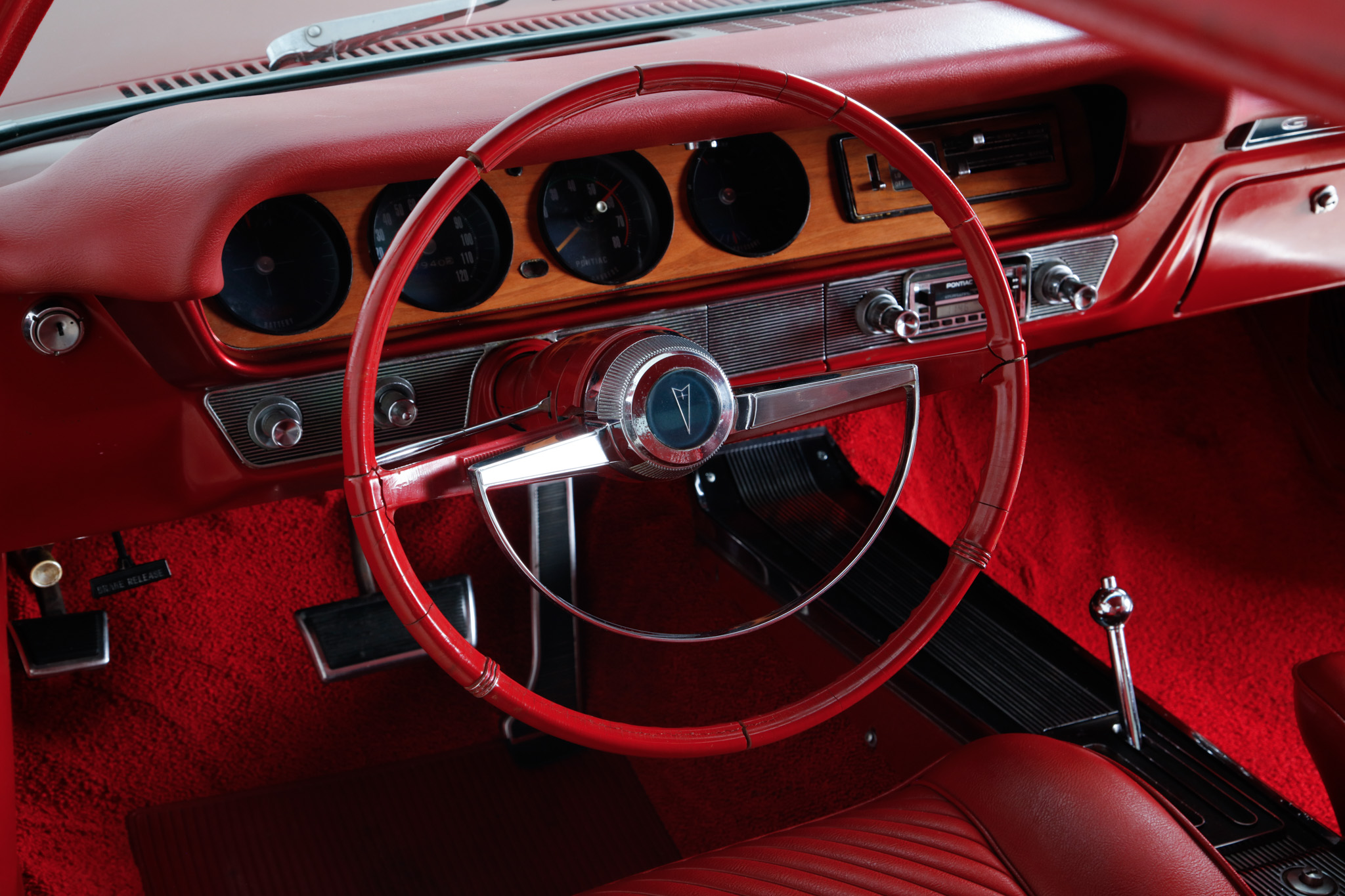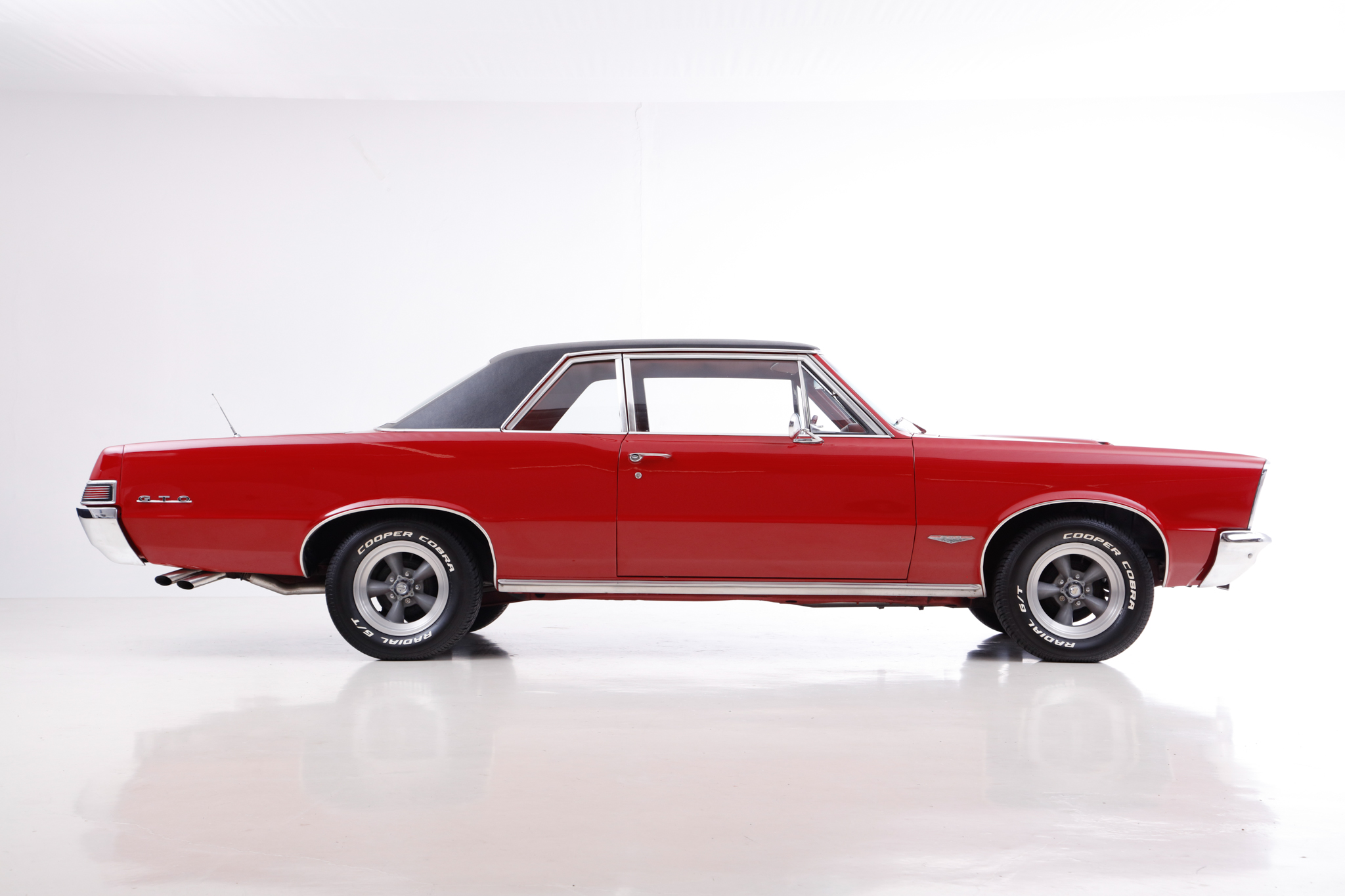 This 1965 Pontiac GTO sport coupe is powered by a 389ci V8 paired with a three-speed automatic transmission, and it was refurbished at some point under prior ownership with work that included refinishing the body in red with a black vinyl roof cover. The interior is trimmed in red vinyl and features front bucket seats, a center console, a cassette radio, woodgrain trim accents, and retractable front lap belts. Additional equipment includes a four-barrel carburetor, a dual exhaust system with quad tips, power steering, power-assisted drum brakes, and 15″ American Racing Torq Thrust wheels