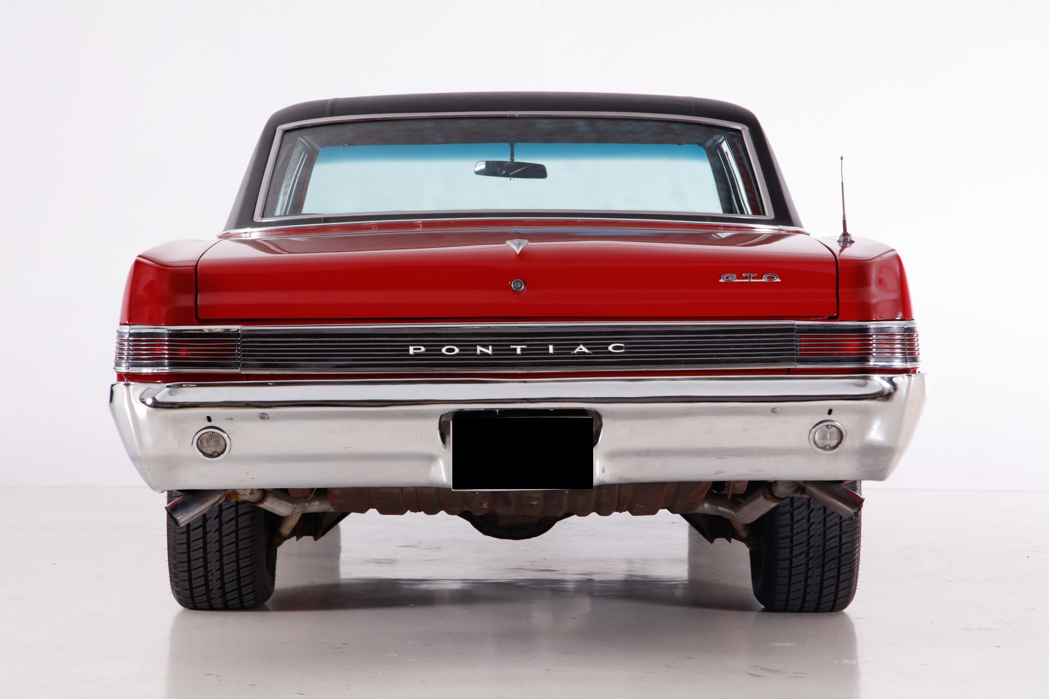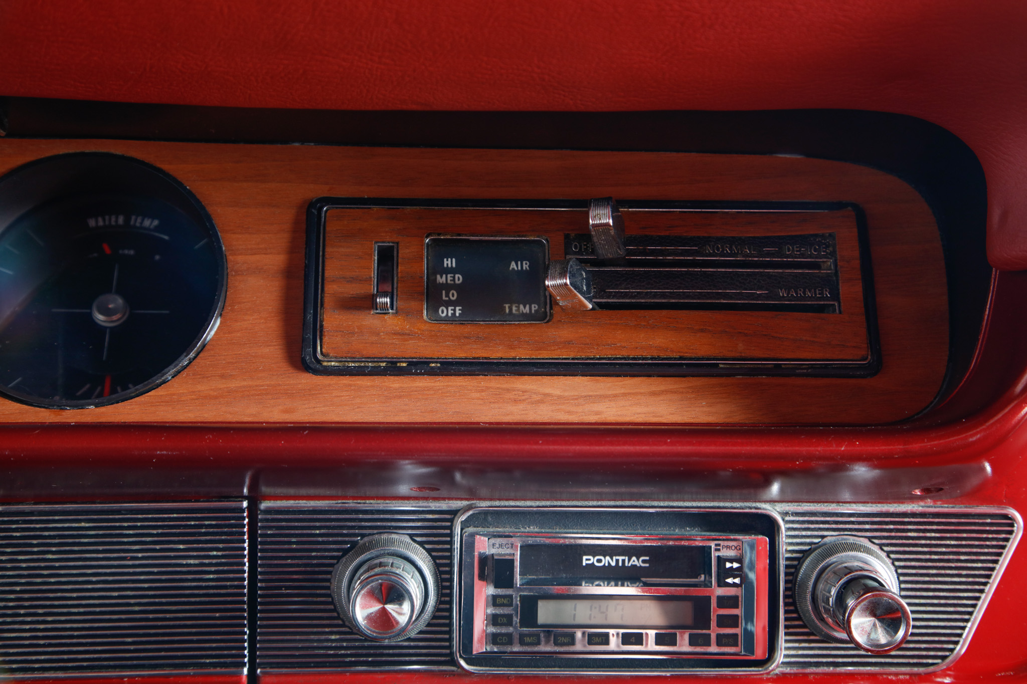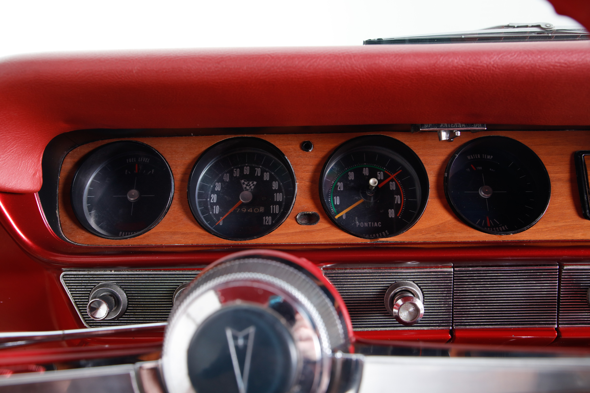 This 1965 Pontiac GTO sport coupe is powered by a 389ci V8 paired with a three-speed automatic transmission, and it was refurbished at some point under prior ownership with work that included refinishing the body in red with a black vinyl roof cover. The interior is trimmed in red vinyl and features front bucket seats, a center console, a cassette radio, woodgrain trim accents, and retractable front lap belts. Additional equipment includes a four-barrel carburetor, a dual exhaust system with quad tips, power steering, power-assisted drum brakes, and 15″ American Racing Torq Thrust wheels