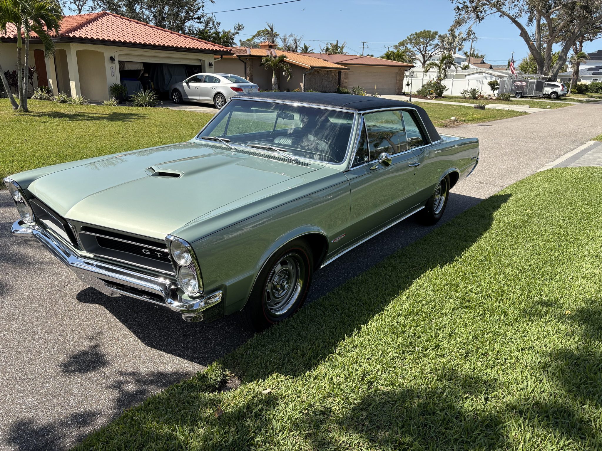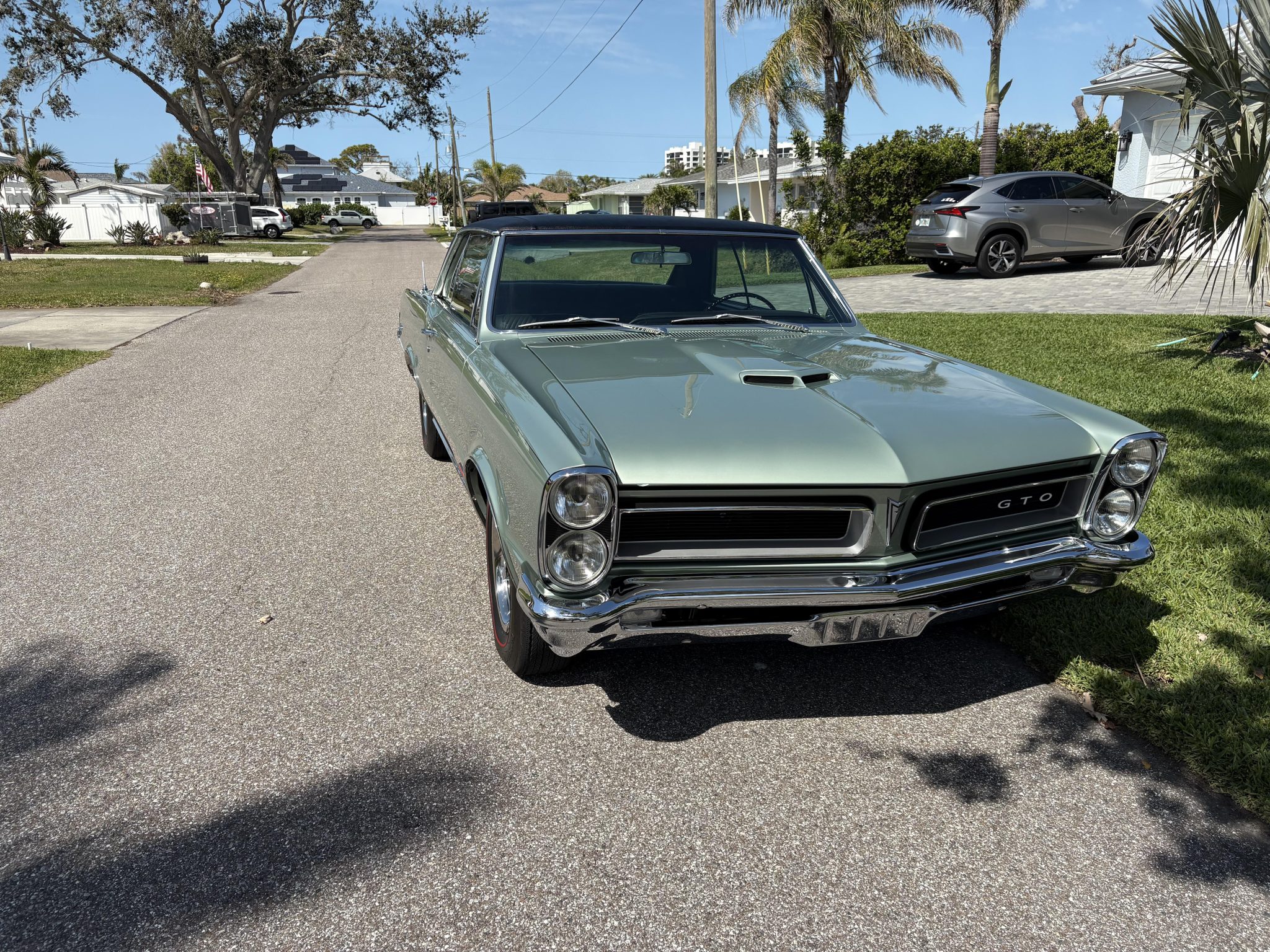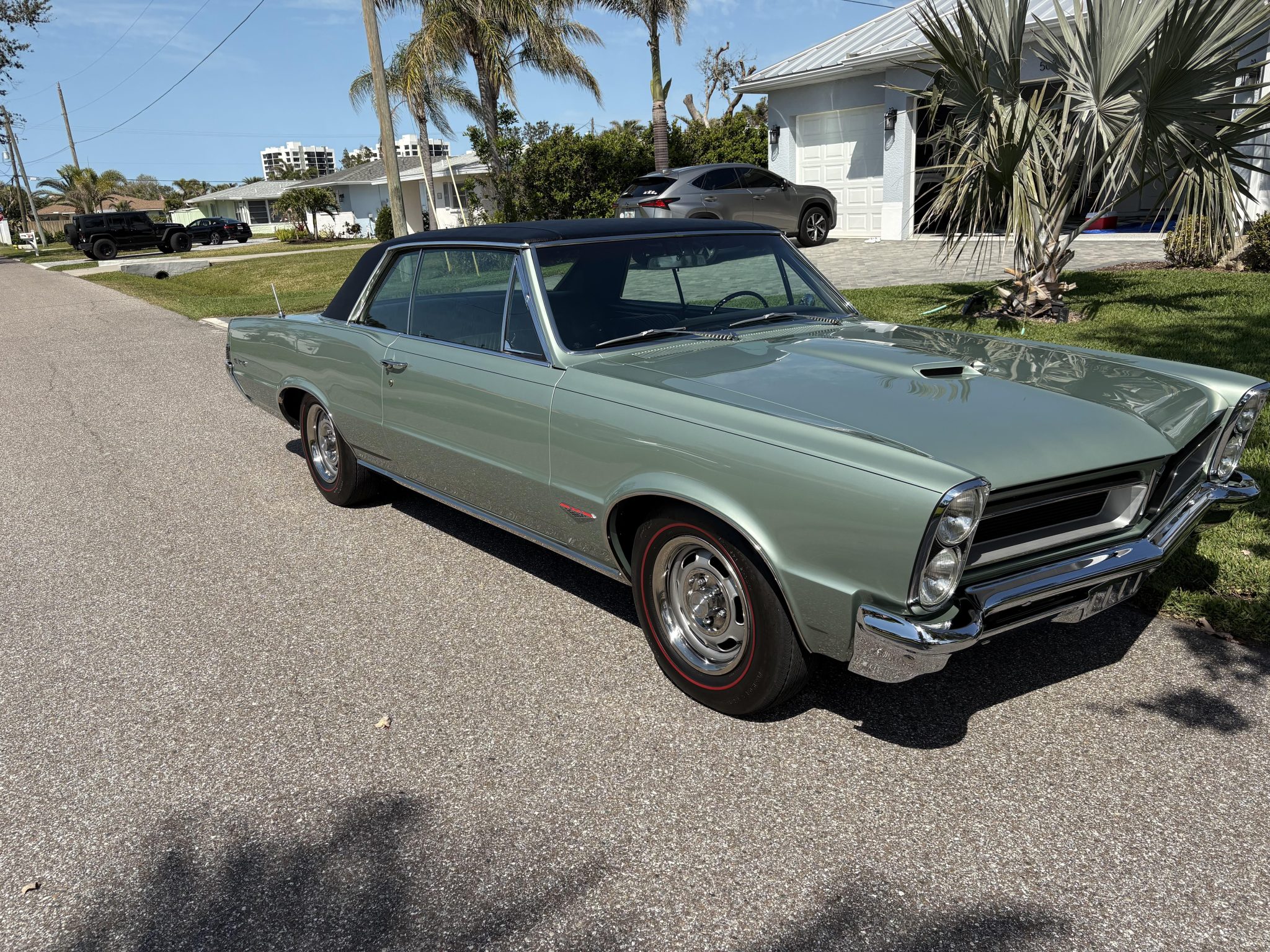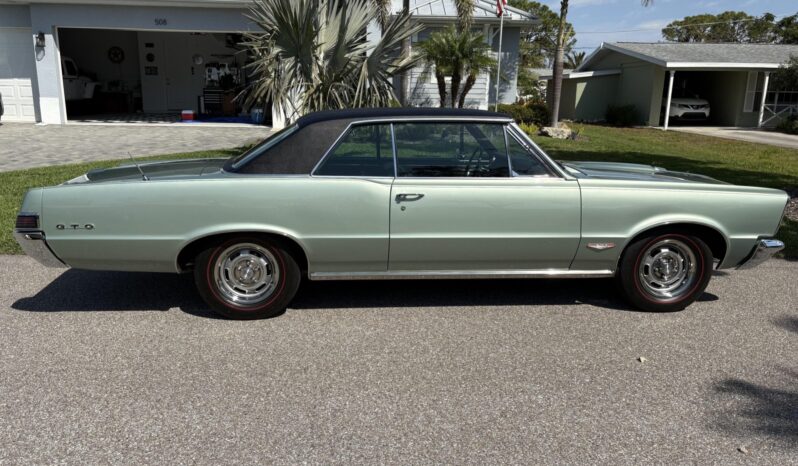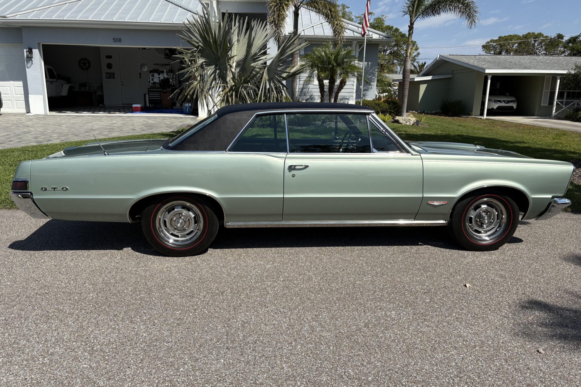 This 1965 Pontiac GTO hardtop coupe underwent a cosmetic and mechanical refurbishment which included refinishing the exterior in Palmetto Green with a black vinyl roof cover. The car is powered by a 389ci V8 with Tri-Power induction that is linked to a four-speed manual transmission and a Safe-T-Track differential, and the lowered suspension features Hotchkis components. Equipment includes a power antenna, a hood scoop, 15″ Rally-style wheels, Firestone redline tires, four-wheel disc brakes, and power steering. The cabin features wood grain trim, a push-button radio, a Hurst shifter, air conditioning, and black vinyl upholstery.