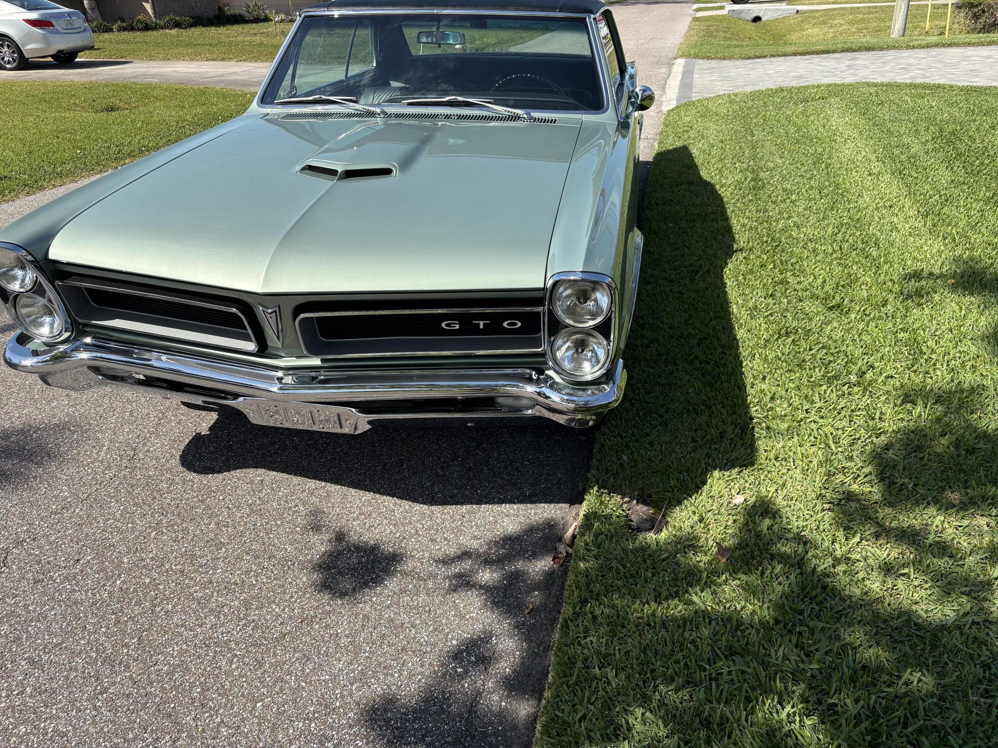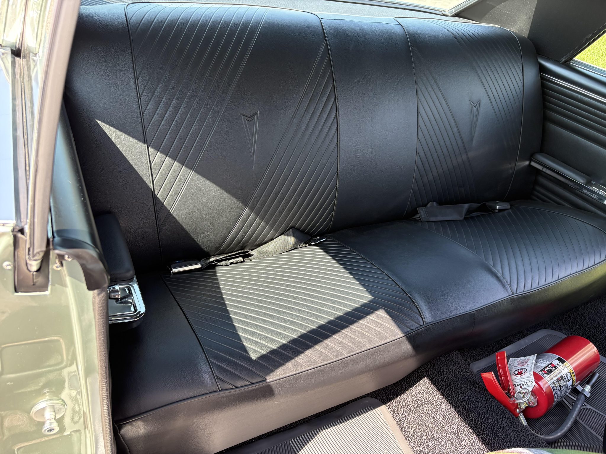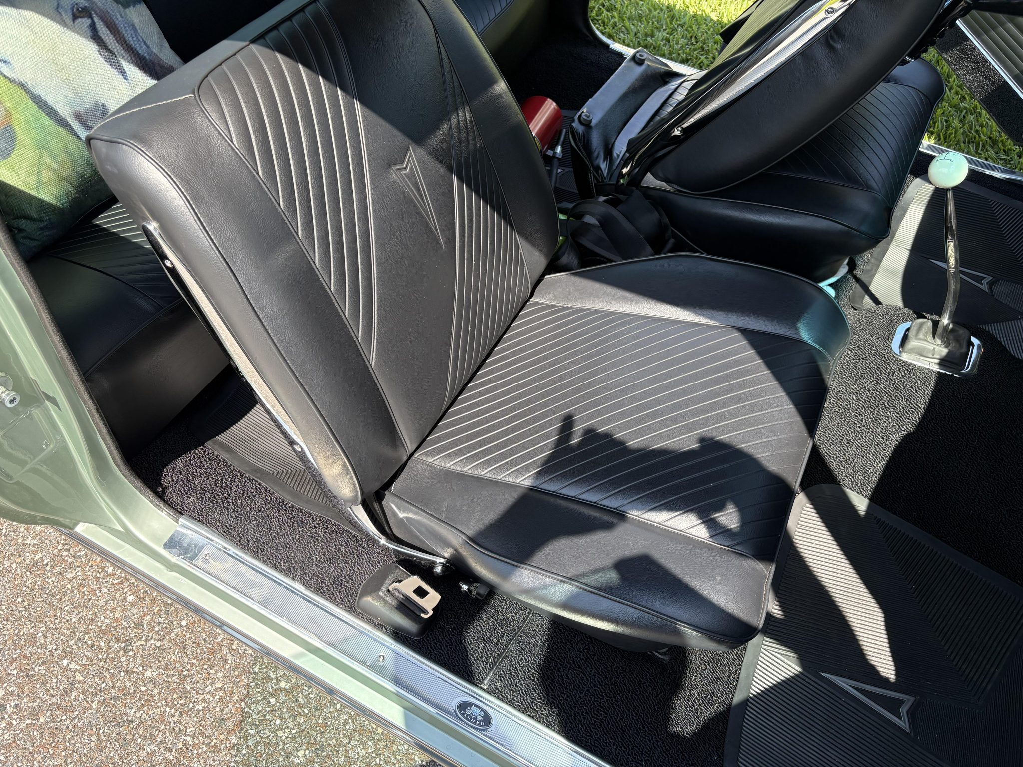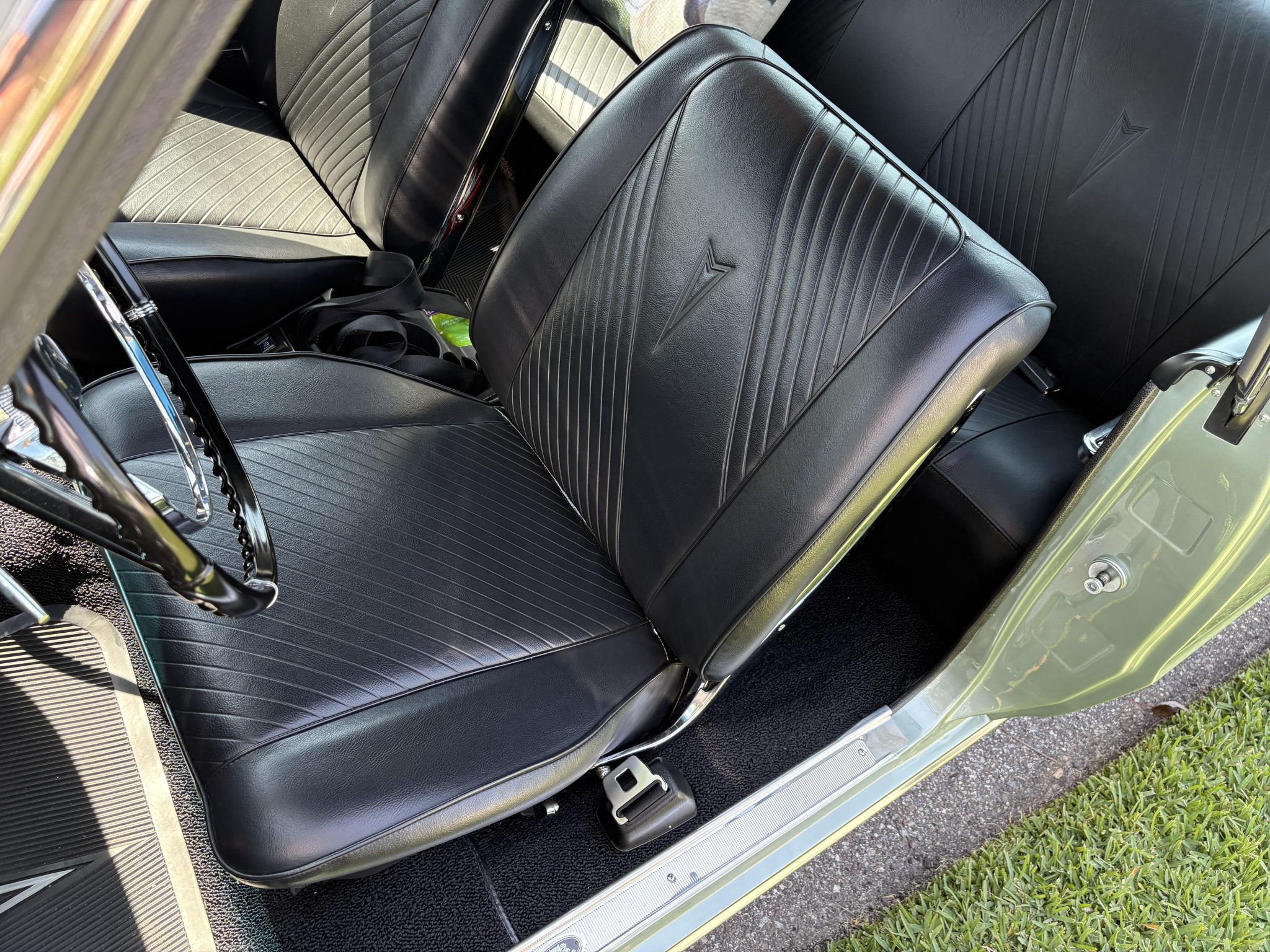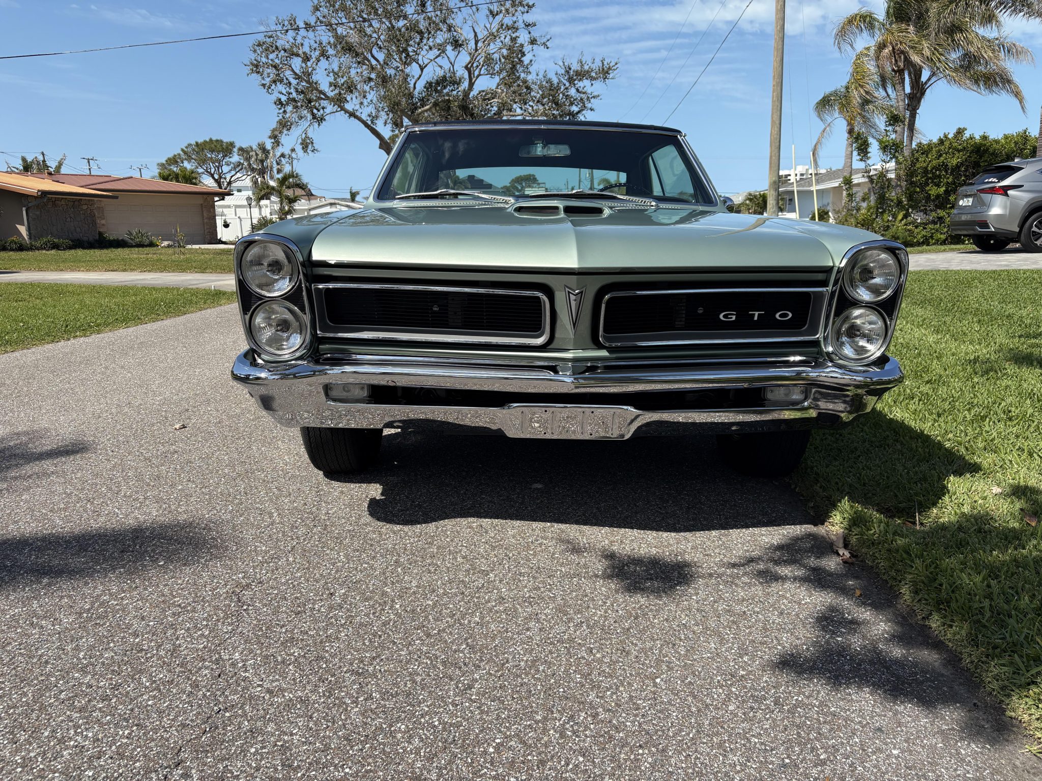 This 1965 Pontiac GTO hardtop coupe underwent a cosmetic and mechanical refurbishment which included refinishing the exterior in Palmetto Green with a black vinyl roof cover. The car is powered by a 389ci V8 with Tri-Power induction that is linked to a four-speed manual transmission and a Safe-T-Track differential, and the lowered suspension features Hotchkis components. Equipment includes a power antenna, a hood scoop, 15″ Rally-style wheels, Firestone redline tires, four-wheel disc brakes, and power steering. The cabin features wood grain trim, a push-button radio, a Hurst shifter, air conditioning, and black vinyl upholstery.