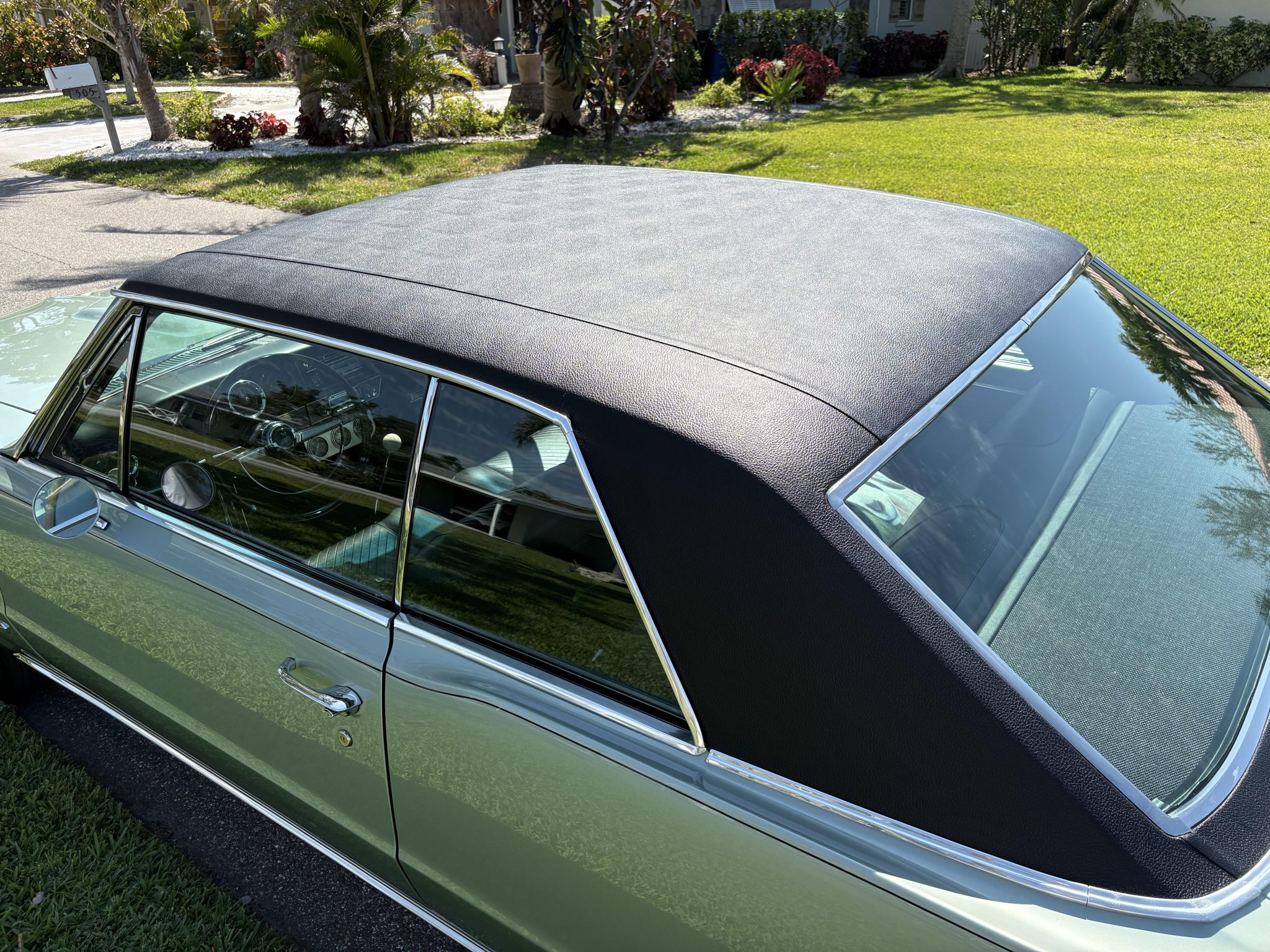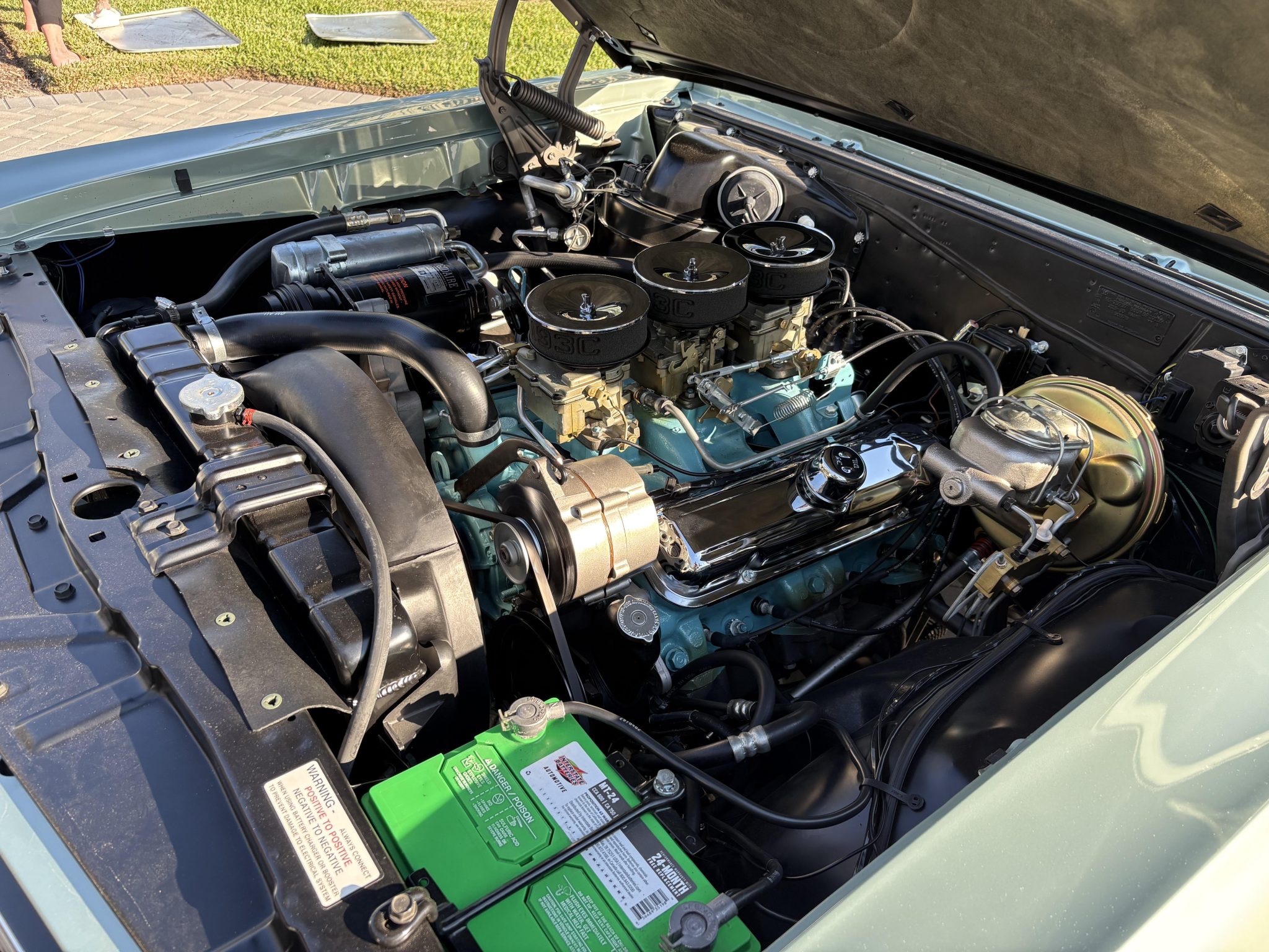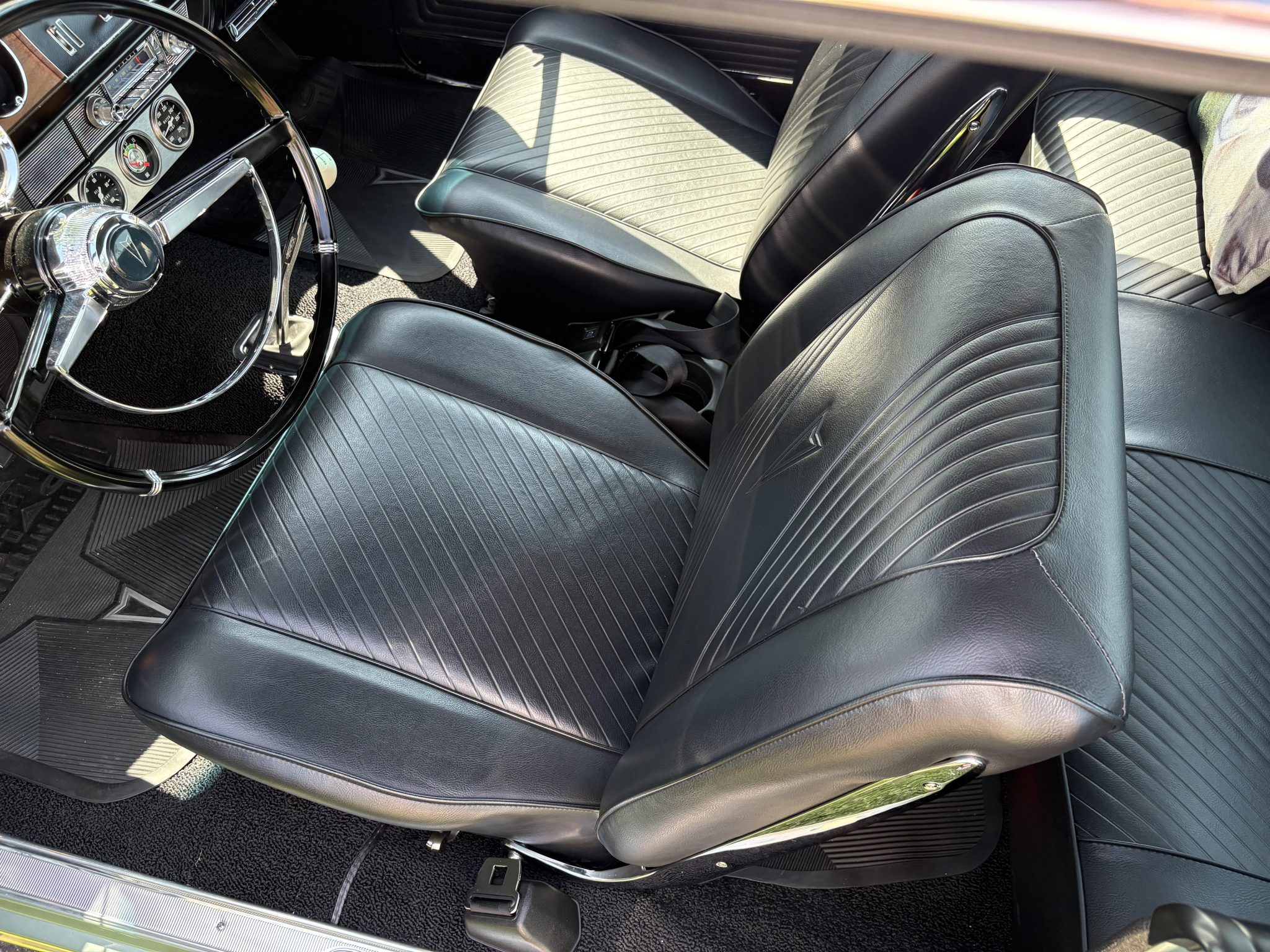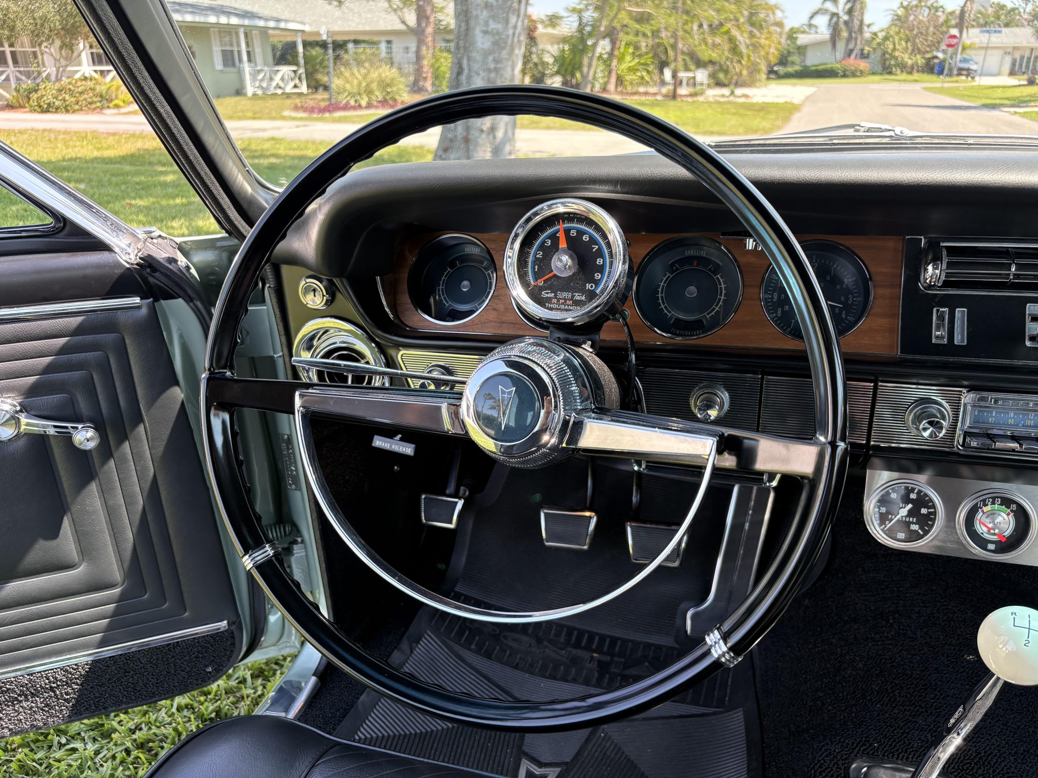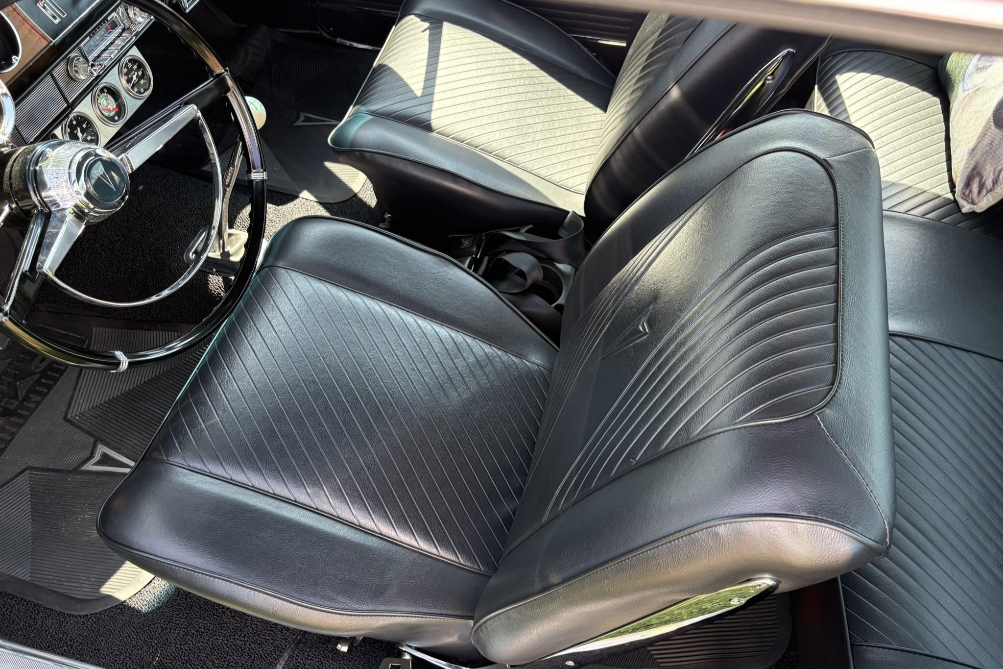 This 1965 Pontiac GTO hardtop coupe underwent a cosmetic and mechanical refurbishment which included refinishing the exterior in Palmetto Green with a black vinyl roof cover. The car is powered by a 389ci V8 with Tri-Power induction that is linked to a four-speed manual transmission and a Safe-T-Track differential, and the lowered suspension features Hotchkis components. Equipment includes a power antenna, a hood scoop, 15″ Rally-style wheels, Firestone redline tires, four-wheel disc brakes, and power steering. The cabin features wood grain trim, a push-button radio, a Hurst shifter, air conditioning, and black vinyl upholstery.