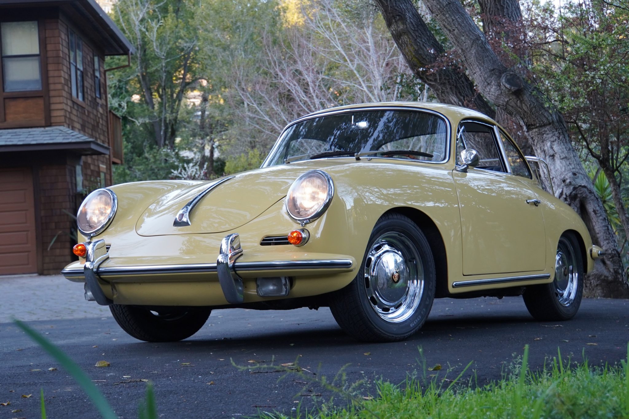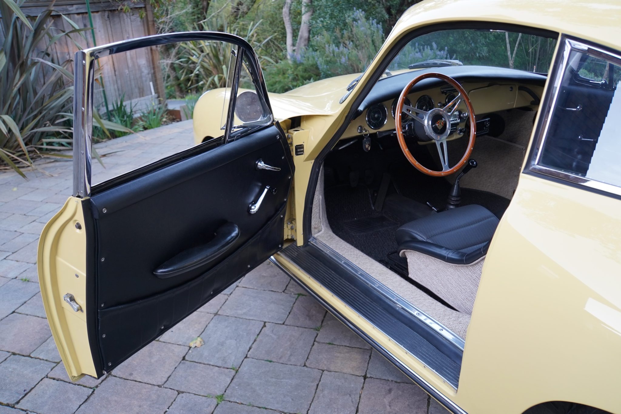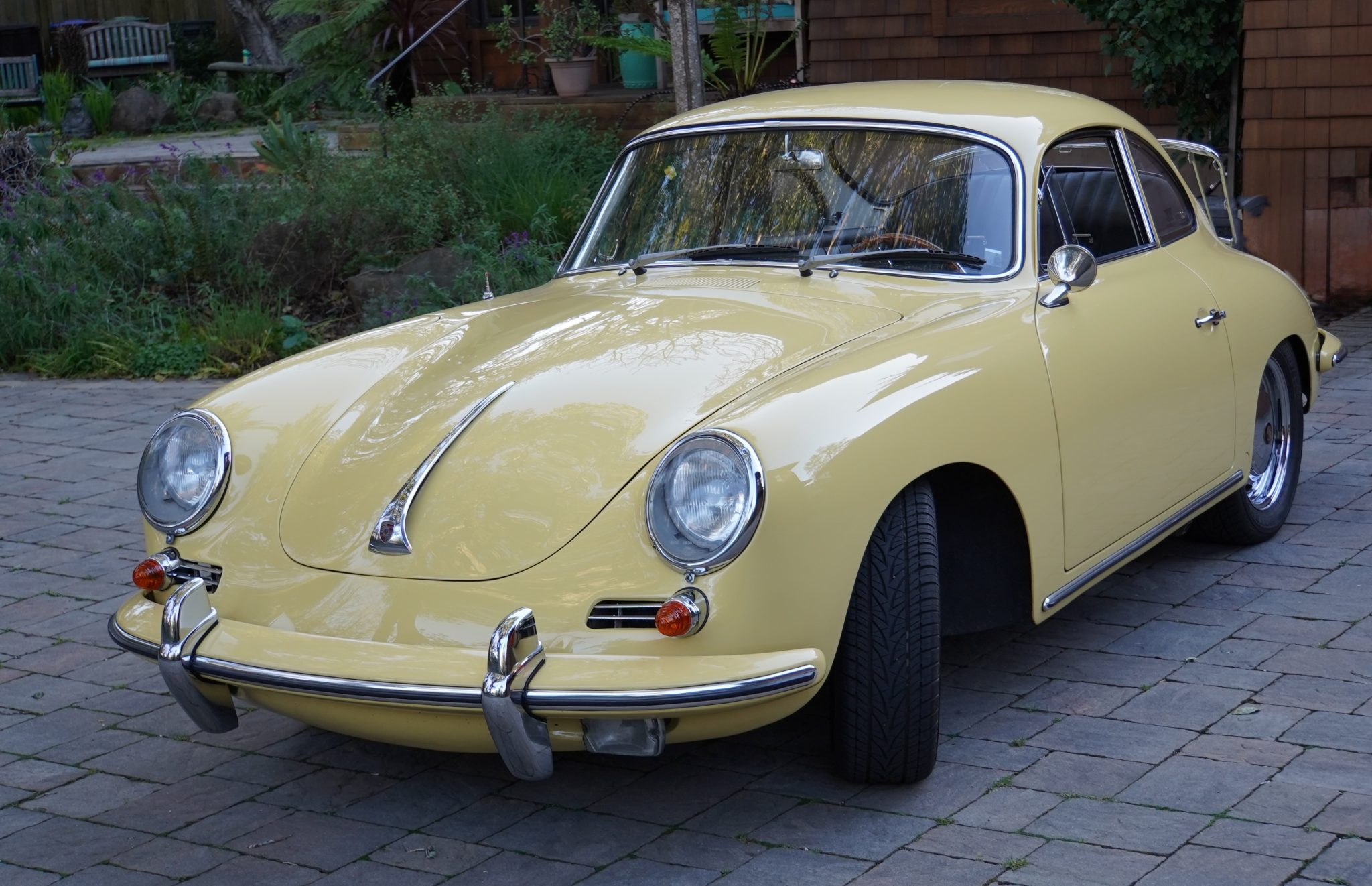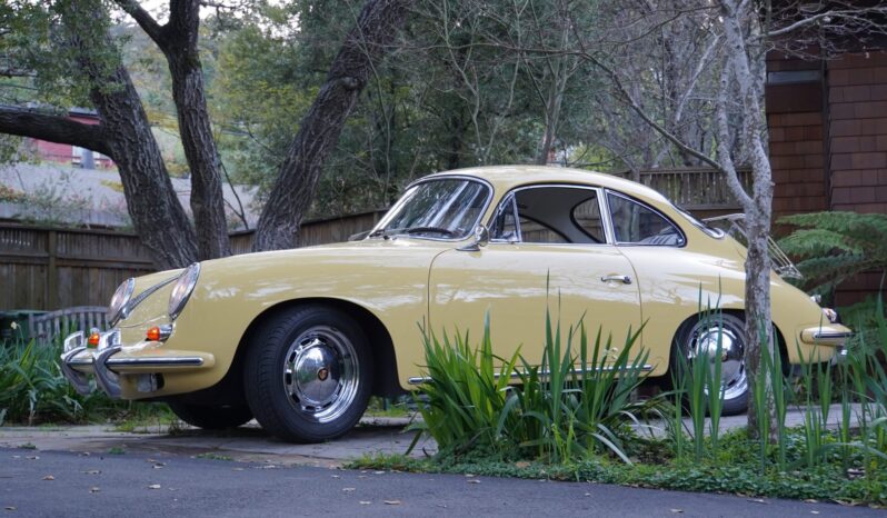 This 1965 Porsche 356C coupe underwent a cosmetic refurbishment in the late 1990s, and it is finished in Champagne Yellow over black leatherette.   It is equipped with a four-speed manual transaxle, 15″ steel wheels, disc brakes, GT-style front seats, a short shifter, a luggage rack, and an analog clock.
