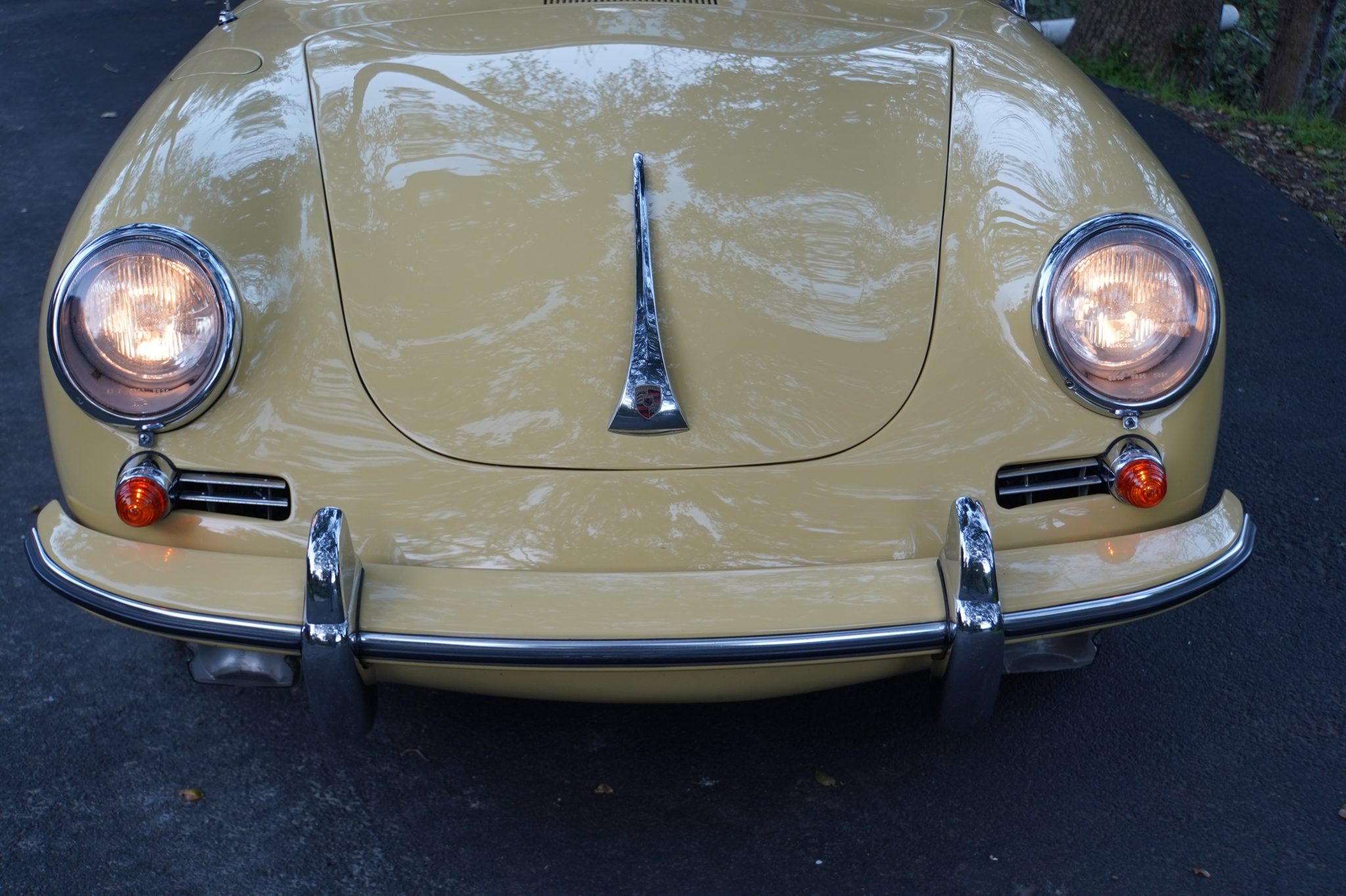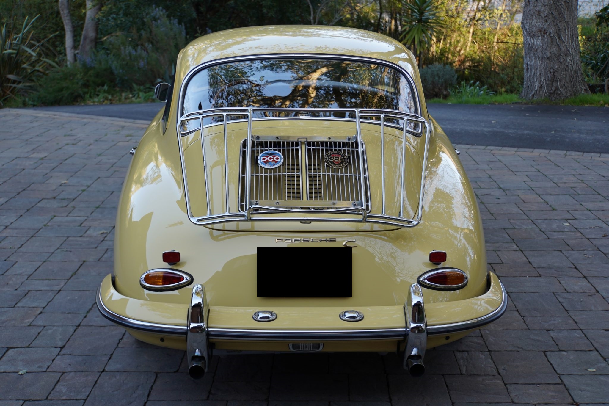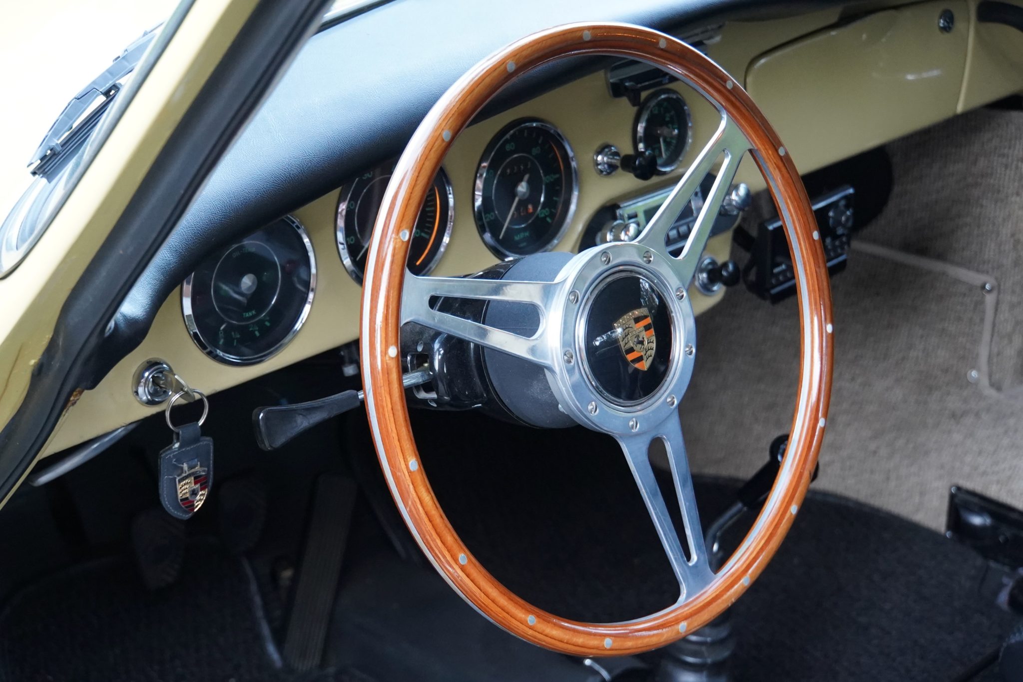 This 1965 Porsche 356C coupe underwent a cosmetic refurbishment in the late 1990s, and it is finished in Champagne Yellow over black leatherette.   It is equipped with a four-speed manual transaxle, 15″ steel wheels, disc brakes, GT-style front seats, a short shifter, a luggage rack, and an analog clock.