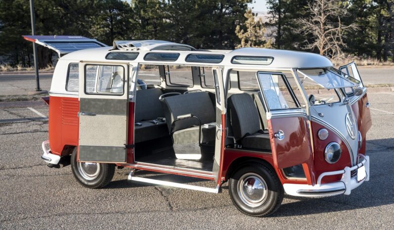 Work included reupholstering the interior in Mesh Grey vinyl, installing a 1,915cc air-cooled flat-four and a four-speed “Freeway Flyer” transaxle, converting the front brakes to disc, performing a 12-volt electrical conversion, refurbishing the steering wheel, and fitting lap belts, safari-style windshields, front door handle guards, a reproduction side-step, a front sway bar, a rear camber compensator, and Hankook RA08 tires. Additional details include 14″ steel wheels, a sliding fabric sunroof, Hella “fried egg” front turn indicators, eight skylight windows, six pop-out side windows, and three-row seating.