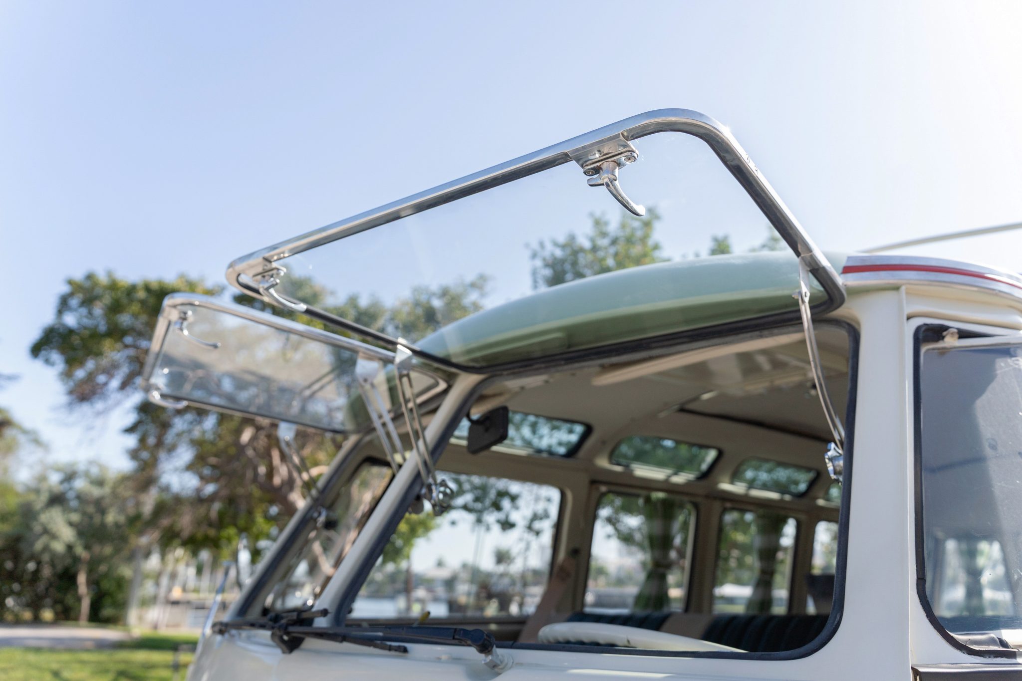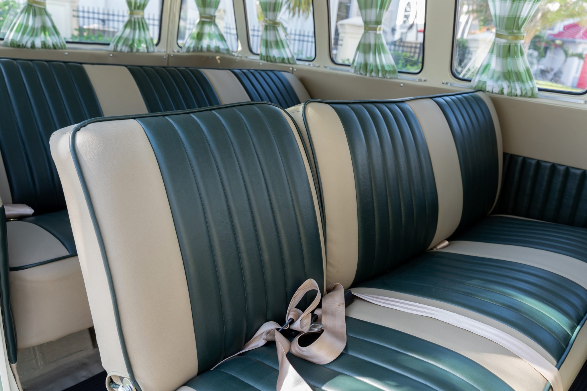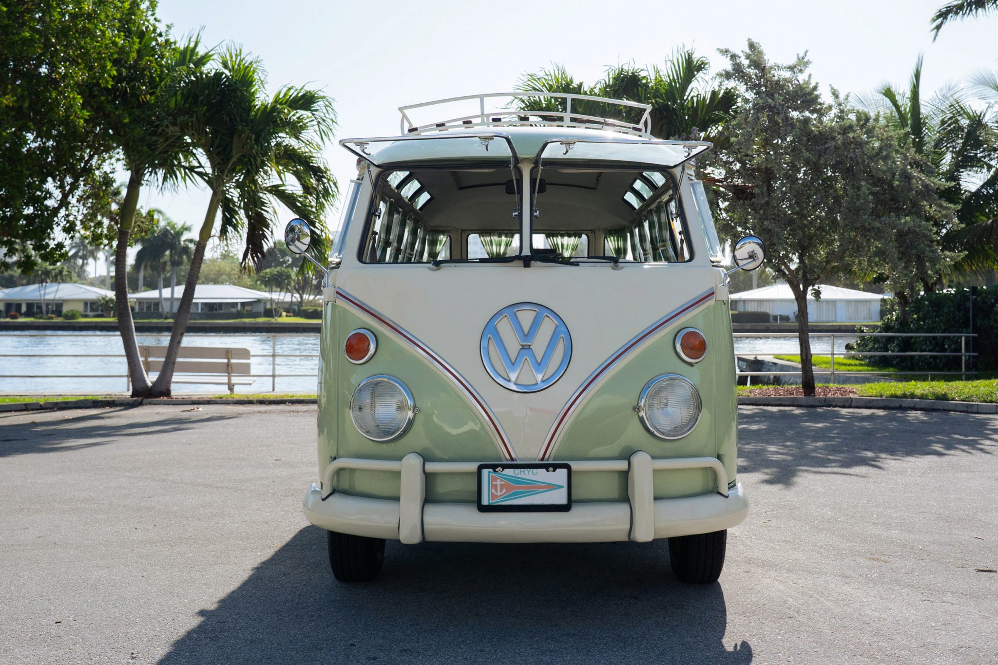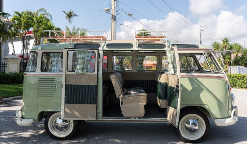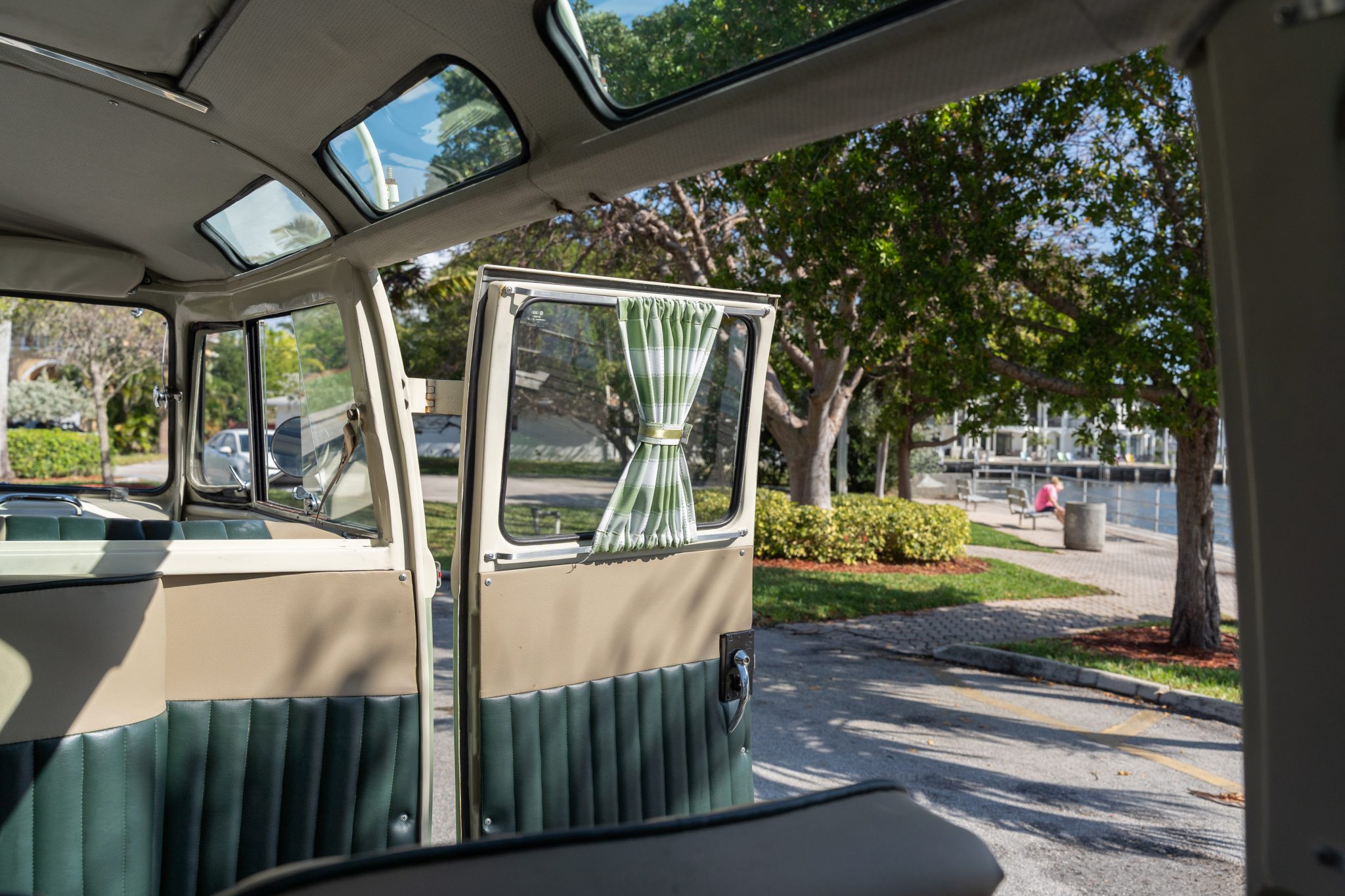 This 1965 Volkswagen Type 2 Kombi is a Brazilian-market example that received a 23-window conversion as part of a refurbishment It is finished in green and white over tan and green vinyl upholstery, and it is powered by an air-cooled 1.3L flat-four paired with a four-speed manual transaxle. Features include 14″ steel wheels, drum brakes, three rows of bench seating, front shoulder belts, rear lap belts, a 12-volt electrical system, dual roof racks, a sliding fabric sunroof, eight skylight windows, and safari-style windshields.