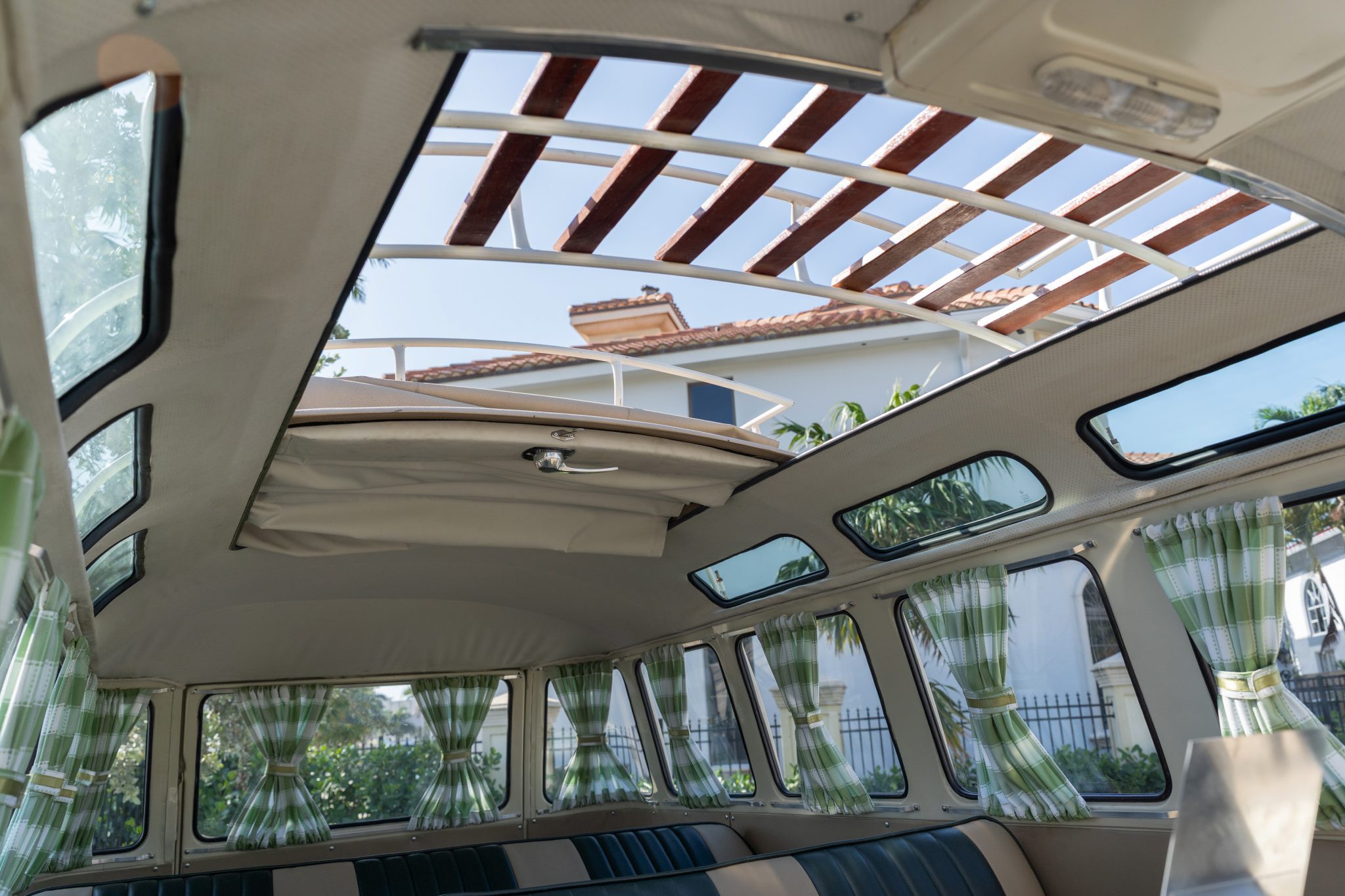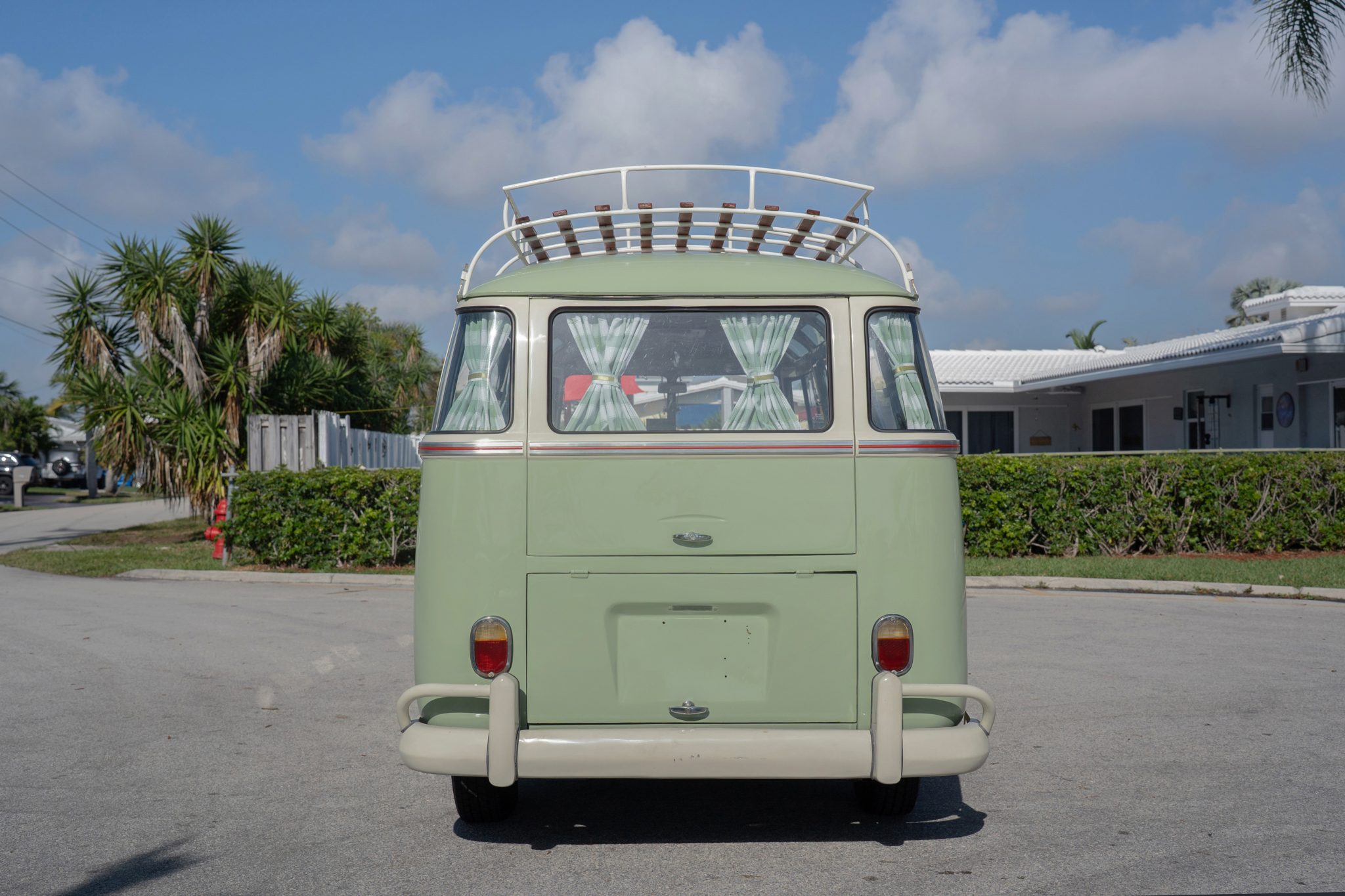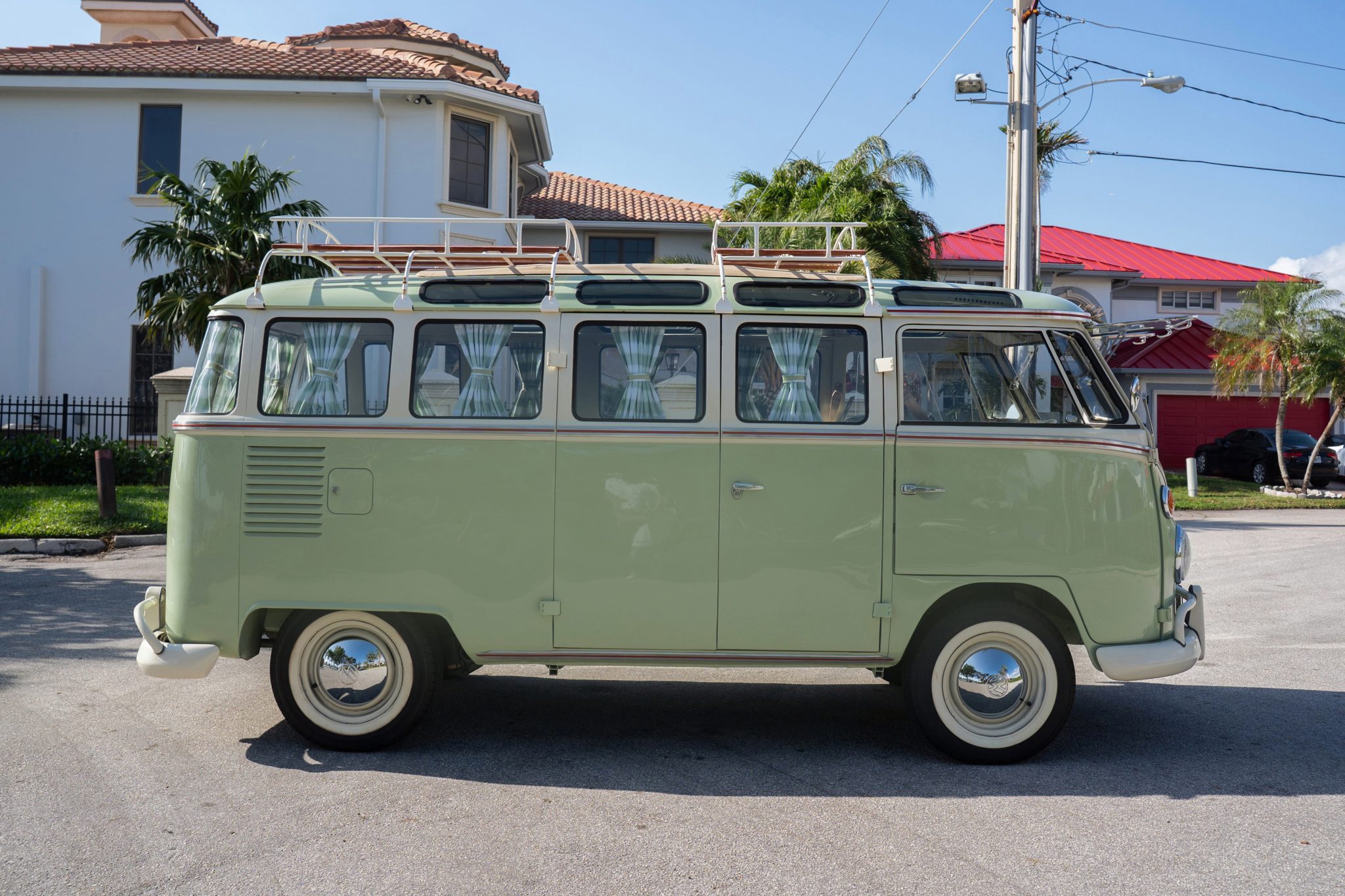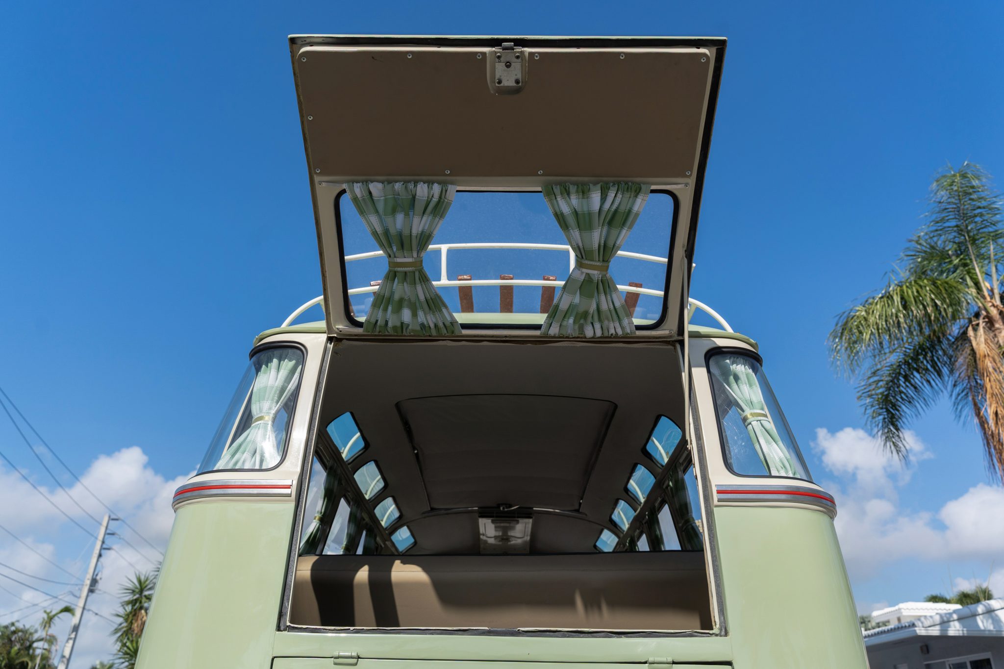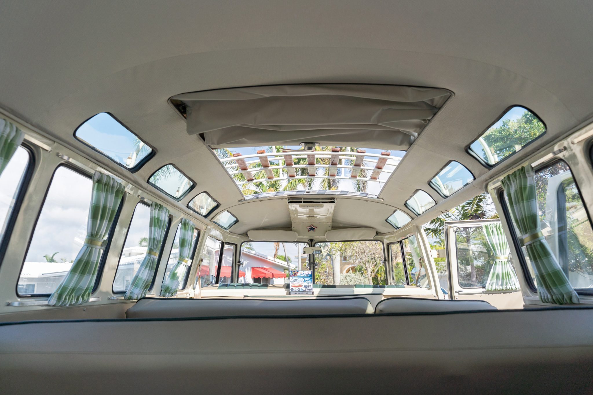 This 1965 Volkswagen Type 2 Kombi is a Brazilian-market example that received a 23-window conversion as part of a refurbishment It is finished in green and white over tan and green vinyl upholstery, and it is powered by an air-cooled 1.3L flat-four paired with a four-speed manual transaxle. Features include 14″ steel wheels, drum brakes, three rows of bench seating, front shoulder belts, rear lap belts, a 12-volt electrical system, dual roof racks, a sliding fabric sunroof, eight skylight windows, and safari-style windshields.