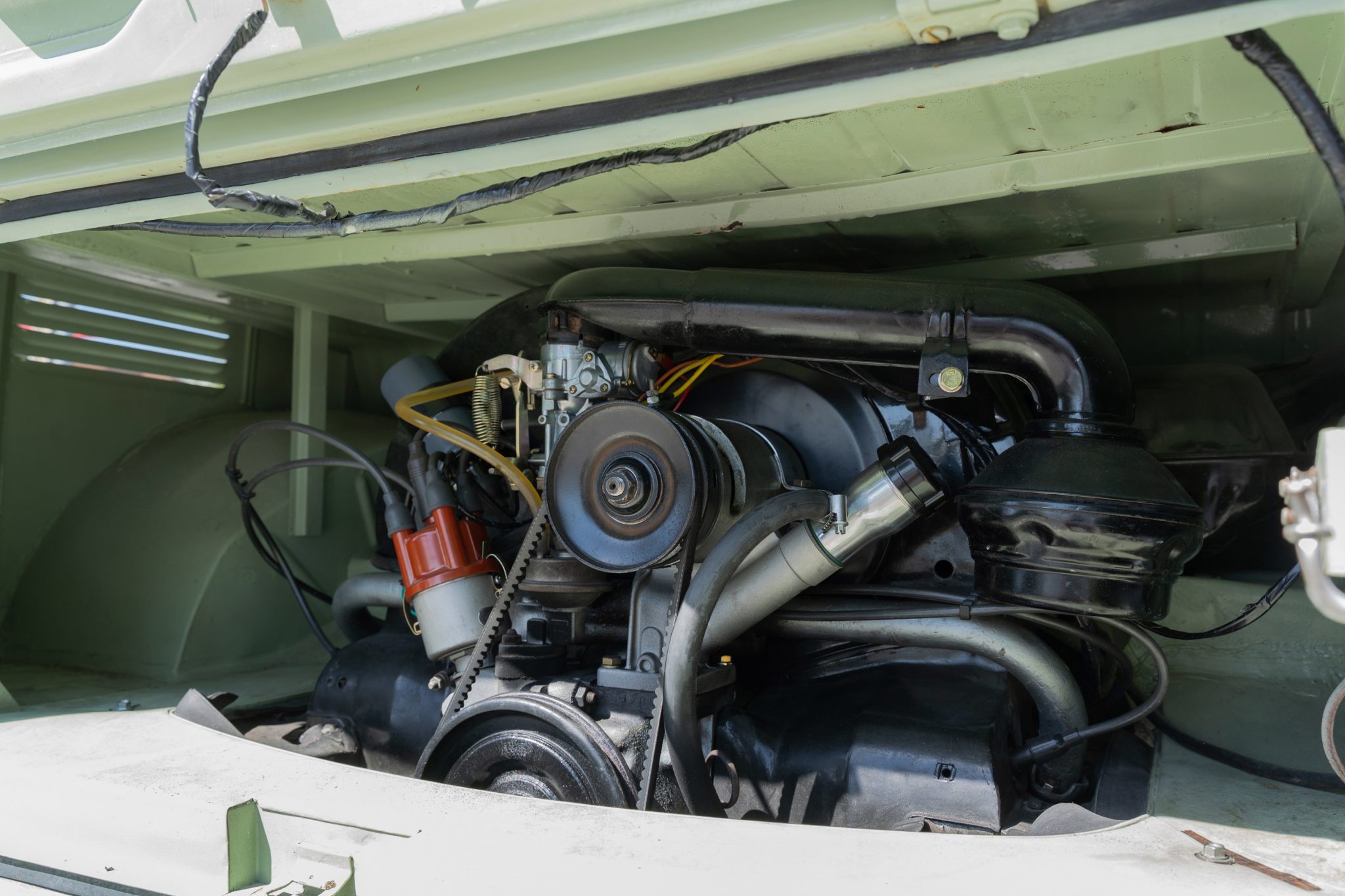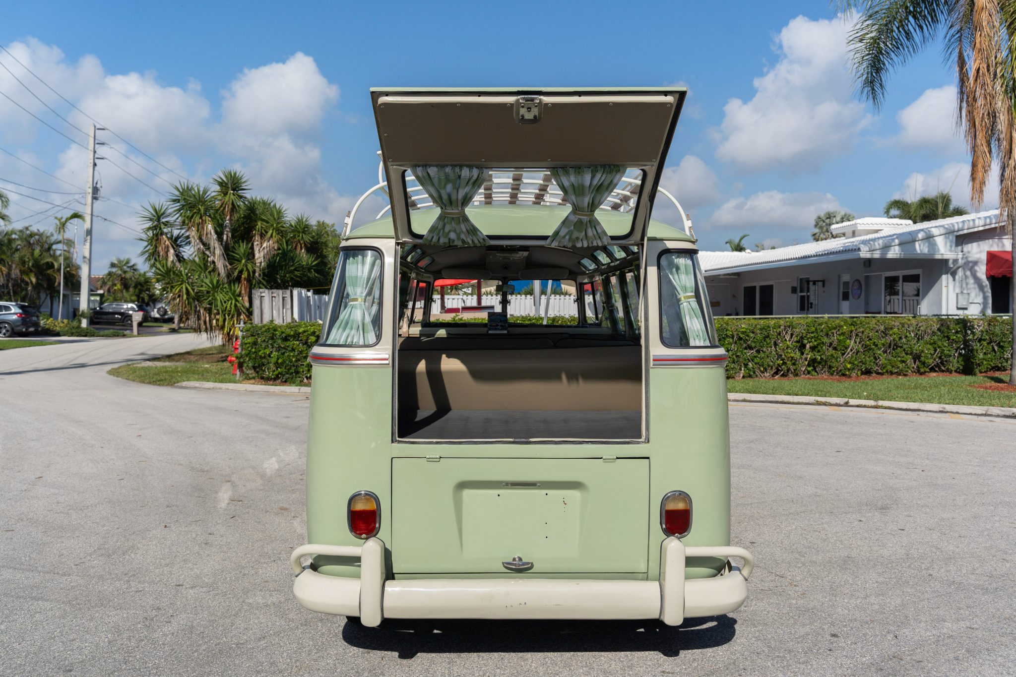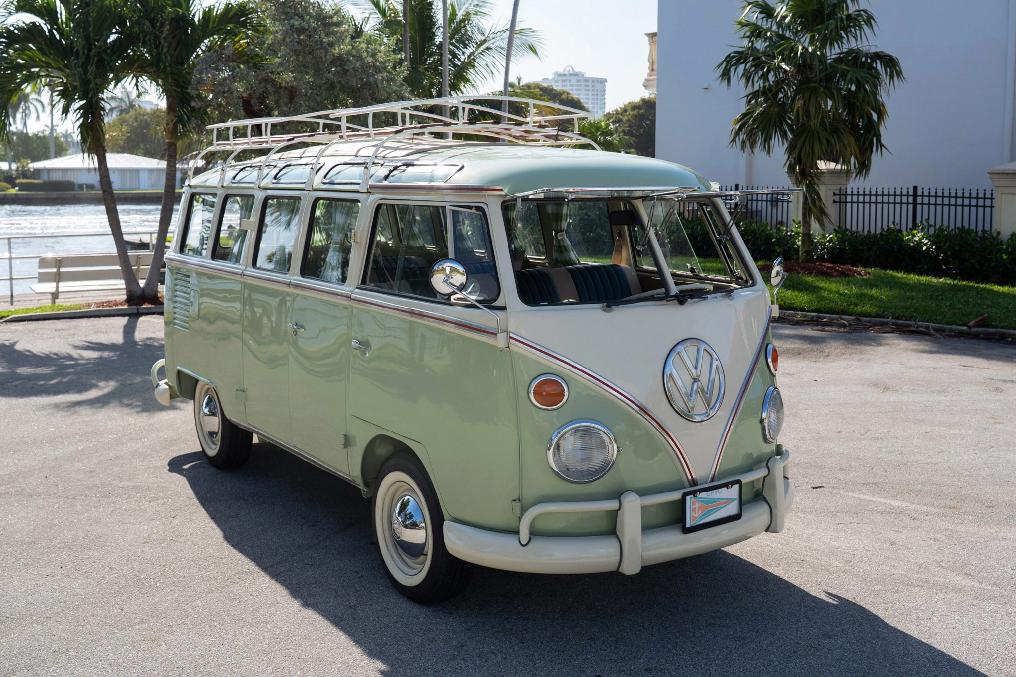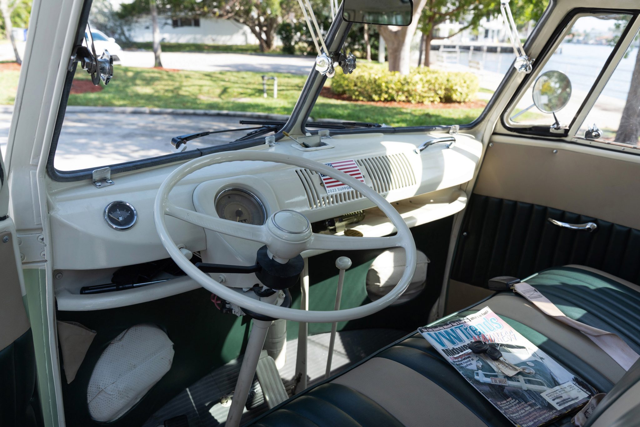 This 1965 Volkswagen Type 2 Kombi is a Brazilian-market example that received a 23-window conversion as part of a refurbishment It is finished in green and white over tan and green vinyl upholstery, and it is powered by an air-cooled 1.3L flat-four paired with a four-speed manual transaxle. Features include 14″ steel wheels, drum brakes, three rows of bench seating, front shoulder belts, rear lap belts, a 12-volt electrical system, dual roof racks, a sliding fabric sunroof, eight skylight windows, and safari-style windshields.