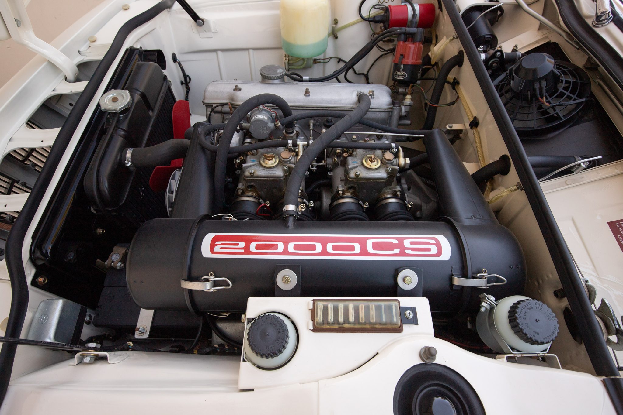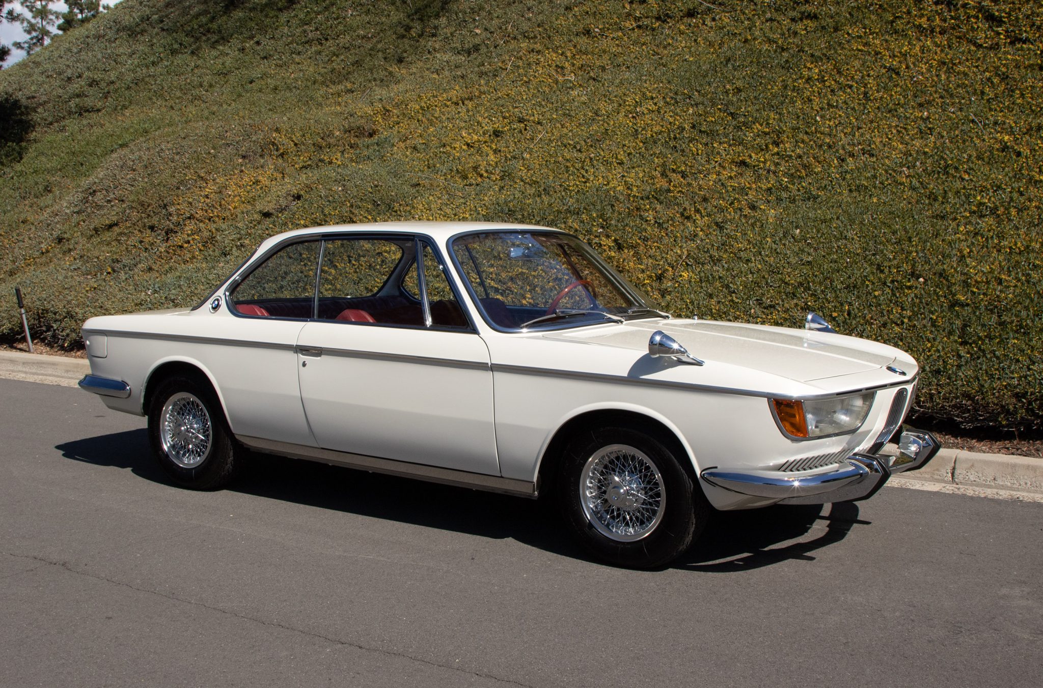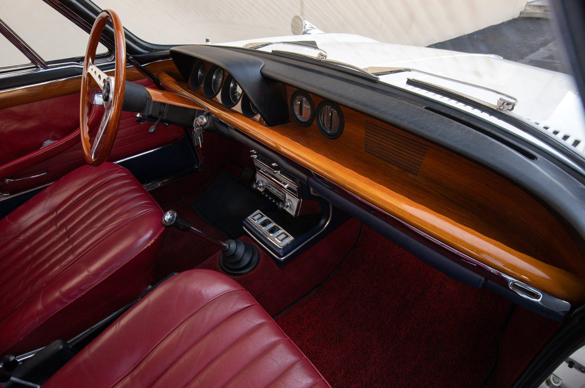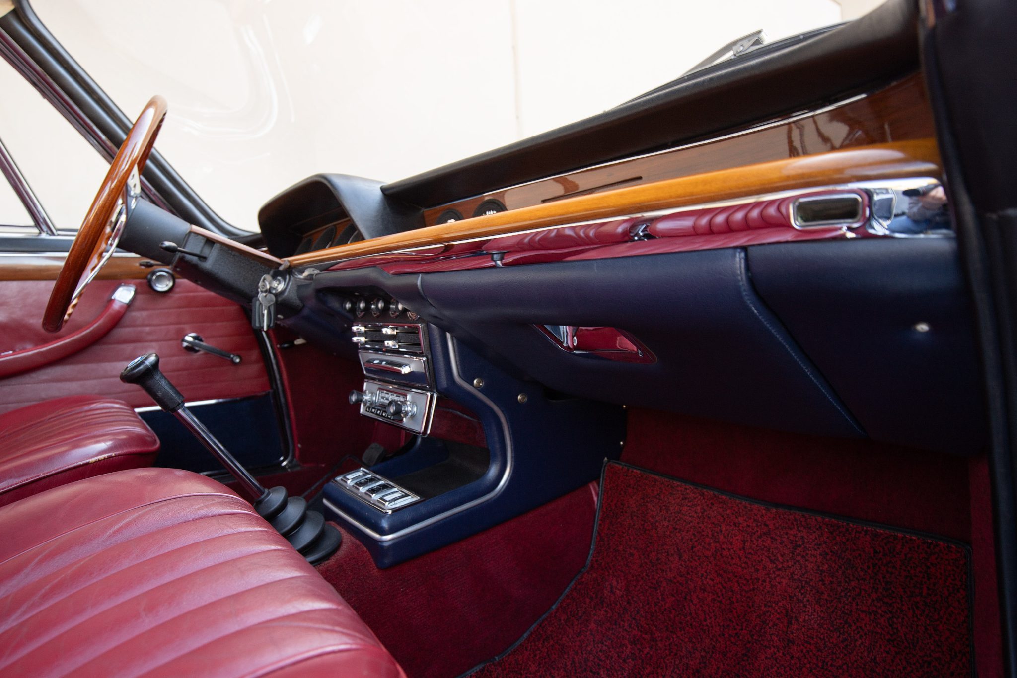 It is powered by a 2.0-liter inline-four paired with a four-speed manual transmission and is finished in Chamonix over red leather. Equipment includes a power-operated sunroof, 14″ Borrani wire wheels, a Blaupunkt radio, seatbelts, and a heater.