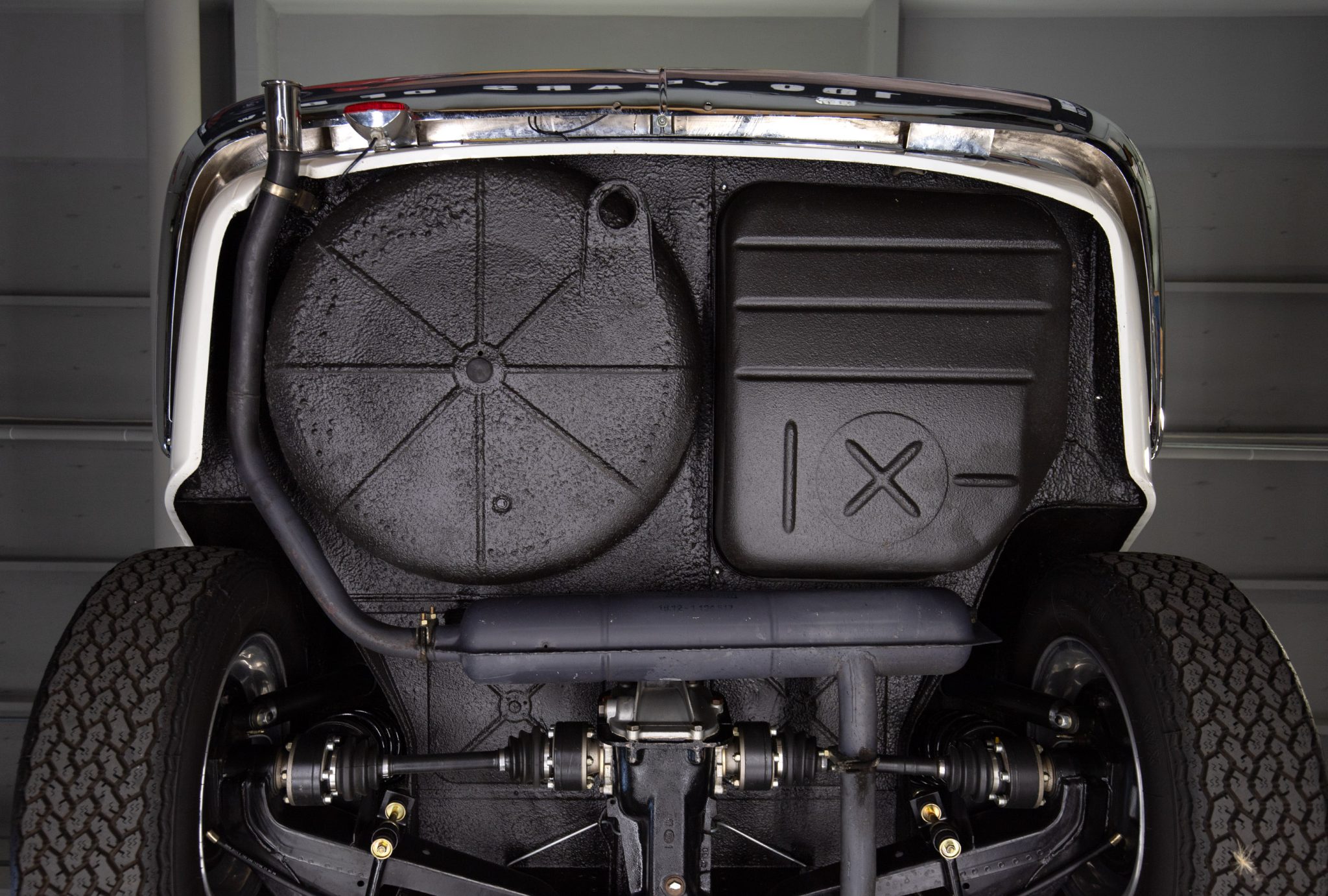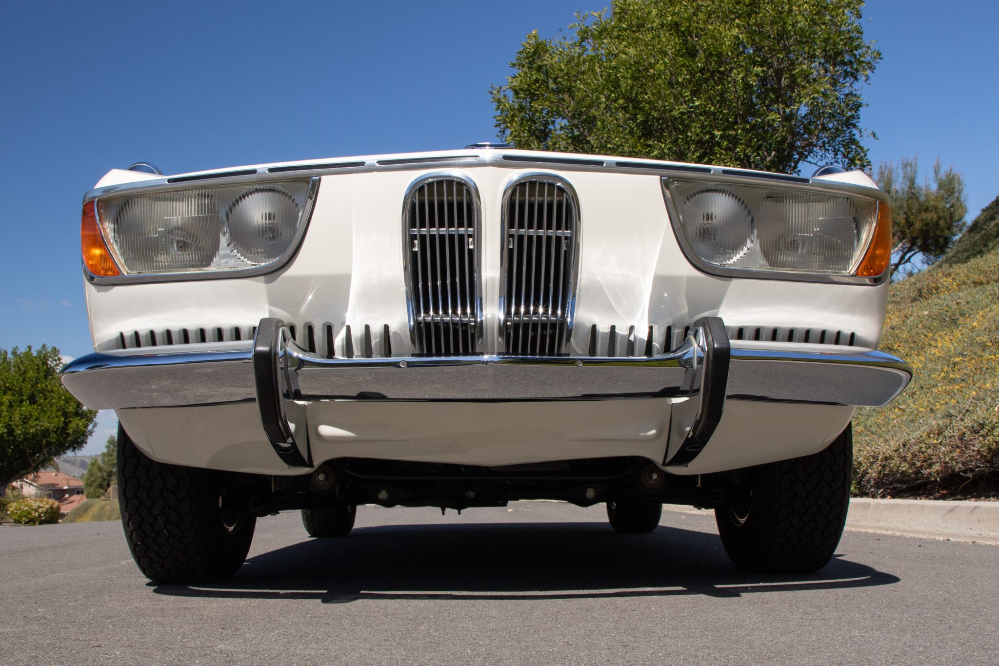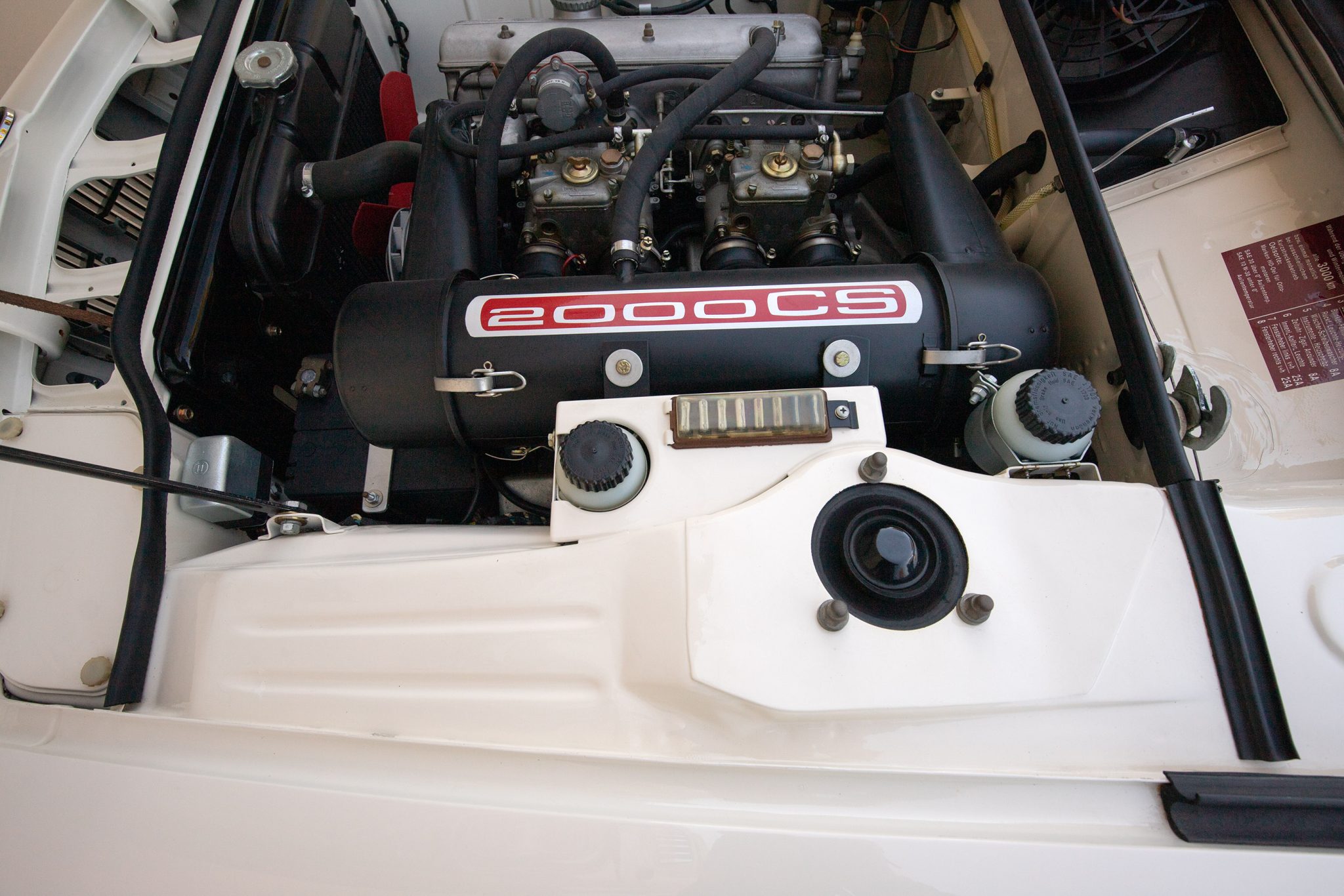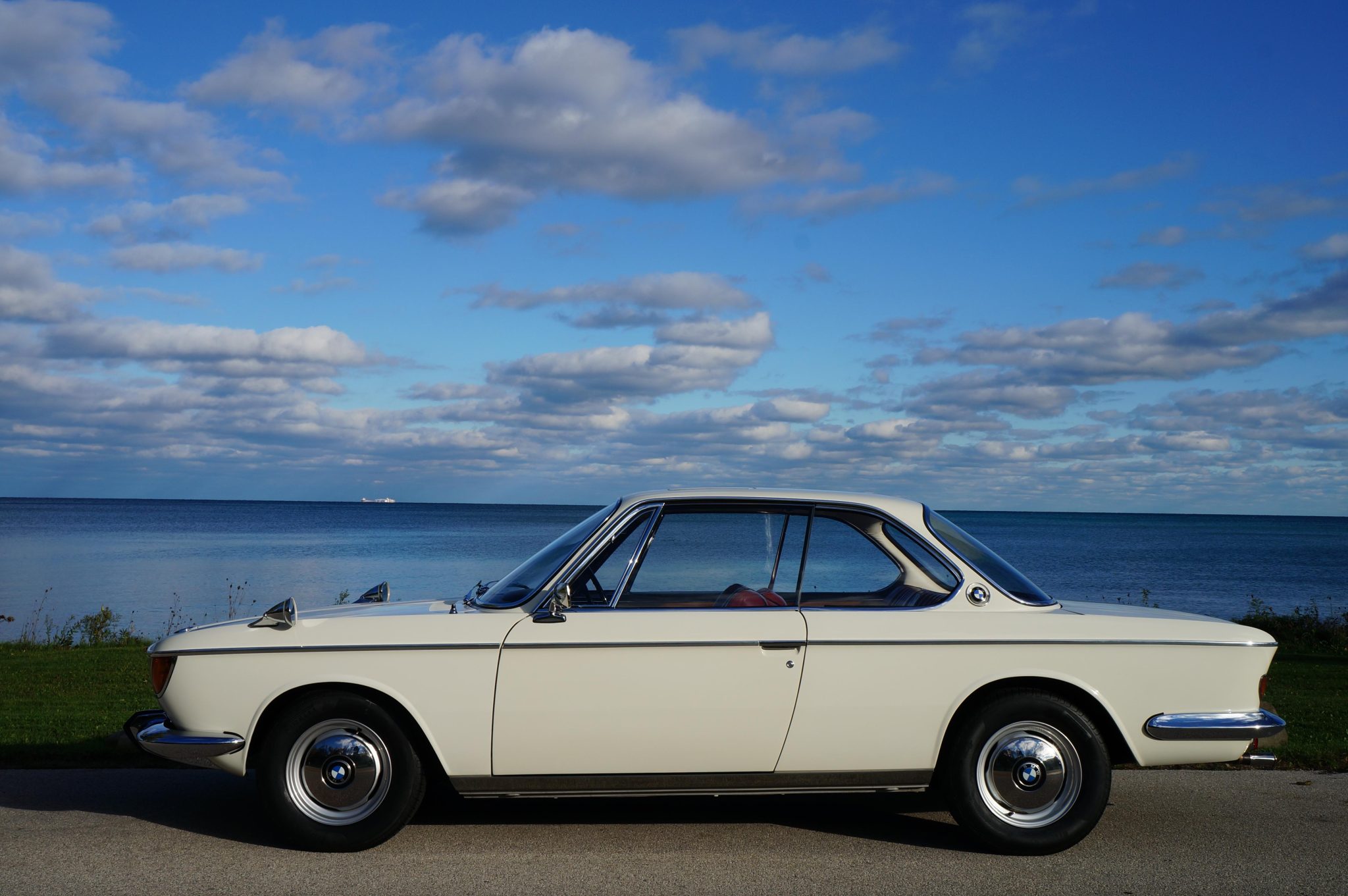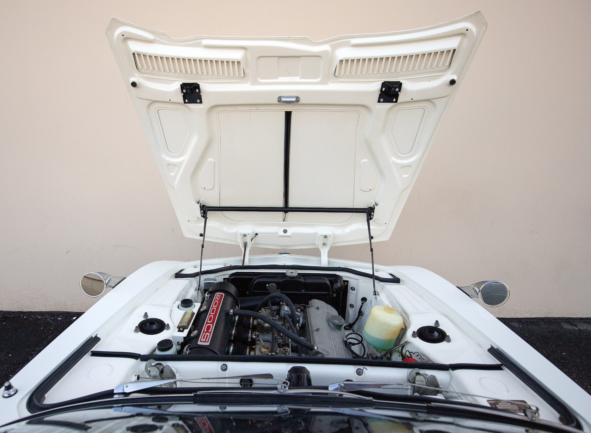 It is powered by a 2.0-liter inline-four paired with a four-speed manual transmission and is finished in Chamonix over red leather. Equipment includes a power-operated sunroof, 14″ Borrani wire wheels, a Blaupunkt radio, seatbelts, and a heater.