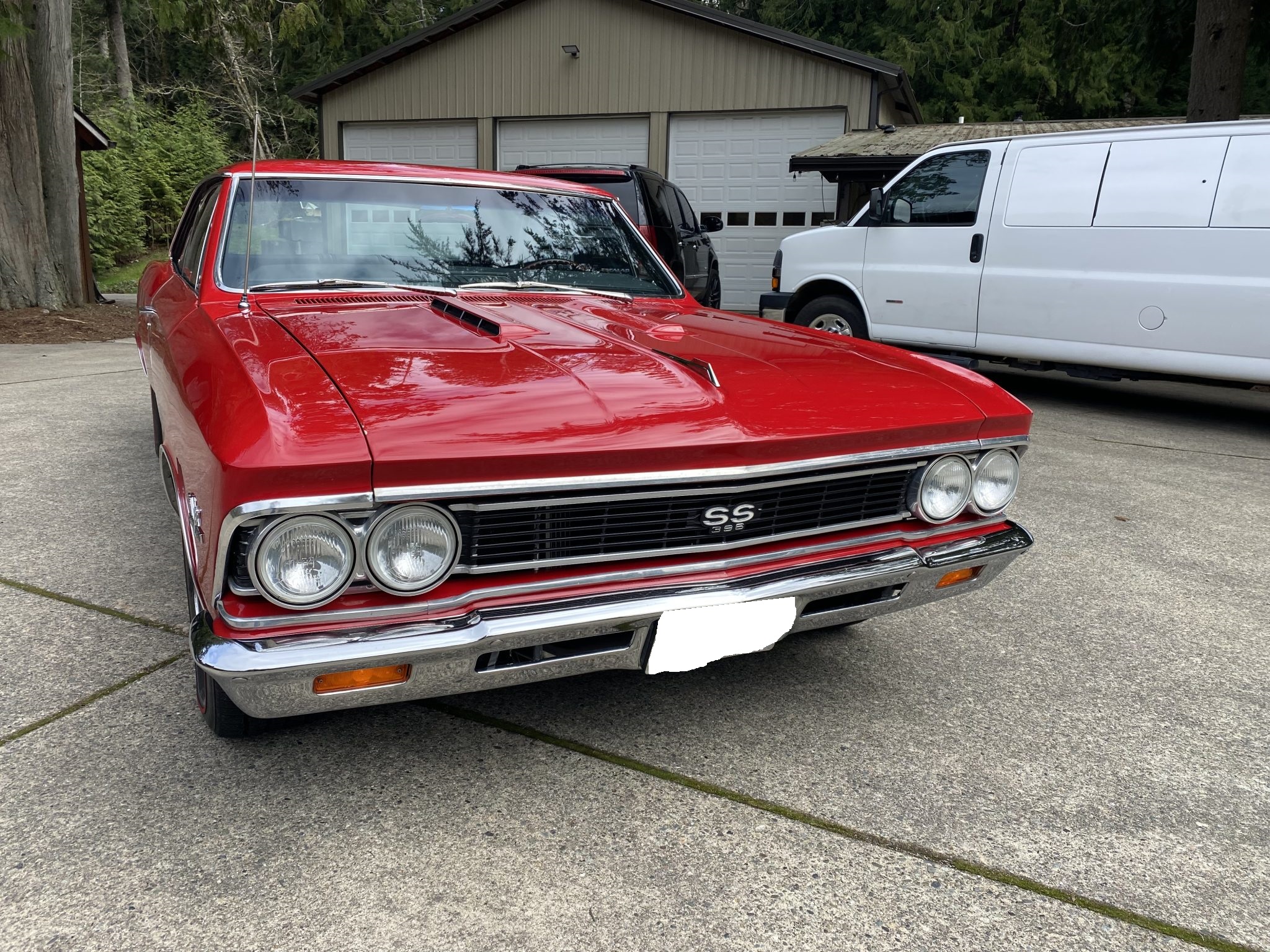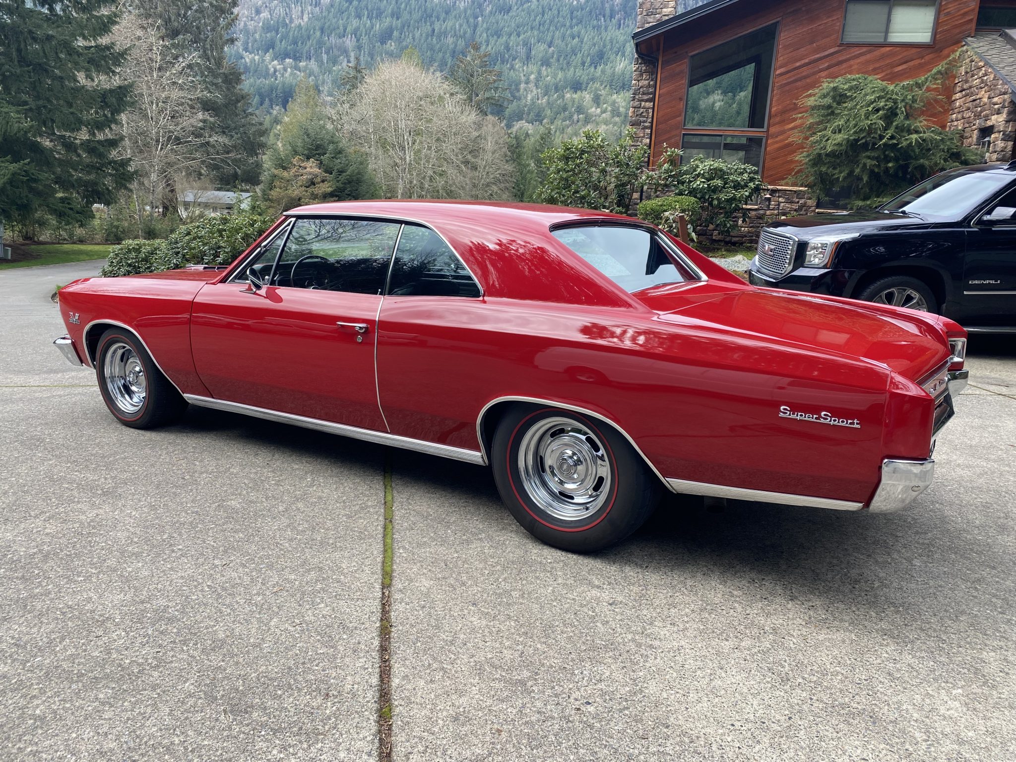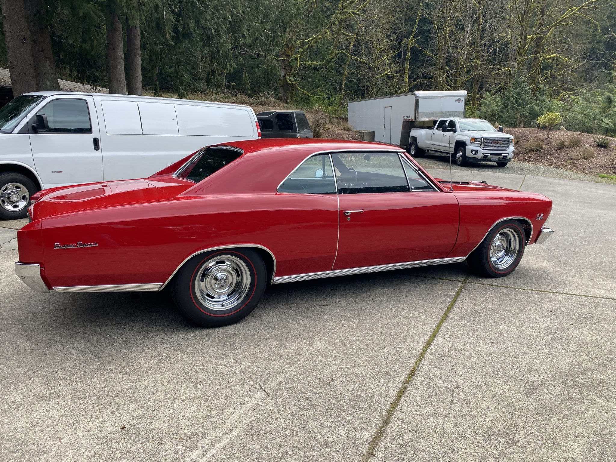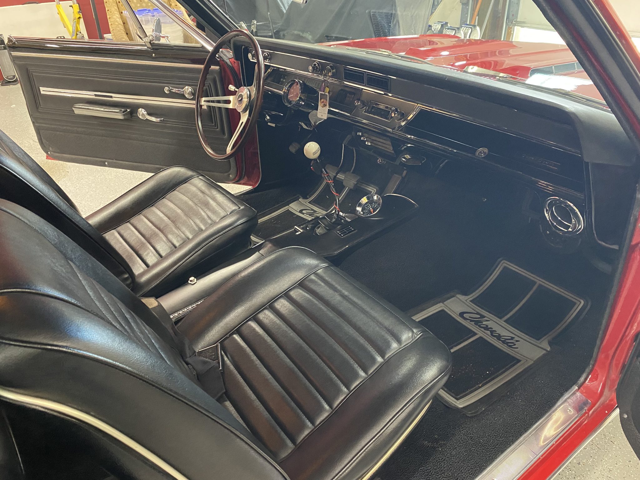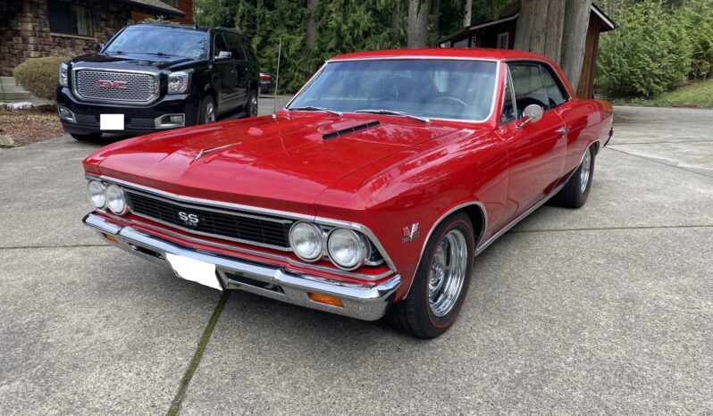 This 1966 Chevrolet Chevelle Malibu sport coupe was modified over the last three years with a 496ci V8, a TKO-600 five-speed manual transmission, four-wheel disc brakes, power steering, QA1 coilovers, Vintage Air air conditioning, and a dual exhaust system with electric cutouts. The car is refinished in red over black, and additional equipment includes a 12-bolt Positraction rear end, 14″ Rally-style steel wheels, front bucket seats, and an aftermarket stereo.