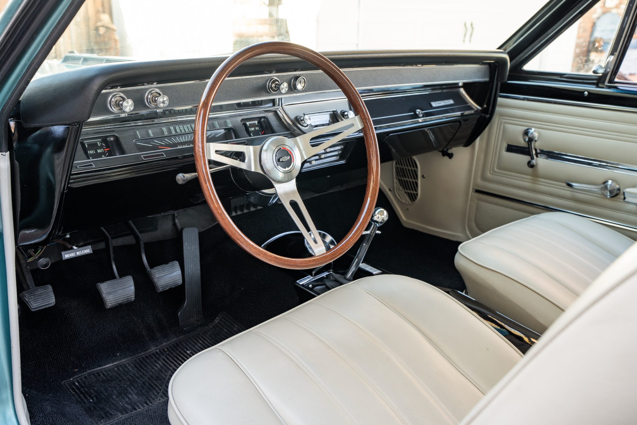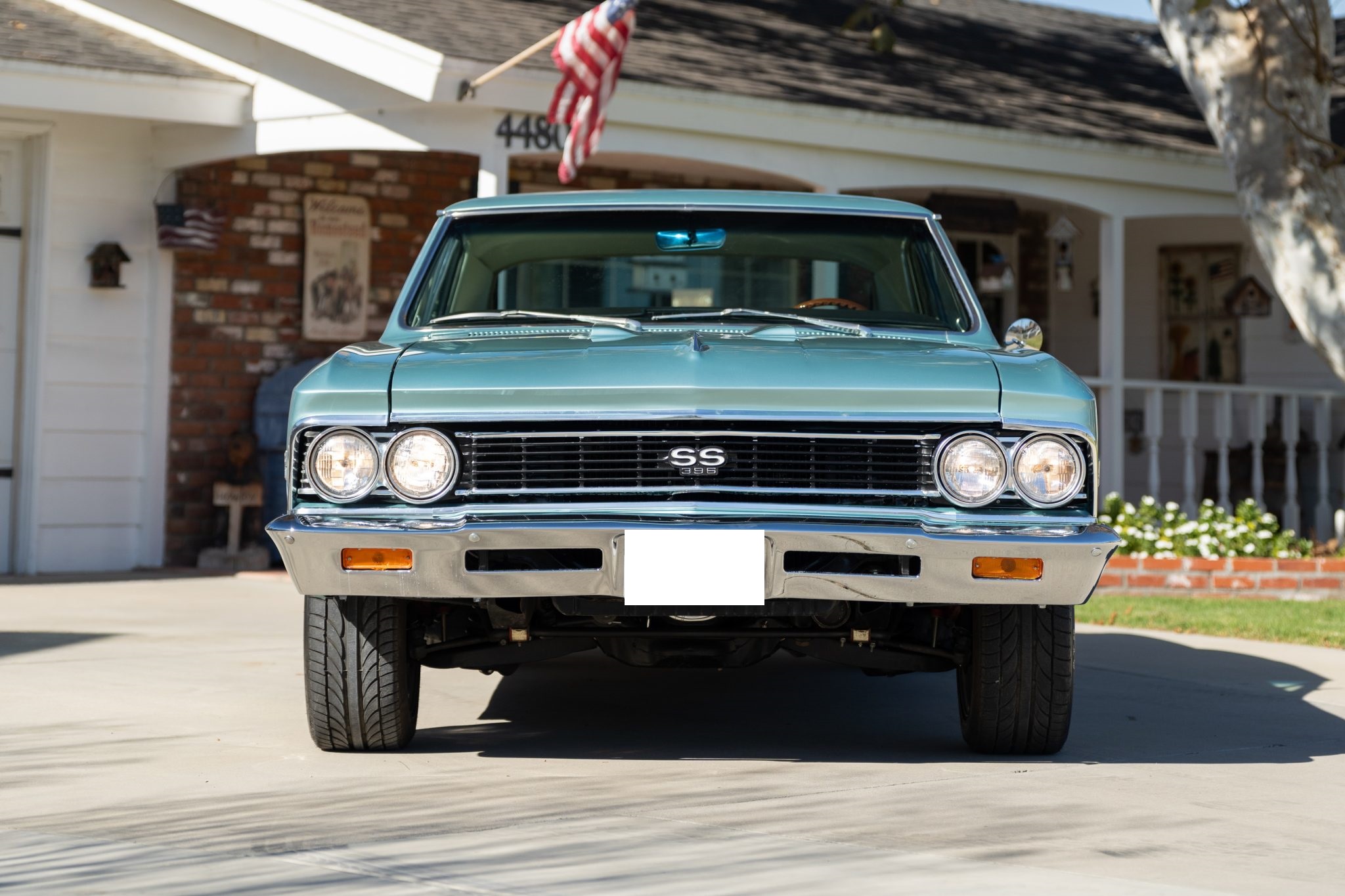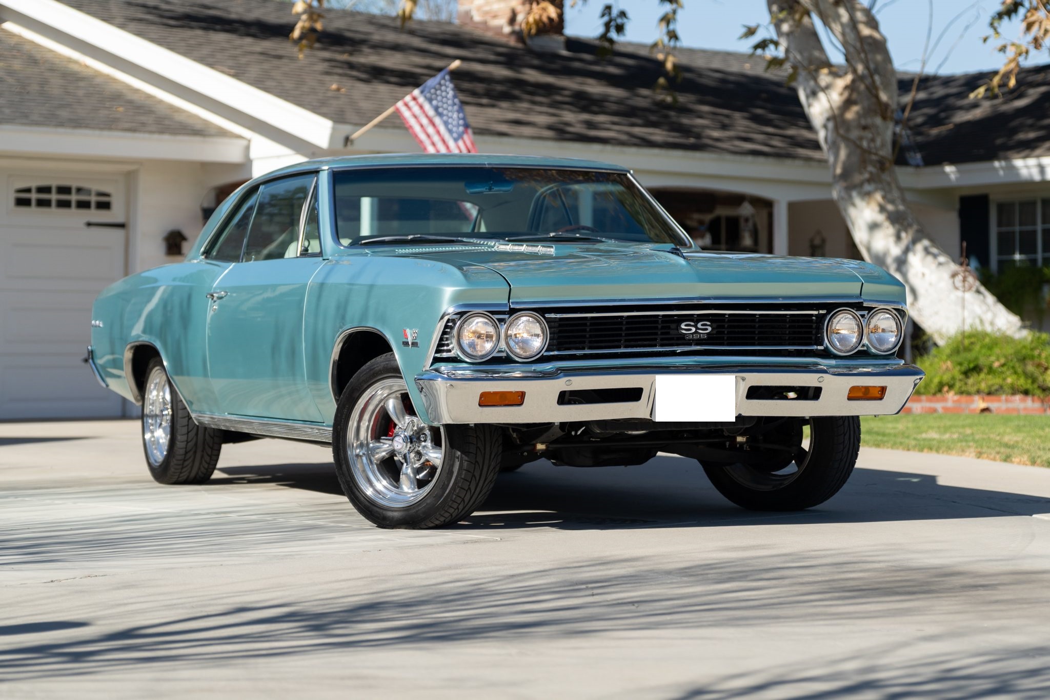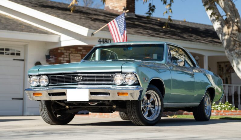 This 1966 Chevrolet Chevelle SS 396 sports coupe underwent a refurbishment that involved replacing the 396ci V8, repainting the exterior in turquoise, and reupholstering the interior in white. Features include a four-speed manual transmission, a 12-bolt rear end, Wilwood power-assisted front disc brakes, power steering, a front and rear coil-spring suspension, a front sway bar, 16″ American Racing wheels, front bucket seats, a push-button AM radio, and a heater.