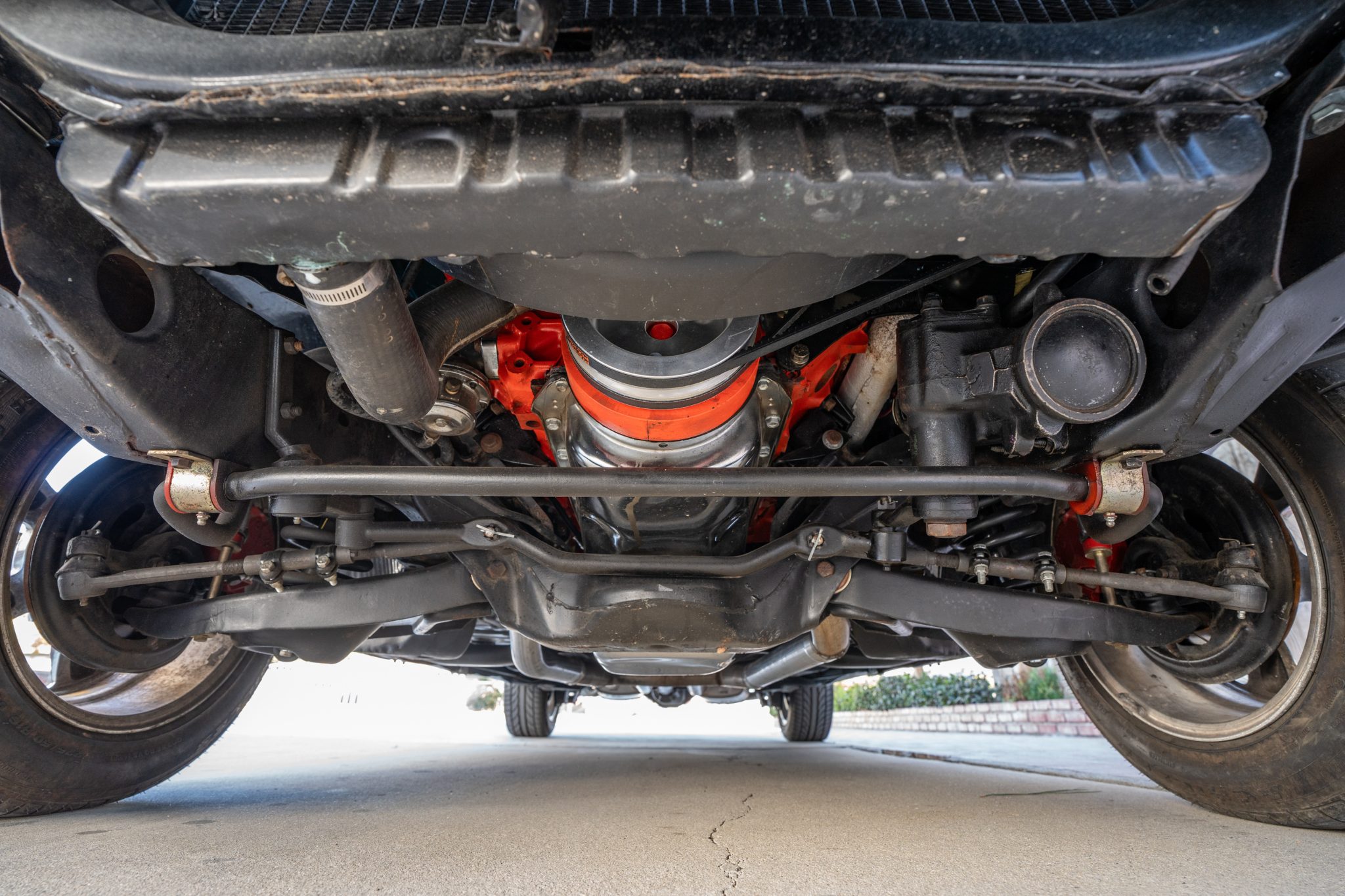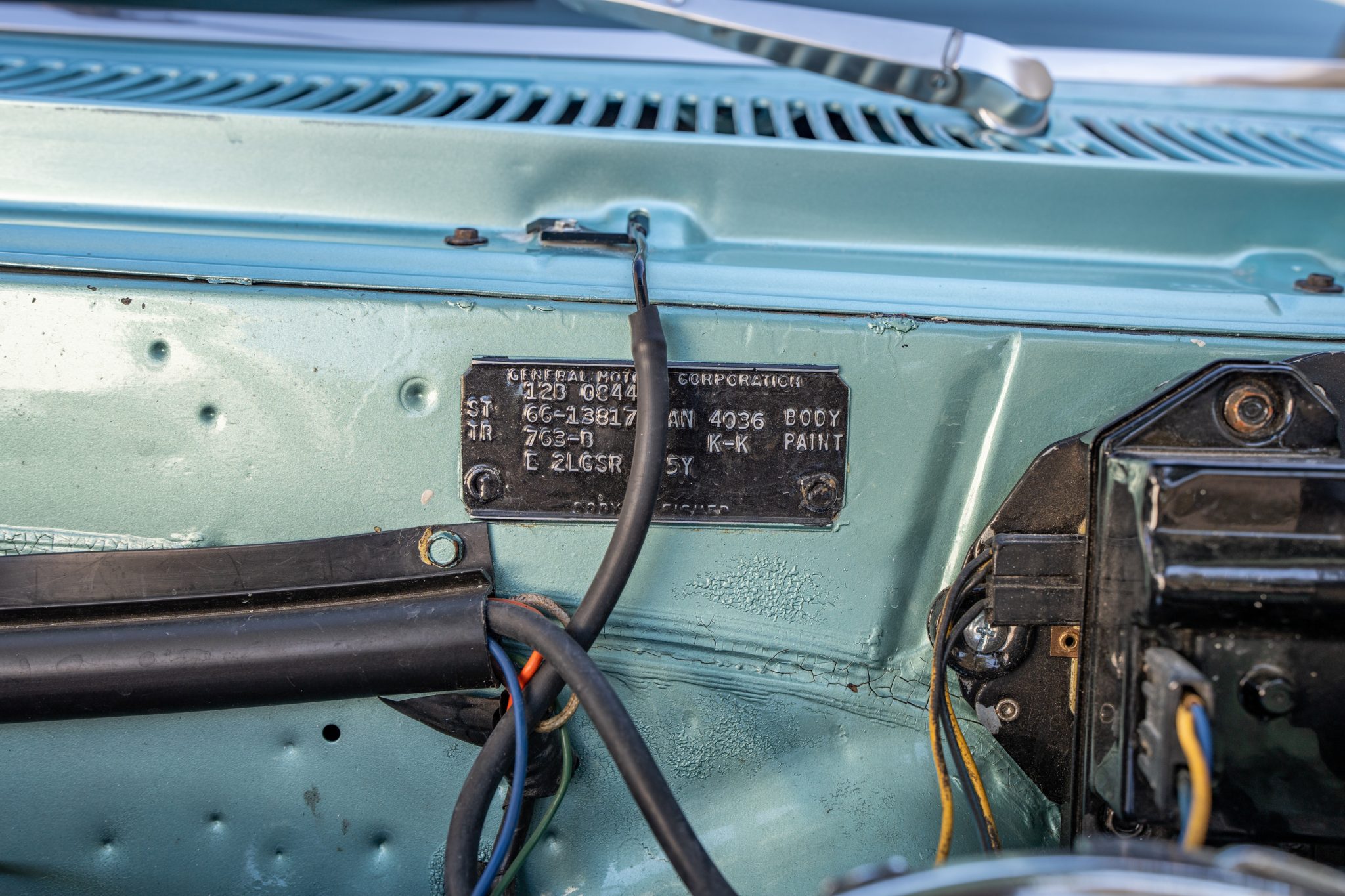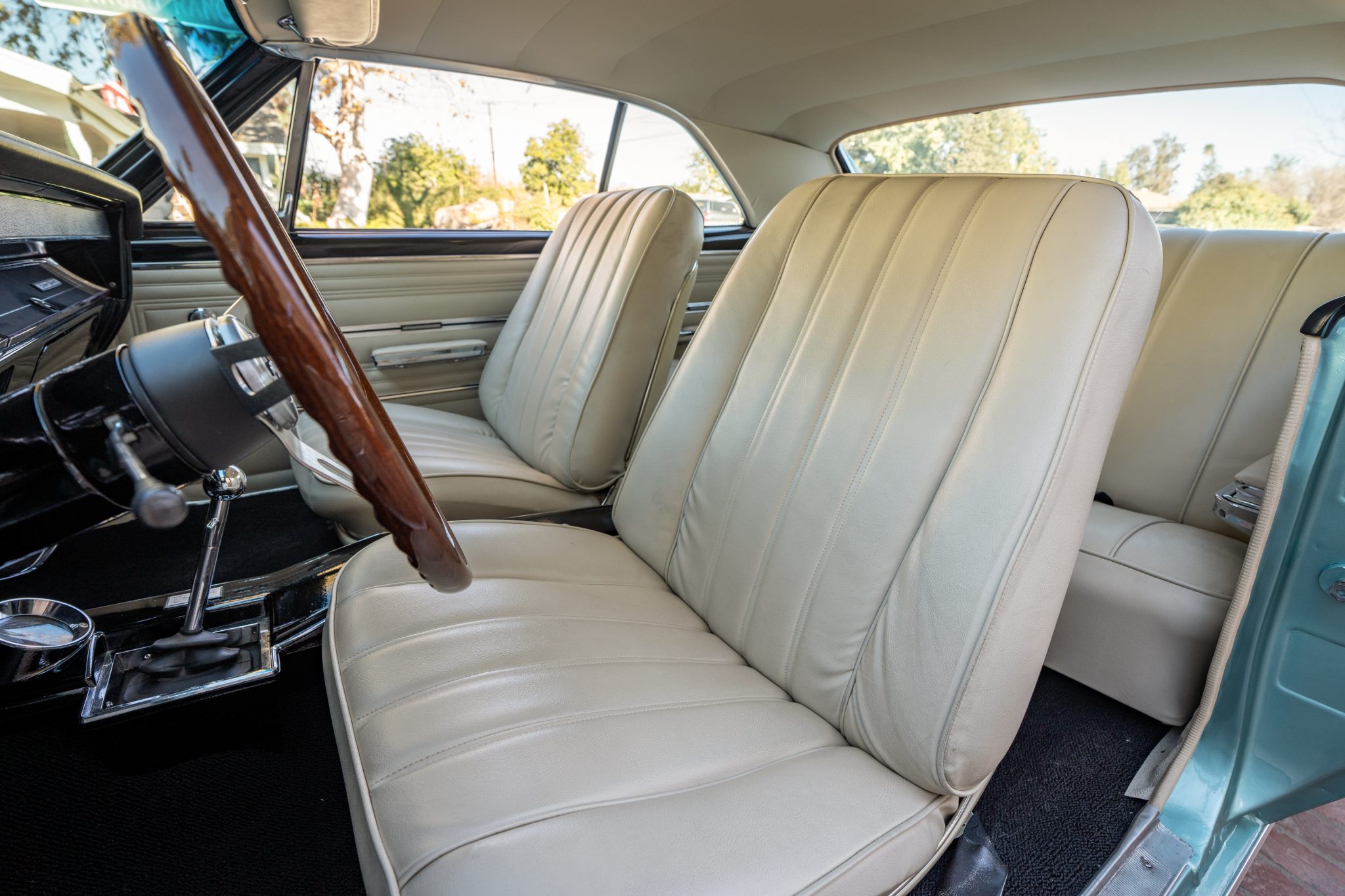 This 1966 Chevrolet Chevelle SS 396 sports coupe underwent a refurbishment that involved replacing the 396ci V8, repainting the exterior in turquoise, and reupholstering the interior in white. Features include a four-speed manual transmission, a 12-bolt rear end, Wilwood power-assisted front disc brakes, power steering, a front and rear coil-spring suspension, a front sway bar, 16″ American Racing wheels, front bucket seats, a push-button AM radio, and a heater.