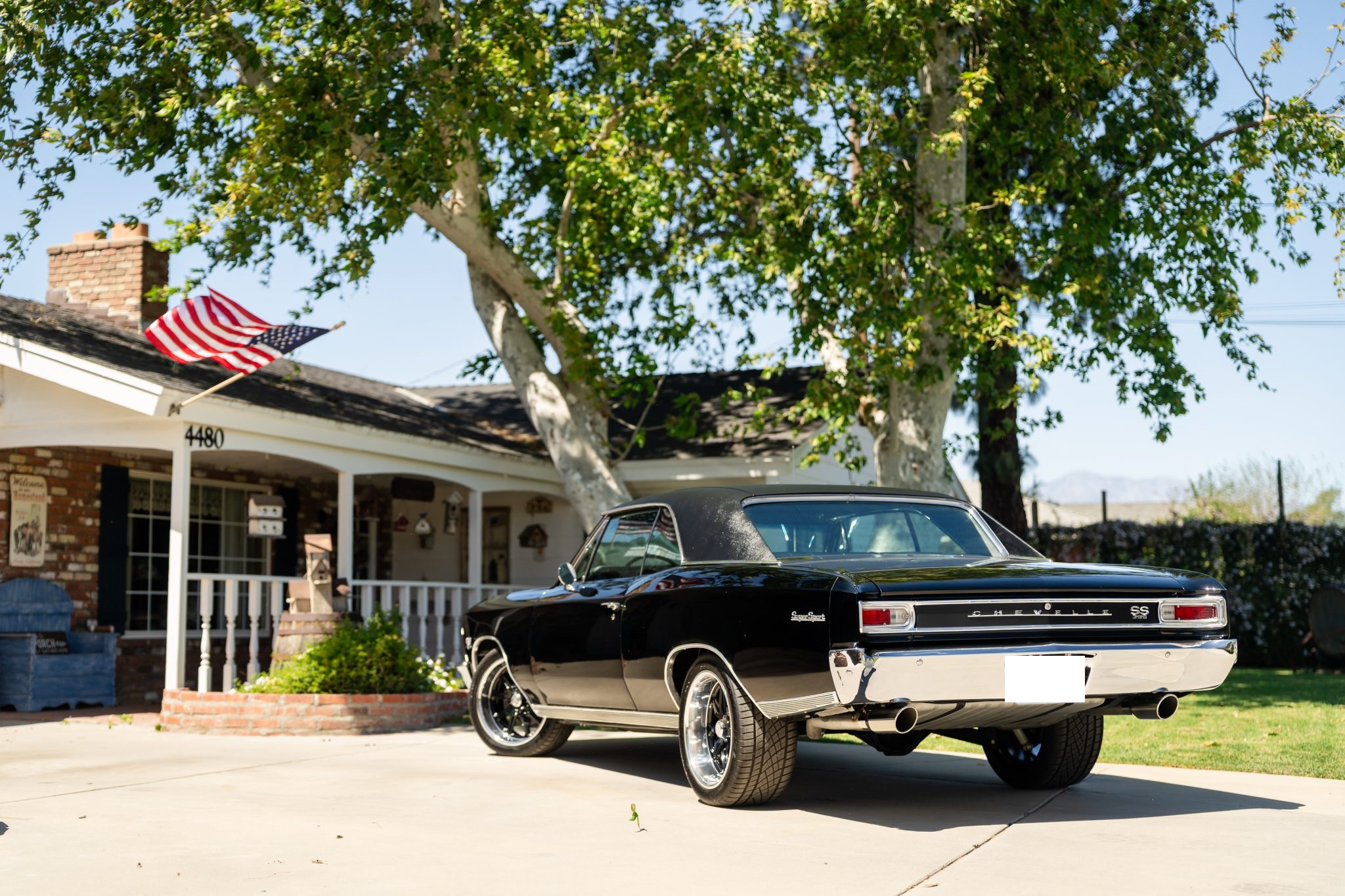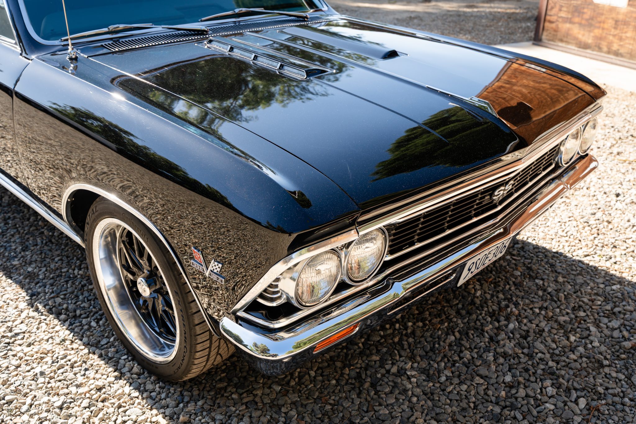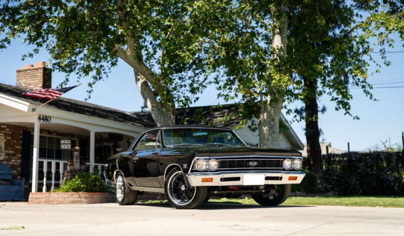This 1966 Chevrolet Chevelle SS 396 sports coupe underwent a refurbishment in 2022 and is powered by a replacement 396ci V8 mated to a Muncie four-speed manual transmission. It is finished in black with a matching vinyl roof cover, and equipment includes a PosiTraction differential, chrome bumpers, Flowmaster mufflers, electric windshield wipers, power-assisted front disc brakes, power steering, 18″ US Mags Rambler wheels, and SS badging and trim.