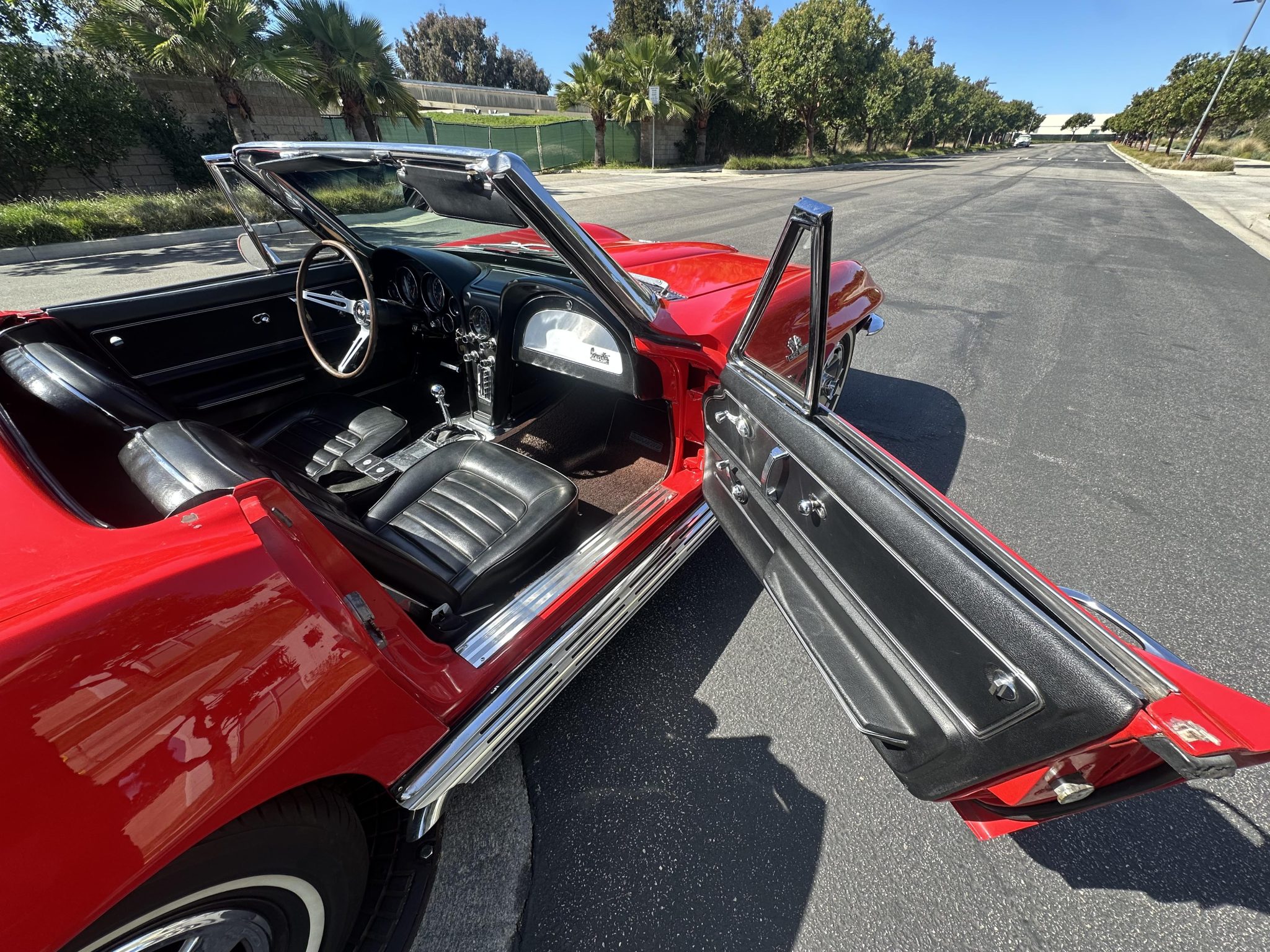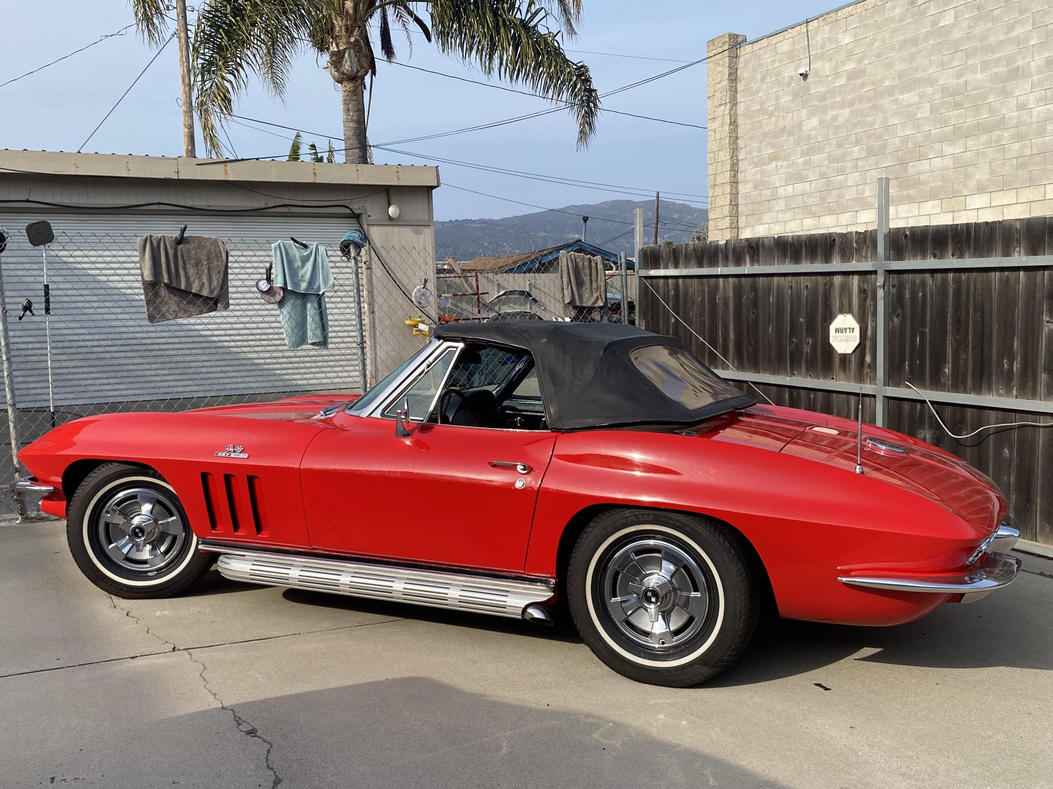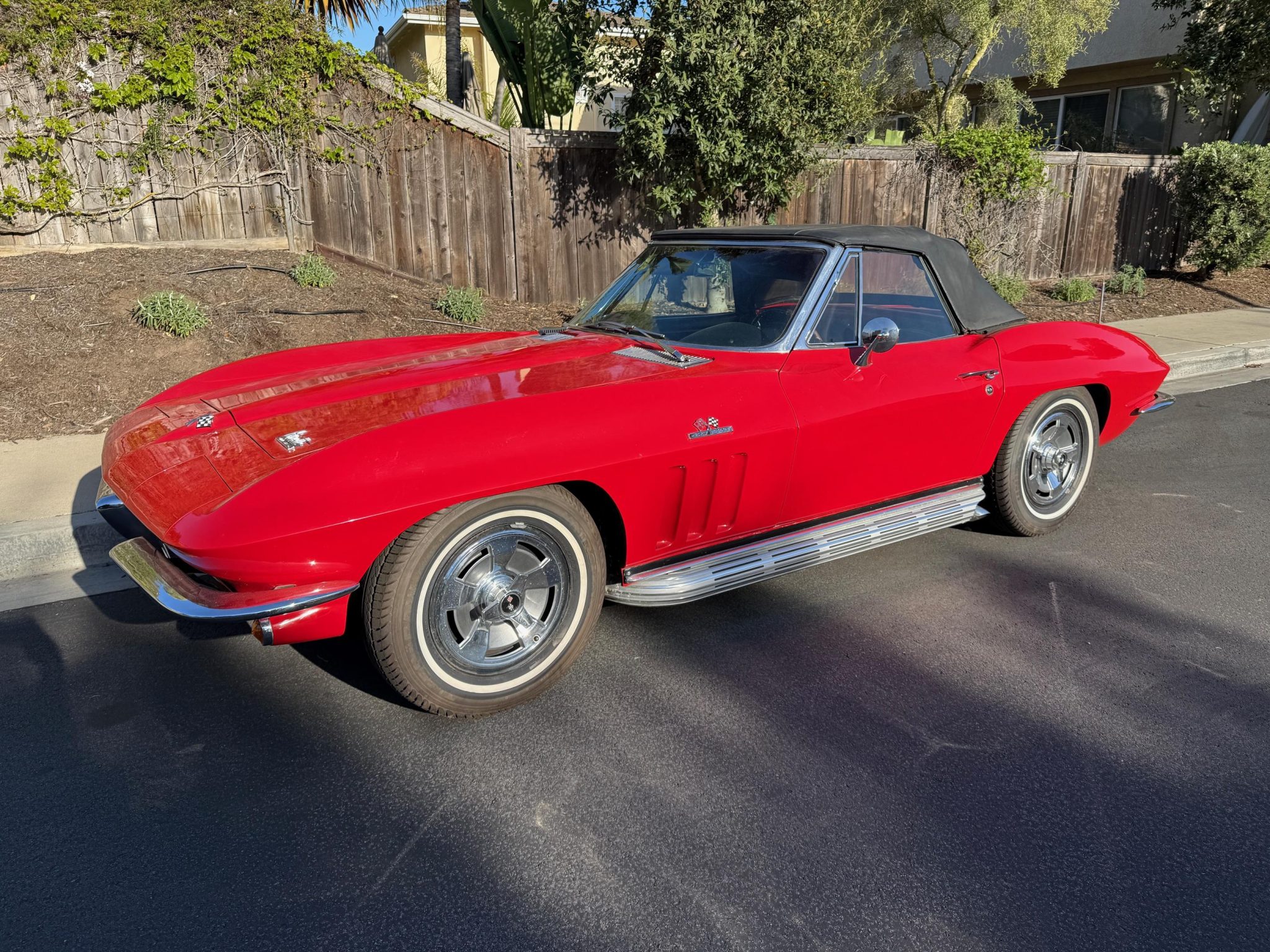 This 1966 Chevrolet Corvette is a red-on-black convertible that is powered by a 327ci V8 paired with a four-speed manual transmission and a Positraction differential. and is outfitted with a black soft top, a body-color removable hardtop, 15″ steel wheels, a side-exit exhaust system, and an AM/FM radio.