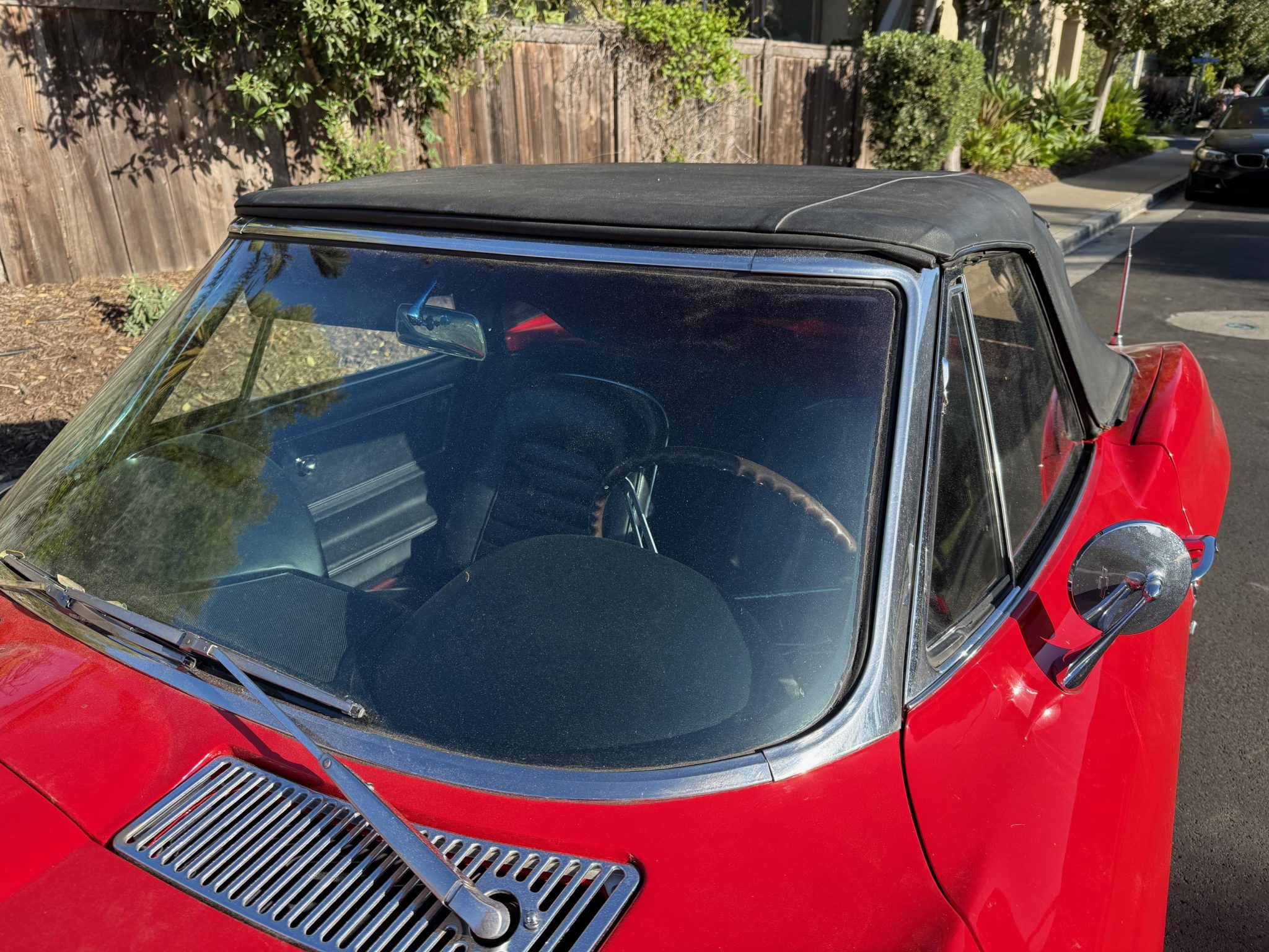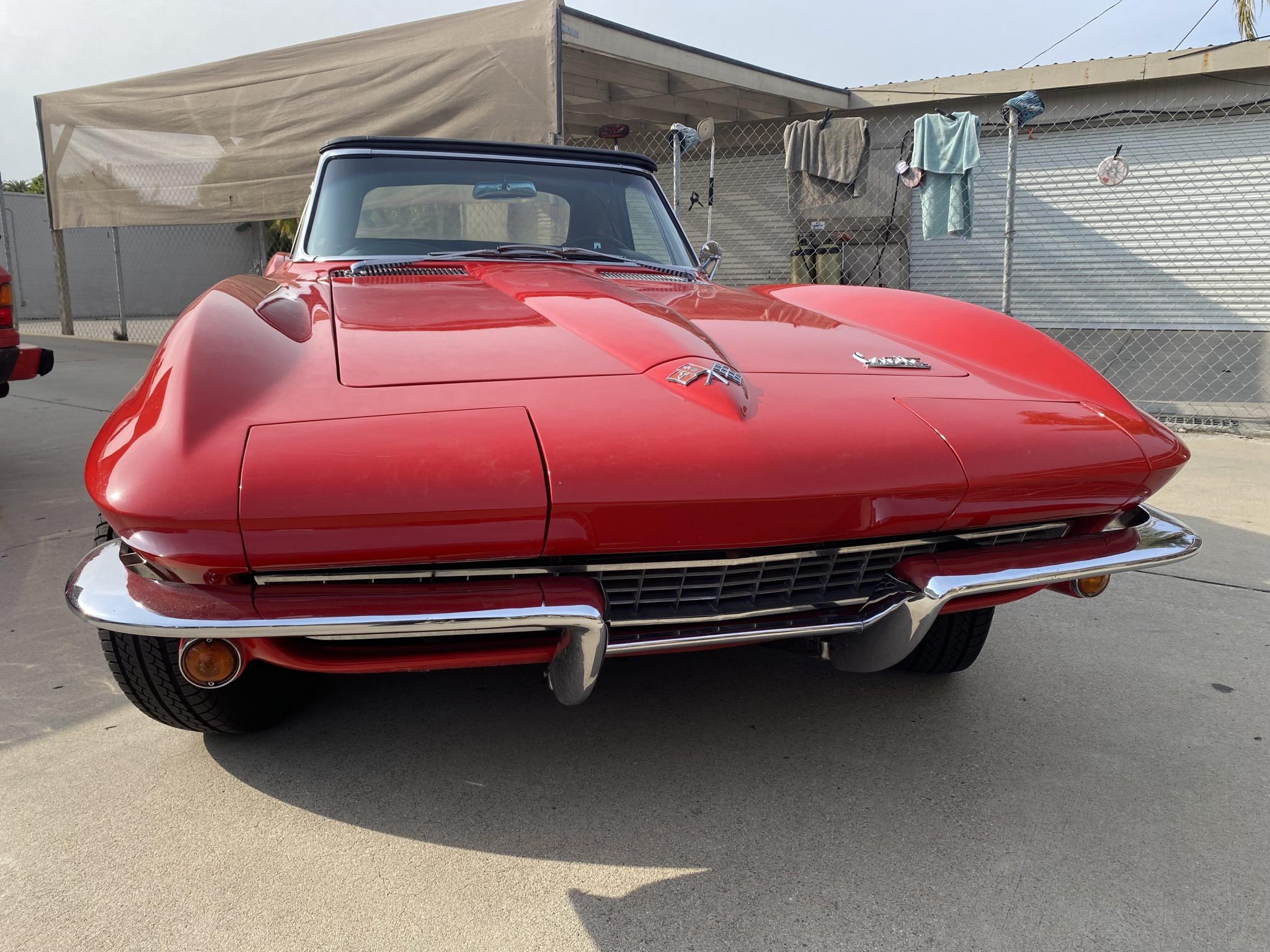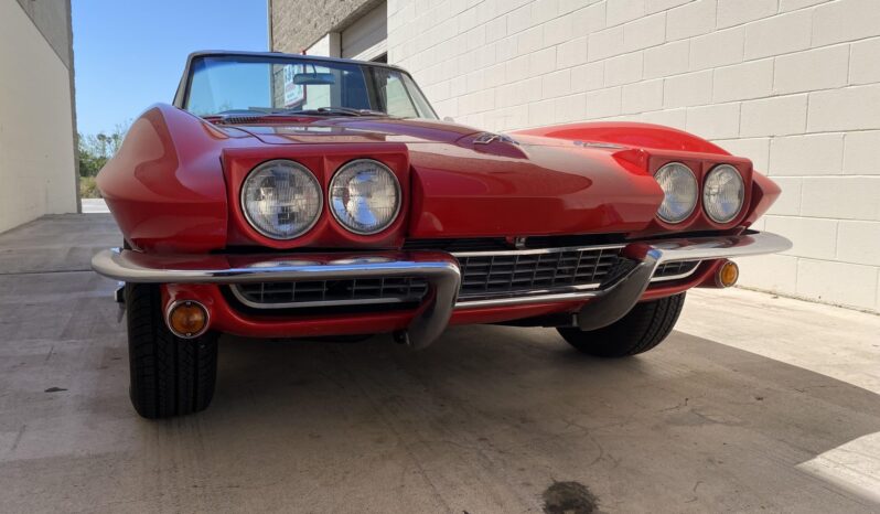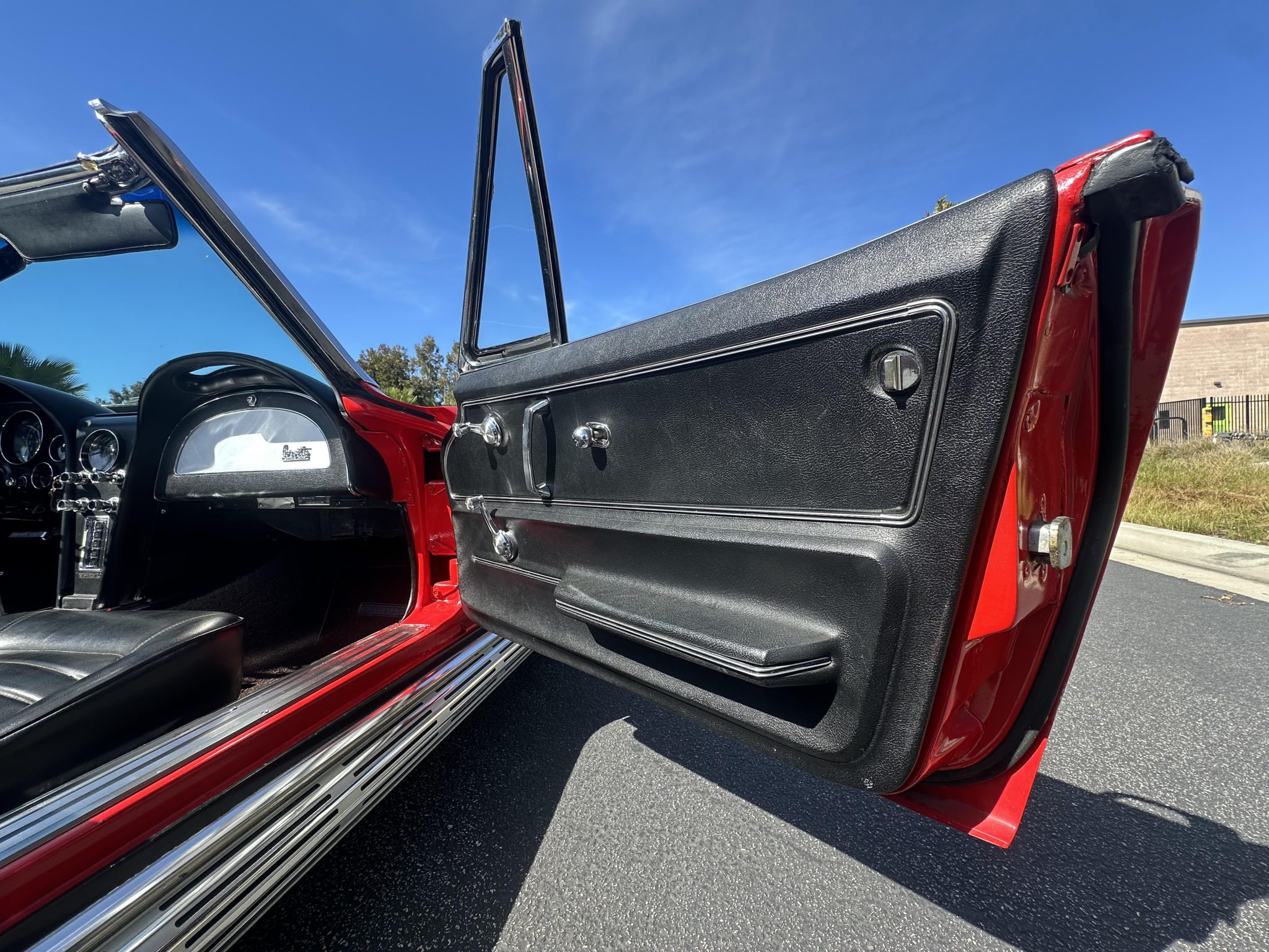 This 1966 Chevrolet Corvette is a red-on-black convertible that is powered by a 327ci V8 paired with a four-speed manual transmission and a Positraction differential. and is outfitted with a black soft top, a body-color removable hardtop, 15″ steel wheels, a side-exit exhaust system, and an AM/FM radio.