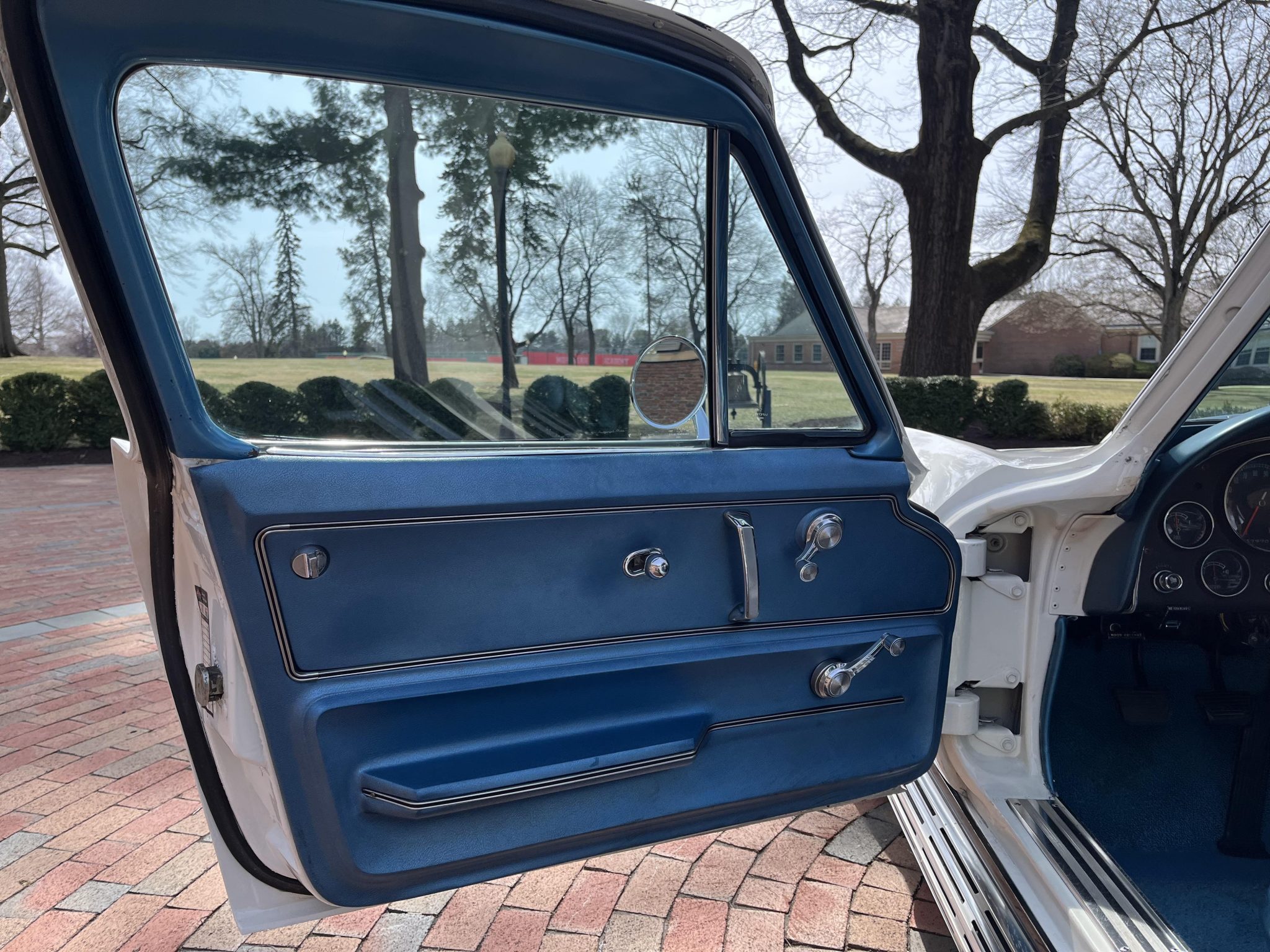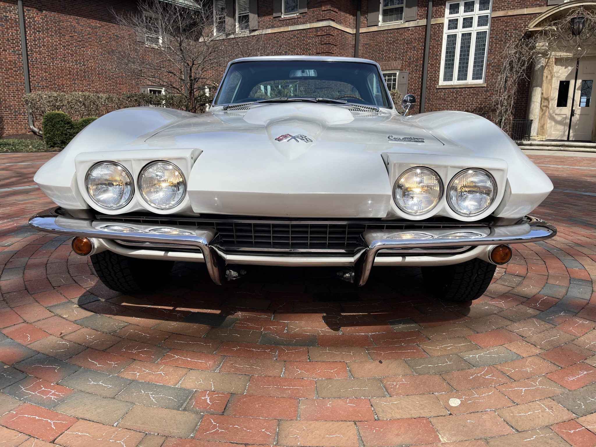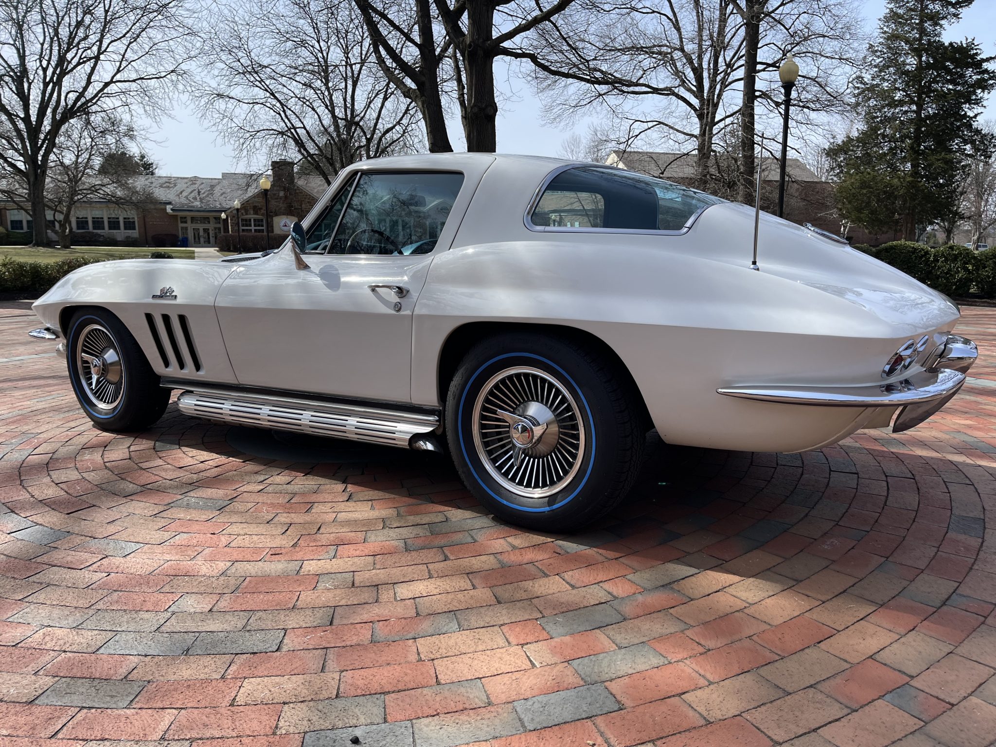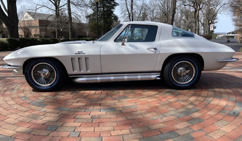 This 1966 Chevrolet Corvette coupe is powered by a 427ci L36 V8 that was rebuilt in 2018, and it is paired with a four-speed manual transmission. The car is finished in white over Bright Blue vinyl upholstery. Equipment includes 15″ Turbine-style aluminum wheels, four-wheel disc brakes, an aluminum radiator, a cabin heater, an AM/FM radio, chrome bumpers, and retractable headlights.