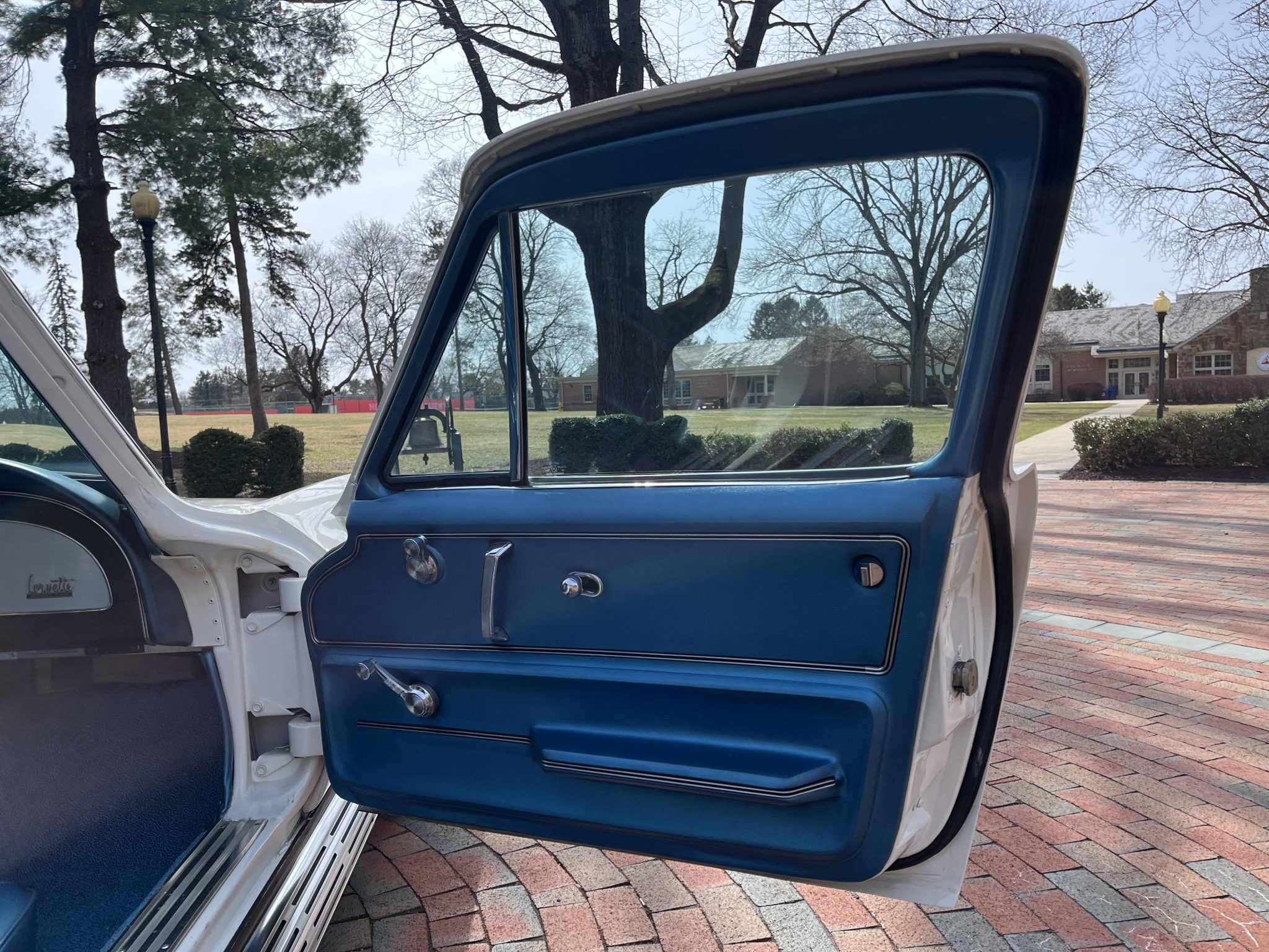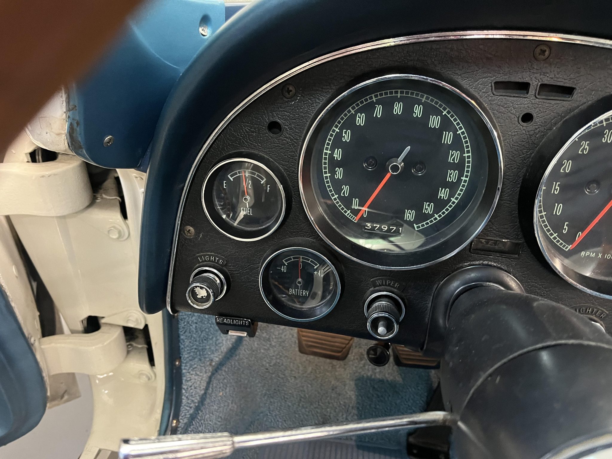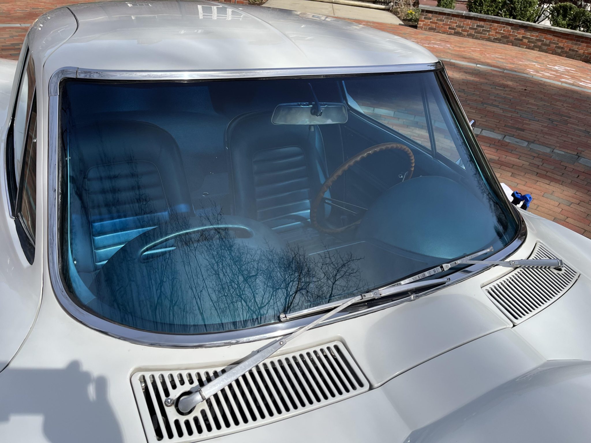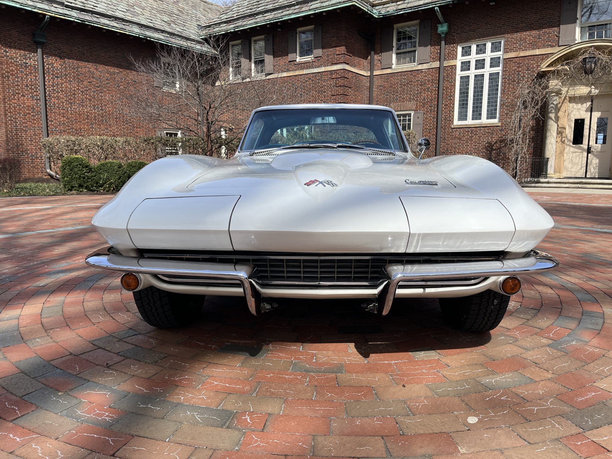 This 1966 Chevrolet Corvette coupe is powered by a 427ci L36 V8 that was rebuilt in 2018, and it is paired with a four-speed manual transmission. The car is finished in white over Bright Blue vinyl upholstery. Equipment includes 15″ Turbine-style aluminum wheels, four-wheel disc brakes, an aluminum radiator, a cabin heater, an AM/FM radio, chrome bumpers, and retractable headlights.