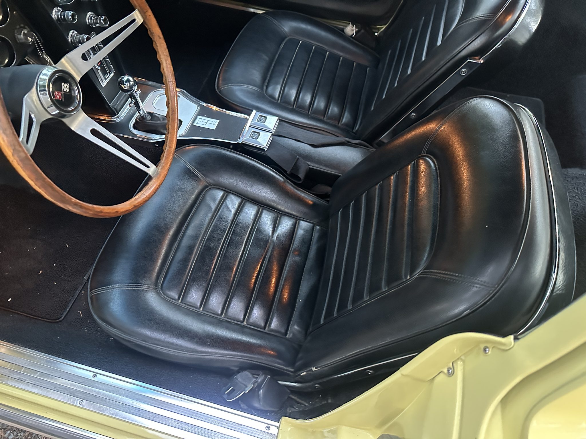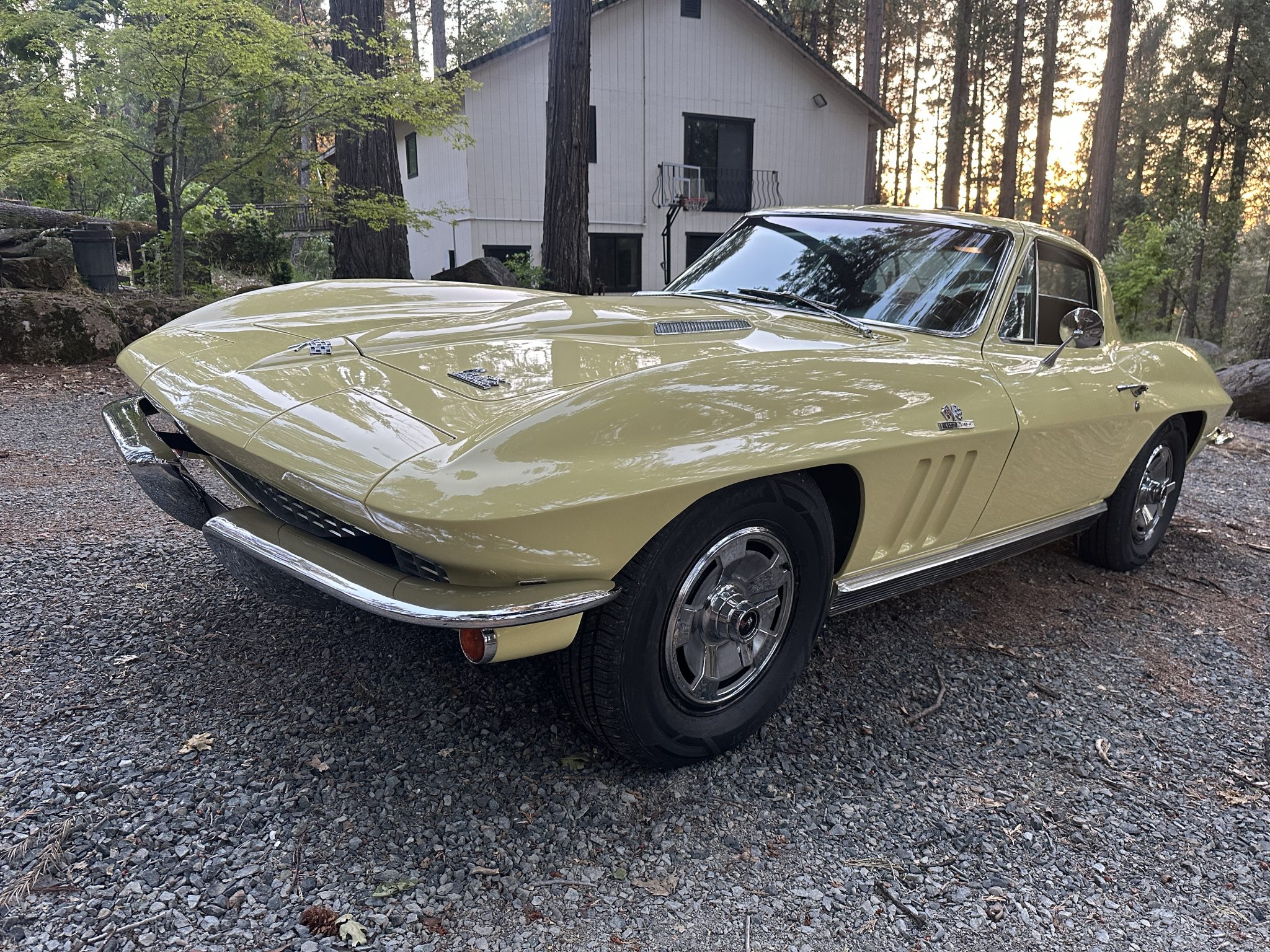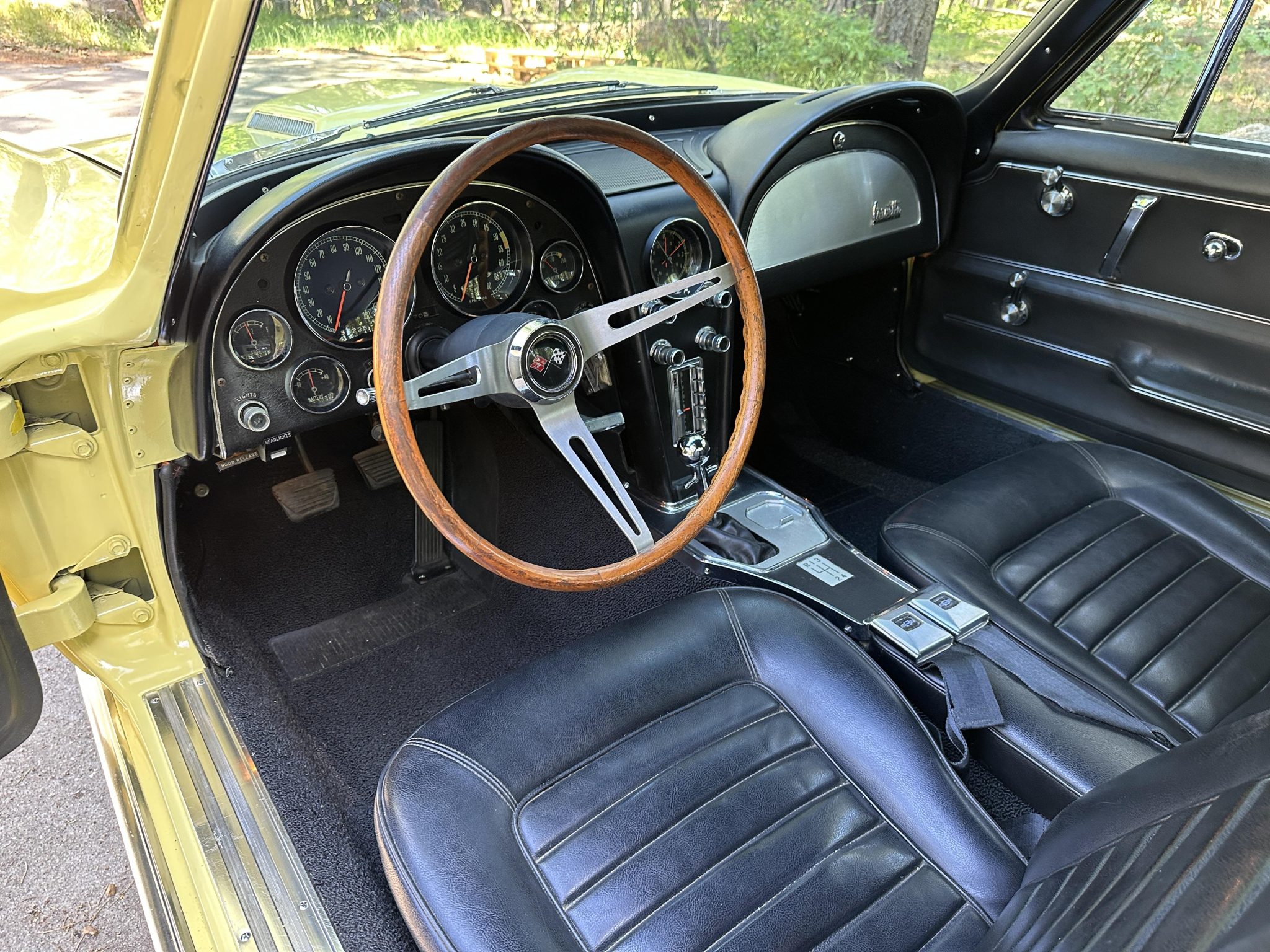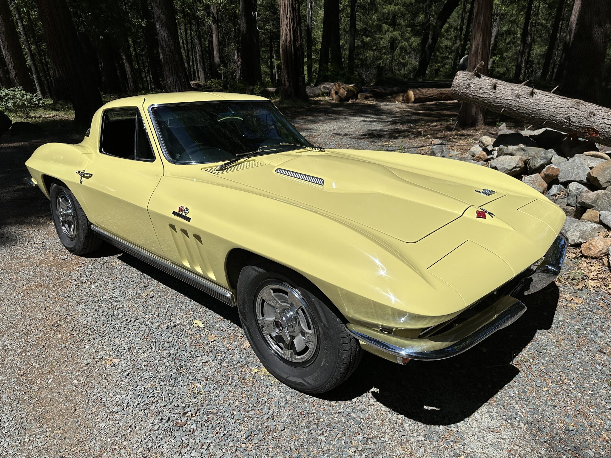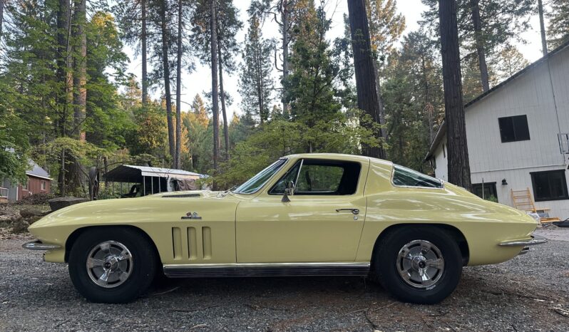This 1966 Chevrolet Corvette coupe is finished in Sunfire Yellow over black vinyl upholstery and is powered by a 427ci L36 V8 paired with a four-speed manual transmission. Features include 15″ steel wheels, four-wheel disc brakes, a Holley four-barrel carburetor, a cabin heater, an AM/FM radio, chrome bumpers, and retractable headlights.