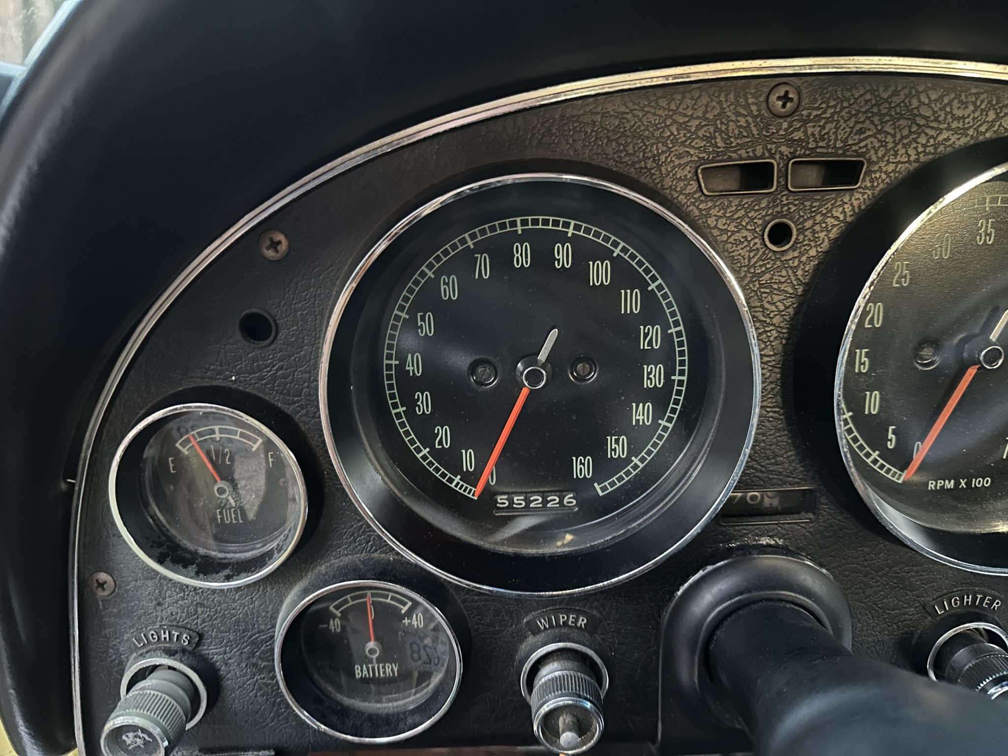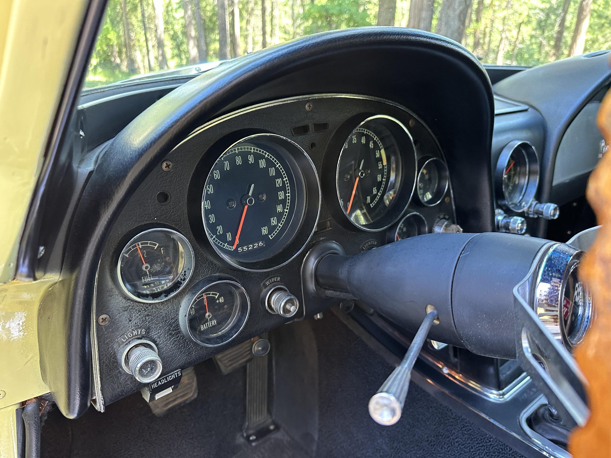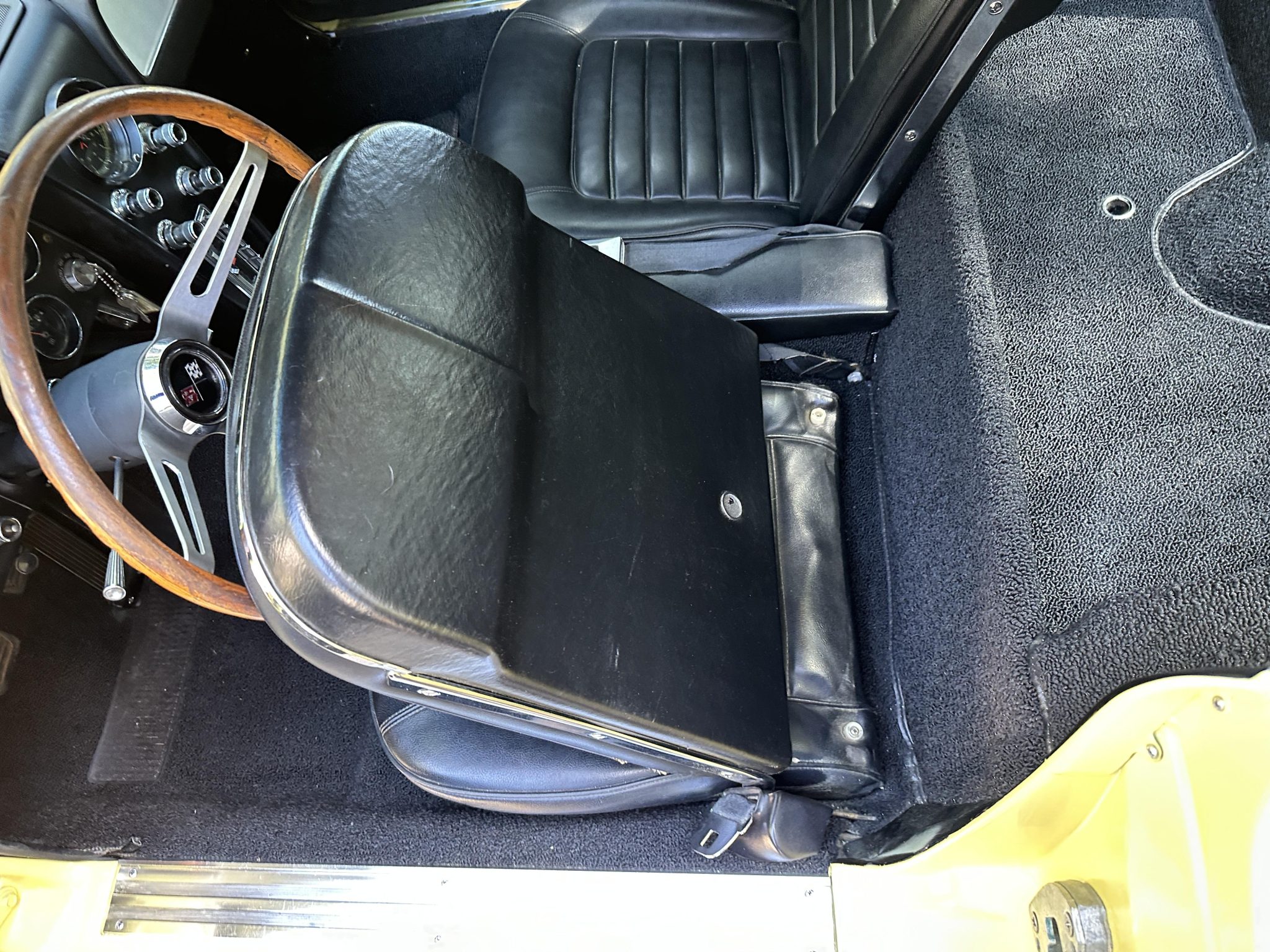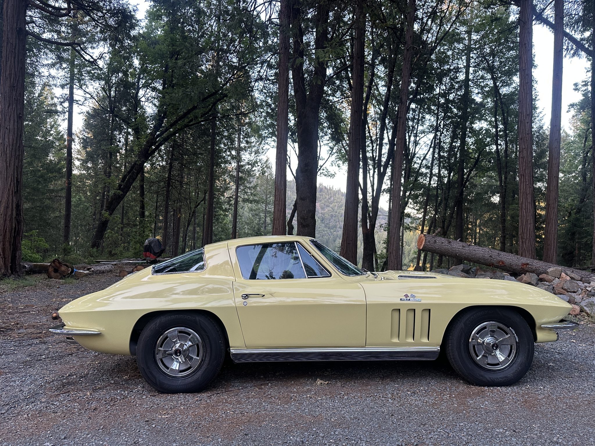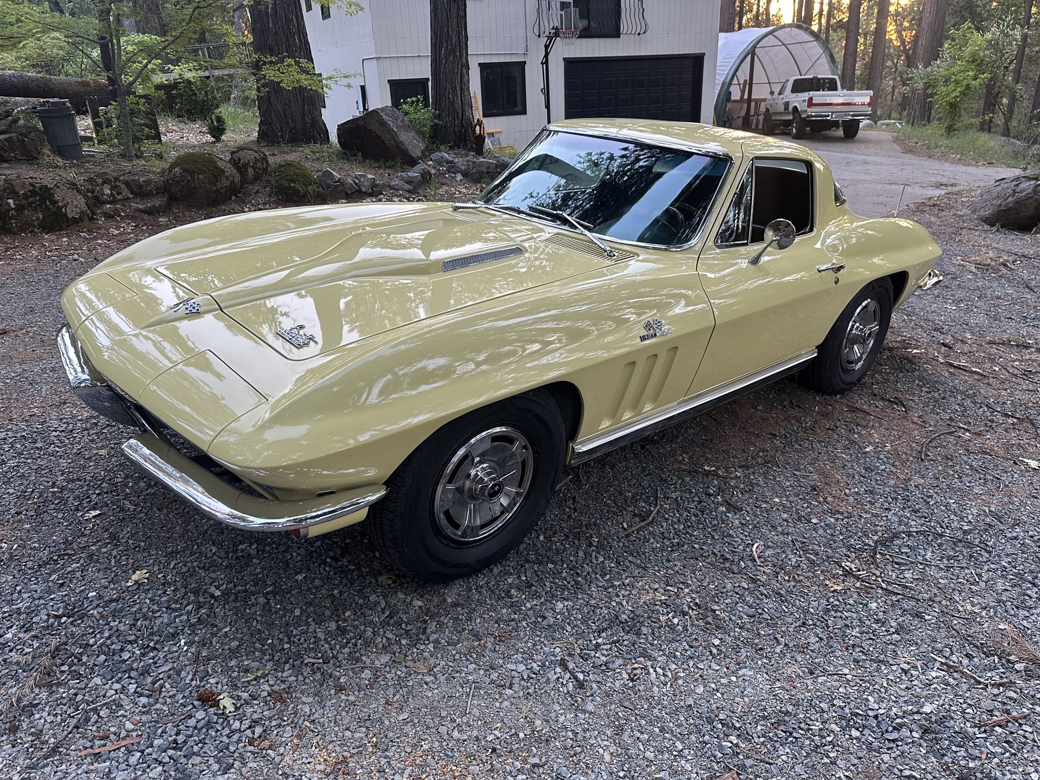 This 1966 Chevrolet Corvette coupe is finished in Sunfire Yellow over black vinyl upholstery and is powered by a 427ci L36 V8 paired with a four-speed manual transmission. Features include 15″ steel wheels, four-wheel disc brakes, a Holley four-barrel carburetor, a cabin heater, an AM/FM radio, chrome bumpers, and retractable headlights.