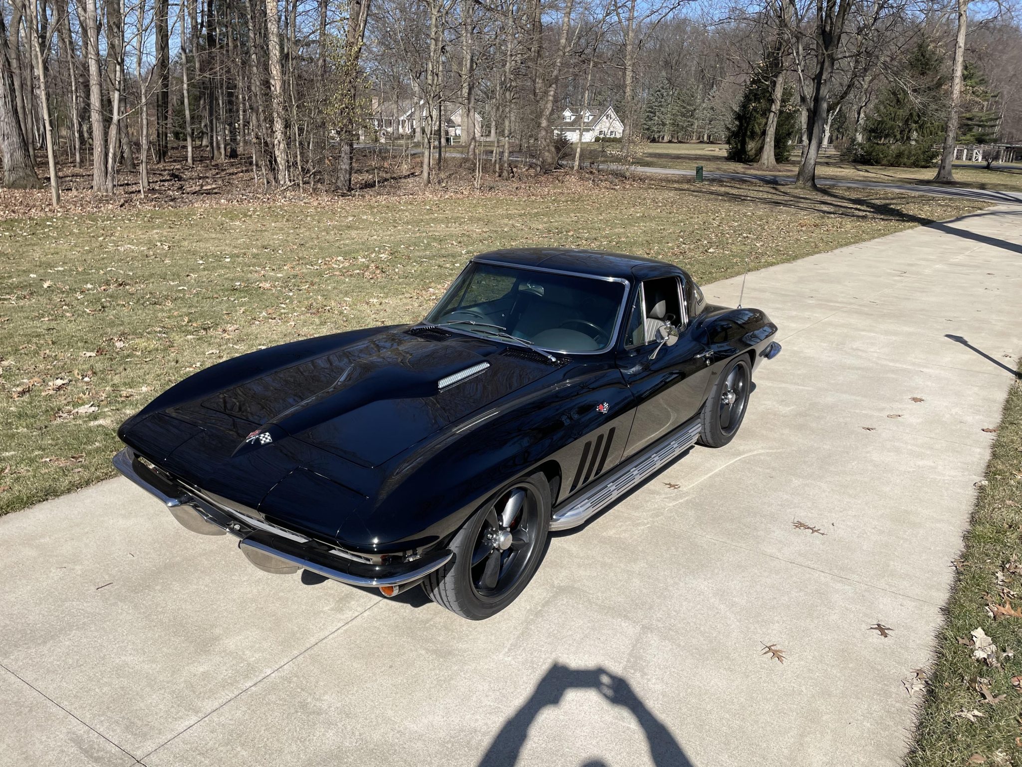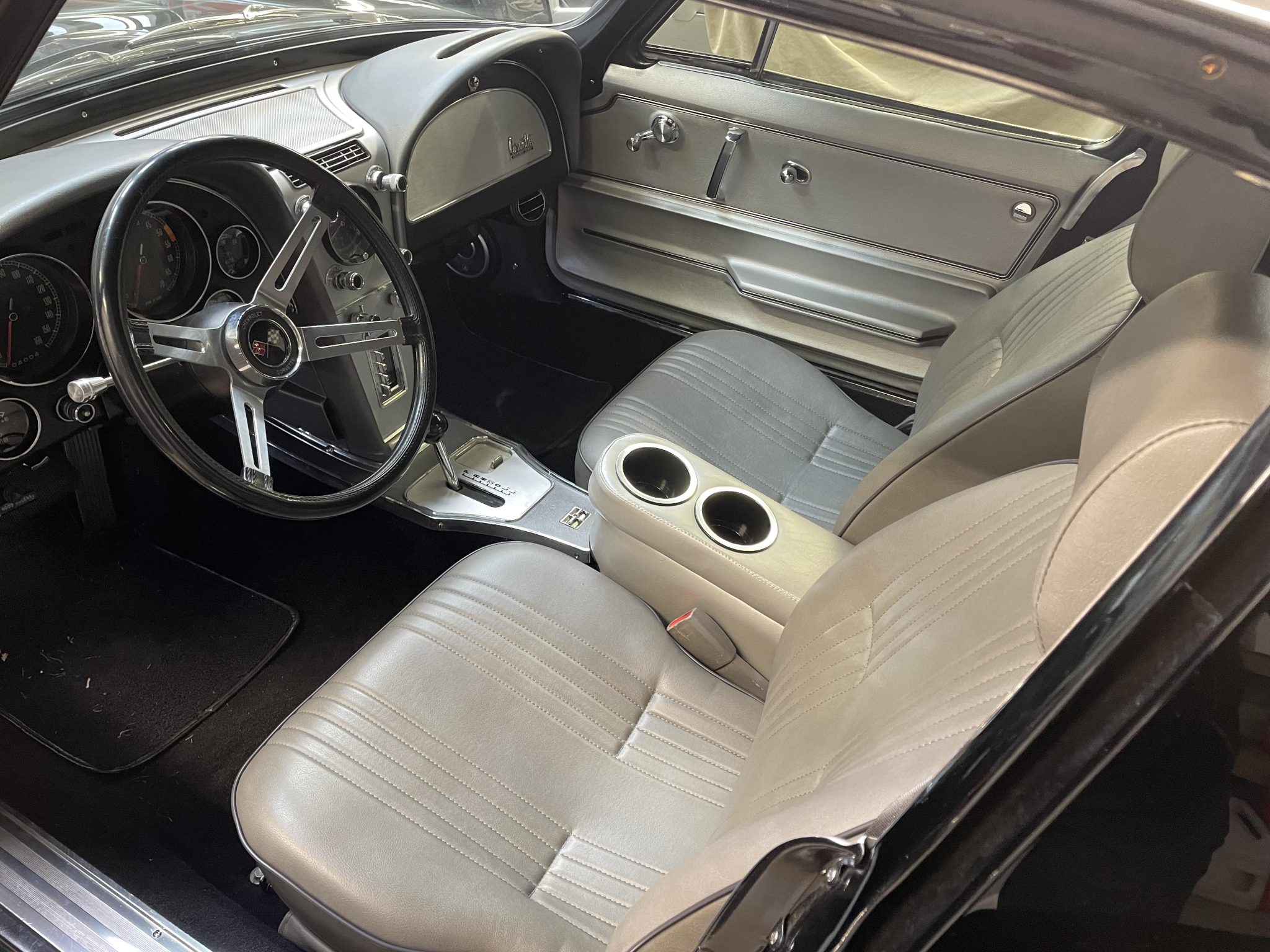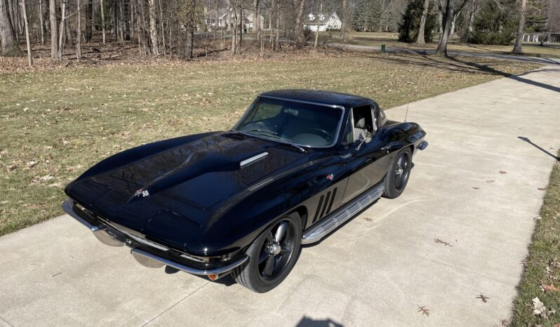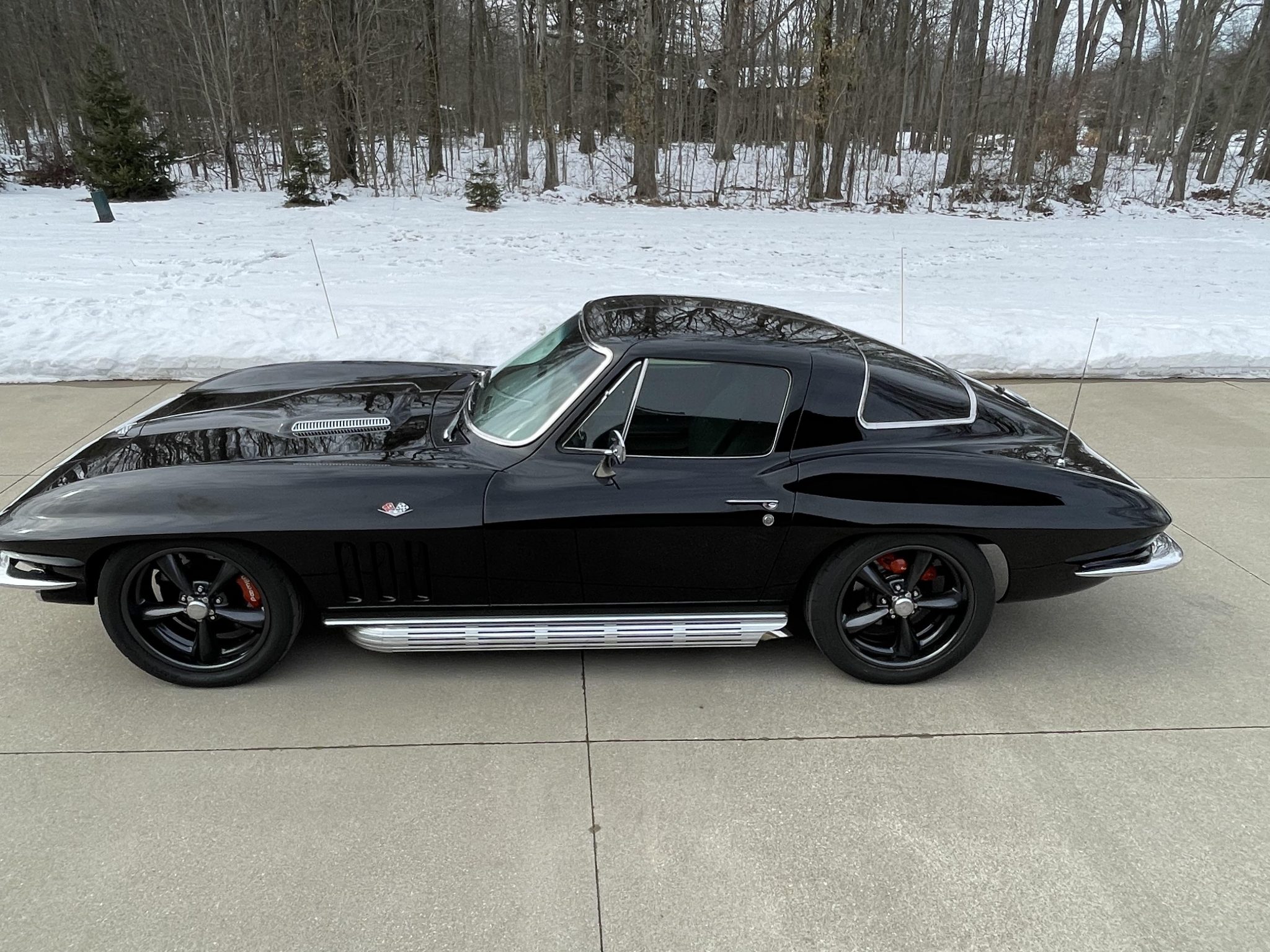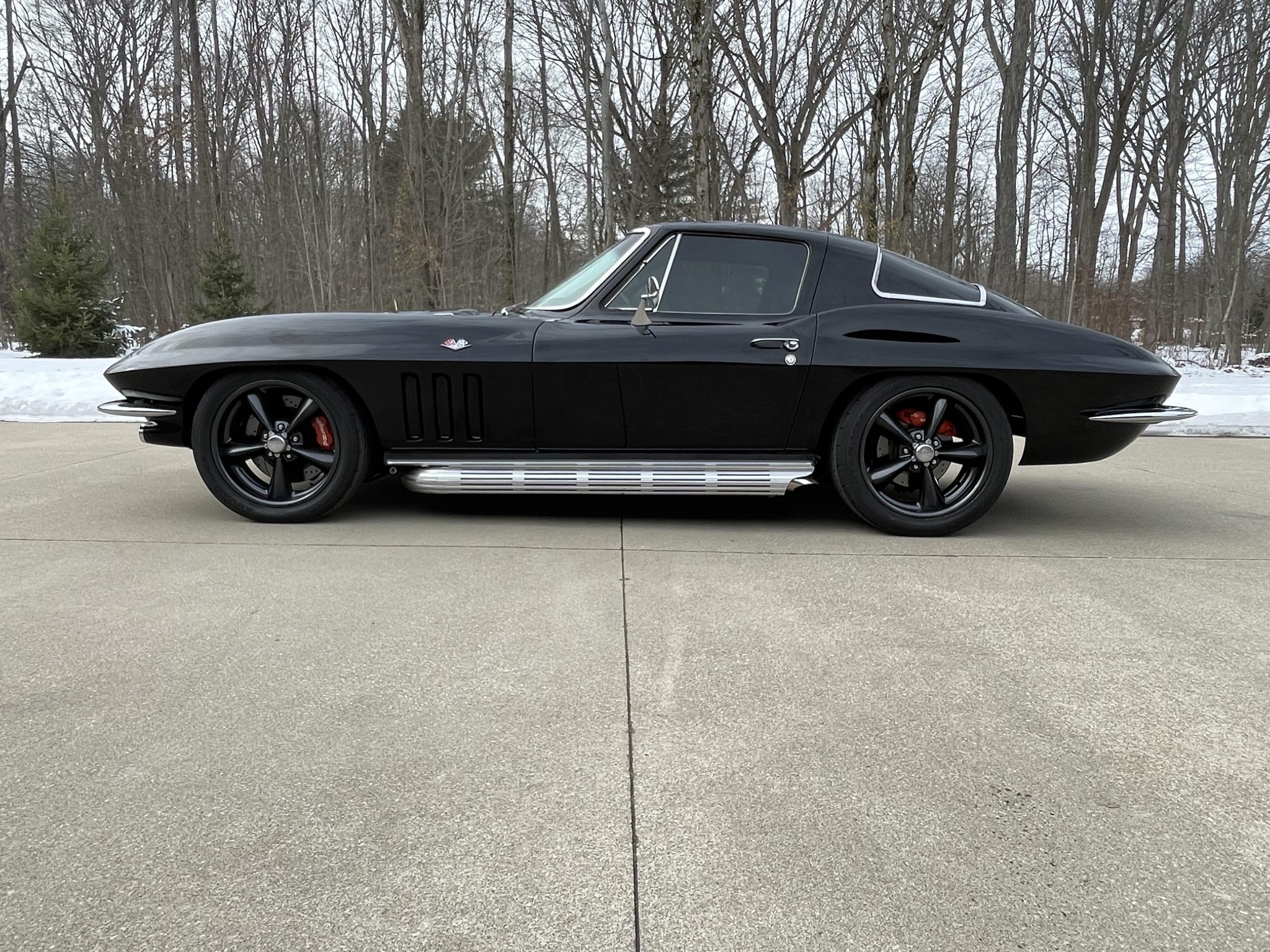 This 1966 Chevrolet Corvette coupe was modified with a fuel-injected 383ci stroker V8, a four-speed automatic transmission with overdrive, a Ridetech Level 2 coilover suspension, and Wilwood four-wheel disc brakes. The interior was fitted with replacement seats, door panels, and carpeting, and sound-deadening insulation, a center console with cup holders, and a Retrosound Bluetooth-capable stereo were added. The body was refinished in black and has a big block-style hood, sequential three-light rear turn signals, and tinted windows. Additional equipment includes a Positraction differential, 18″ black-finished wheels, air conditioning, power windows, and retractable headlights.