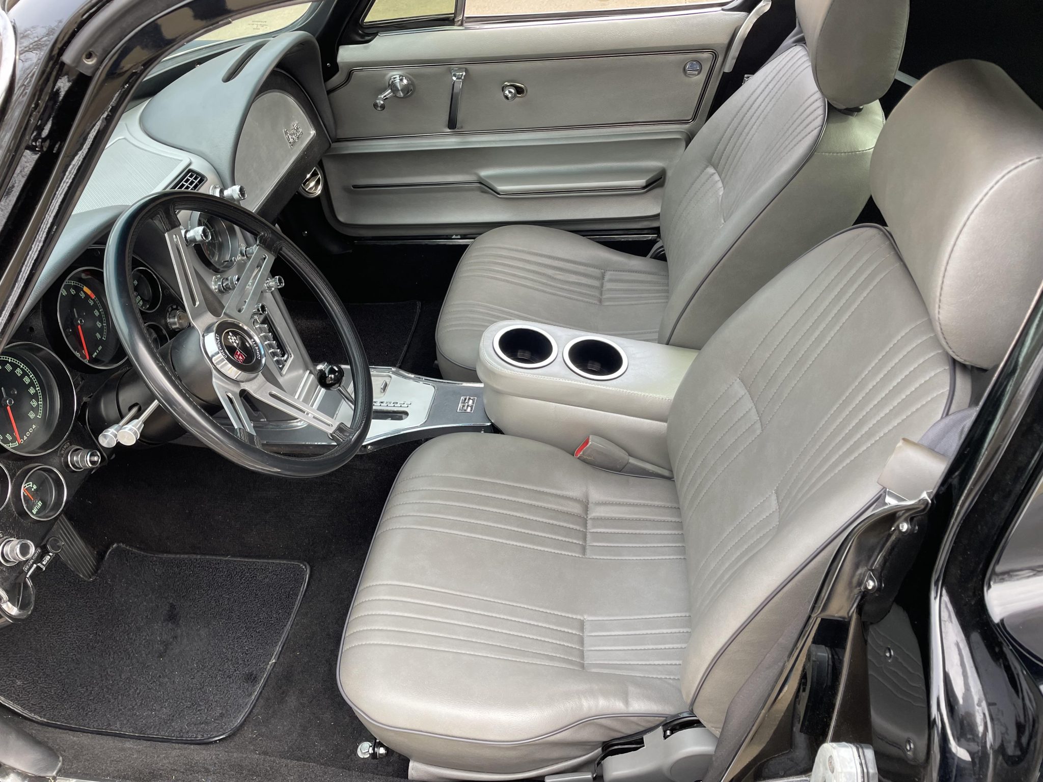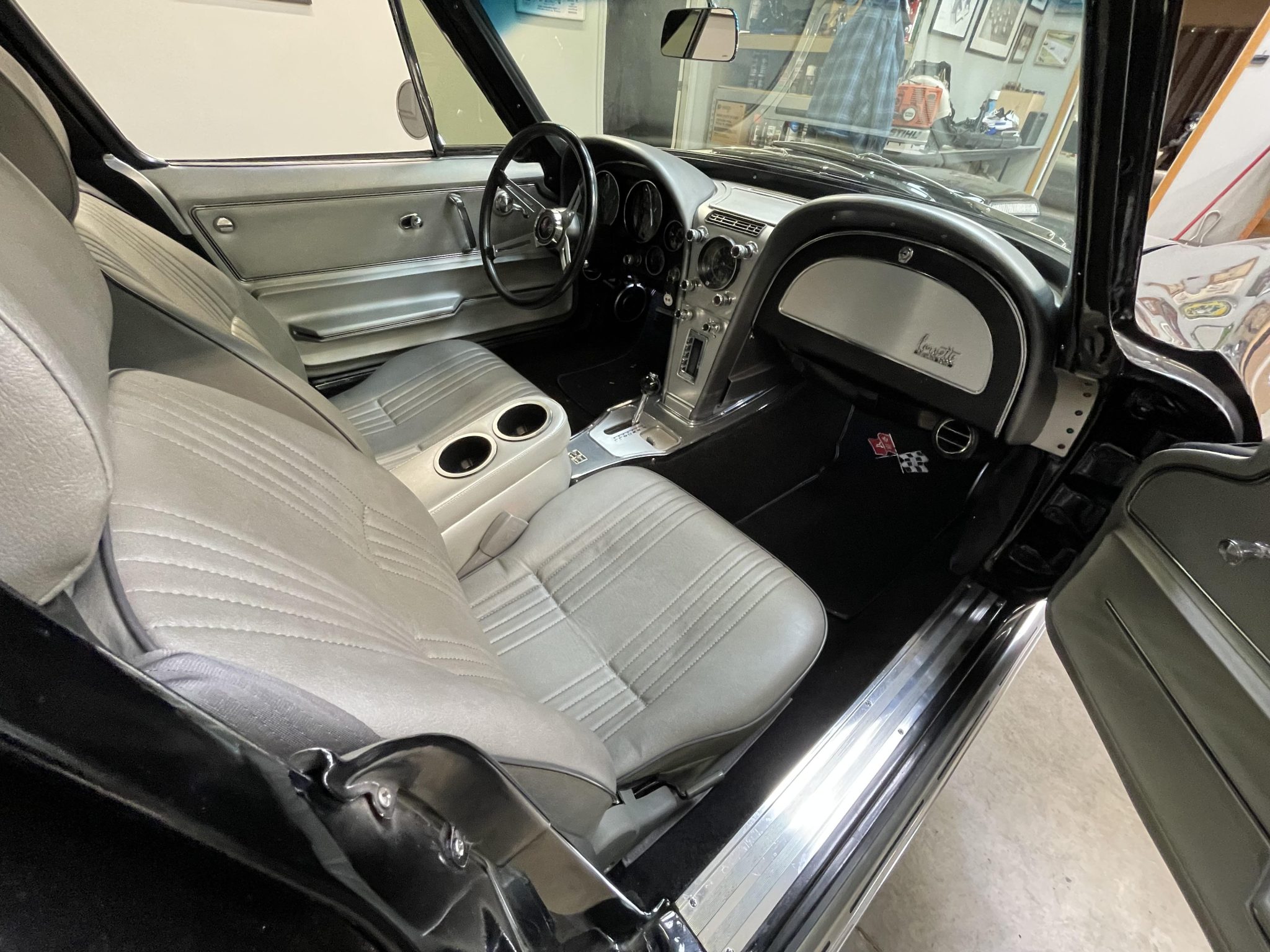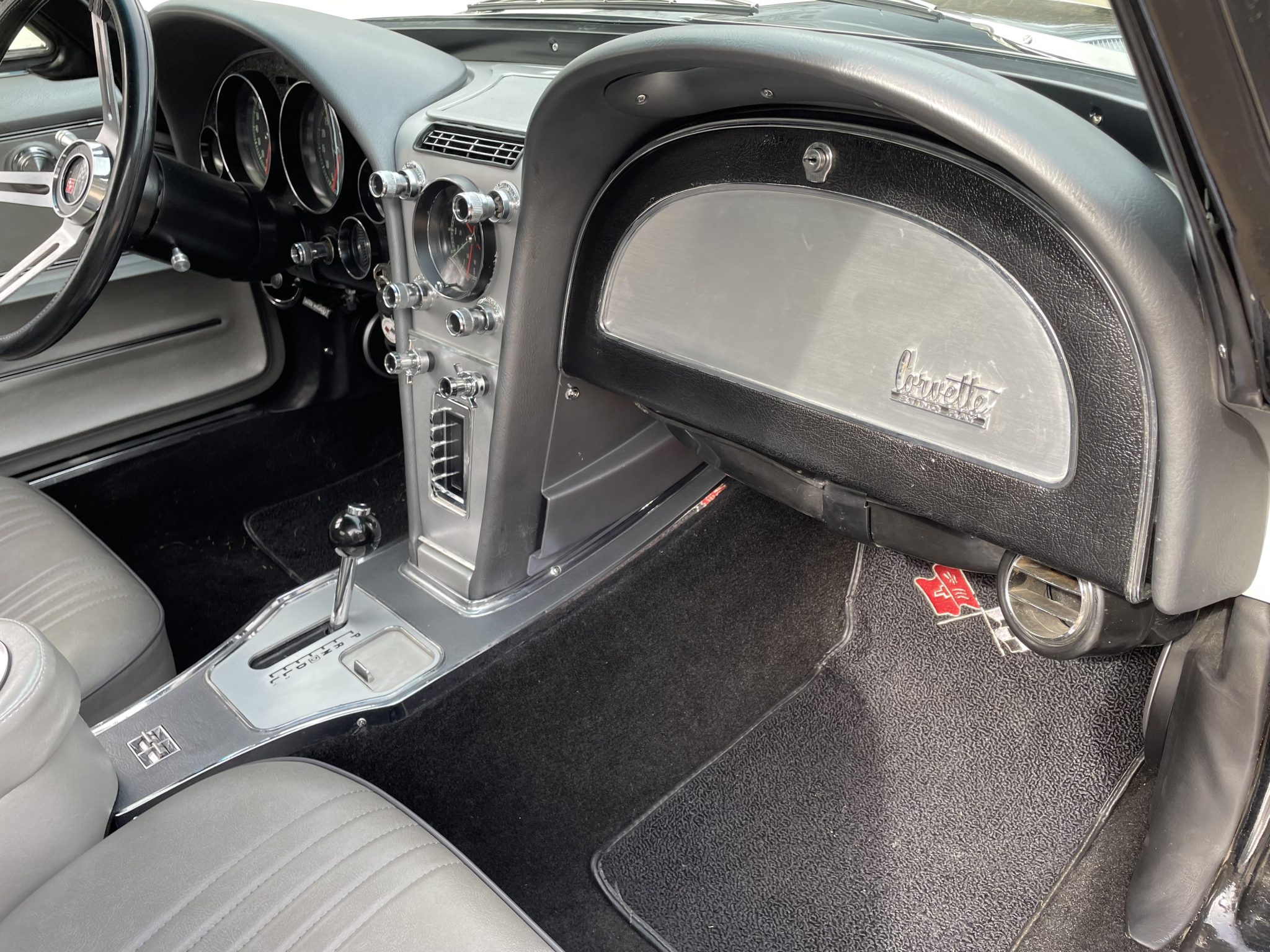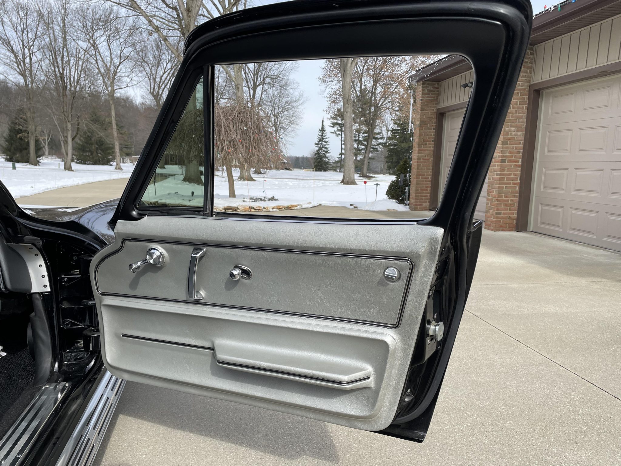 This 1966 Chevrolet Corvette coupe was modified with a fuel-injected 383ci stroker V8, a four-speed automatic transmission with overdrive, a Ridetech Level 2 coilover suspension, and Wilwood four-wheel disc brakes. The interior was fitted with replacement seats, door panels, and carpeting, and sound-deadening insulation, a center console with cup holders, and a Retrosound Bluetooth-capable stereo were added. The body was refinished in black and has a big block-style hood, sequential three-light rear turn signals, and tinted windows. Additional equipment includes a Positraction differential, 18″ black-finished wheels, air conditioning, power windows, and retractable headlights.
