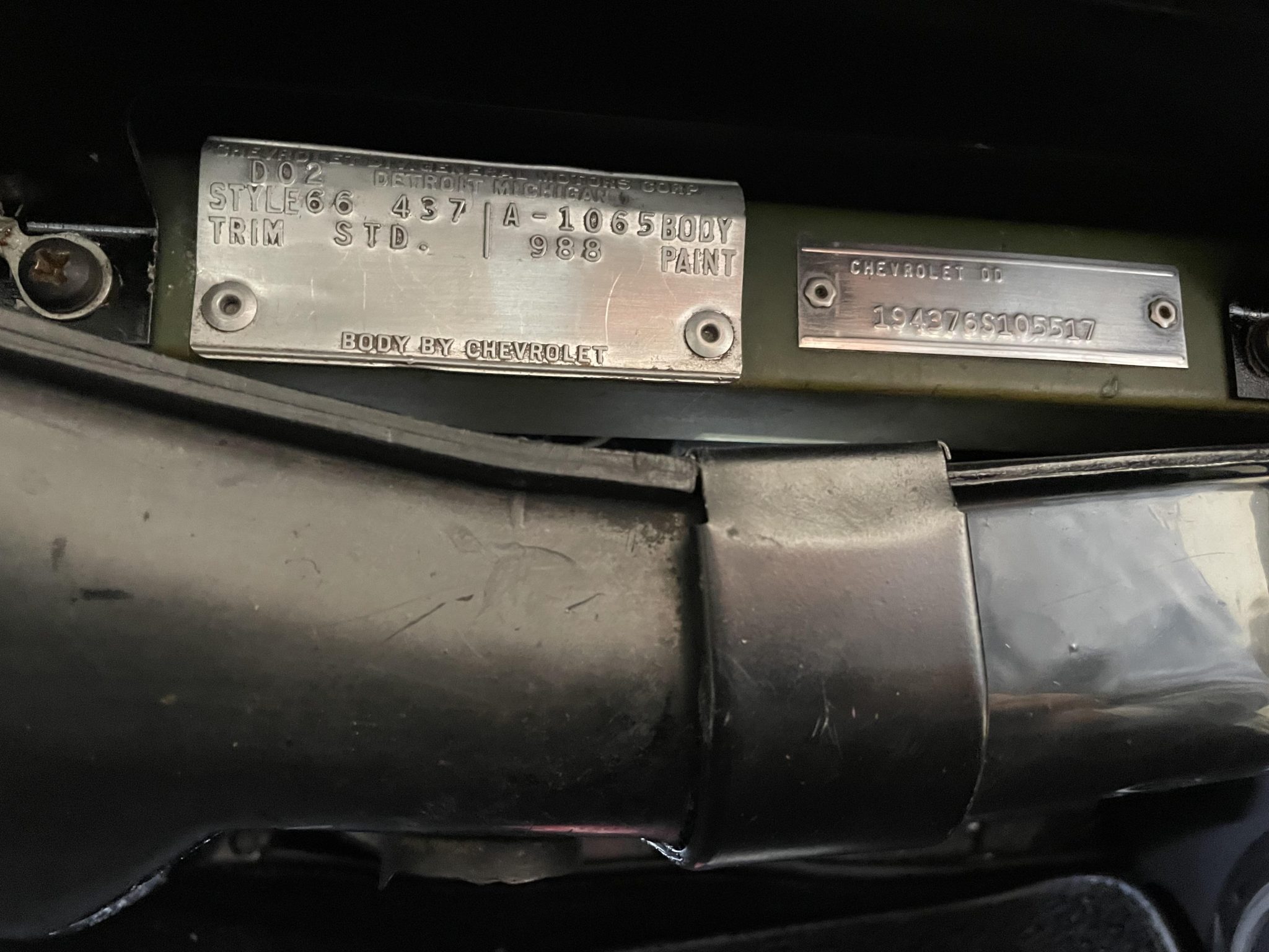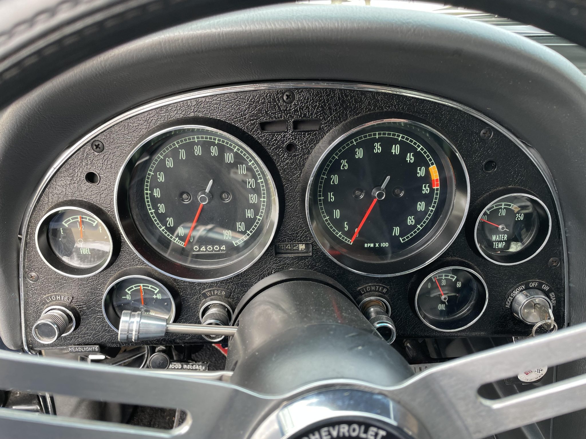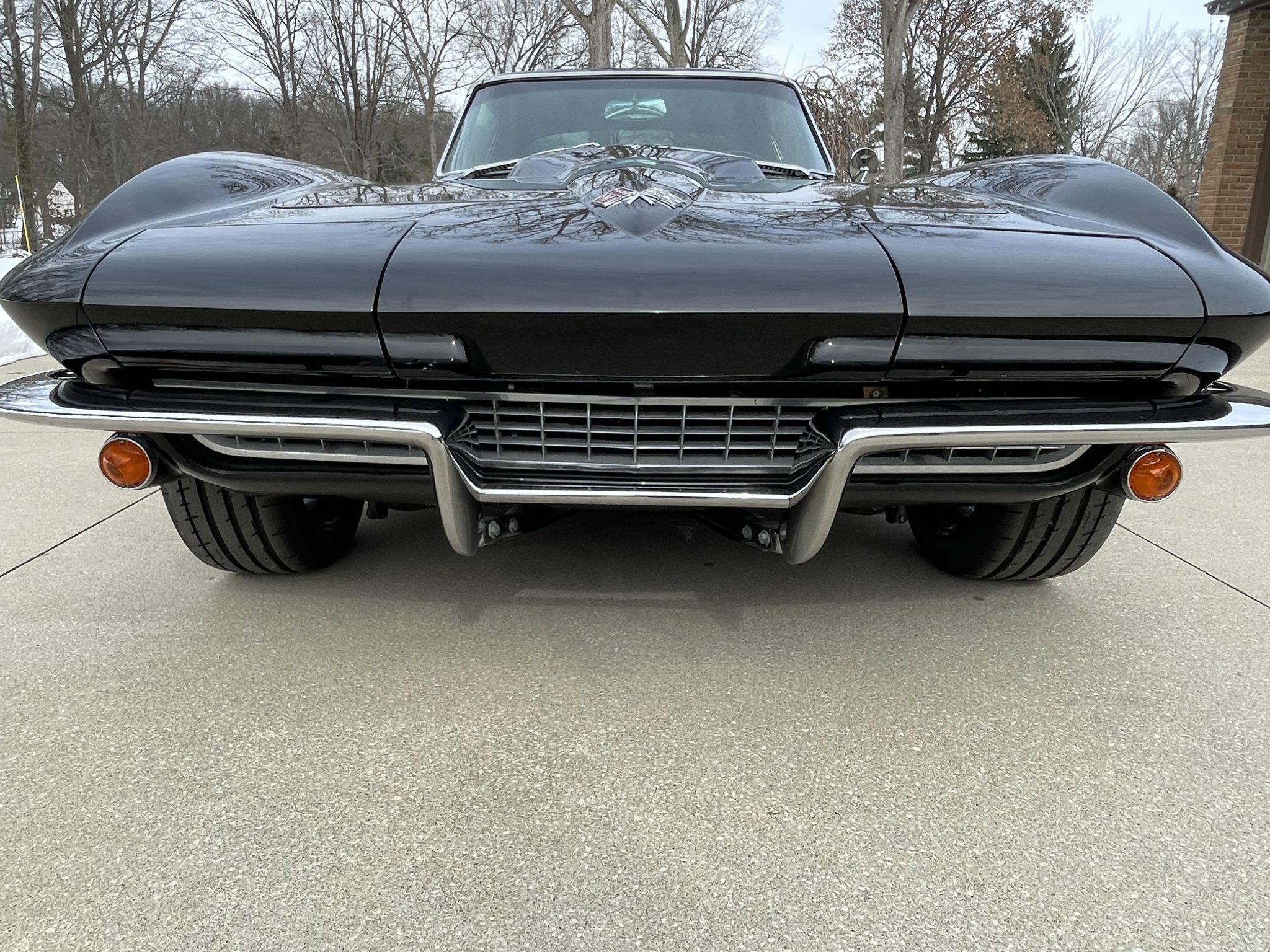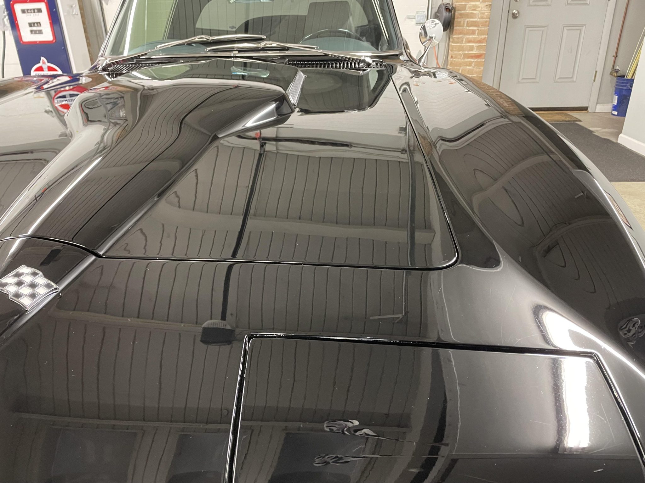 This 1966 Chevrolet Corvette coupe was modified with a fuel-injected 383ci stroker V8, a four-speed automatic transmission with overdrive, a Ridetech Level 2 coilover suspension, and Wilwood four-wheel disc brakes. The interior was fitted with replacement seats, door panels, and carpeting, and sound-deadening insulation, a center console with cup holders, and a Retrosound Bluetooth-capable stereo were added. The body was refinished in black and has a big block-style hood, sequential three-light rear turn signals, and tinted windows. Additional equipment includes a Positraction differential, 18″ black-finished wheels, air conditioning, power windows, and retractable headlights.