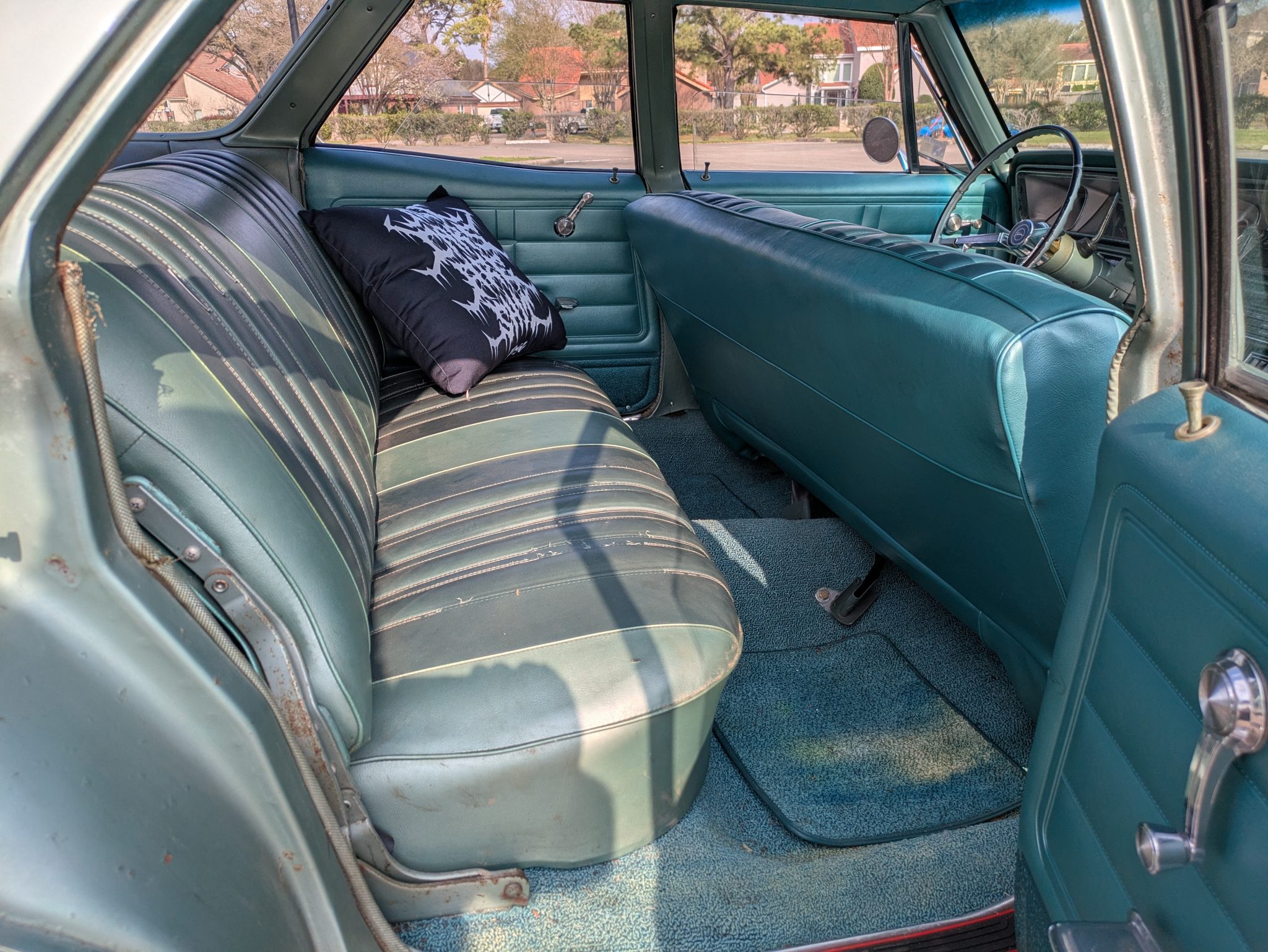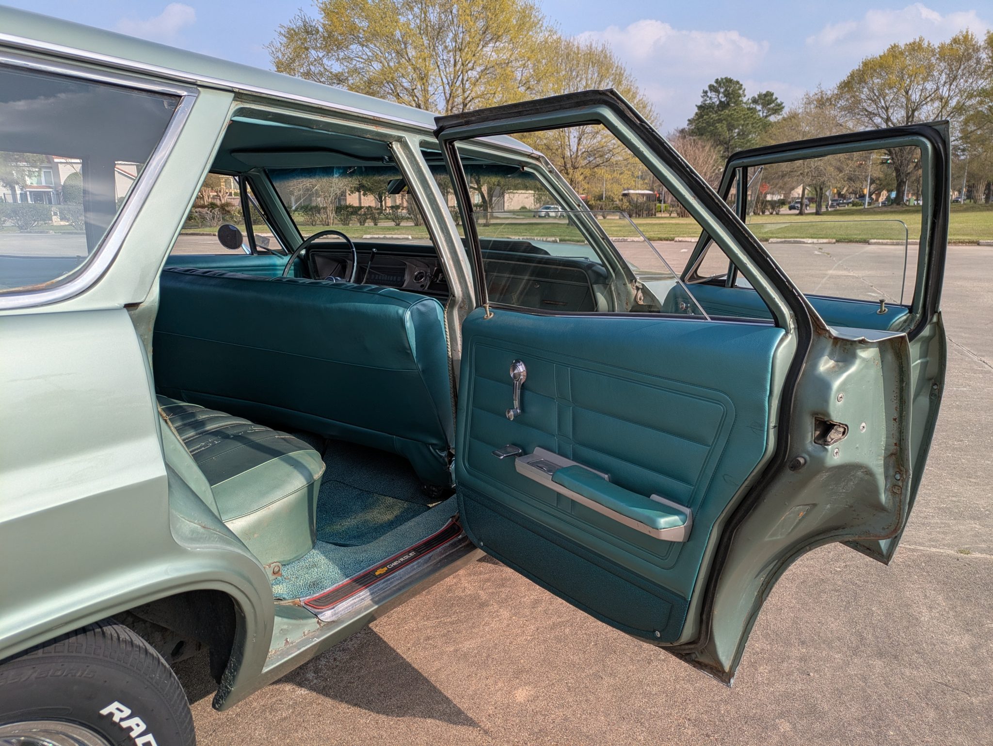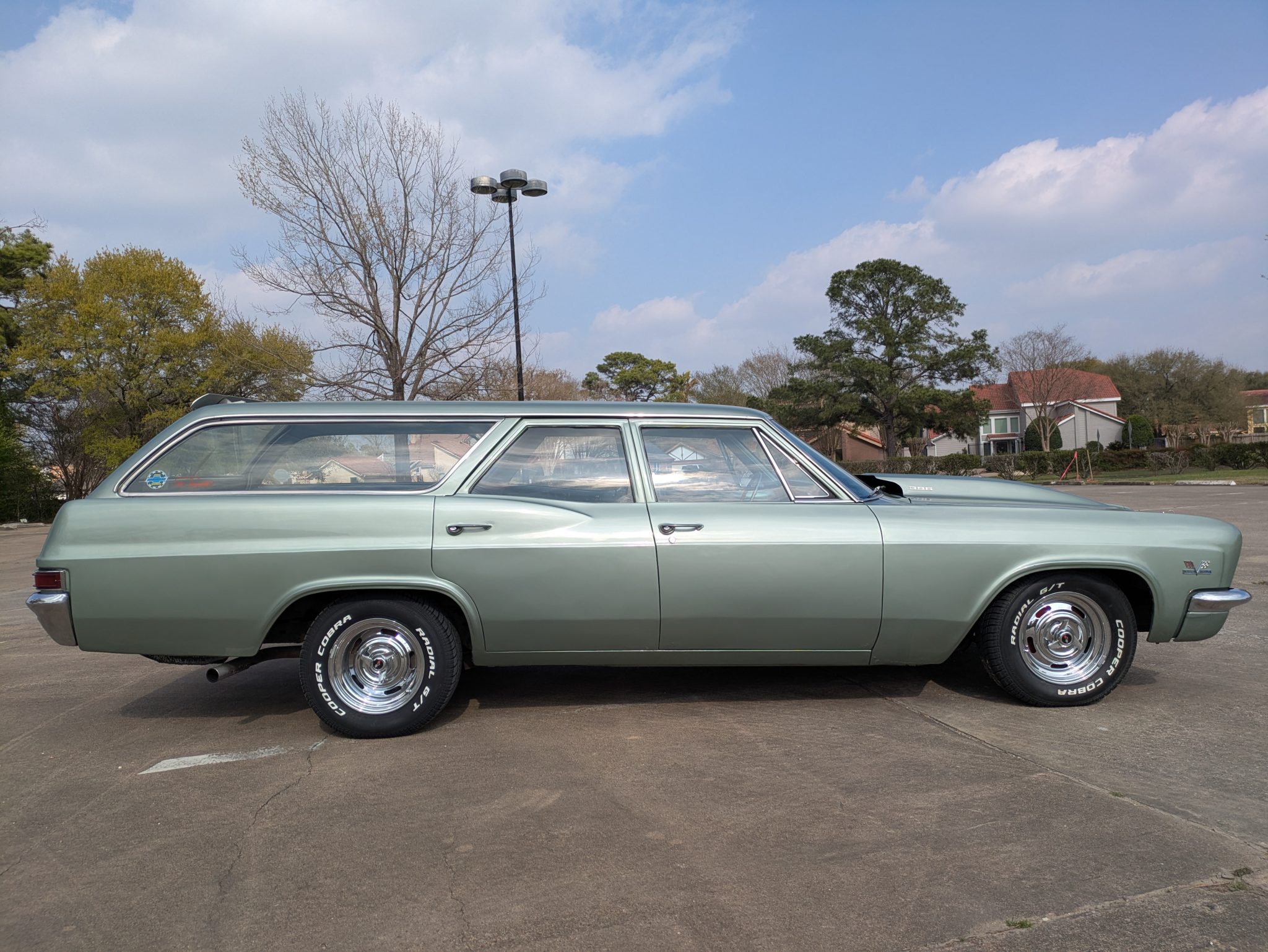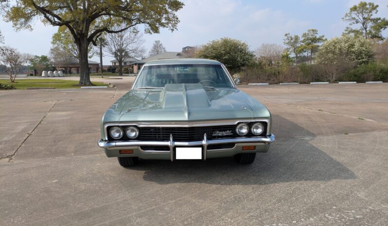 refurbishment work in 2019 included a rebuild of the 396ci V8, and it is equipped with electronic fuel injection, an Edelbrock camshaft and Comp Cams roller rockers, long-tube exhaust headers, and an aluminum radiator with dual electric fans. The front seat covers, the door panels, and the headliner were also replaced, and Vintage Air air conditioning was installed. Additional features include 15″ Rally-style wheels, power-assisted drum brakes, power-assisted steering, and a domed hood with hood pins.