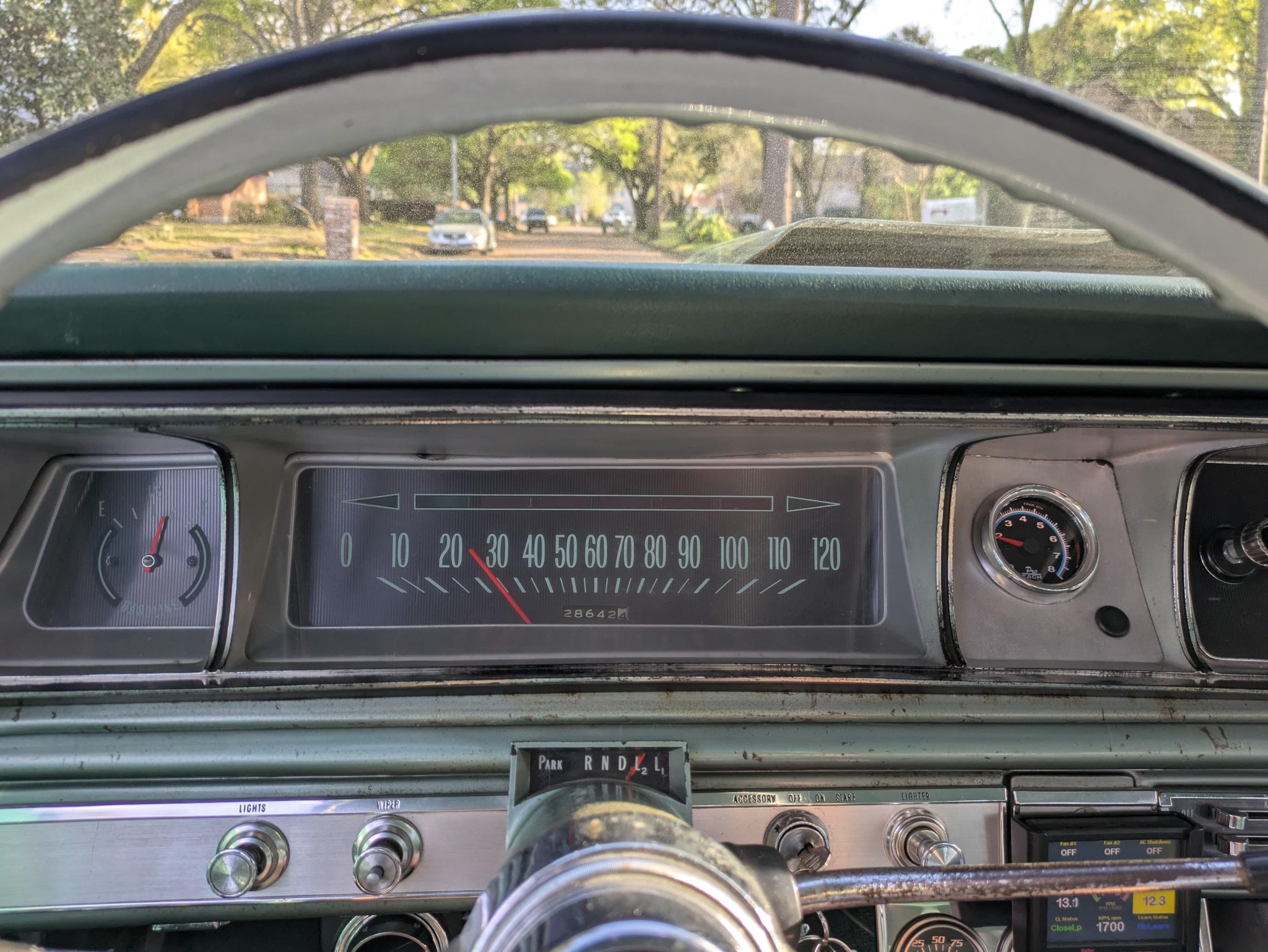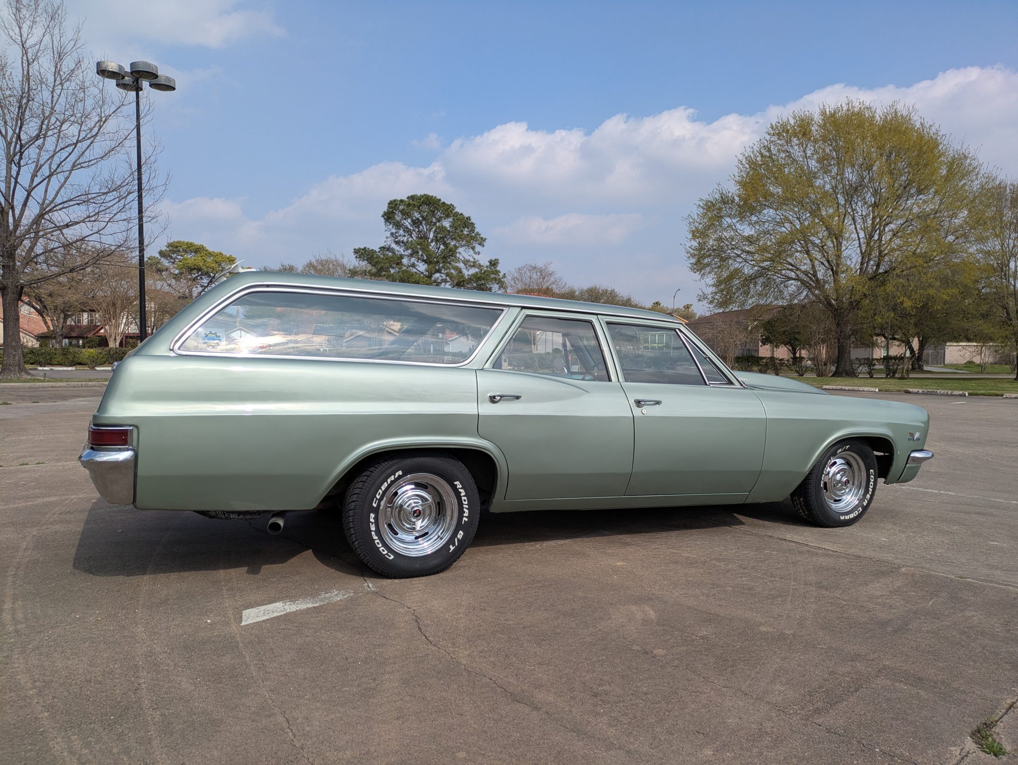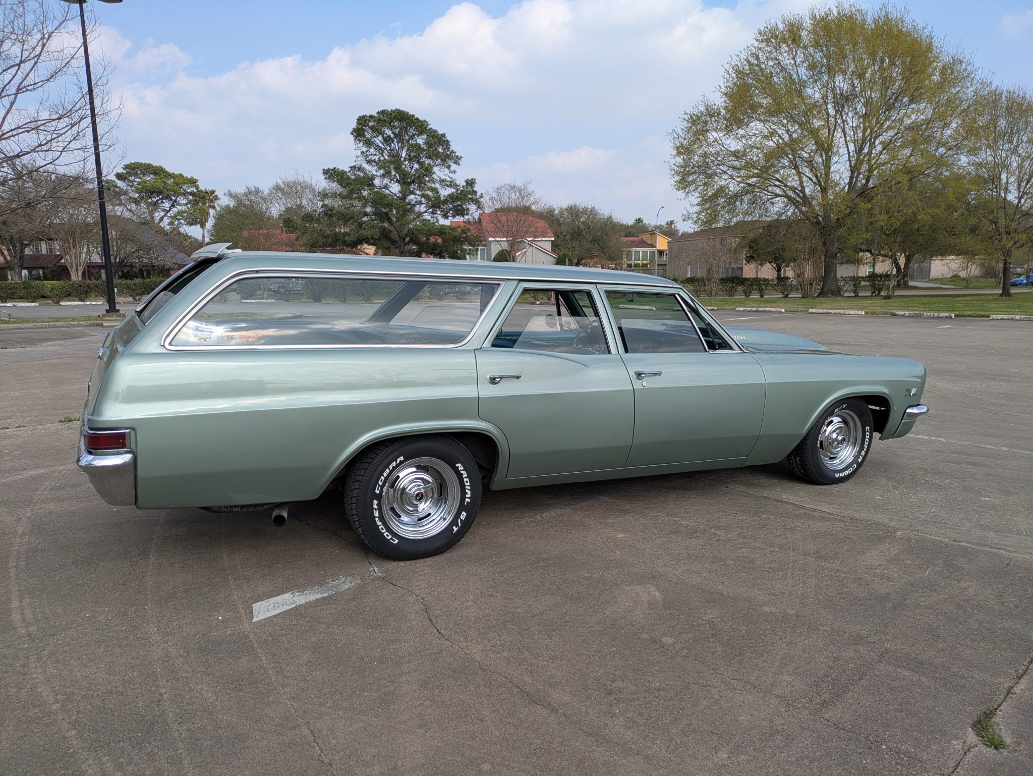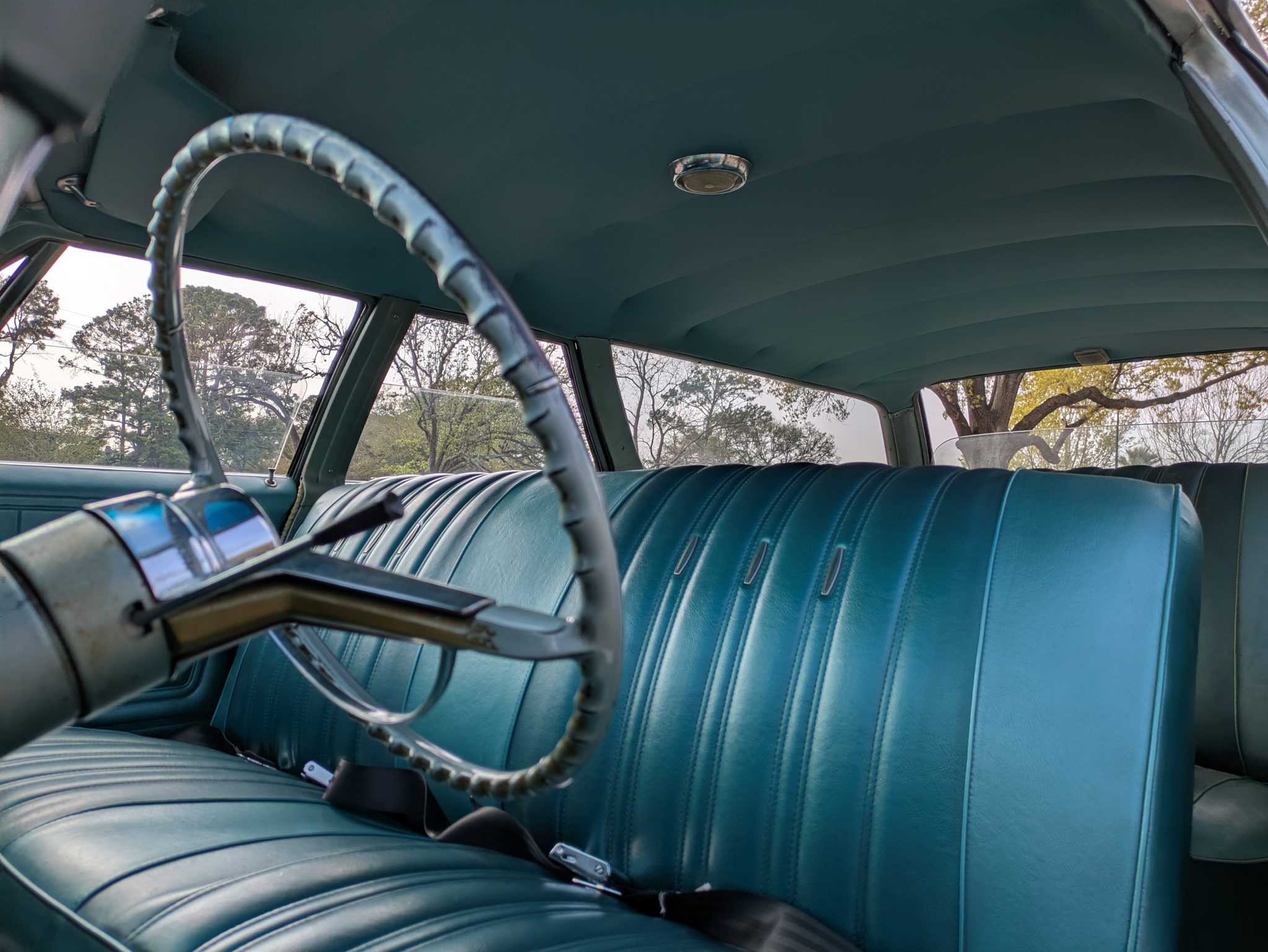refurbishment work in 2019 included a rebuild of the 396ci V8, and it is equipped with electronic fuel injection, an Edelbrock camshaft and Comp Cams roller rockers, long-tube exhaust headers, and an aluminum radiator with dual electric fans. The front seat covers, the door panels, and the headliner were also replaced, and Vintage Air air conditioning was installed. Additional features include 15″ Rally-style wheels, power-assisted drum brakes, power-assisted steering, and a domed hood with hood pins.