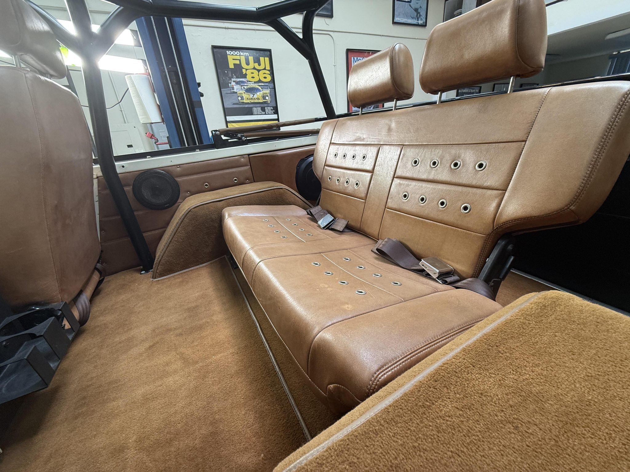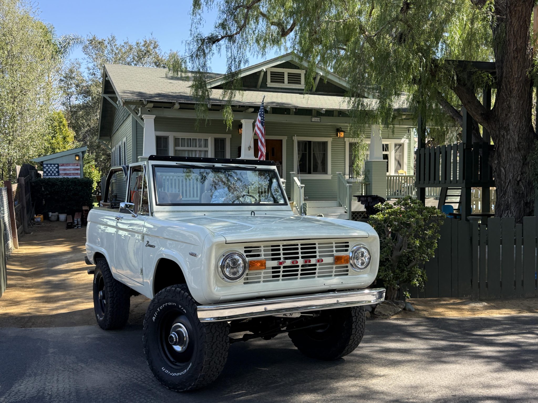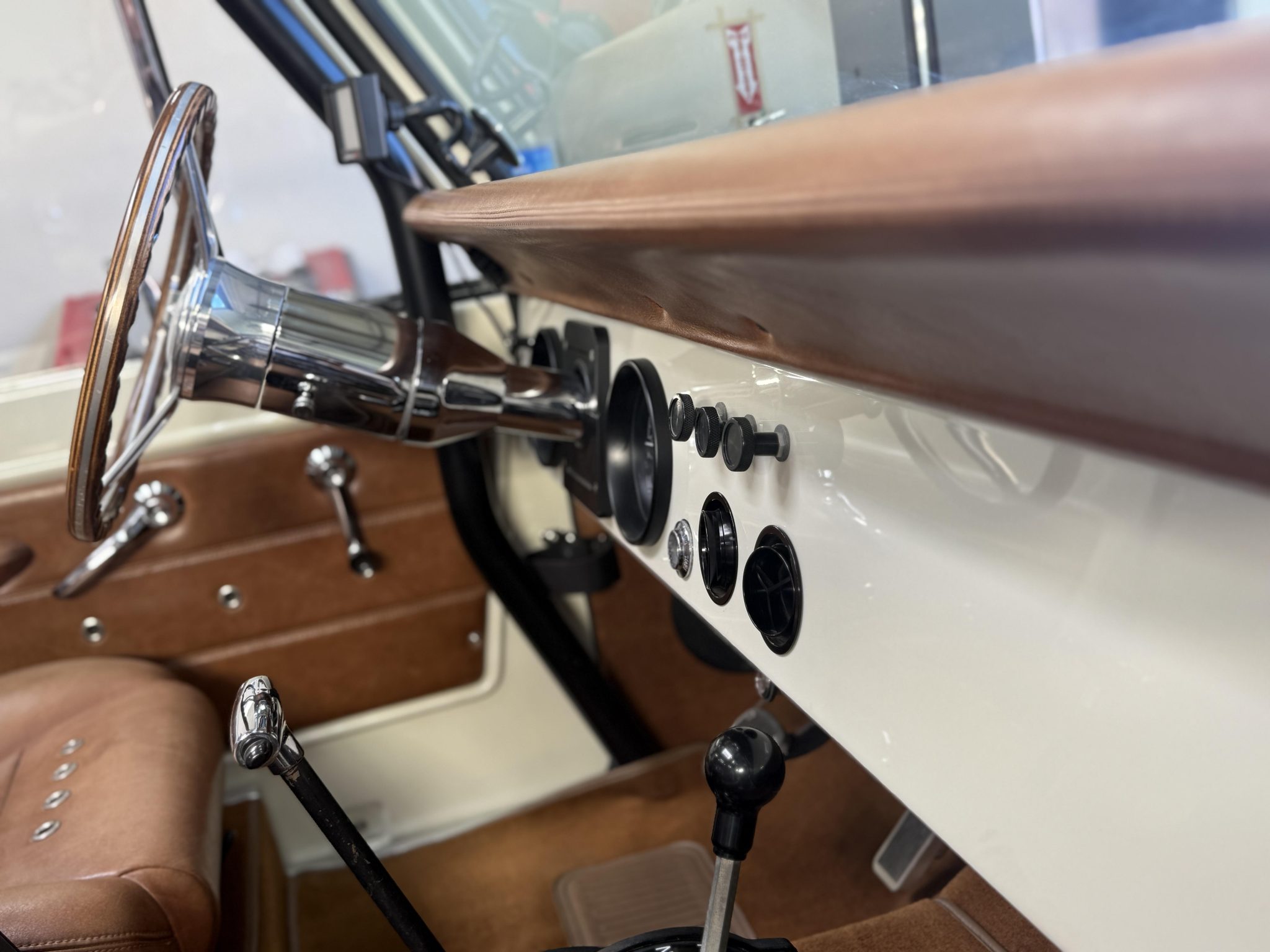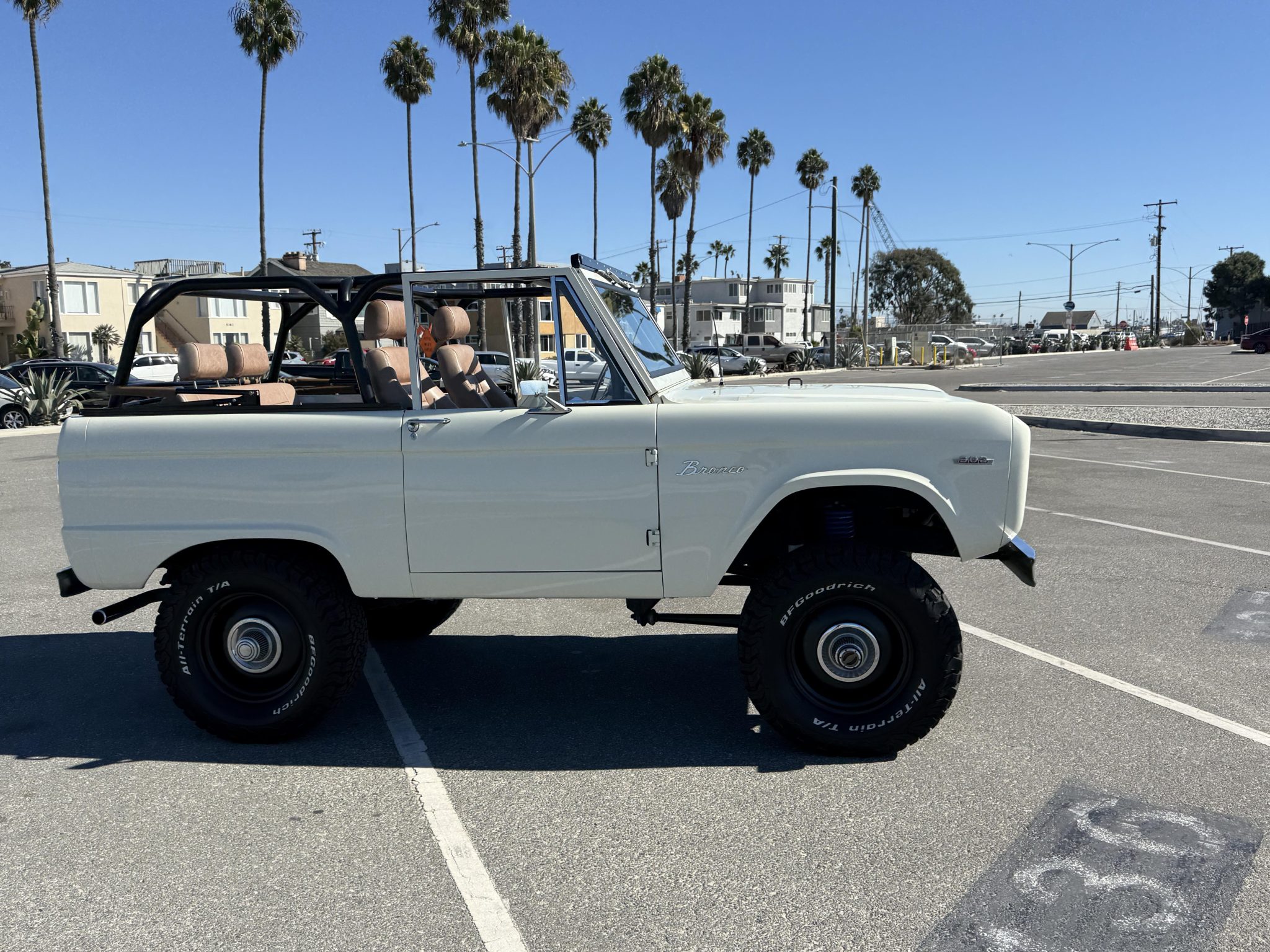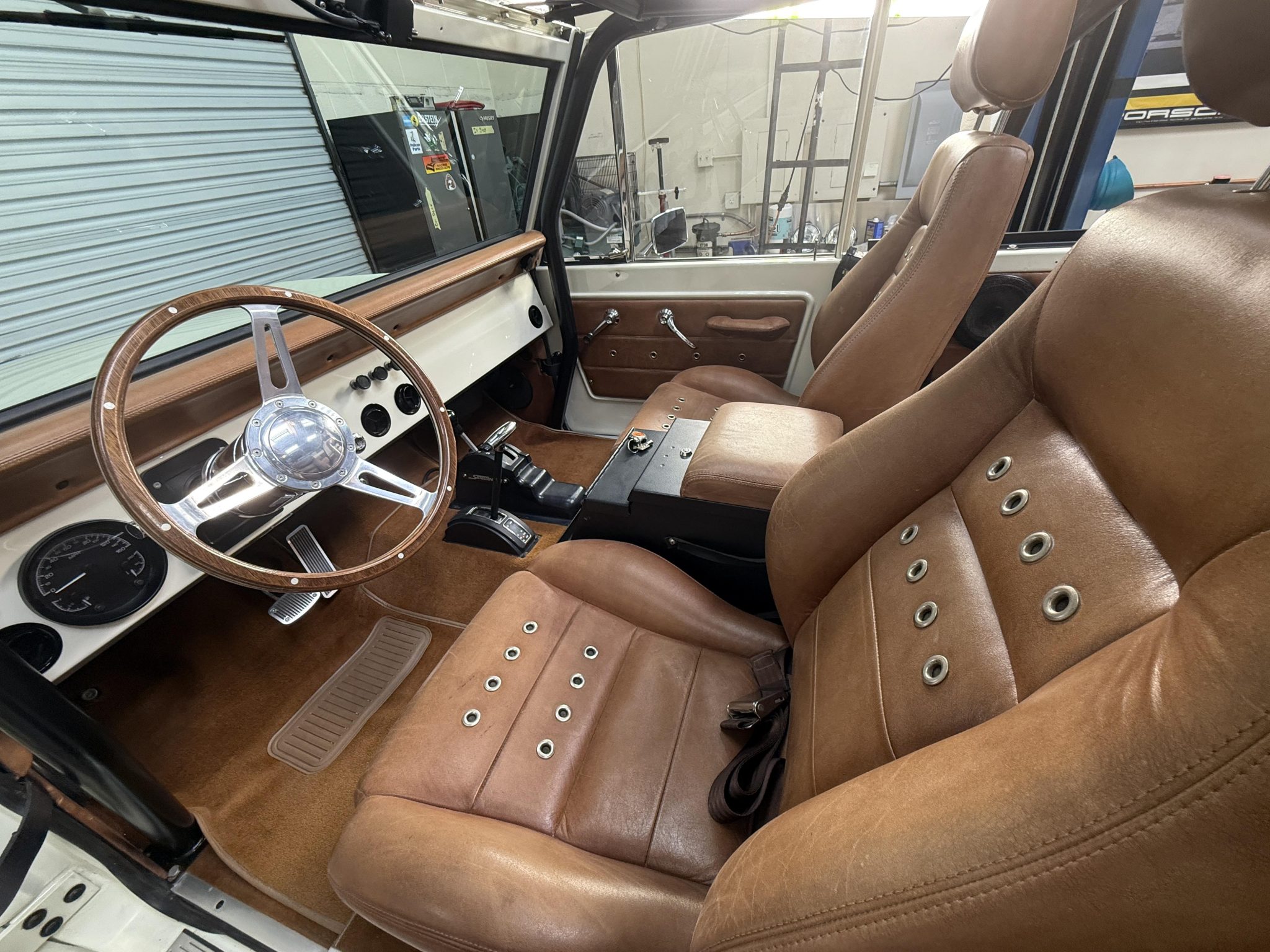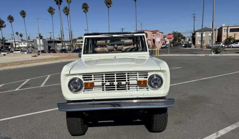 has involved rebuilding the Monster Transmissions three-speed automatic transmission and adding a Derale transmission cooler, rust repair and a repaint, installing a custom dashboard with Dakota Digital instrumentation, and fitting the 302ci V8 with ceramic-coated headers, a Spal fan, and a dual-core radiator. Additional components include a Dana transfer case and axles, 18×9” XD Addict wheels, a Bspōk Builds roll cage, LED exterior lights, and lifted suspension. The interior is outfitted with front bucket seats and a rear bench trimmed in brown leather along with a locking center console, air conditioning, and a Kenwood head unit linked to JL Audio speakers.