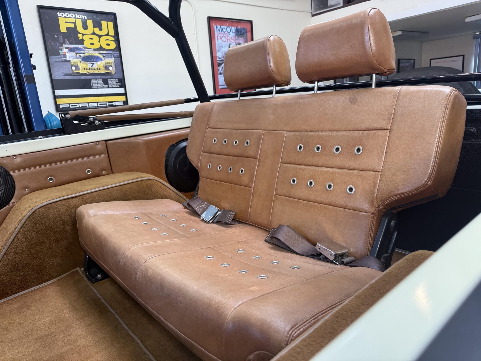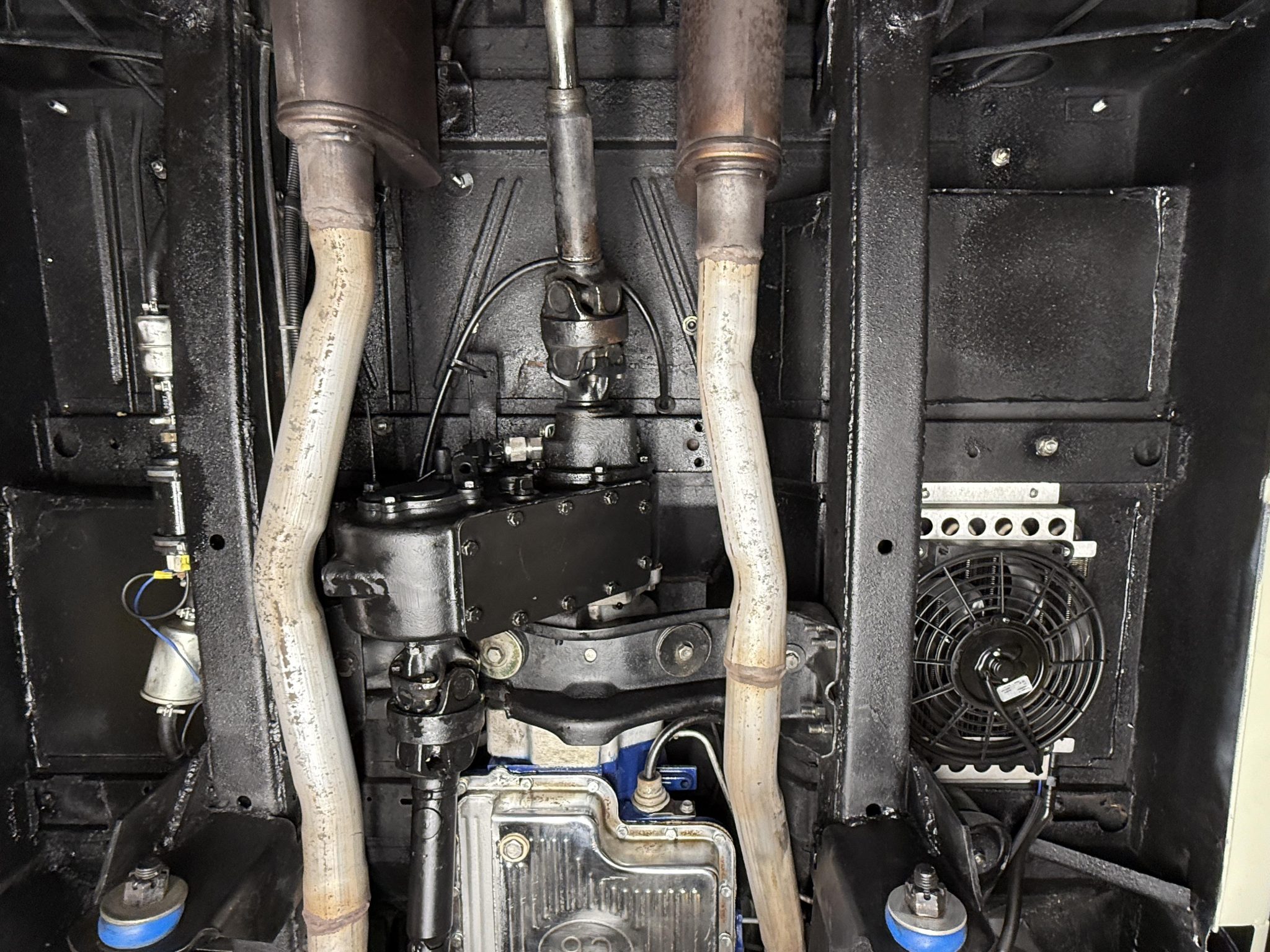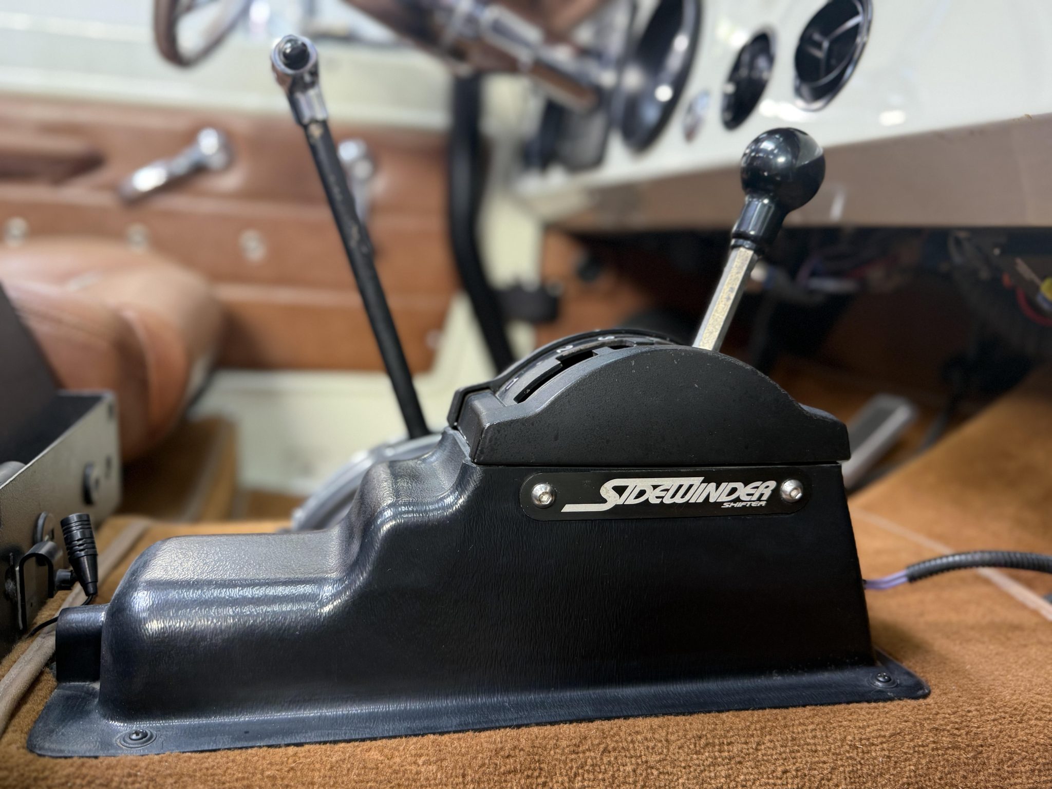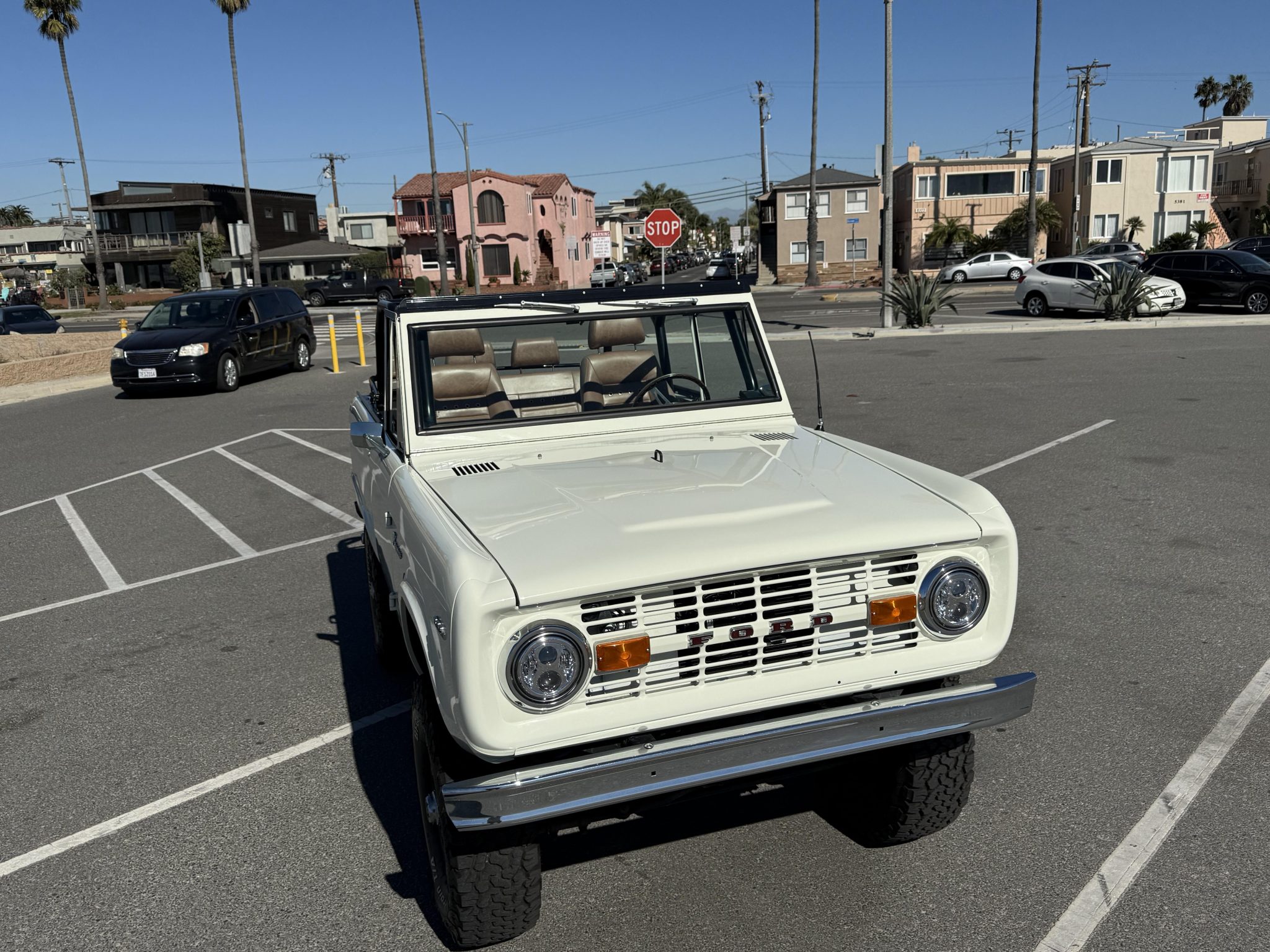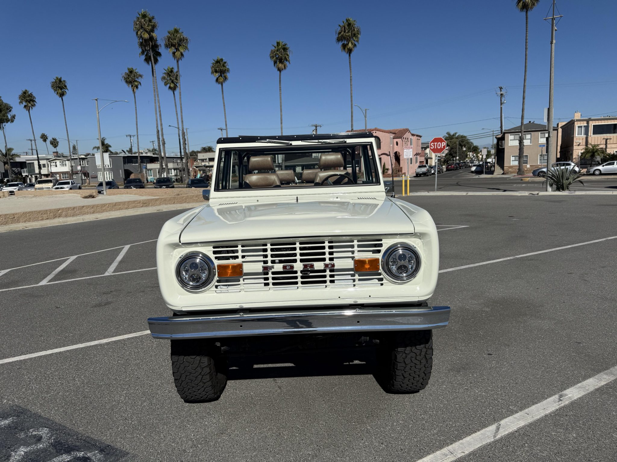 has involved rebuilding the Monster Transmissions three-speed automatic transmission and adding a Derale transmission cooler, rust repair and a repaint, installing a custom dashboard with Dakota Digital instrumentation, and fitting the 302ci V8 with ceramic-coated headers, a Spal fan, and a dual-core radiator. Additional components include a Dana transfer case and axles, 18×9” XD Addict wheels, a Bspōk Builds roll cage, LED exterior lights, and lifted suspension. The interior is outfitted with front bucket seats and a rear bench trimmed in brown leather along with a locking center console, air conditioning, and a Kenwood head unit linked to JL Audio speakers.