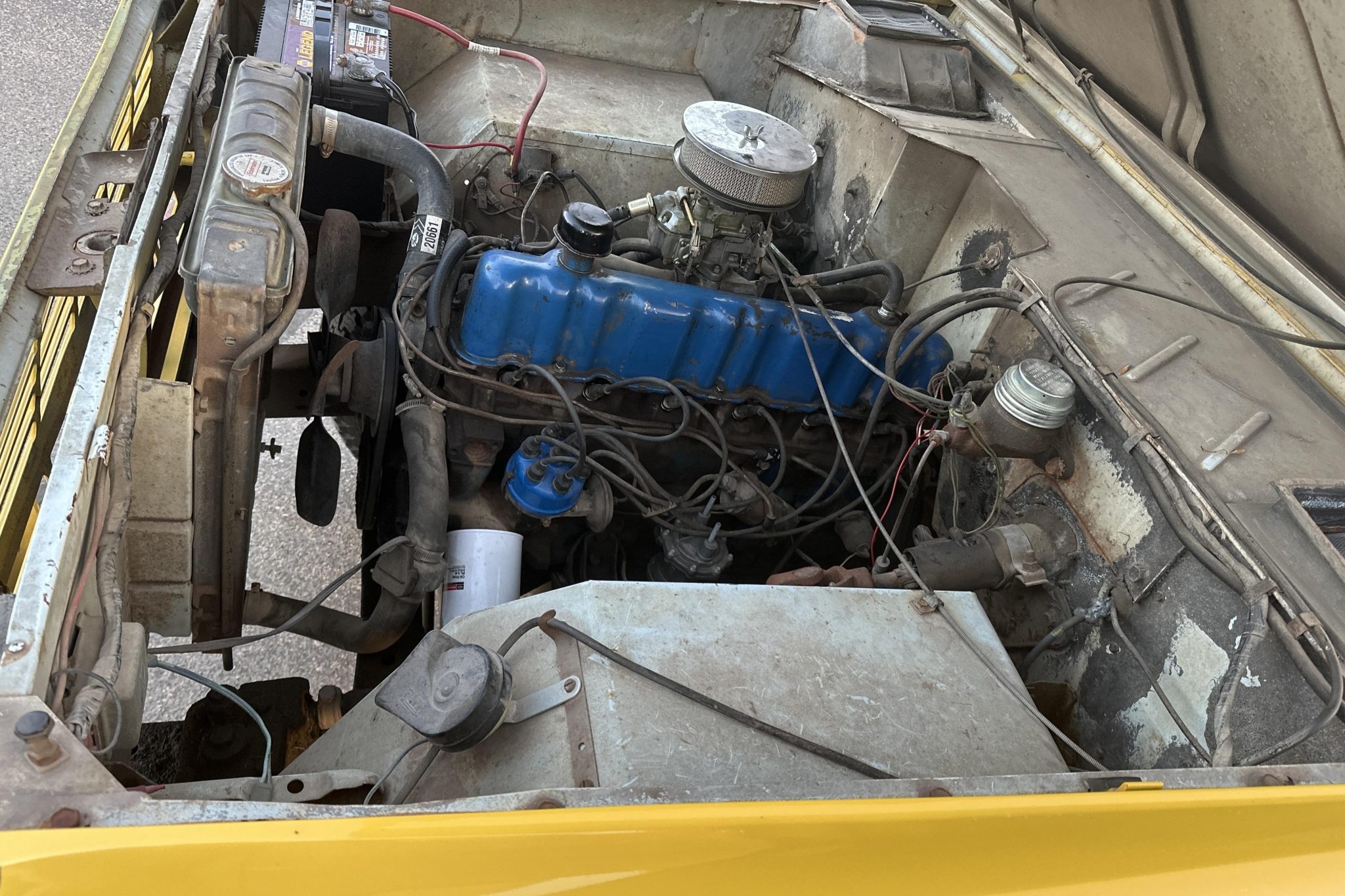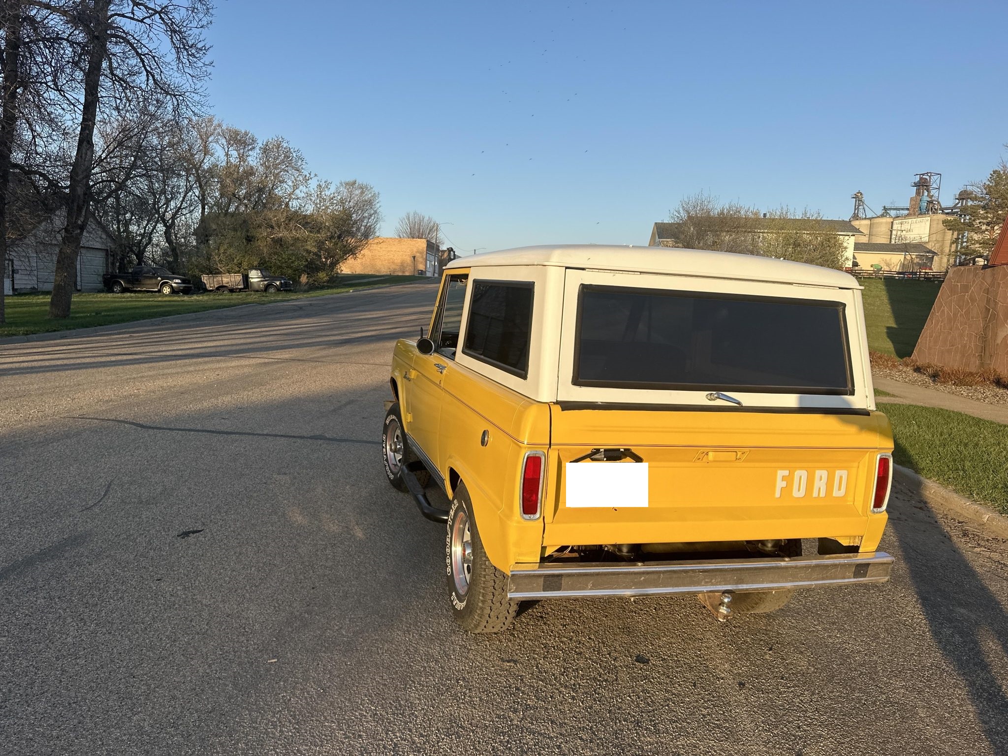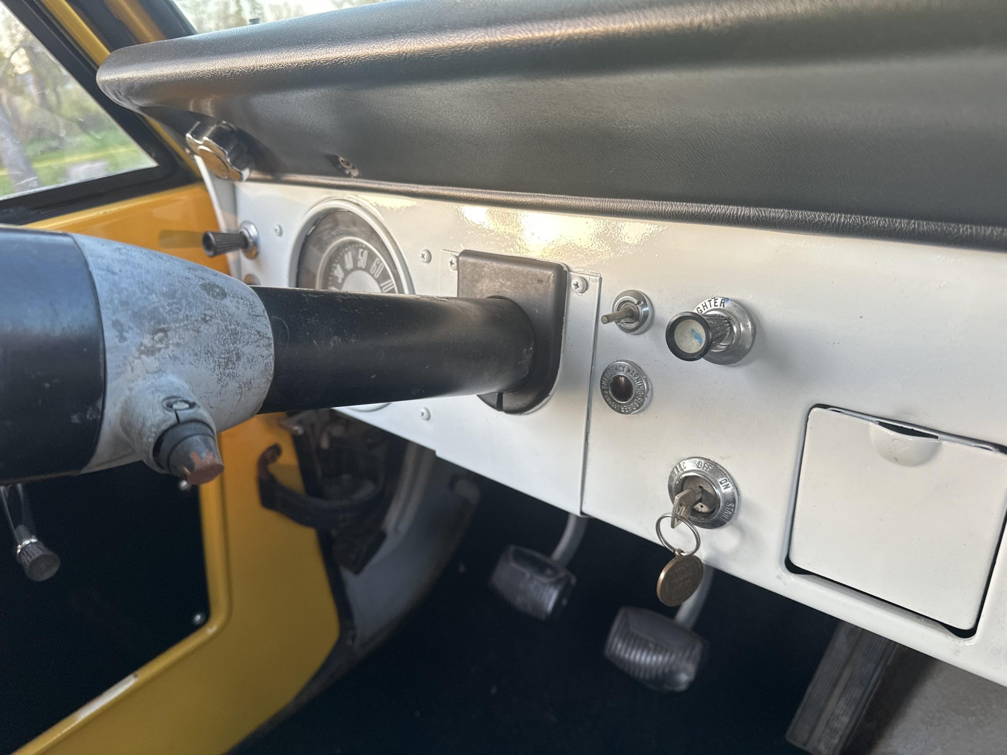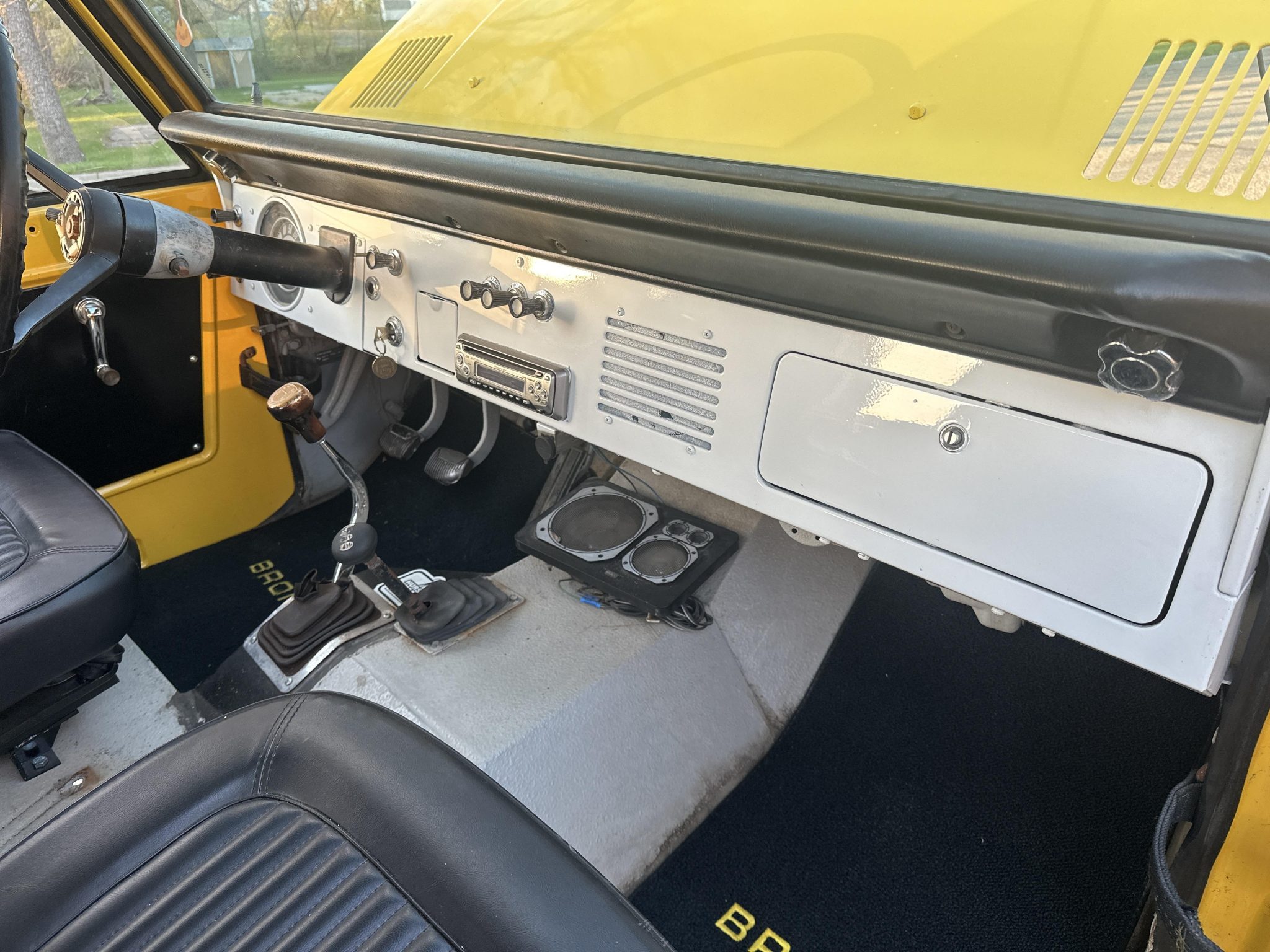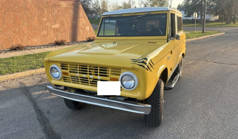 This 1966 Ford Bronco was refurbished in 1999 and is finished in yellow over black vinyl upholstery. It is powered by a replacement 170ci inline-six linked to a three-speed manual transmission and a dual-range transfer case, and equipment includes a white removable hardtop, chrome bumpers, black side steps, a ball hitch, 15″ steel wheels, manually locking front hubs, front bucket seats, a Pioneer CD stereo, and a Hurst floor-mounted shifter.