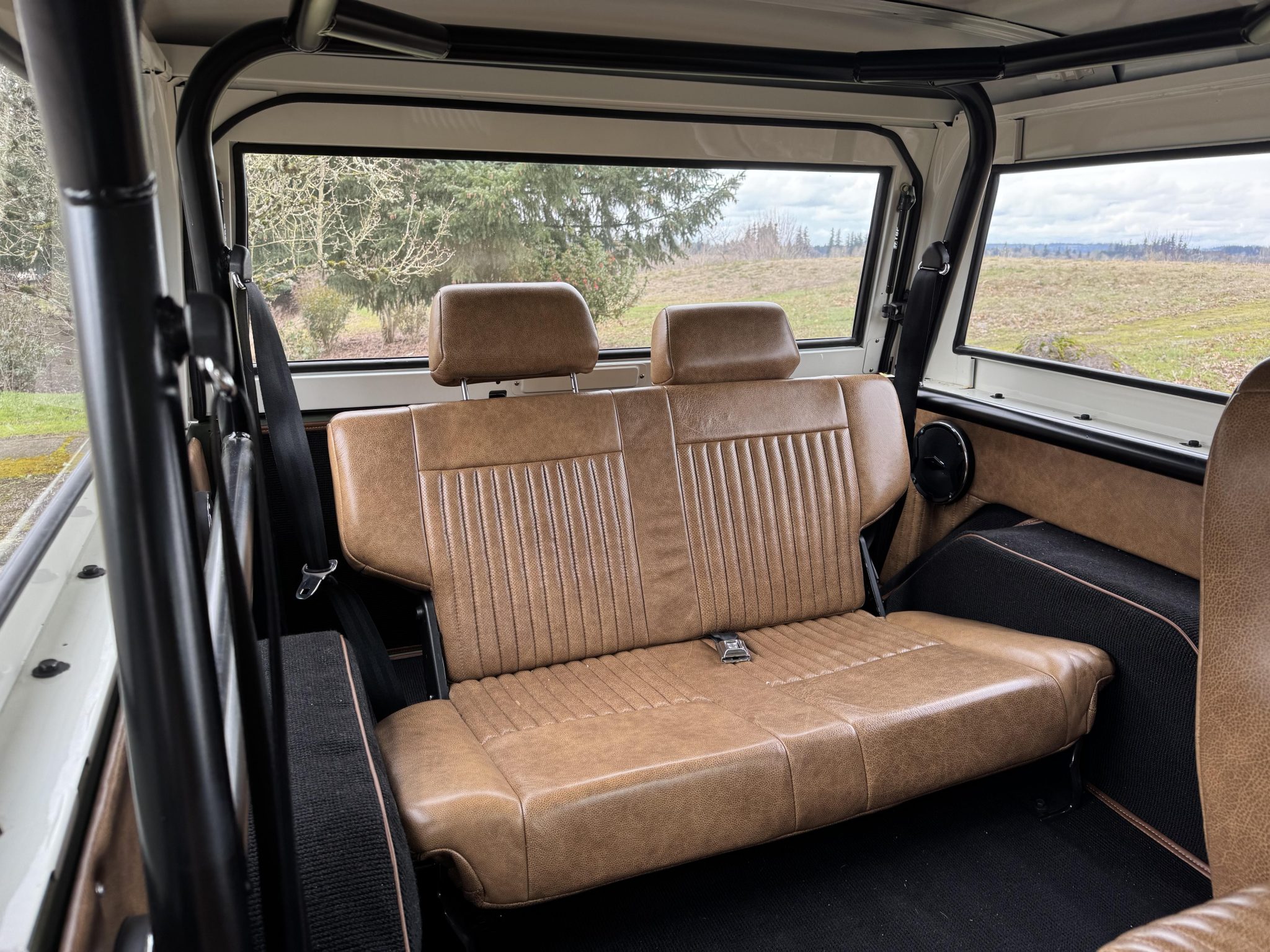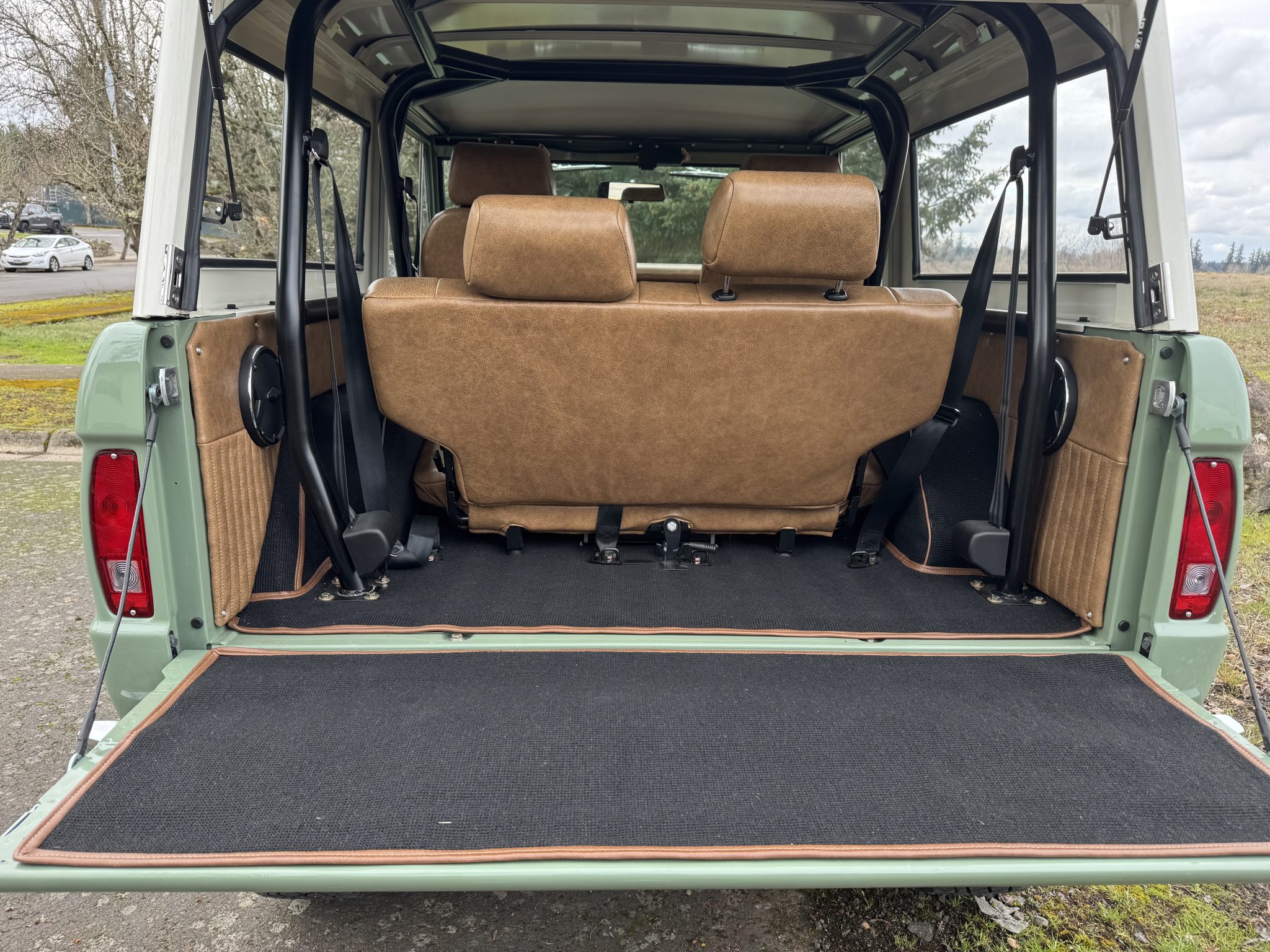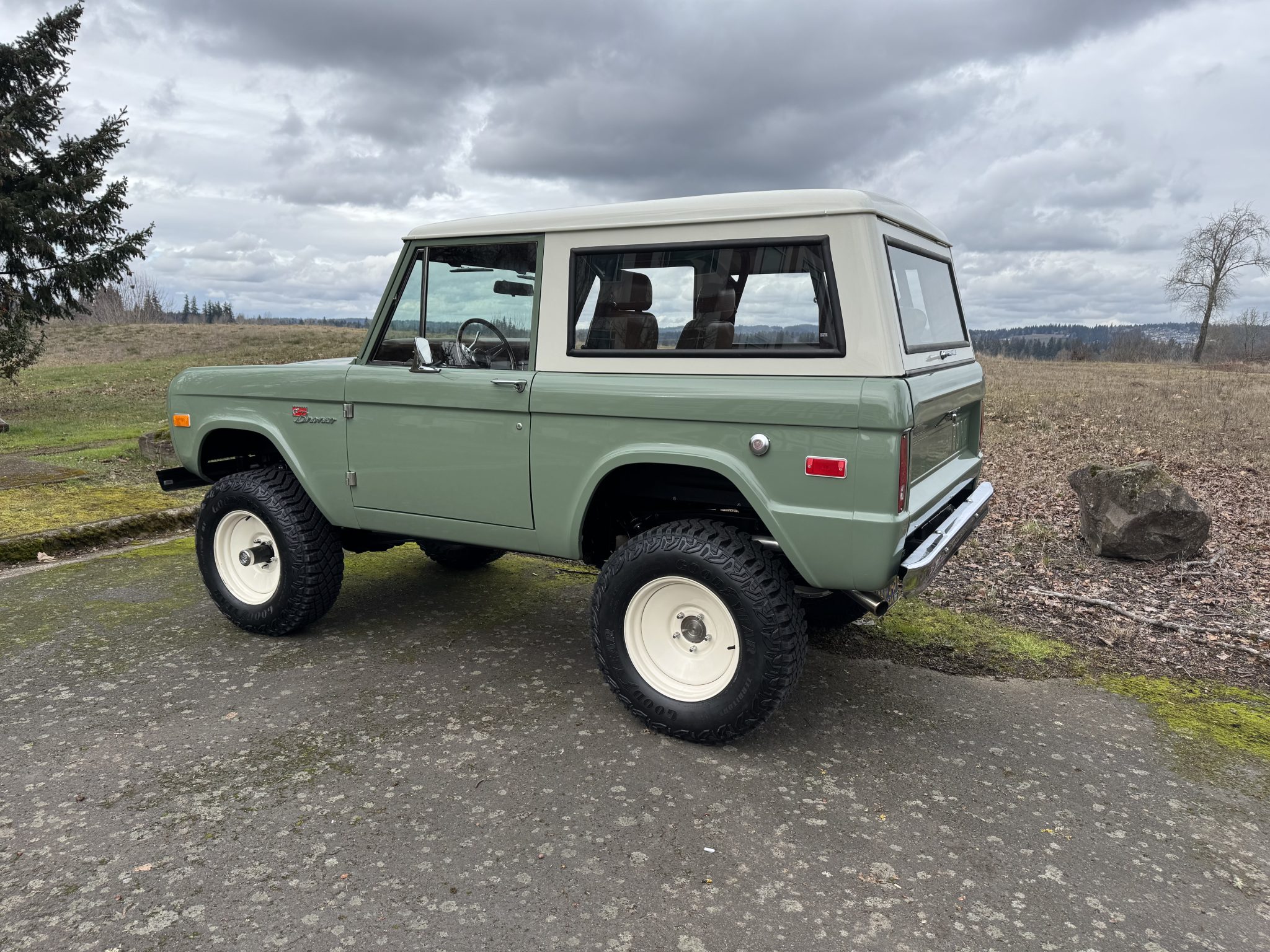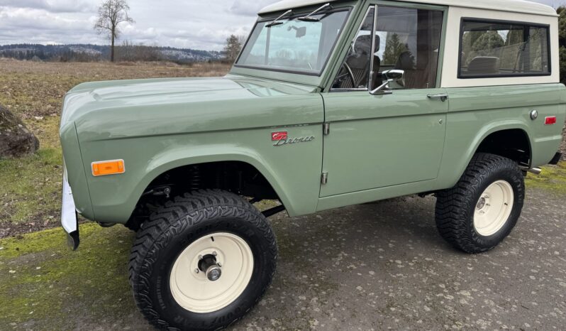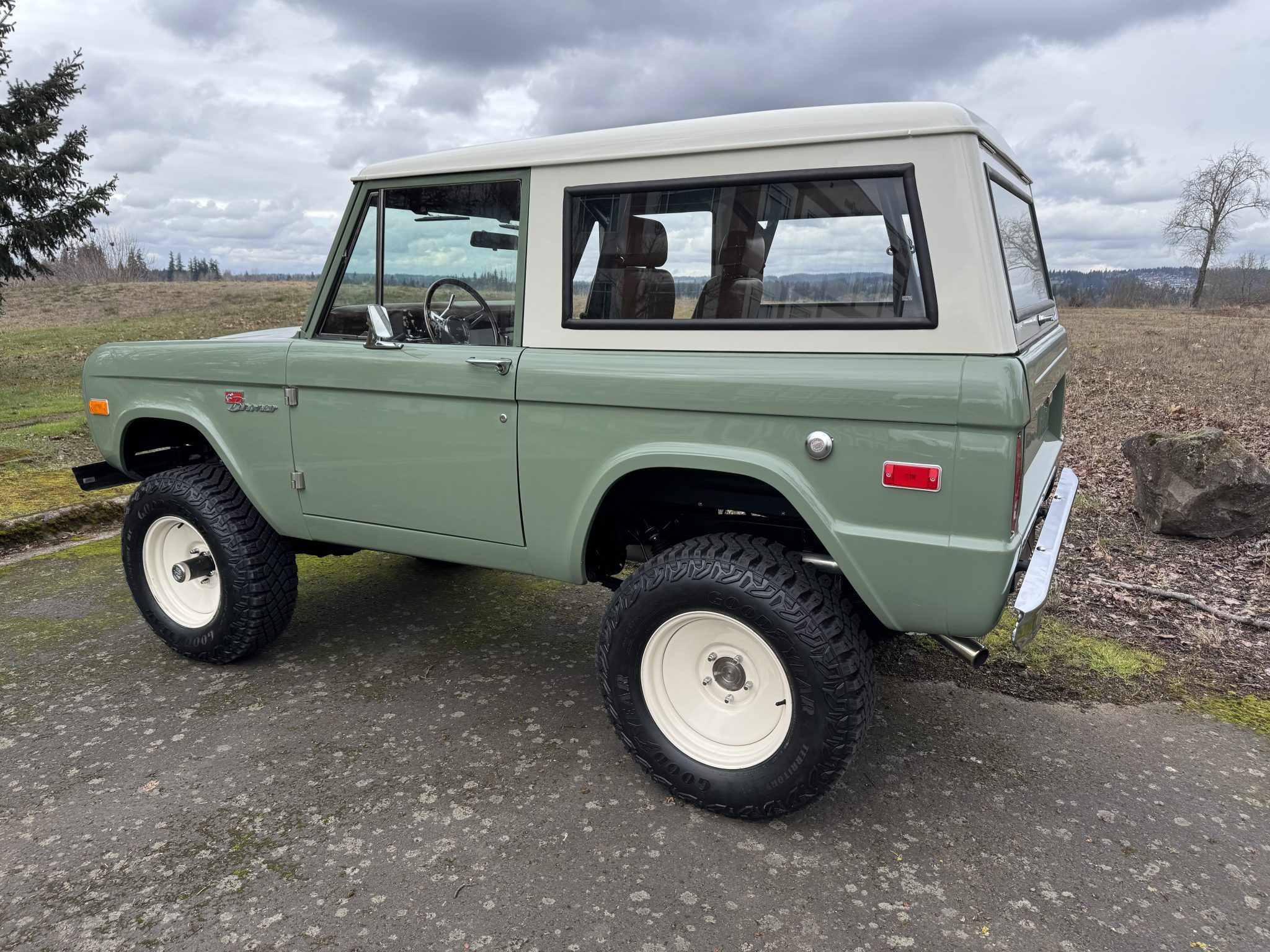 Riding on a lifted suspension with Bilstein shocks as well as 17″ powder-coated aftermarket wheels mounted over hydroboosted Wilwood disc brakes, the truck is finished in Boxwood Green over saddle leather upholstery. Power is from a 5.0-liter Coyote V8 linked with a ten-speed automatic transmission and a Dana 20 twin-stick transfer case, and additional equipment includes Tom Wood’s driveshafts, an aluminum radiator, a six-point roll bar, Vintage Air climate control, Dakota Digital gauges, and a JVC touchscreen stereo linked to an aftermarket amplifier, subwoofer, and speakers.