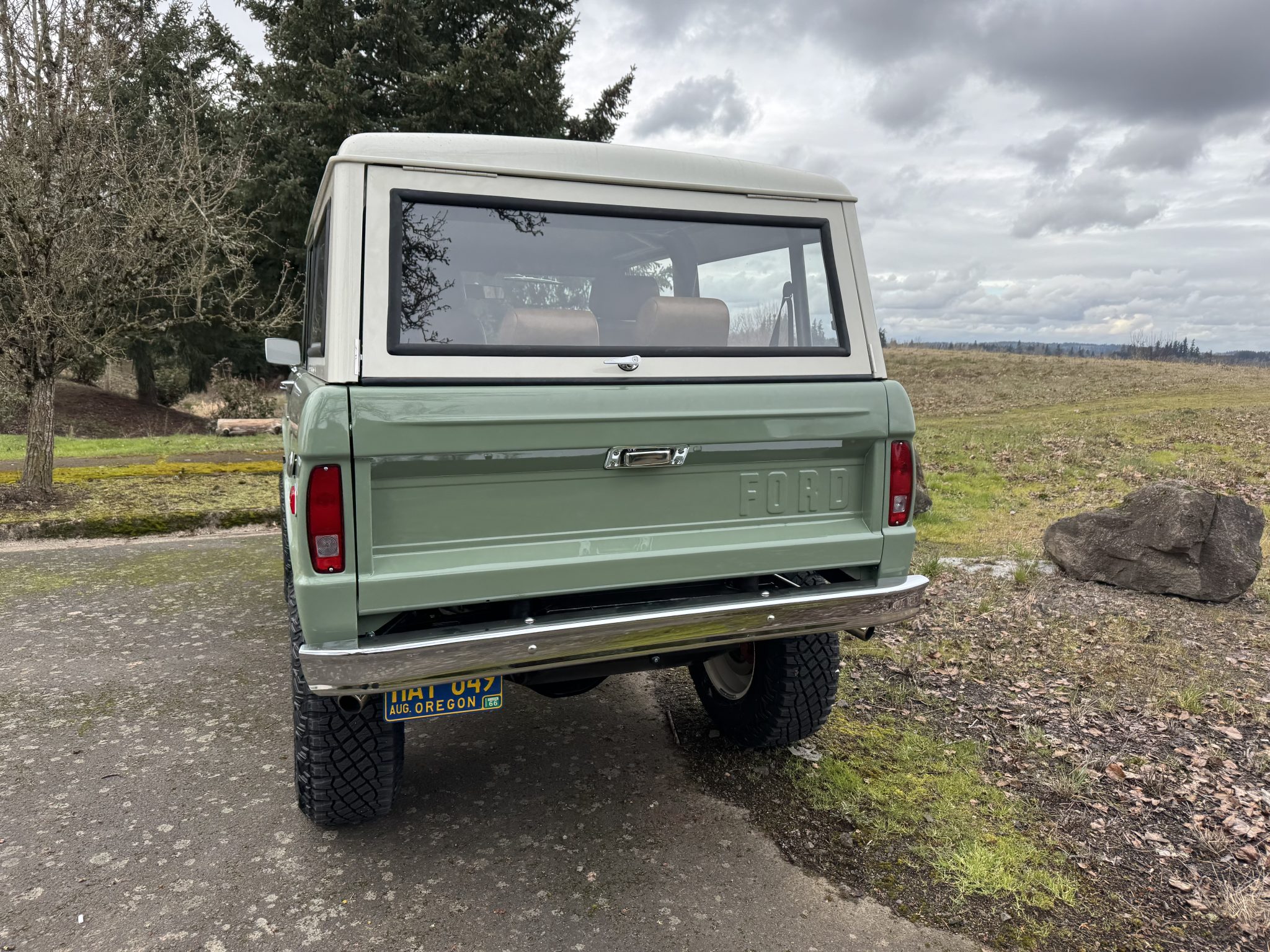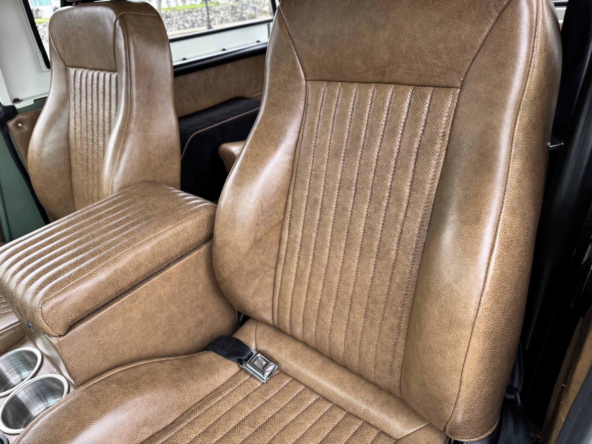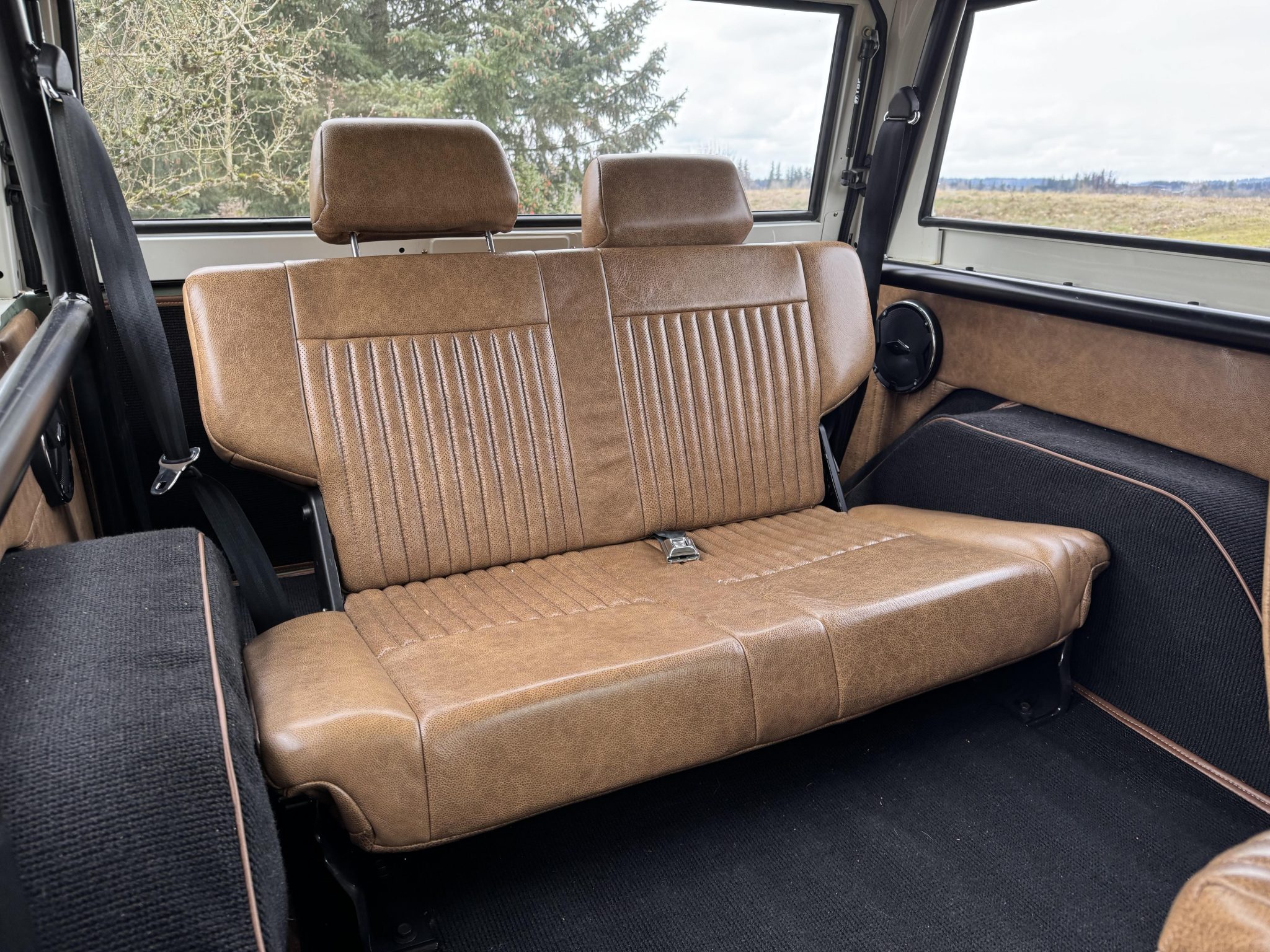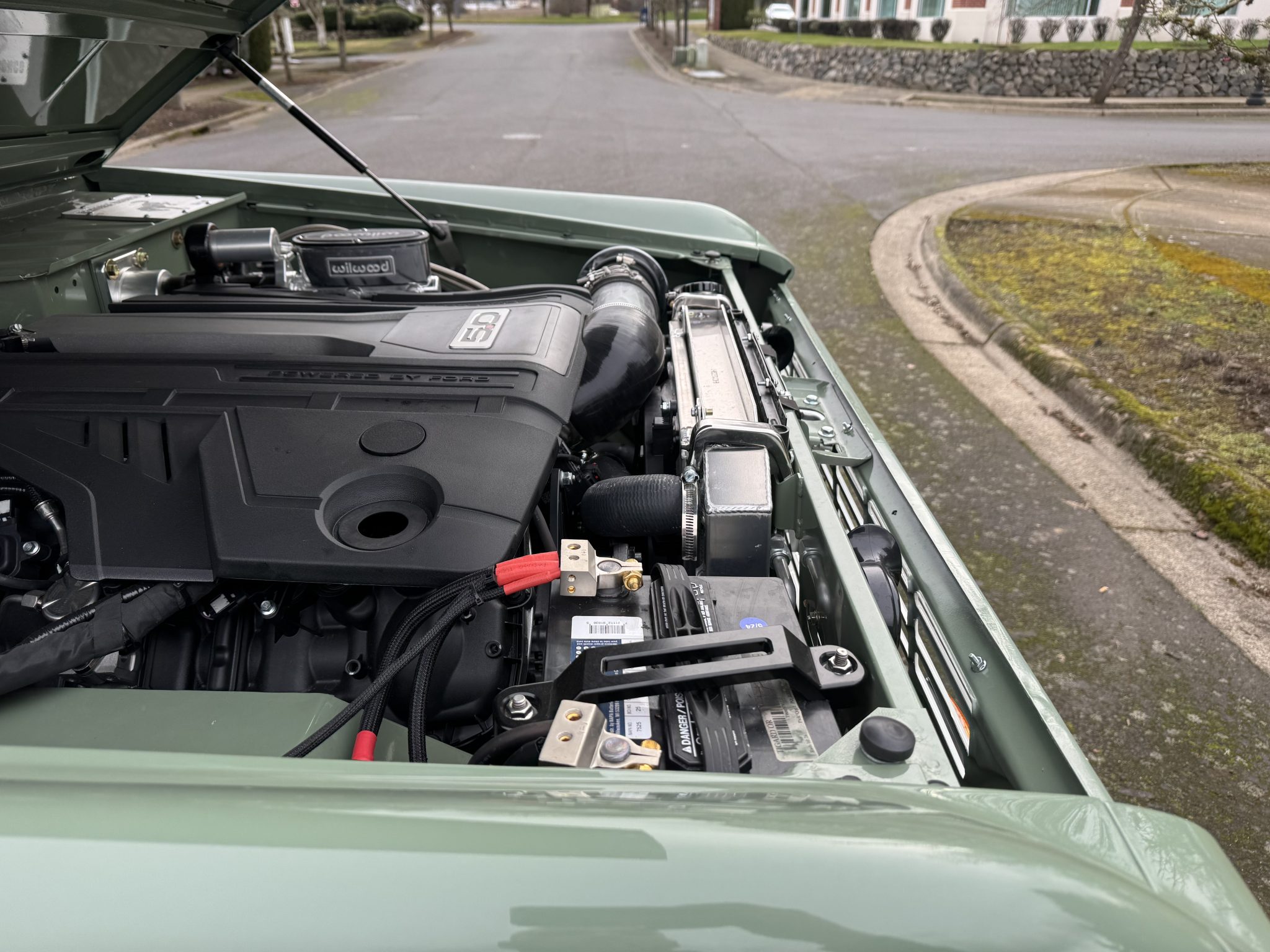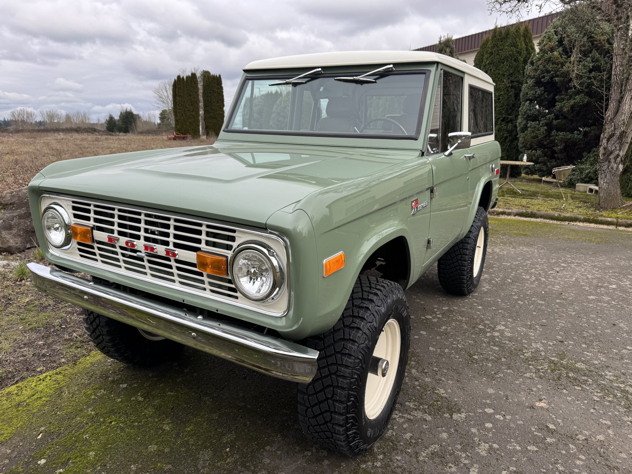 Riding on a lifted suspension with Bilstein shocks as well as 17″ powder-coated aftermarket wheels mounted over hydroboosted Wilwood disc brakes, the truck is finished in Boxwood Green over saddle leather upholstery. Power is from a 5.0-liter Coyote V8 linked with a ten-speed automatic transmission and a Dana 20 twin-stick transfer case, and additional equipment includes Tom Wood’s driveshafts, an aluminum radiator, a six-point roll bar, Vintage Air climate control, Dakota Digital gauges, and a JVC touchscreen stereo linked to an aftermarket amplifier, subwoofer, and speakers.