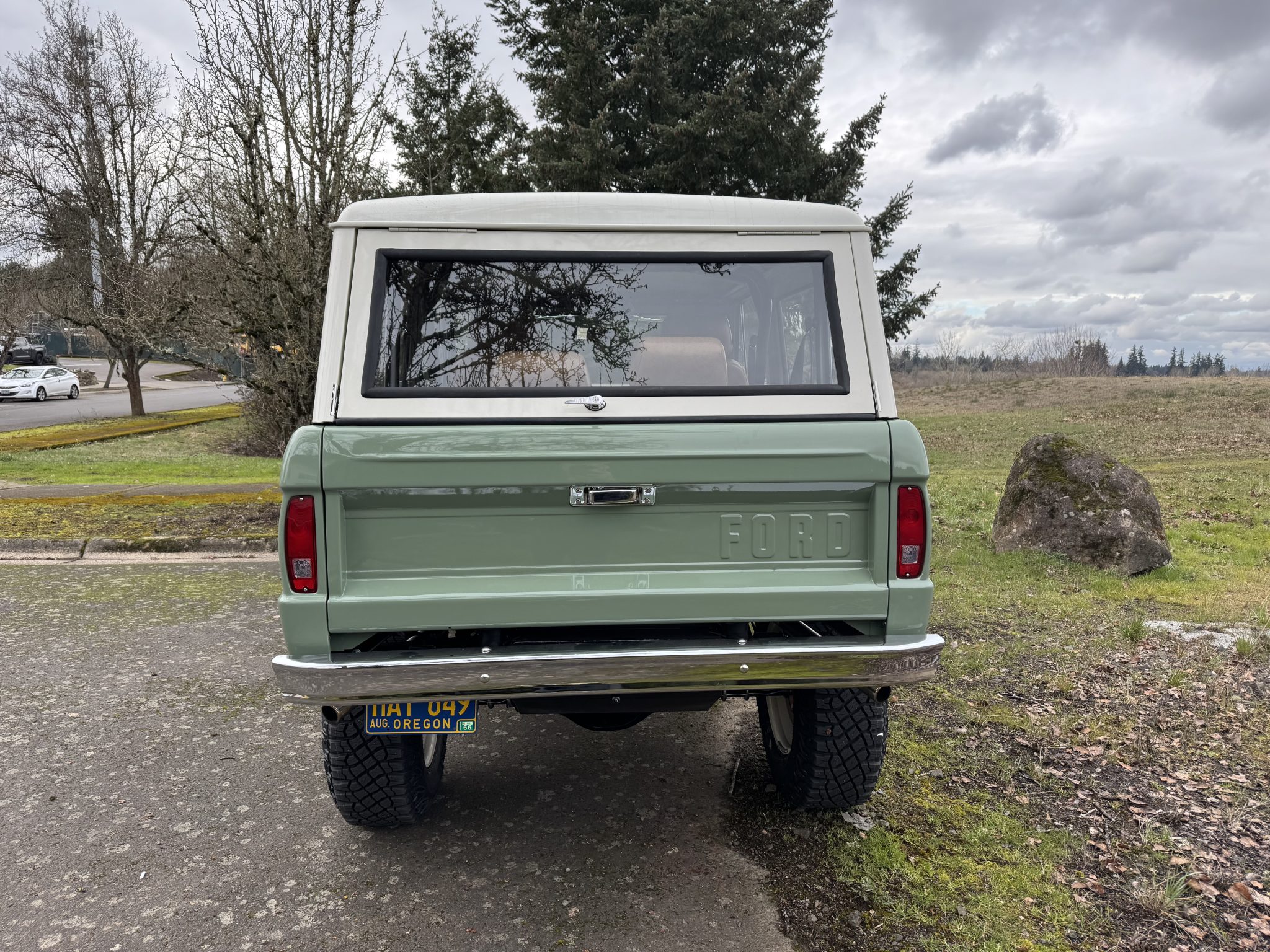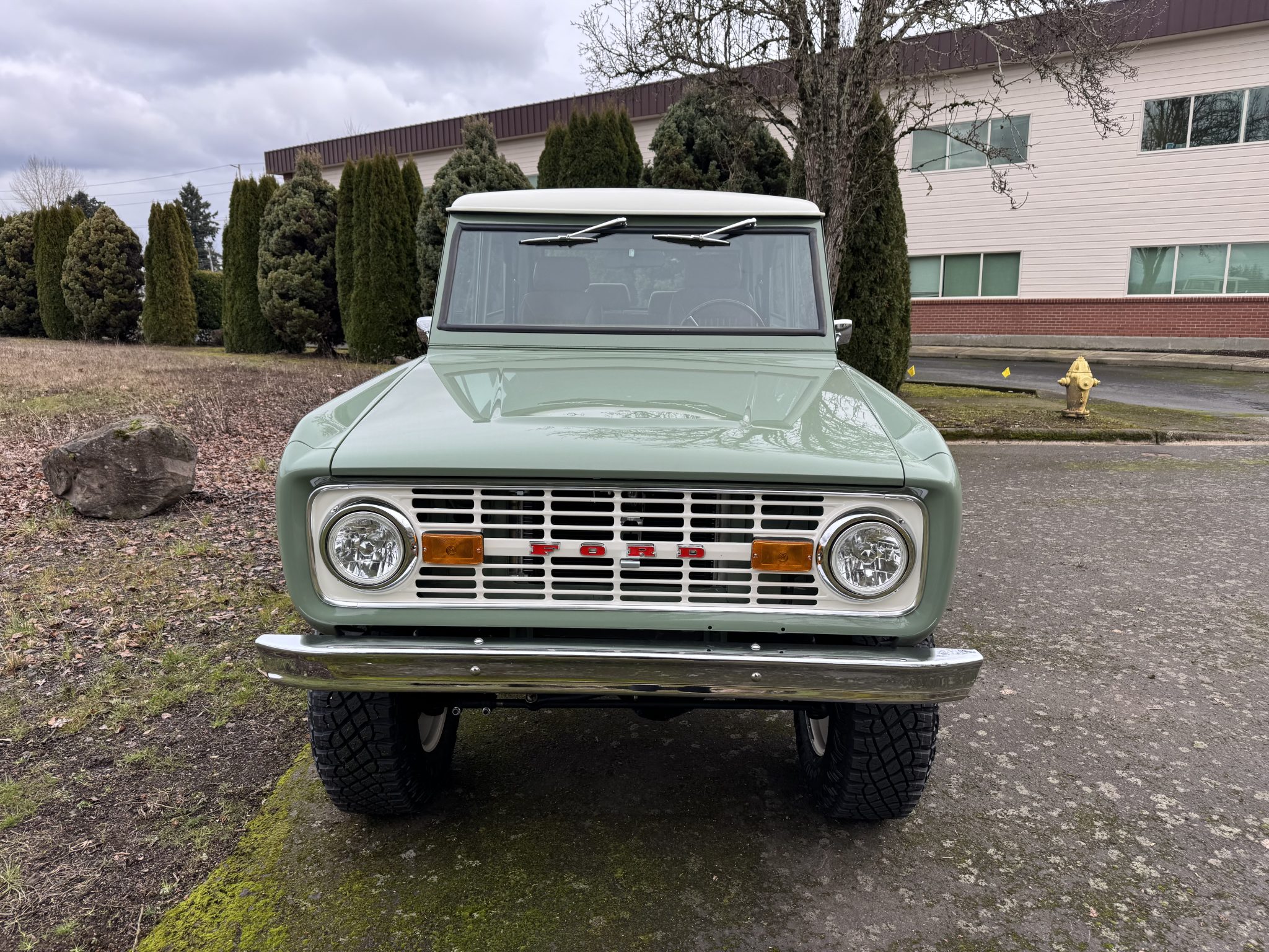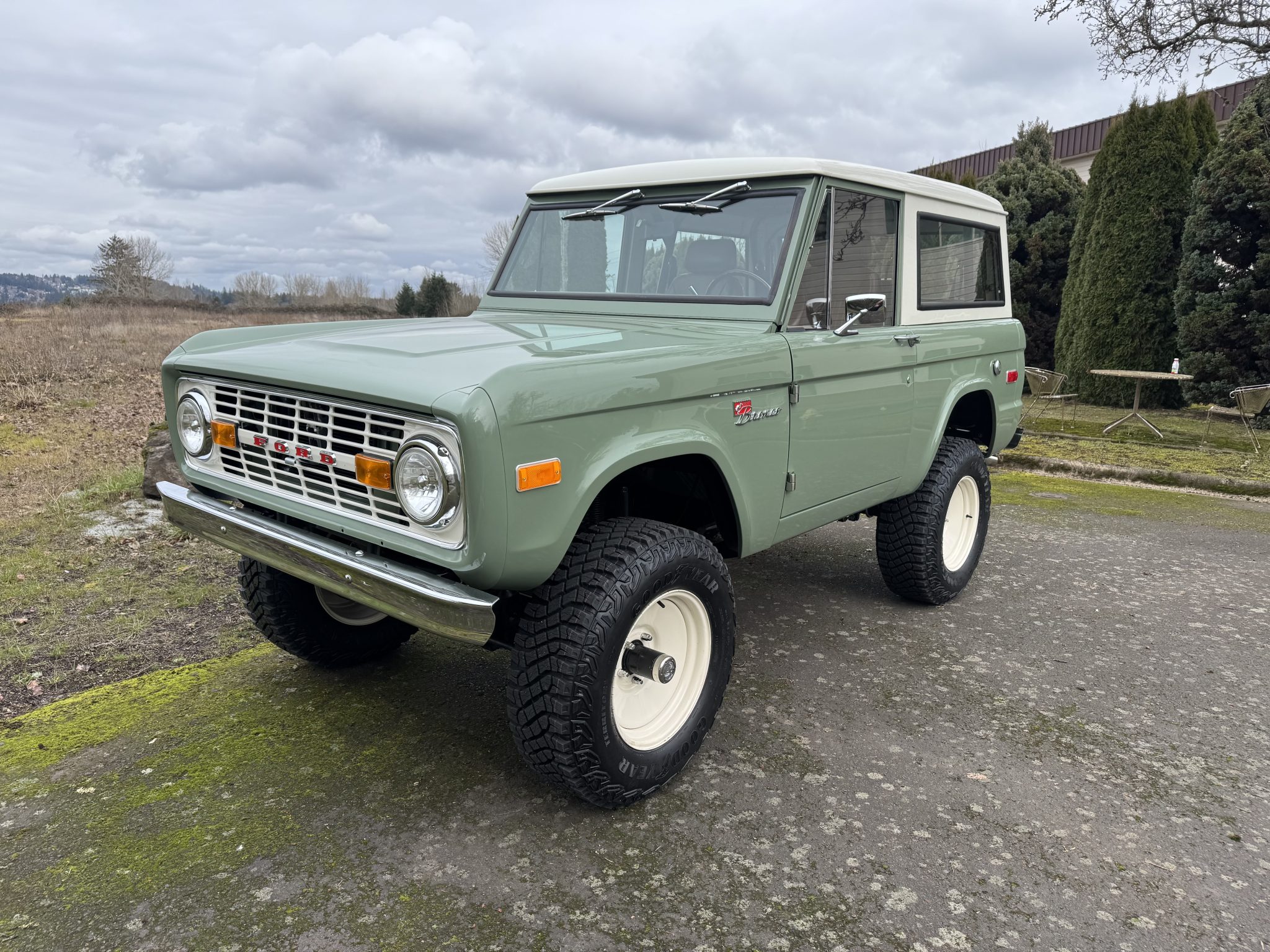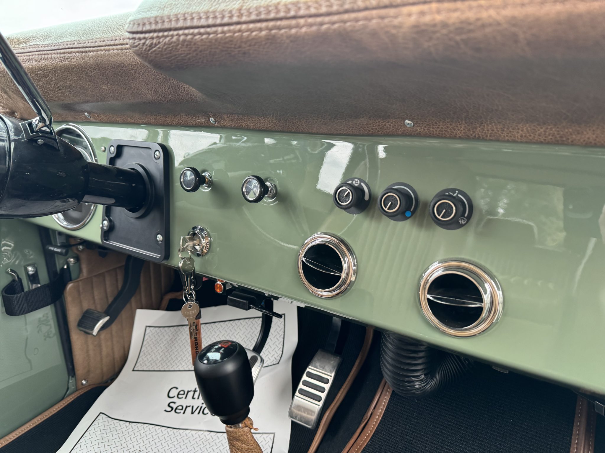 Riding on a lifted suspension with Bilstein shocks as well as 17″ powder-coated aftermarket wheels mounted over hydroboosted Wilwood disc brakes, the truck is finished in Boxwood Green over saddle leather upholstery. Power is from a 5.0-liter Coyote V8 linked with a ten-speed automatic transmission and a Dana 20 twin-stick transfer case, and additional equipment includes Tom Wood’s driveshafts, an aluminum radiator, a six-point roll bar, Vintage Air climate control, Dakota Digital gauges, and a JVC touchscreen stereo linked to an aftermarket amplifier, subwoofer, and speakers.