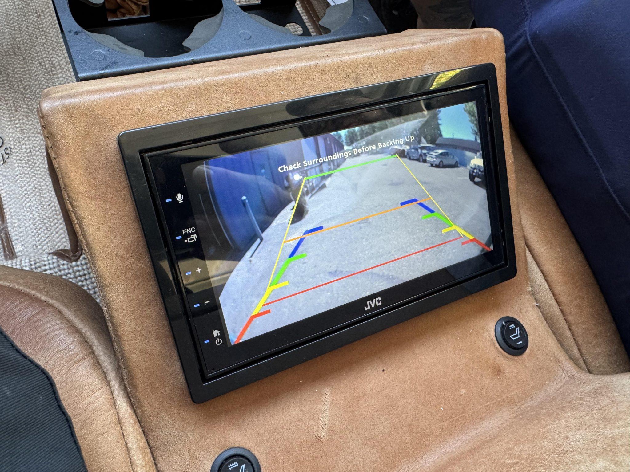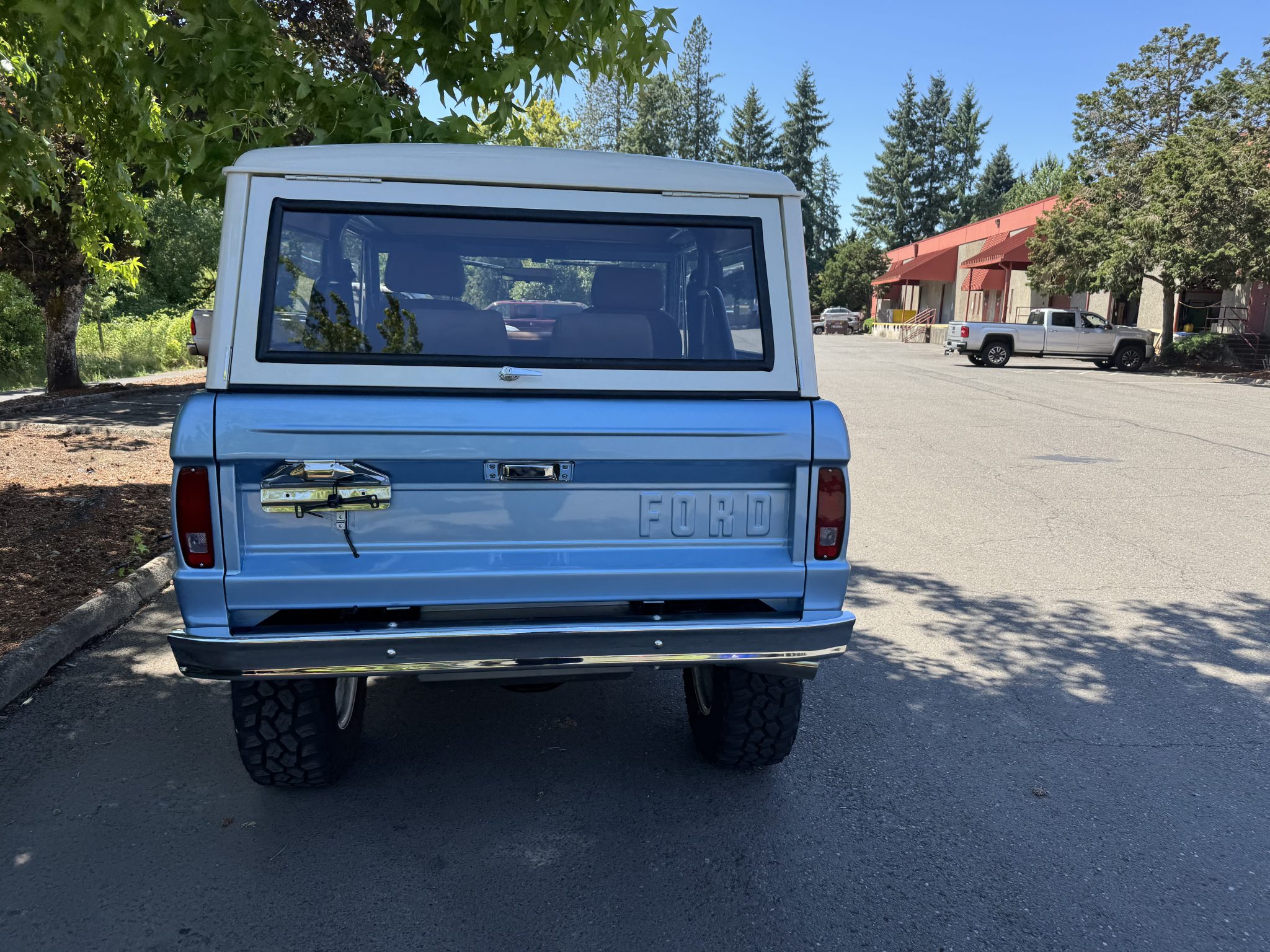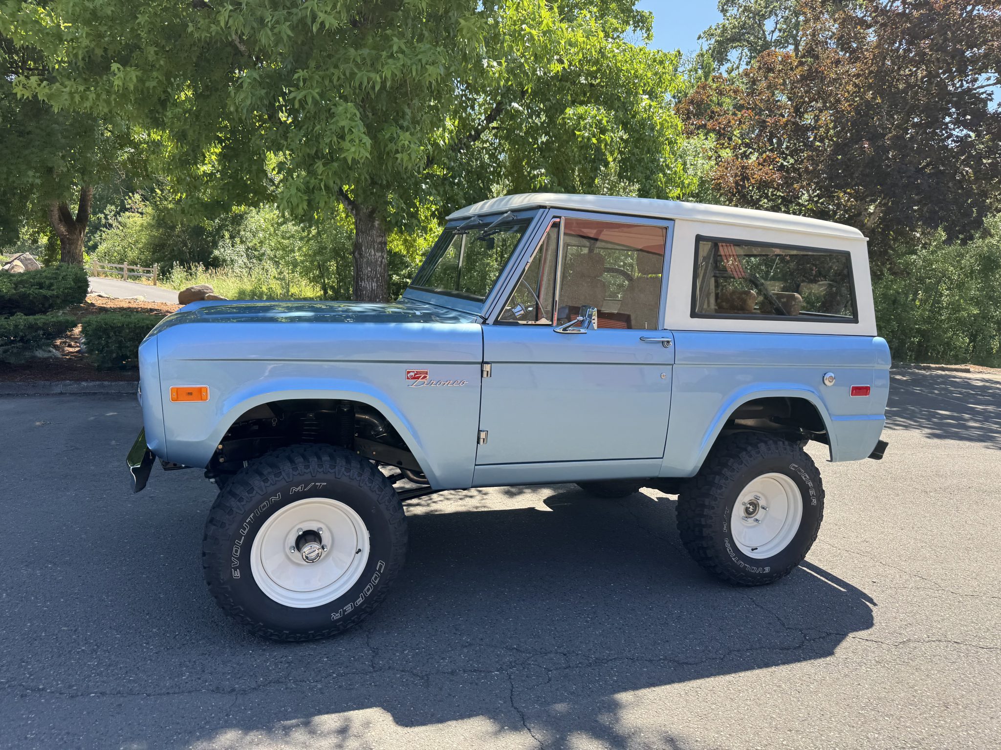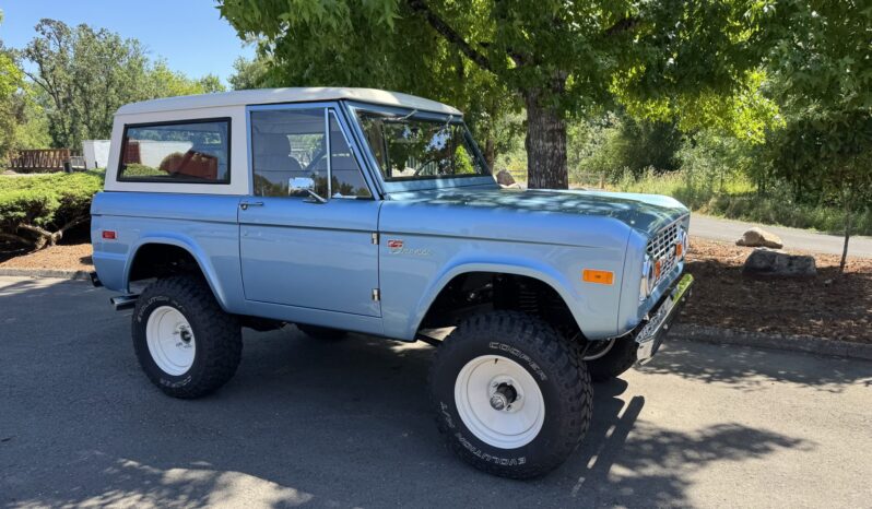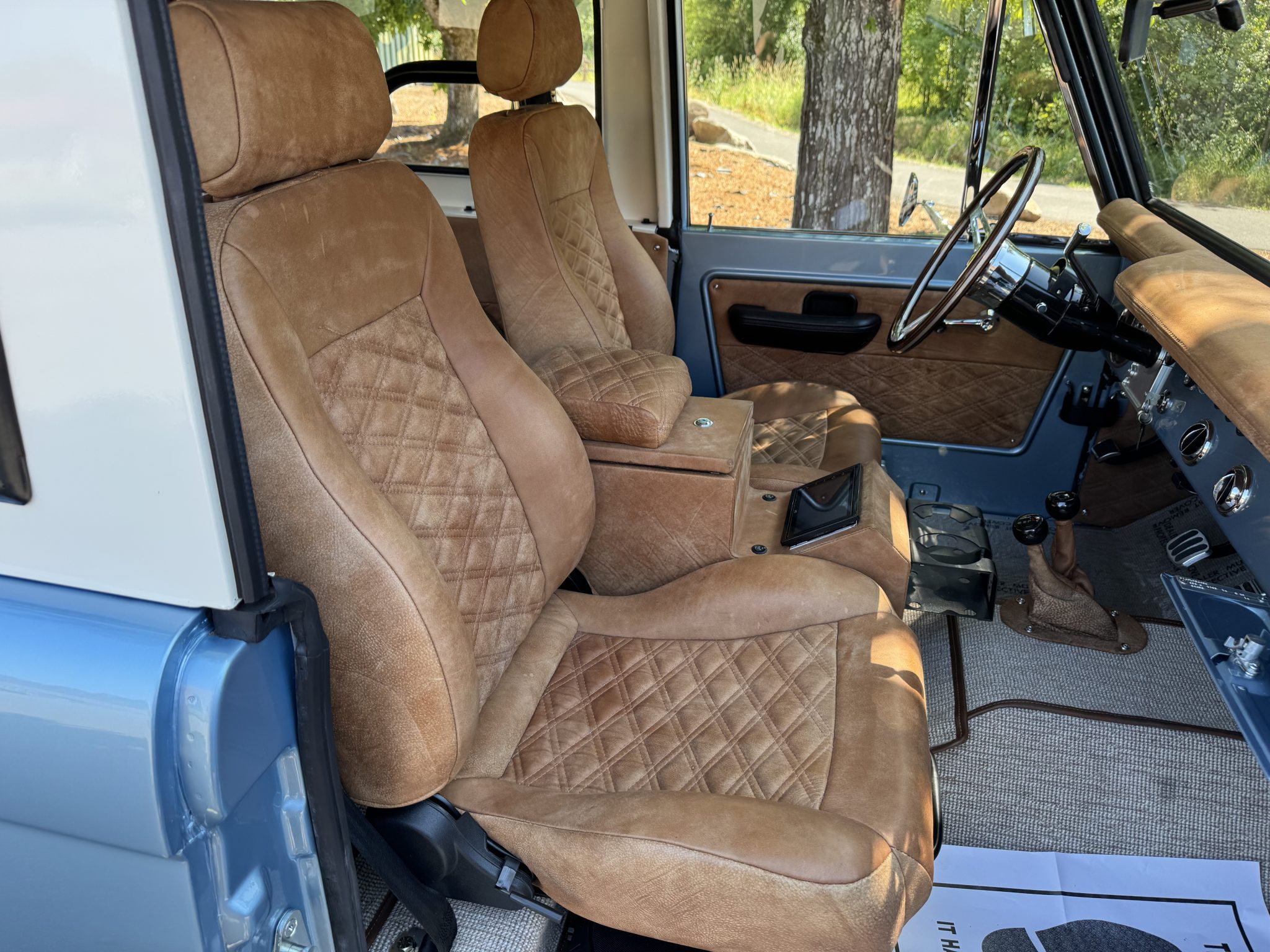 Power is provided by a 5.0-liter Gen 3 Coyote V8 linked to a 10-speed automatic transmission, a Dana 20 transfer case, and rebuilt differentials with 4.11:1 gears, and the truck rides on a lifted suspension with Bilstein shocks along with 17″ smoothie-style wheels mounted over hydroboosted Wilwood disc brakes. The replacement body is finished in Brittany Blue with a Wimbledon White hardtop, and the cabin is outfitted with saddle leather upholstery, heated front seats, tailgate-mounted jump seats, air conditioning, and a JVC receiver. Equipment includes AMP Research retractable side steps, manually locking front hubs, LED headlights, and Dakota Digital gauges.