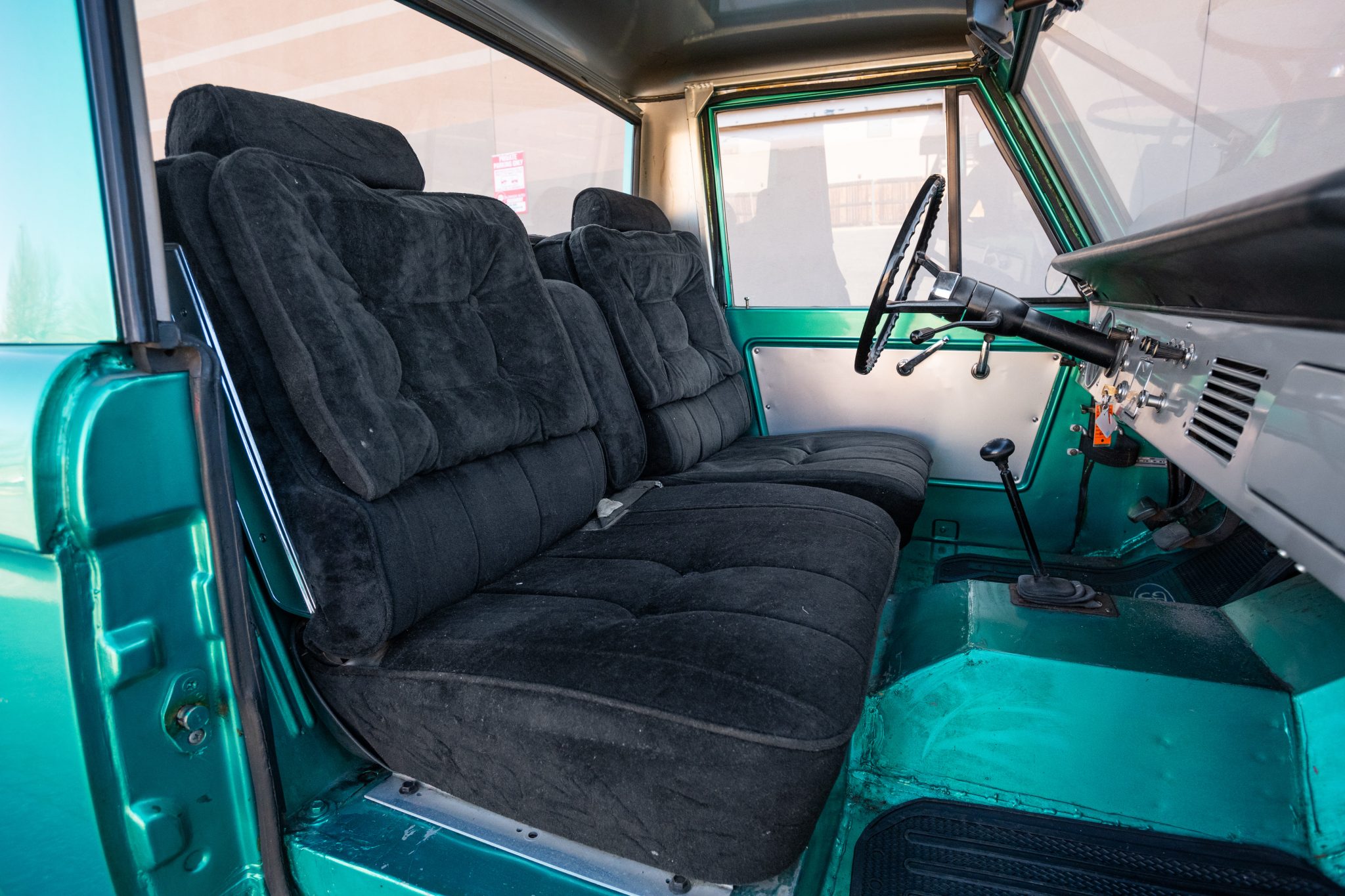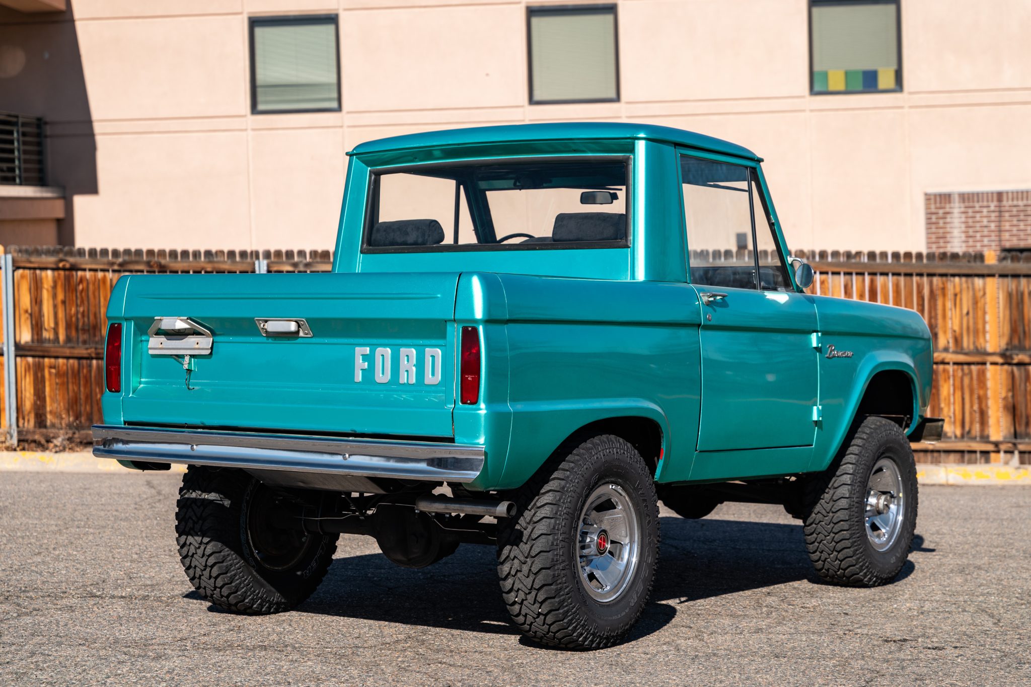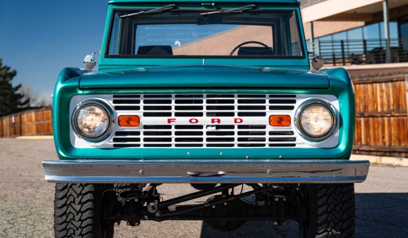 This 1966 Ford Bronco is a half-cab pickup finished in green over black cloth and powered by a 170ci inline-six paired with a three-speed manual transmission and a dual-range transfer case. Work in 2021 included installing a 2.5″ suspension lift, resurfacing the flywheel, rebuilding the steering box and carburetor, and replacing the clutch, pressure plate, exhaust, front wheel cylinders, drive shafts, U-joints, and tires. Equipment includes a body-colored hardtop, 15″ chrome-finished wheels, chrome bumpers, and a heater.